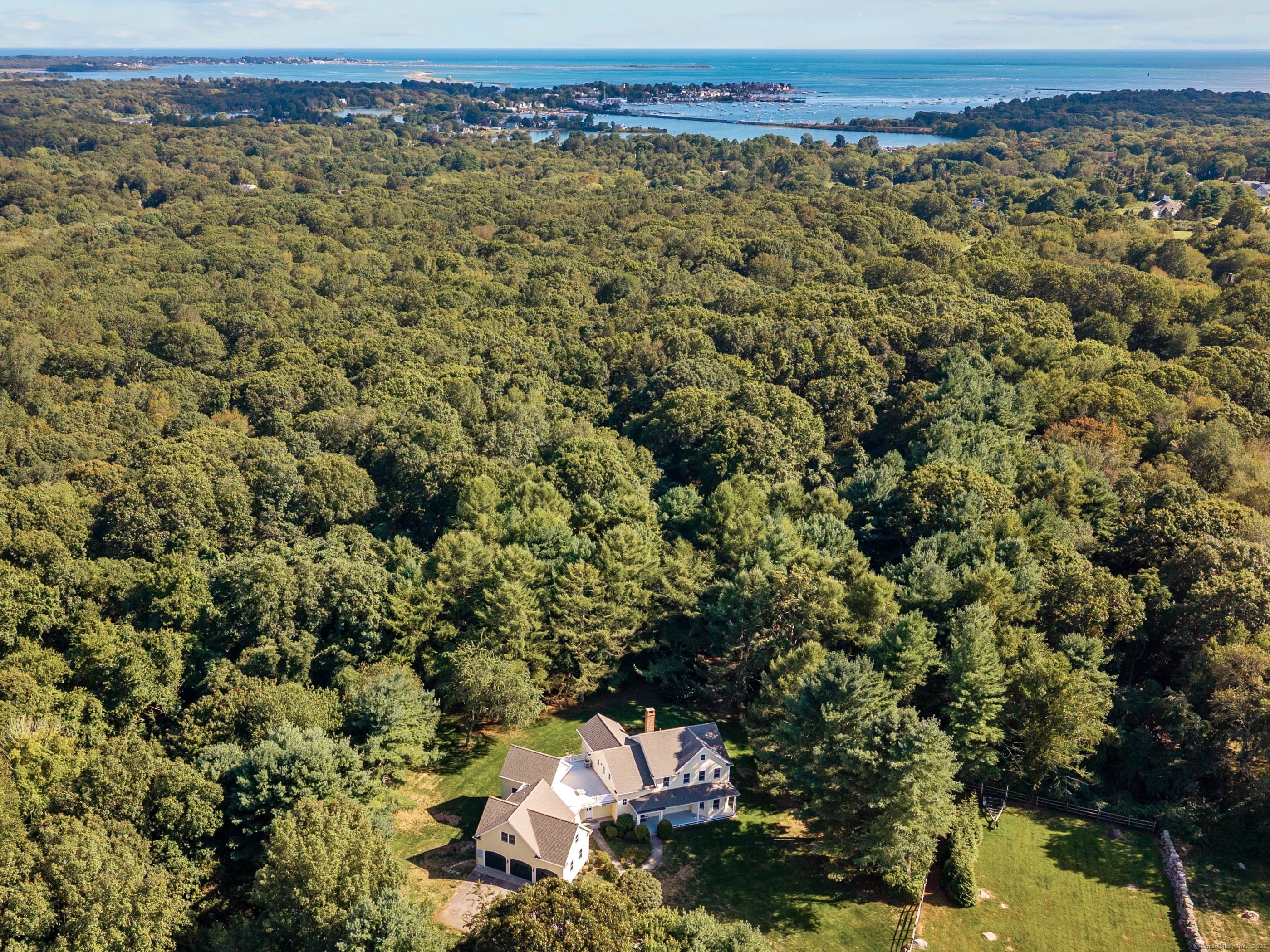 Welcome home to 16 Juniper Lane, located on a quiet cul-de-sac in historic Stonington. Offered for the first time by the original owners, this custom-designed home offers exceptional privacy on 4 secluded acres, a wonderful floor plan perfect for one-level living, plenty living space and a gorgeous natural setting abutting an additional 8 acres of open space. The gracious facade features a large, covered porch w front door opening into an elegant, vaulted foyer lined w built-in bookshelves. This flows into the gorgeous living space w wood-burning gas-assist fireplace, hardwood floors and designated areas for dining, playing music, retreating into a private den and dining alfresco on the screen porch. The expansive kitchen has an enormous stone island, a 5-burner Wolf gas cooktop, 2 dishwashers, bar sink w wine cooler & storage area, breakfast nook, desk nook & a door to the stone patio. The elegant primary suite includes high ceilings, 2 walk-in closets & full bath w deep cast iron tub, separate shower, sink and toilet areas. Also on the 1st floor are half bath, laundry, 3 car garage & entry to future apartment above garage. The 2nd floor features 3 bedrooms w hardwood floors, 2 full baths, a large office w sink/coffee bar & half bath, a media room & an exterior door to the expansive roof deck perfect for sunbathing / stargazing. Across the roof deck is a door into the future apartment above the garage, which is pre-piped for tie-in to heating system & plumbed for full bath.