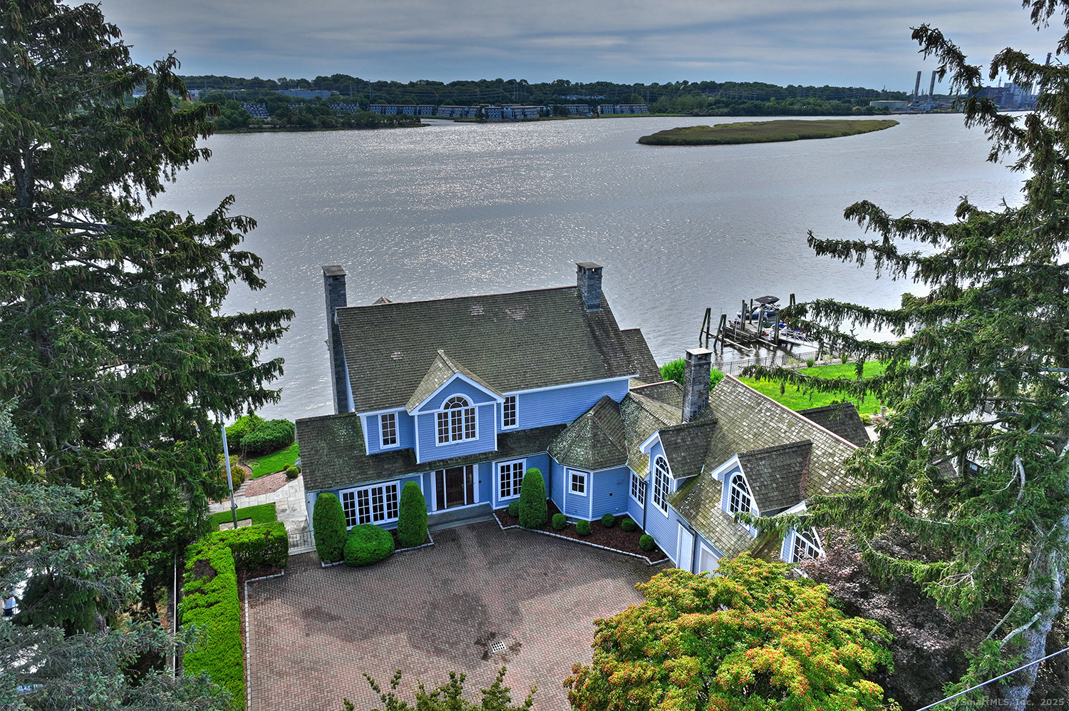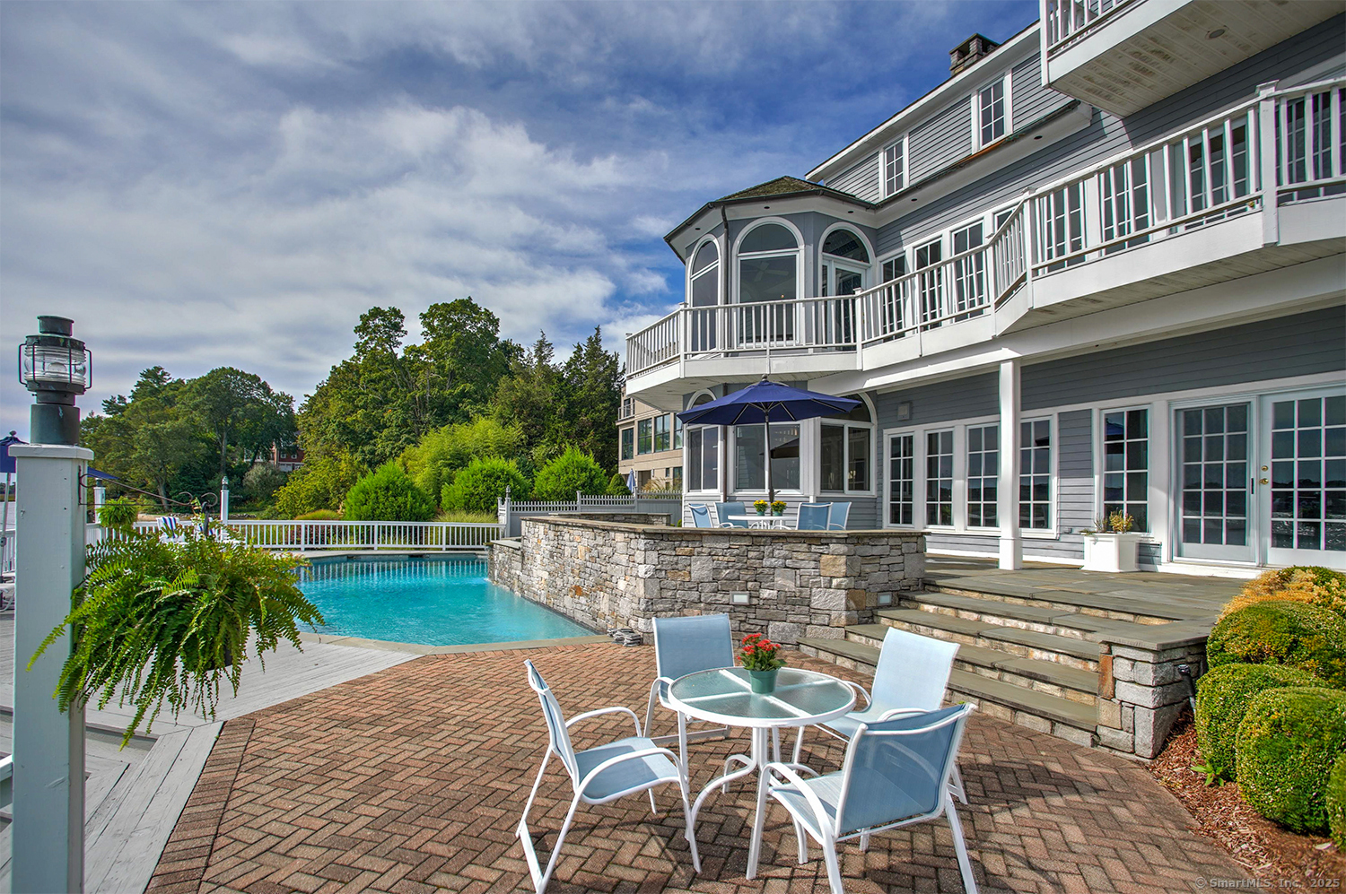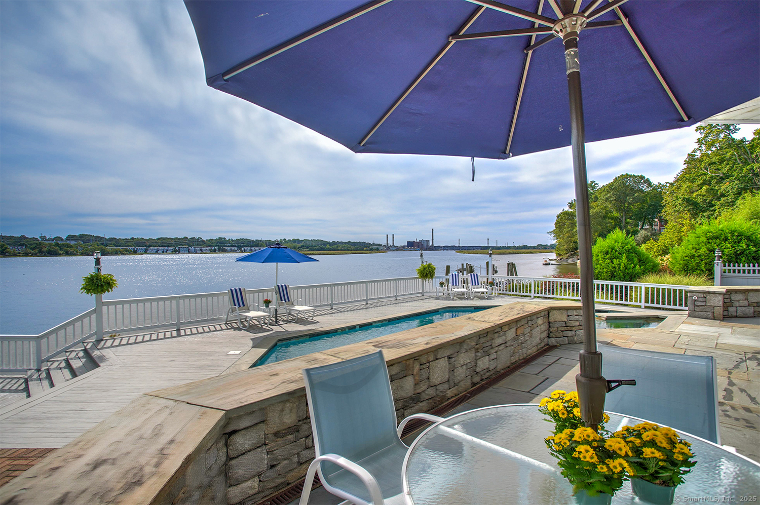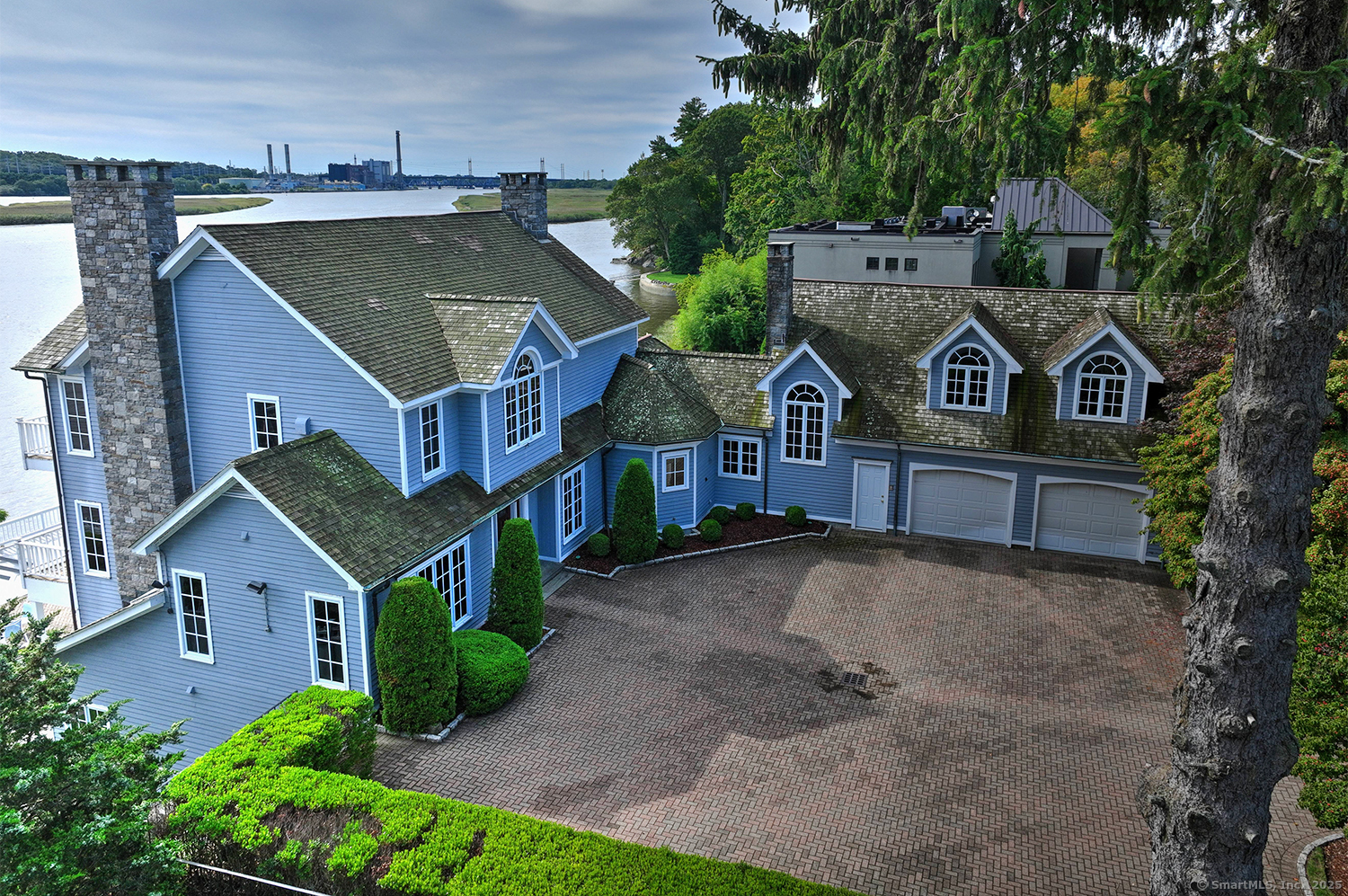 Welcome to this stunning waterfront retreat on the scenic Housatonic River, offering panoramic views, luxury, and comfort. Perfect for relaxing or entertaining, this home features 3 spacious bedrooms, 3.5 baths, and a finish able bonus room above the 2-car garage-ideal for a guest suite or office. Elevator to all three levels provides added convenience. A stone wall and gated entry lead to a paver driveway, setting the stage for what's inside. The main floor boasts a sunlit living room with a fireplace and deck overlooking the pool and river. The kitchen, dining room, family room, solarium, and home office all offer beautiful water views. The lower level is an entertainer's dream: a second kitchen, stone fireplace, sauna, steam room, Jacuzzi, two bedrooms, two full baths, and a gym. Walk out to your private pool, hot tub, and dock for direct river access. The entire upper level is dedicated to the luxurious primary suite with two walk-in closets, a cedar closet, fireplace, private balcony, and a spa-like en-suite bath. Whether hosting summer gatherings, enjoying quiet nights by the fire, or taking in the serene river views from nearly every room, this exceptional home offers the ultimate in waterfront living.