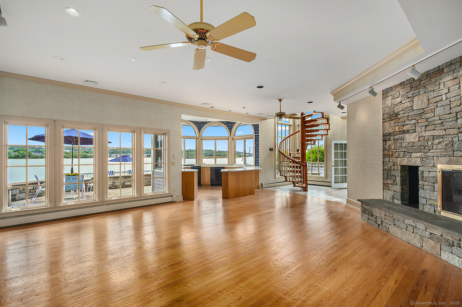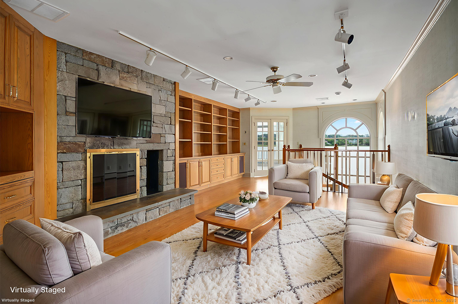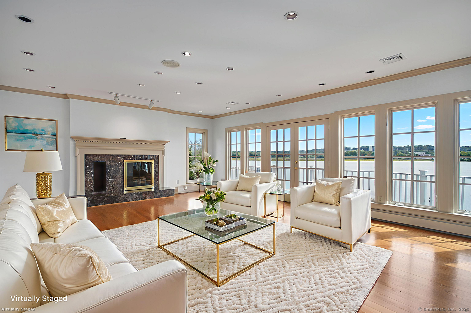 Welcome to this stunning waterfront retreat on the scenic Housatonic River, offering panoramic views, luxury, and comfort. Perfect for relaxing or entertaining, this home features 3 spacious bedrooms, 3.5 baths, and a finish able bonus room above the 2-car garage-ideal for a guest suite or office. Elevator to all three levels provides added convenience. A stone wall and gated entry lead to a paver driveway, setting the stage for what's inside. The main floor boasts a sunlit living room with a fireplace and deck overlooking the pool and river. The kitchen, dining room, family room, solarium, and home office all offer beautiful water views. The lower level is an entertainer's dream: a second kitchen, stone fireplace, sauna, steam room, Jacuzzi, two bedrooms, two full baths, and a gym. Walk out to your private pool, hot tub, and dock for direct river access. The entire upper level is dedicated to the luxurious primary suite with two walk-in closets, a cedar closet, fireplace, private balcony, and a spa-like en-suite bath. Whether hosting summer gatherings, enjoying quiet nights by the fire, or taking in the serene river views from nearly every room, this exceptional home offers the ultimate in waterfront living.