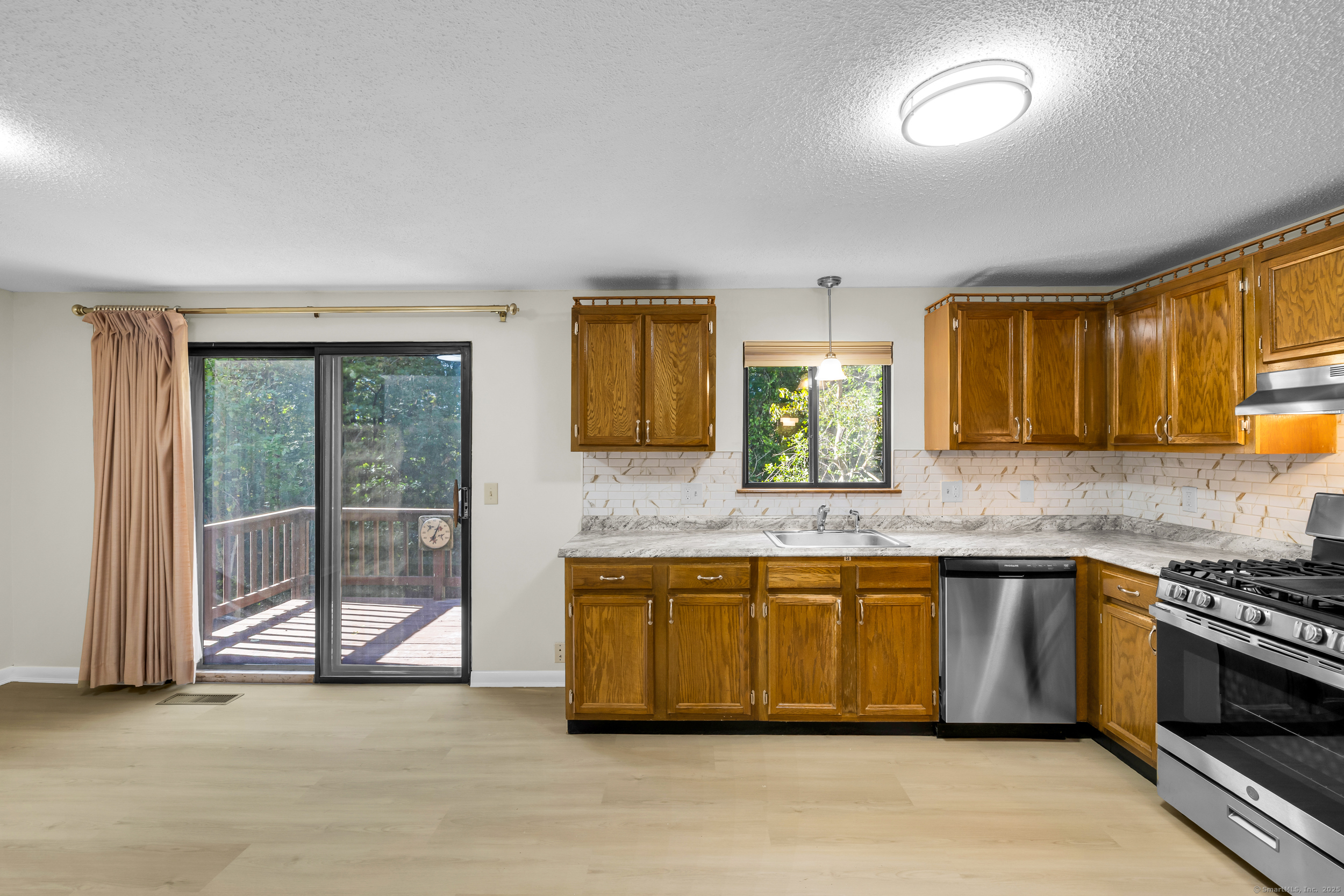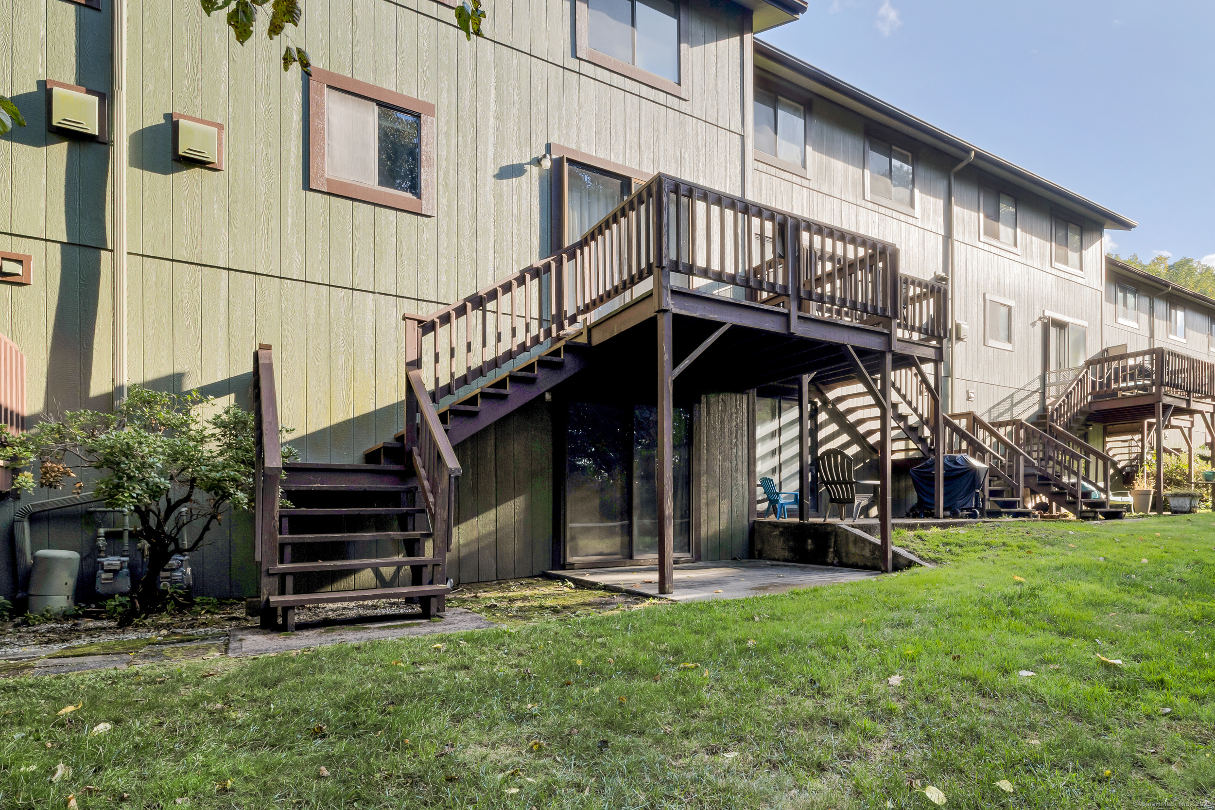 Nestled in a quiet, tree-lined community, this spacious condo at 103 Cliffside Dr #E offers comfort, convenience, and thoughtful details throughout. The inviting layout features a bright living area with an open flow into the dining space and kitchen, where sliders lead to a rear deck surrounded by greenery. The kitchen includes stainless steel appliances and plenty of cabinet and counter space. The primary bedroom features its own full bath, while the finished lower level adds extra living space and opens to a walkout patio-perfect for relaxing or entertaining. One of the two assigned parking spaces is conveniently located under a carport with additional storage. The furnace was recently inspected and serviced, offering added peace of mind. Enjoy community amenities including an in-ground pool and tennis courts, all within a peaceful setting close to local shops, restaurants, and major routes.