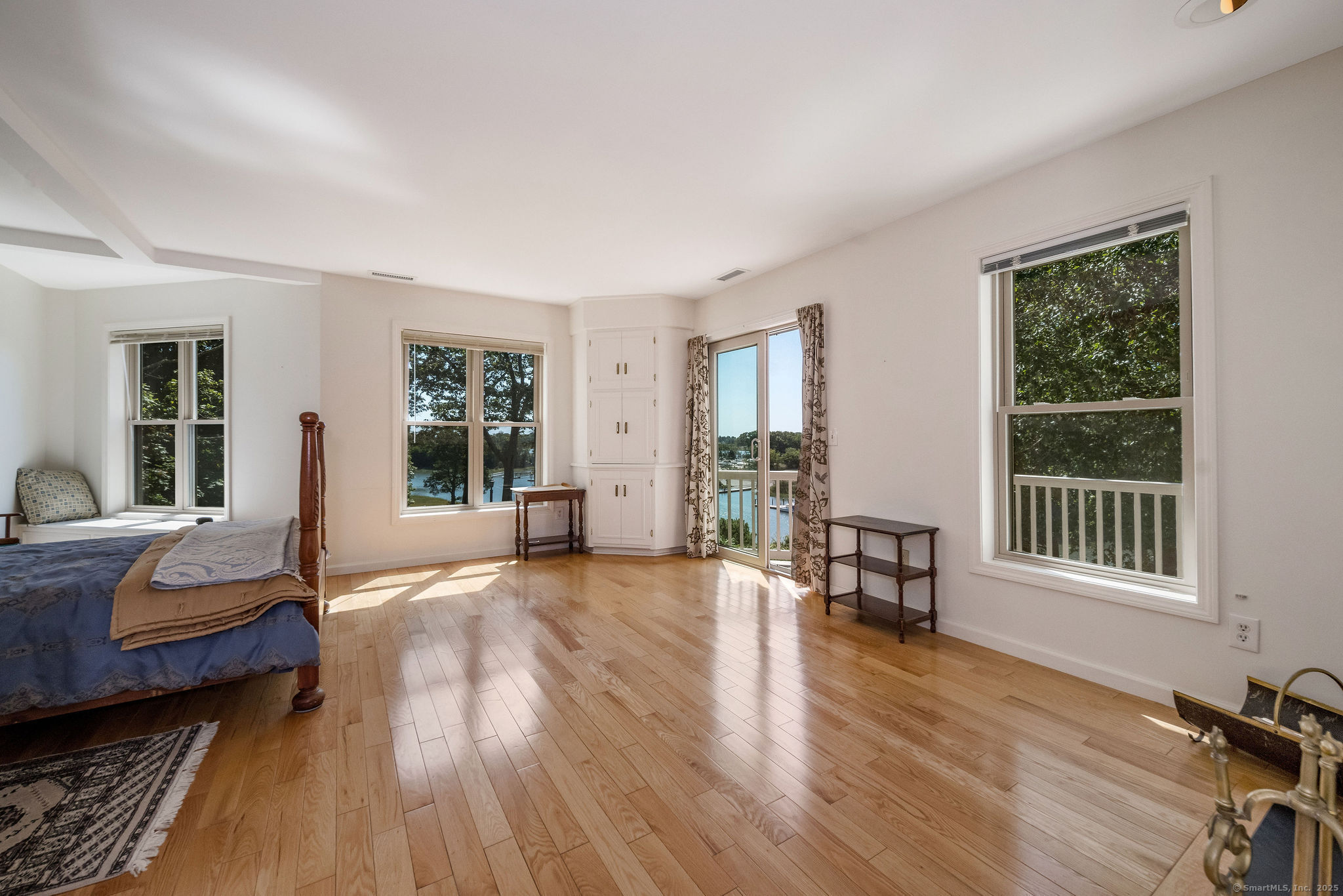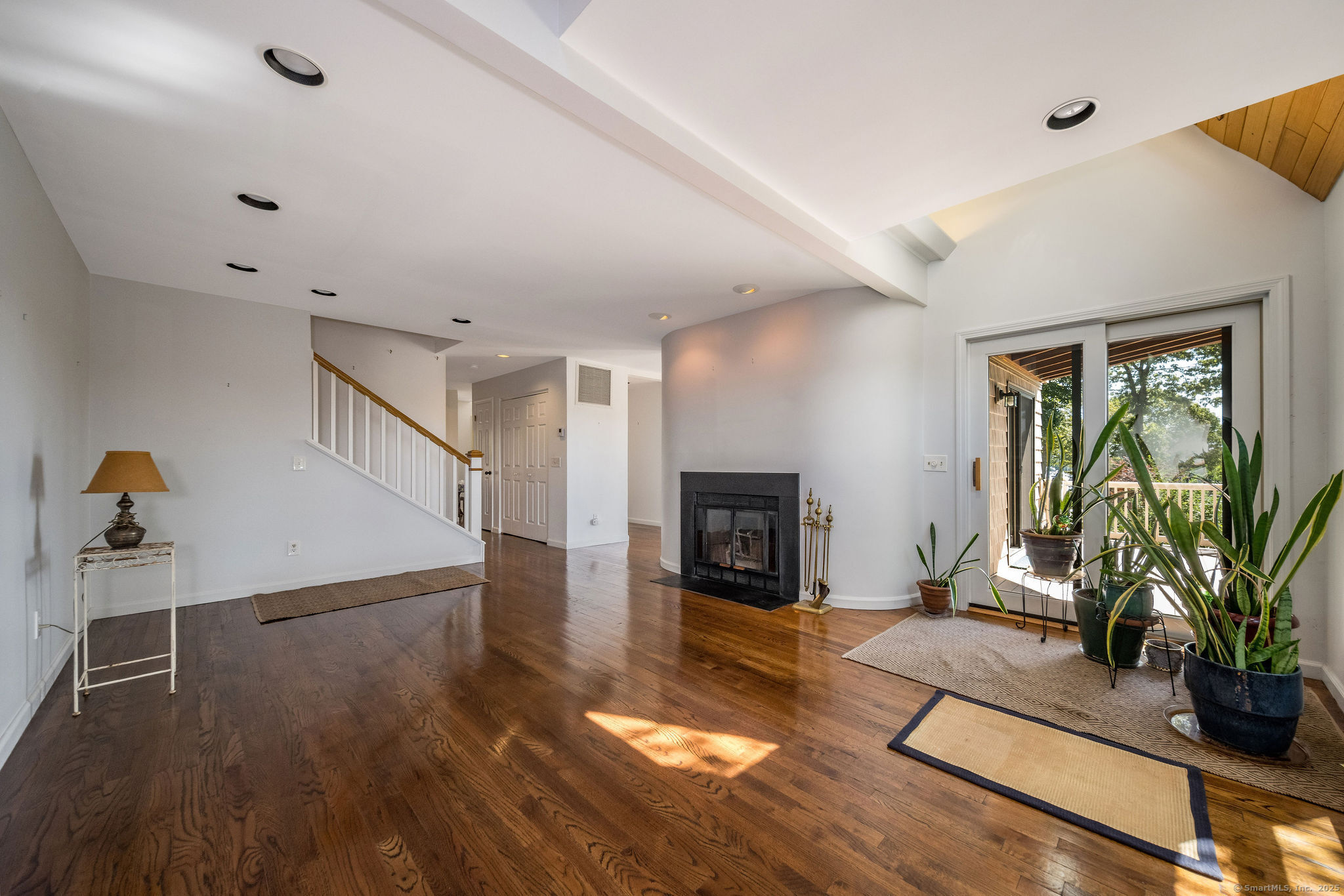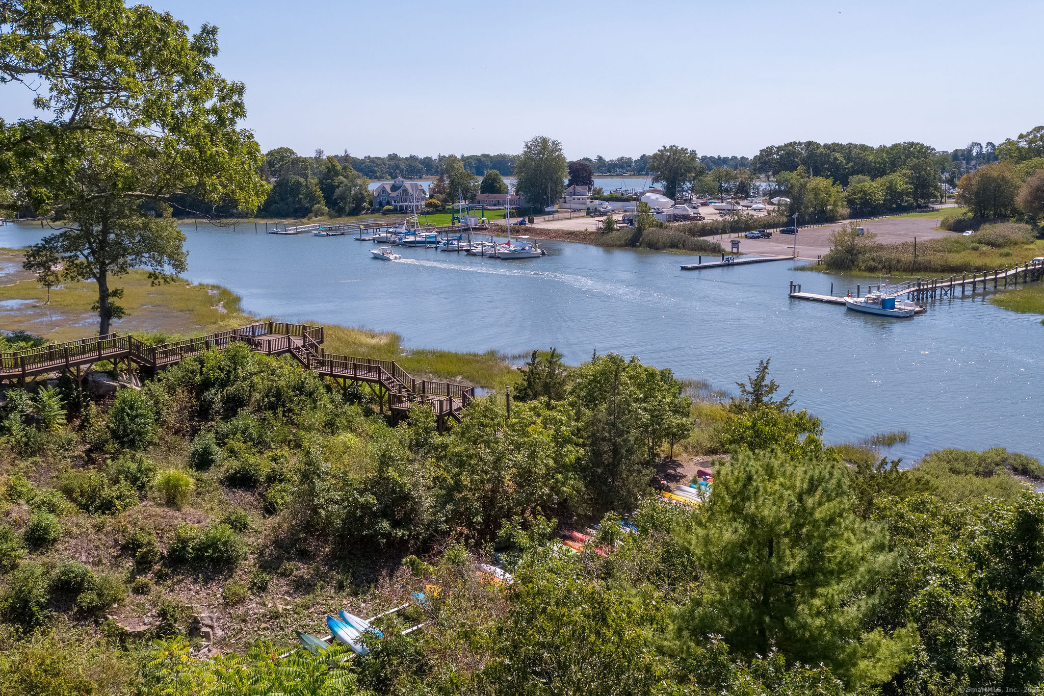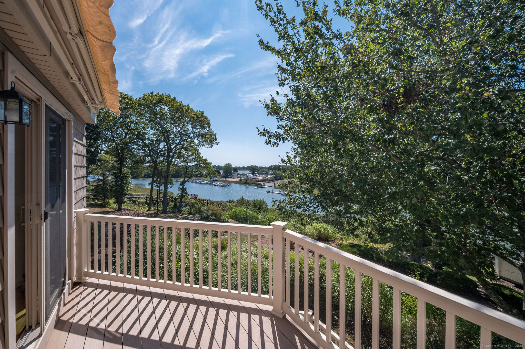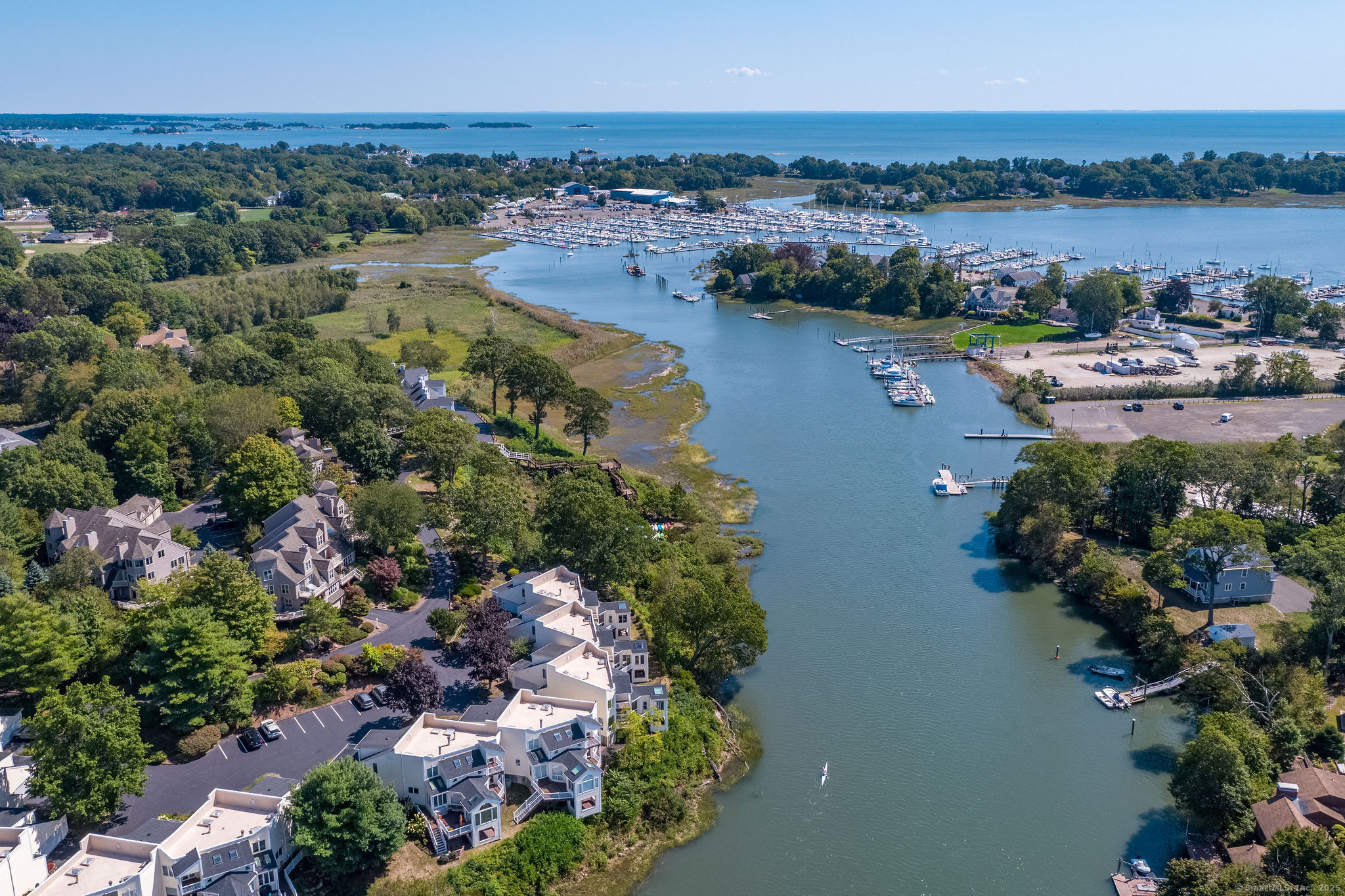 Stunning waterfront end unit with panoramic southerly views over the Branford River! This sun-filled townhome in a thoughtfully designed community features varied ceiling heights and unique vistas throughout. The renovated eat-in kitchen, dining room, and living room all showcase water views, while the living room adds a fireplace and deck access for seamless indoor-outdoor living. Thoughtful layout includes a first-floor guest bedroom and spectacular south-facing primary suite with river views, fireplace, private deck, and abundant built-ins. Two additional guest bedrooms and full bath complete the second floor. The third level offers a generous library/office/entertainment room with hardwood floors and potential for an additional bedroom. Lower level provides two flexible rooms perfect for office, media, crafts, or home gym. Two-car garage with ample storage. Association amenities include a renovated clubhouse, solar-heated pool, tennis/pickleball court, and kayak storage with river access. Prime location minutes from Branford Train Station, town center, multiple marinas, and Foote Park. Just 15 minutes to Yale, 75 miles to NYC. See link for rendered video.