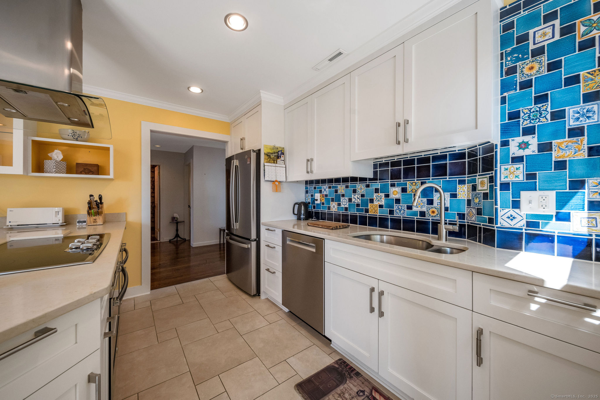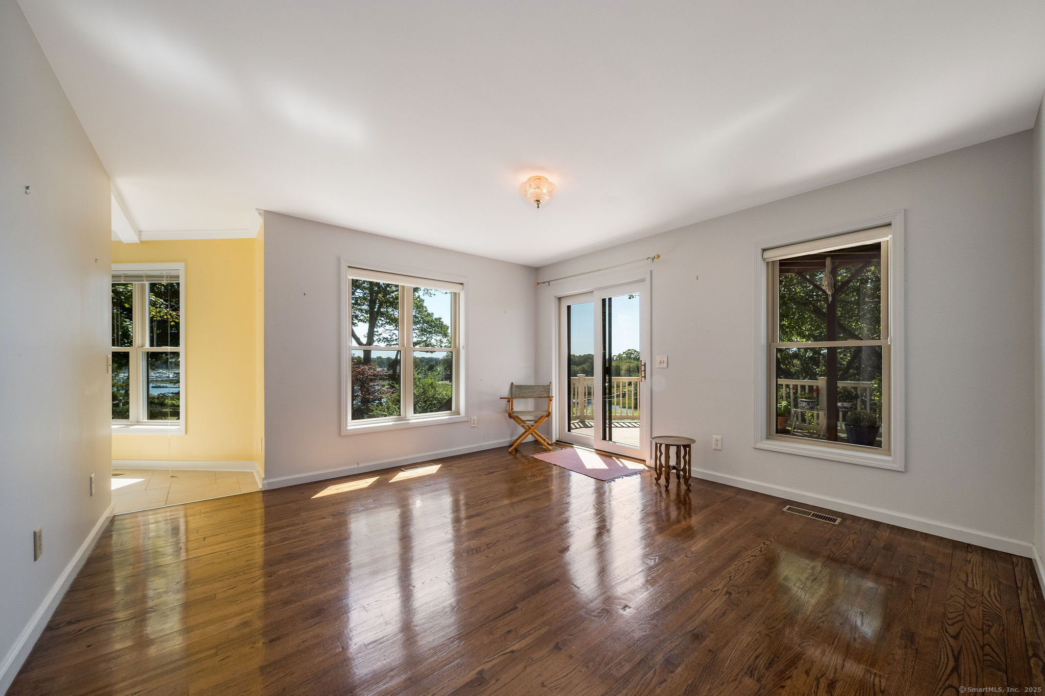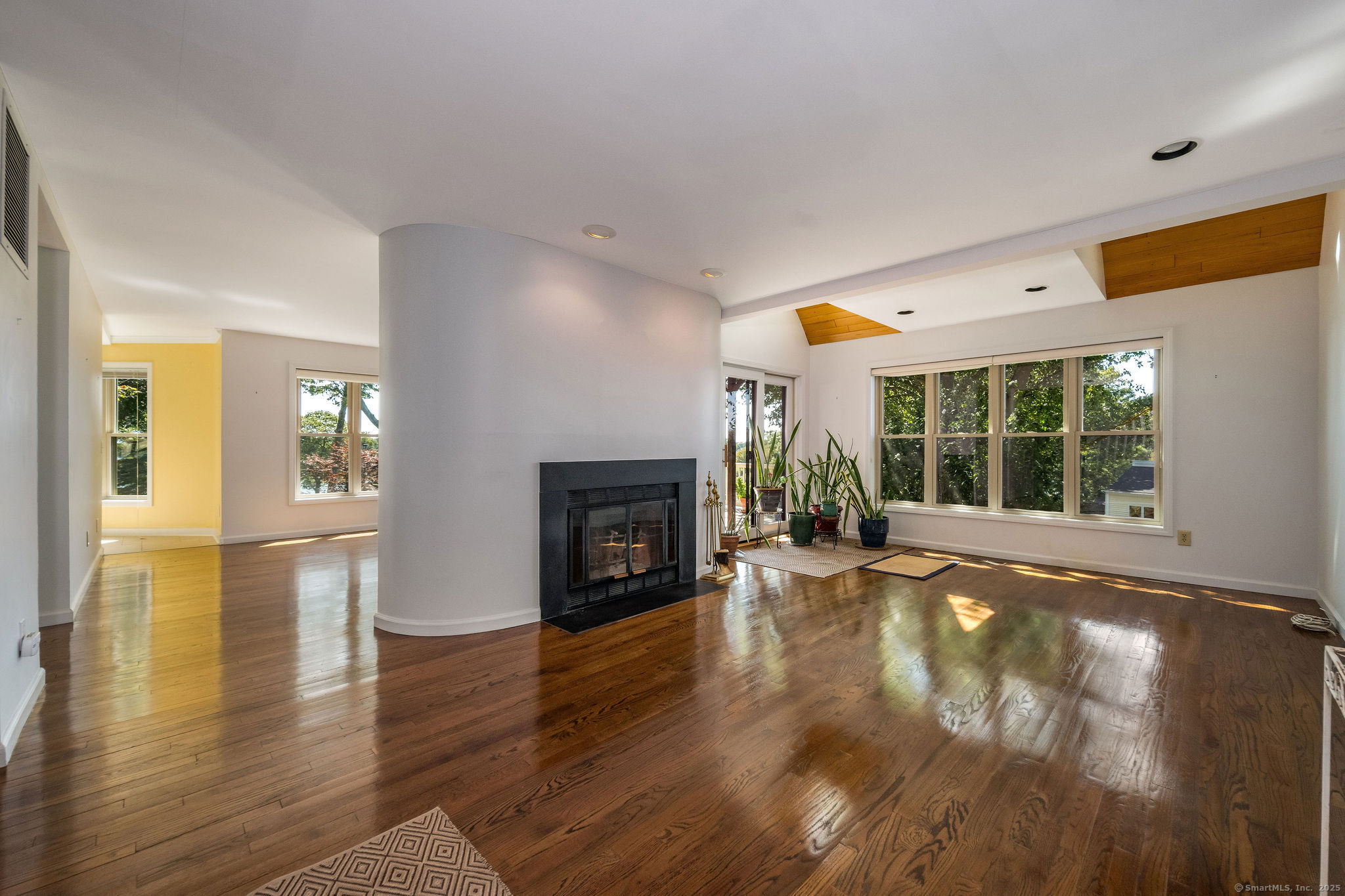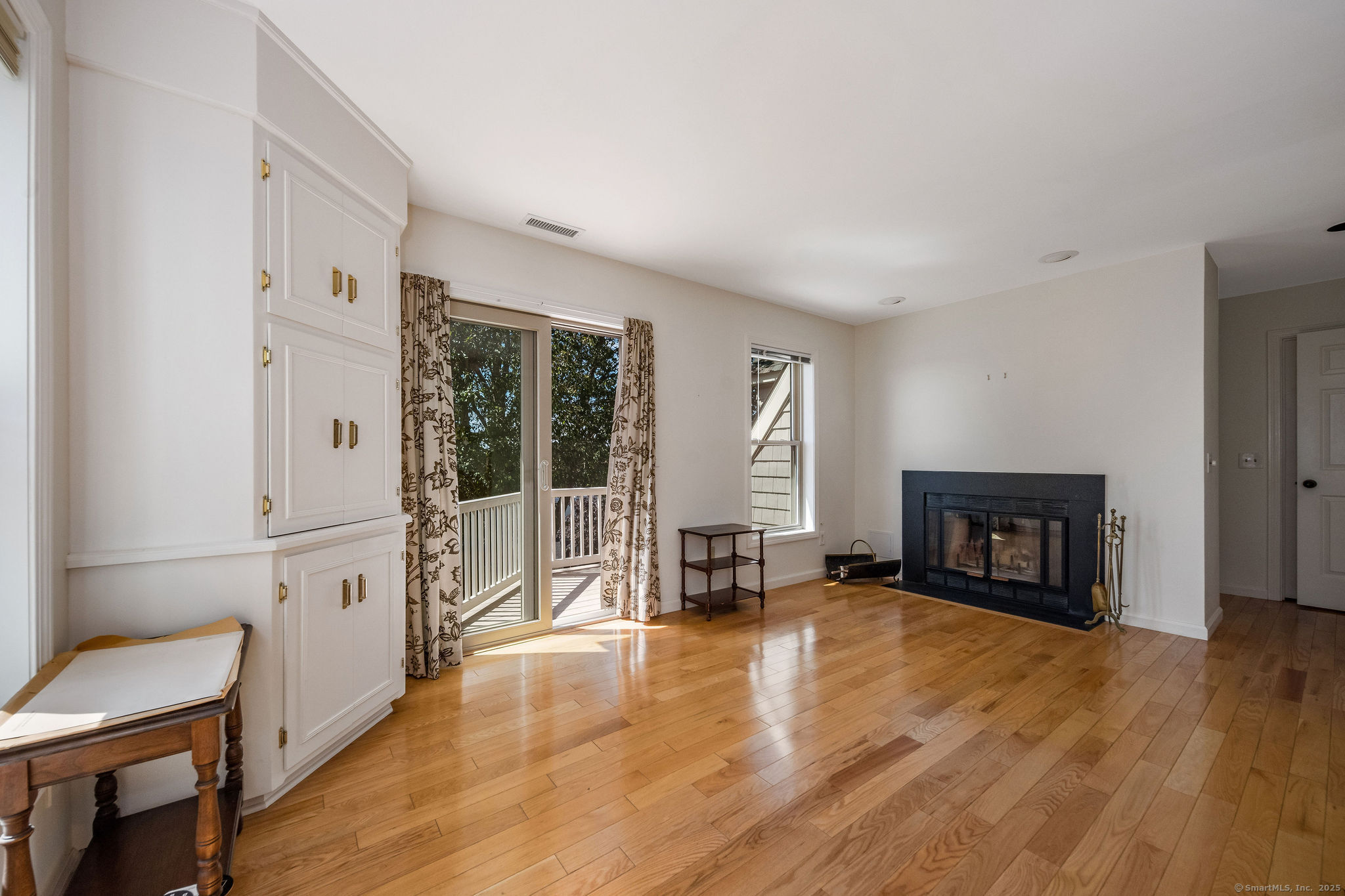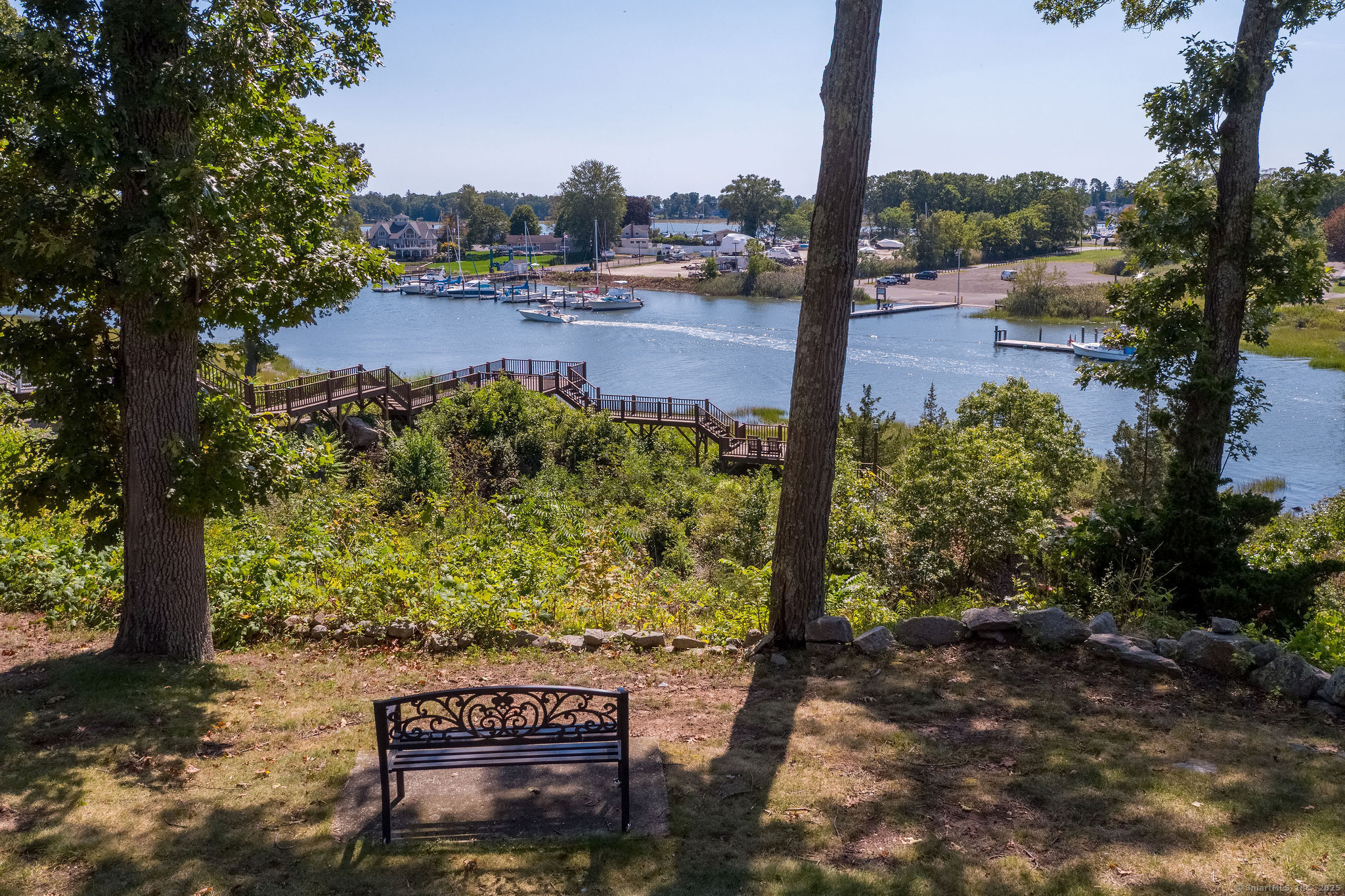 Stunning waterfront end unit with panoramic southerly views over the Branford River! This sun-filled townhome in a thoughtfully designed community features varied ceiling heights and unique vistas throughout. The renovated eat-in kitchen, dining room, and living room all showcase water views, while the living room adds a fireplace and deck access for seamless indoor-outdoor living. Thoughtful layout includes a first-floor guest bedroom and spectacular south-facing primary suite with river views, fireplace, private deck, and abundant built-ins. Two additional guest bedrooms and full bath complete the second floor. The third level offers a generous library/office/entertainment room with hardwood floors and potential for an additional bedroom. Lower level provides two flexible rooms perfect for office, media, crafts, or home gym. Two-car garage with ample storage. Association amenities include a renovated clubhouse, solar-heated pool, tennis/pickleball court, and kayak storage with river access. Prime location minutes from Branford Train Station, town center, multiple marinas, and Foote Park. Just 15 minutes to Yale, 75 miles to NYC. See link for rendered video.