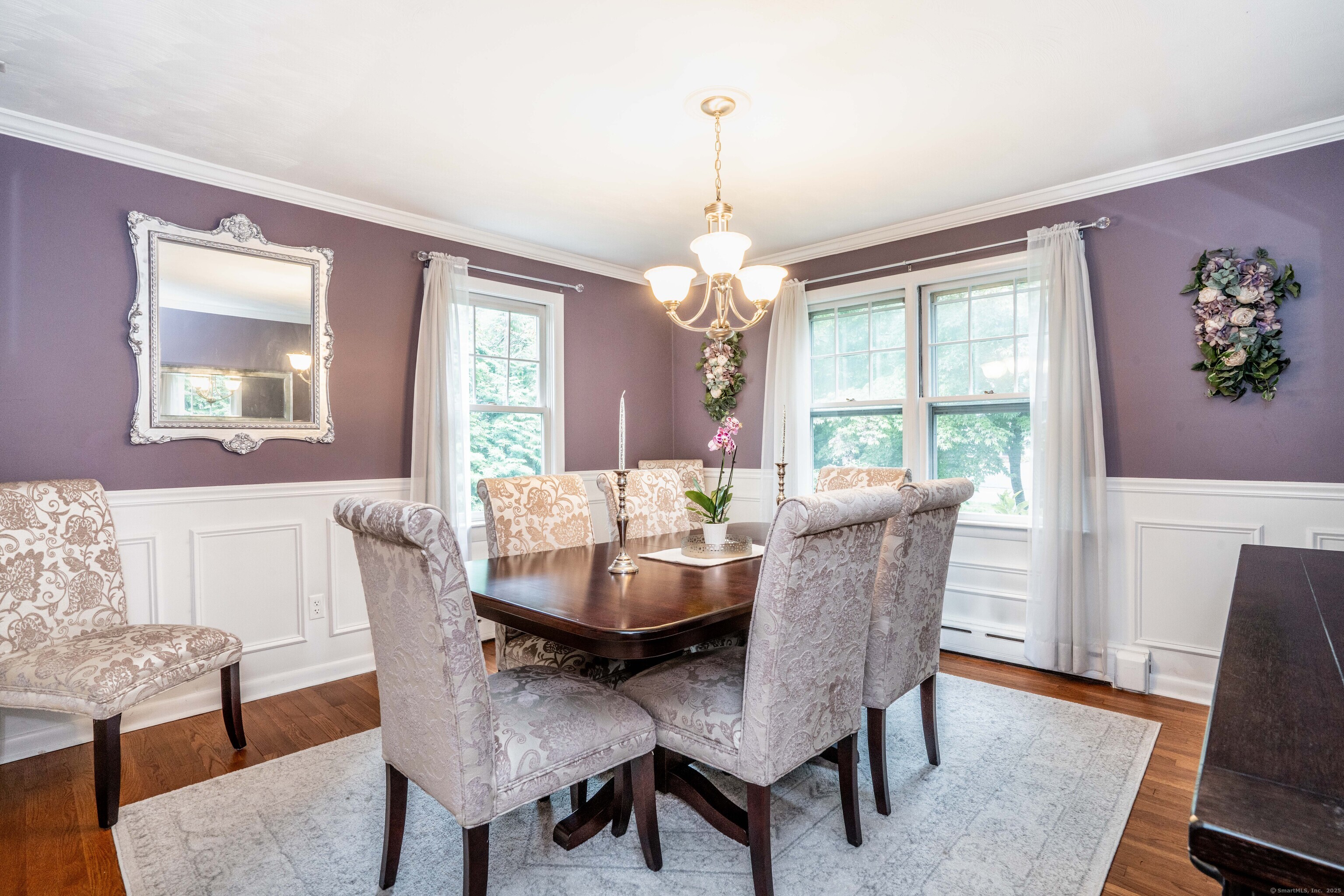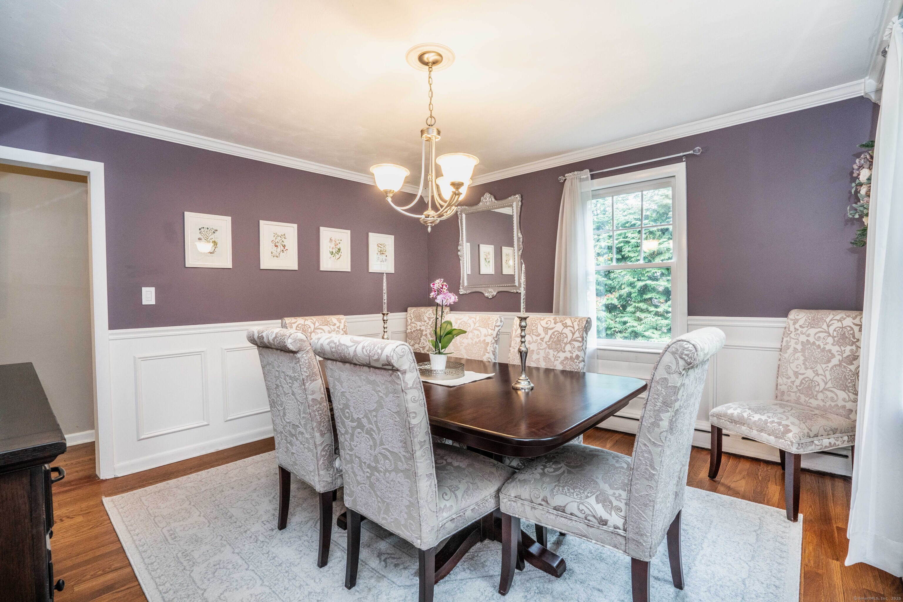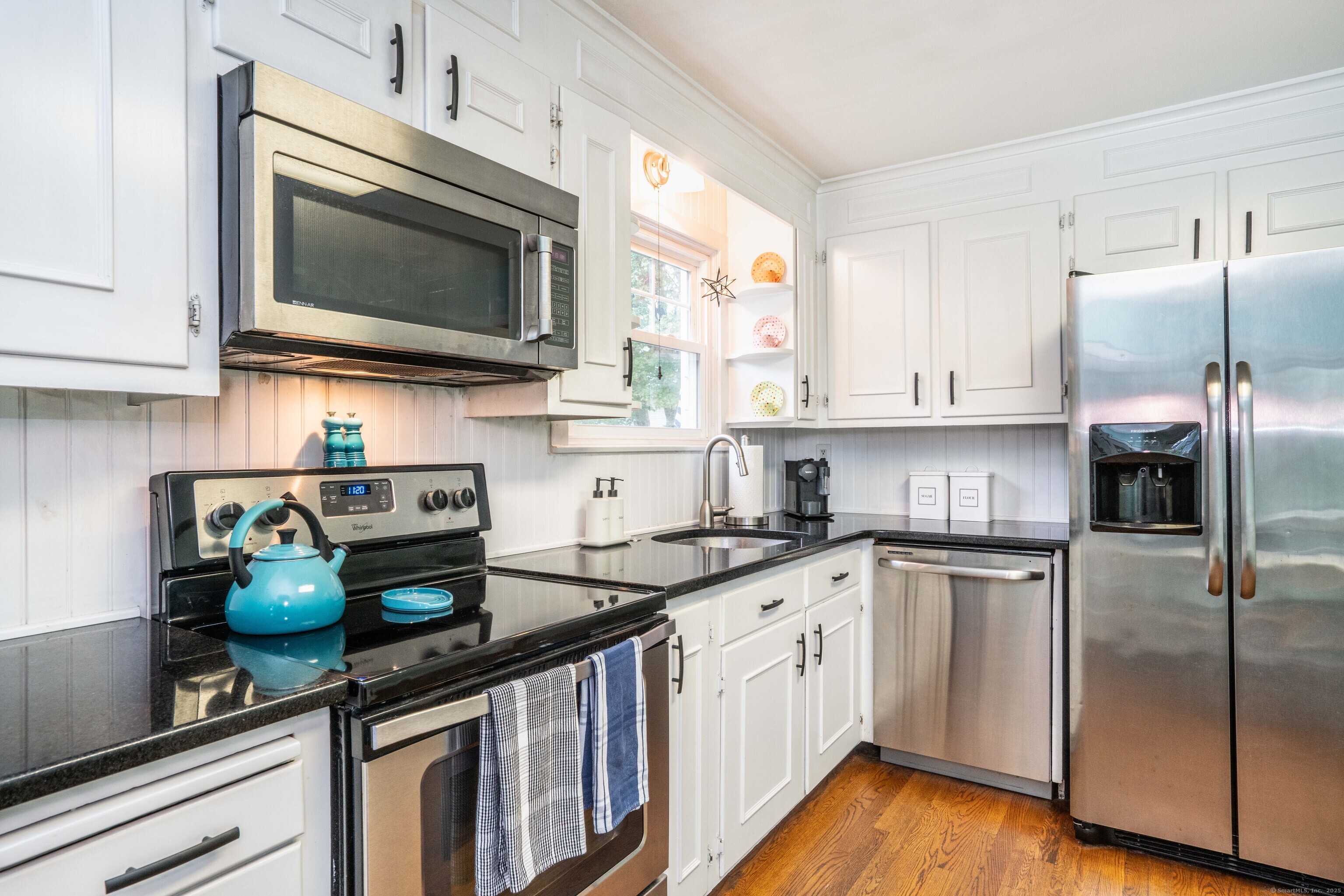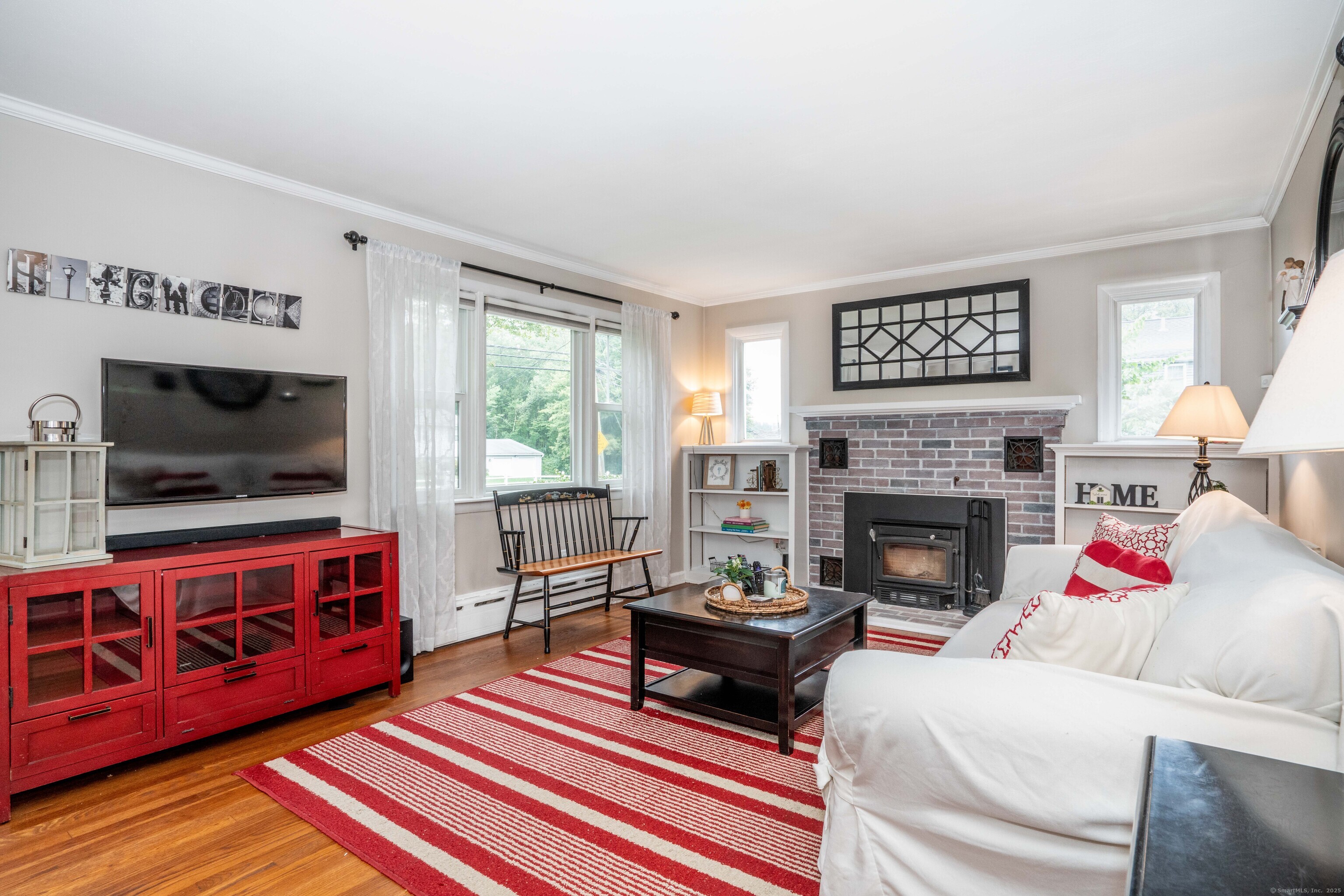 Sweet, move-in ready Cape in the Unionville section of Farmington! This charming home features 3 bedrooms, 2 beautifully remodeled full baths, and hardwood floors throughout. Step into the welcoming foyer with a guest closet and storage shelves, then through a French door into the sun-filled living room with a wood-burning fireplace and custom built-ins. The dining room impresses with crown molding and raised panel details. The white kitchen offers granite counters, stainless appliances, a beadboard backsplash, and a versatile dining area-perfect as-is or instead, with room to add an island with seating. A main-floor bedroom, currently used as an office, includes a large closet with built-ins. The first-floor full bath has been tastefully remodeled with a walk-in shower. Upstairs, you'll find raised panel details along the staircase leading to two additional bedrooms and a second remodeled bath with a tub/shower combo. A breezeway provides a practical mudroom space and opens to the backyard, featuring a paver patio, turf play area, and a spacious .65-acre lot. Additional highlights include many newer windows (including the large living room picture window) and an oversized 2-car garage. Don't miss the opportunity to make 6 Burlington your new home!