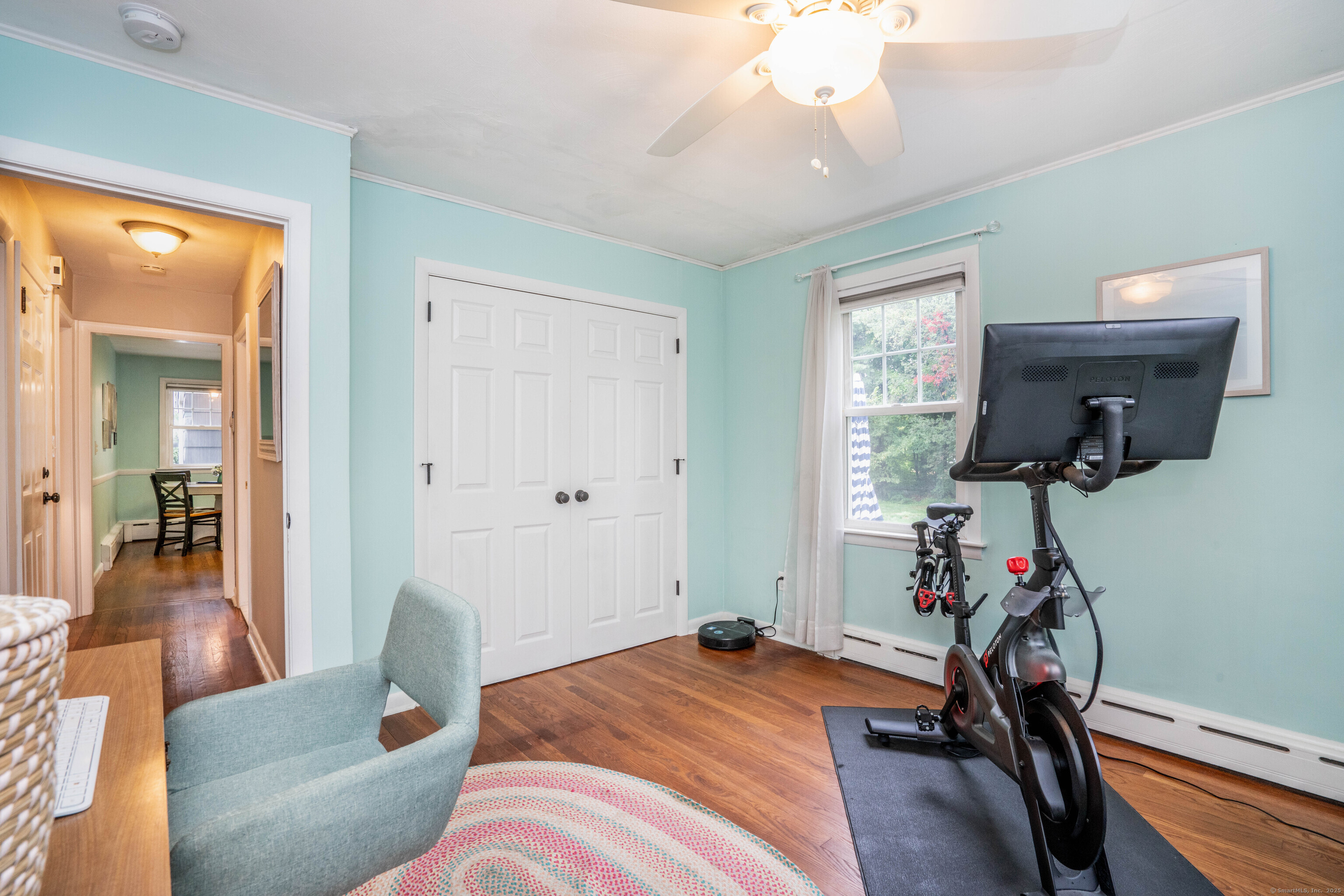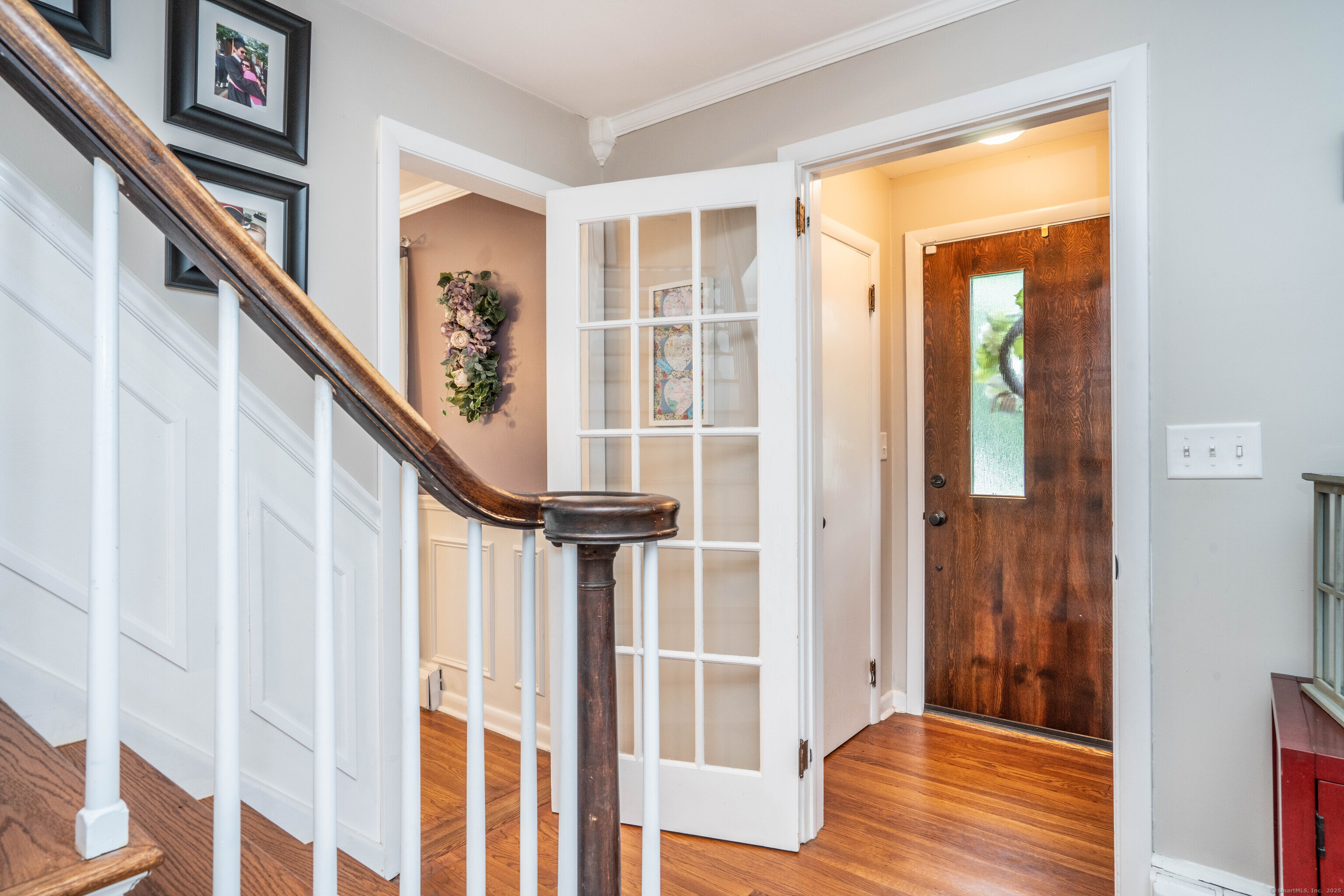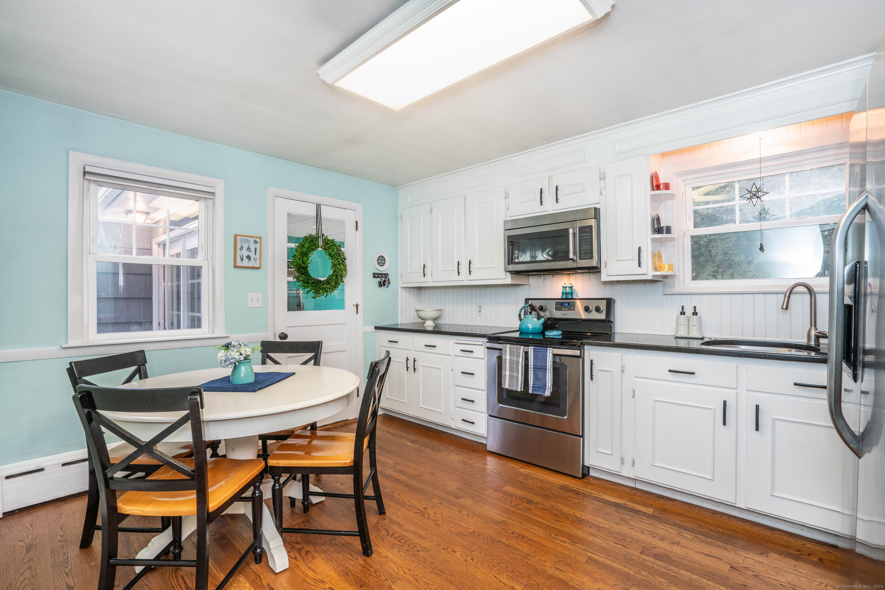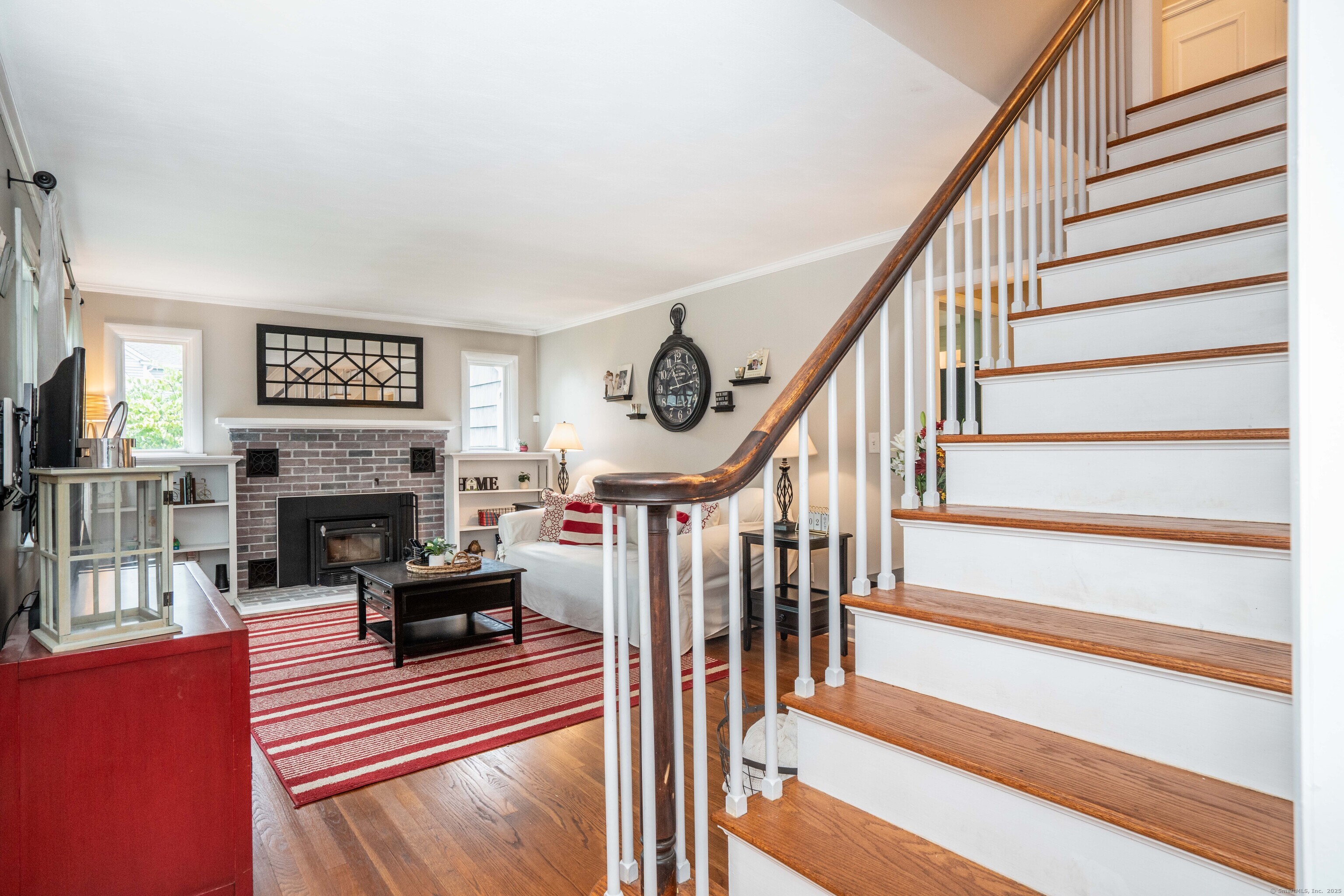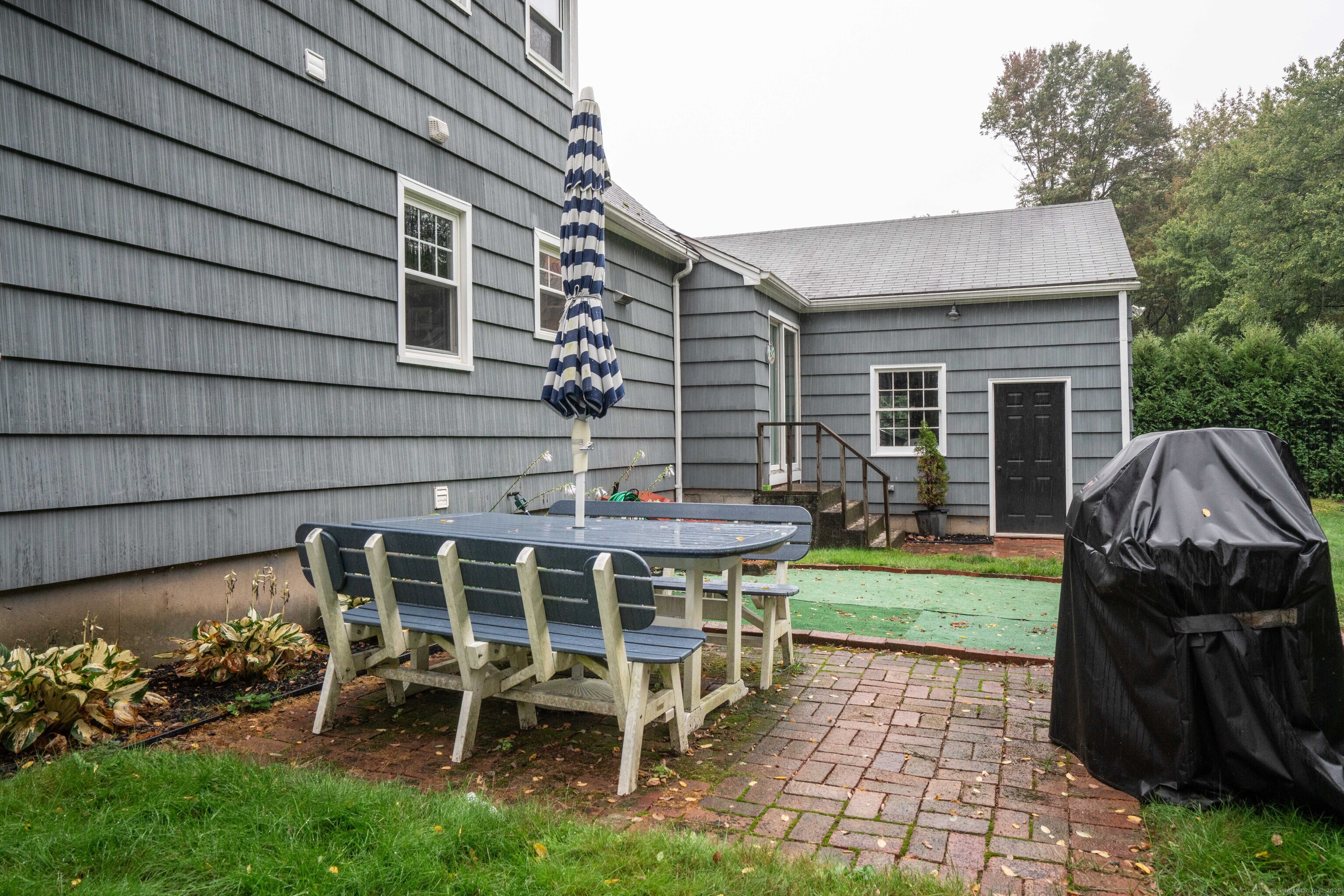 Sweet, move-in ready Cape in the Unionville section of Farmington! This charming home features 3 bedrooms, 2 beautifully remodeled full baths, and hardwood floors throughout. Step into the welcoming foyer with a guest closet and storage shelves, then through a French door into the sun-filled living room with a wood-burning fireplace and custom built-ins. The dining room impresses with crown molding and raised panel details. The white kitchen offers granite counters, stainless appliances, a beadboard backsplash, and a versatile dining area-perfect as-is or instead, with room to add an island with seating. A main-floor bedroom, currently used as an office, includes a large closet with built-ins. The first-floor full bath has been tastefully remodeled with a walk-in shower. Upstairs, you'll find raised panel details along the staircase leading to two additional bedrooms and a second remodeled bath with a tub/shower combo. A breezeway provides a practical mudroom space and opens to the backyard, featuring a paver patio, turf play area, and a spacious .65-acre lot. Additional highlights include many newer windows (including the large living room picture window) and an oversized 2-car garage. Don't miss the opportunity to make 6 Burlington your new home!