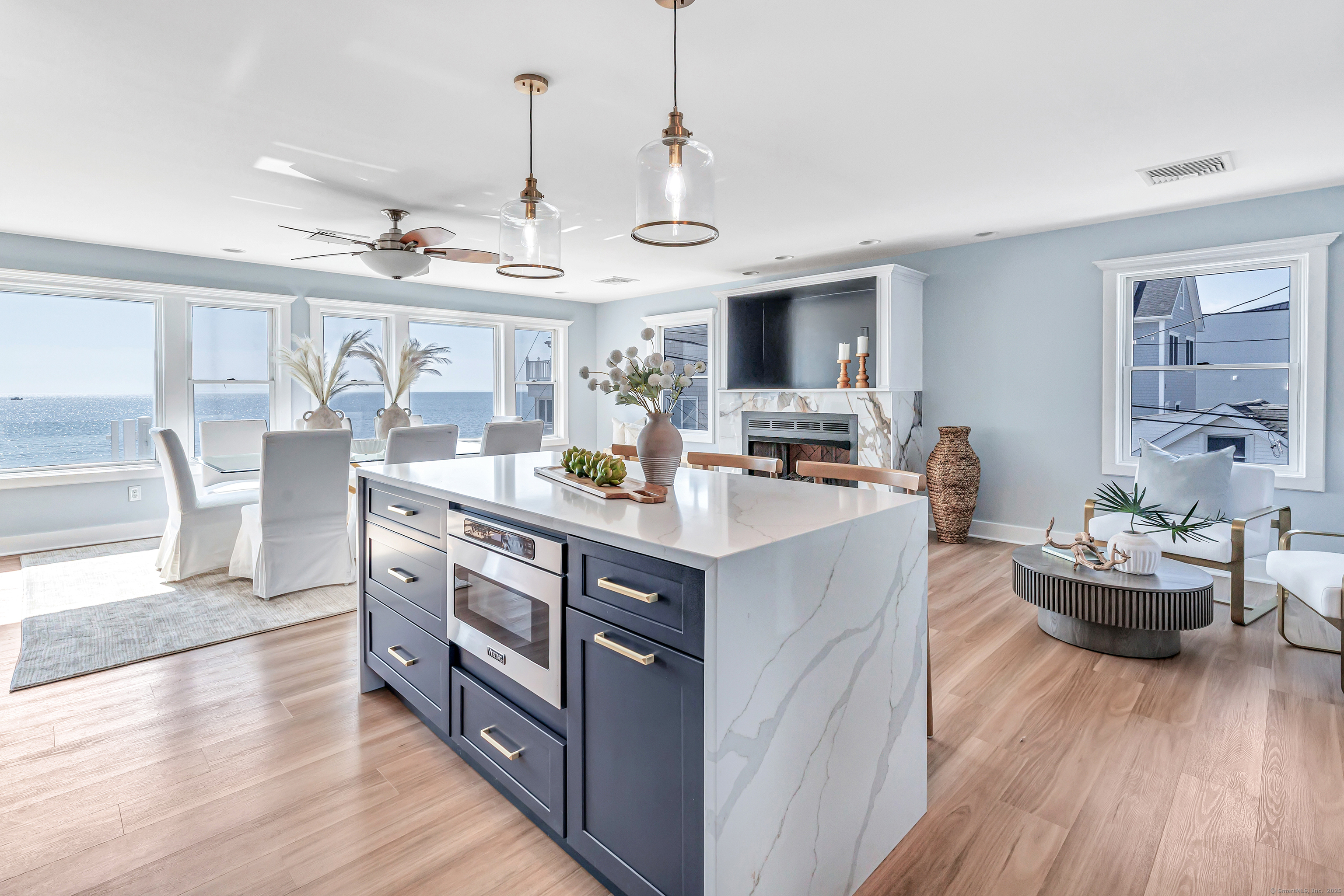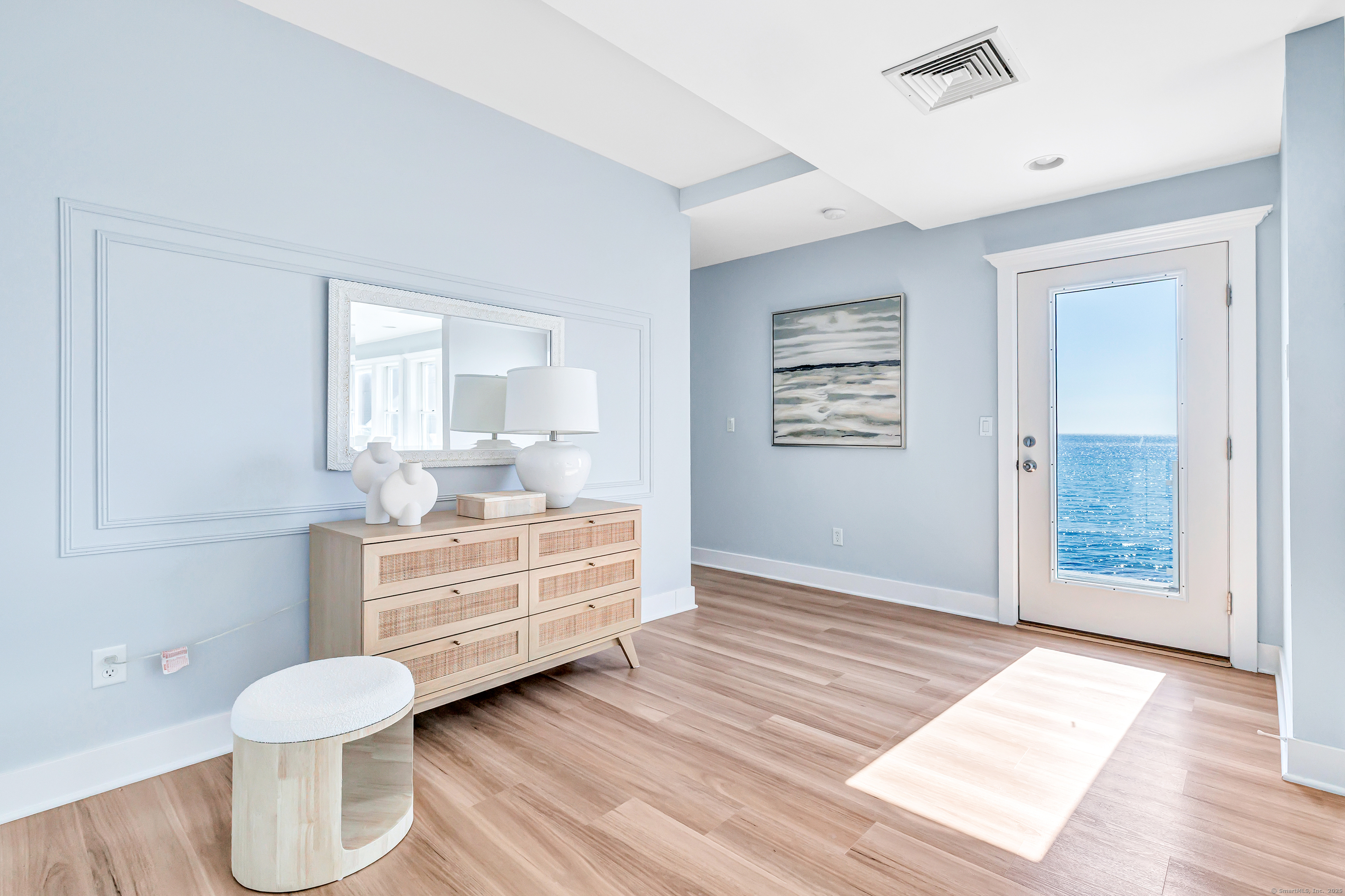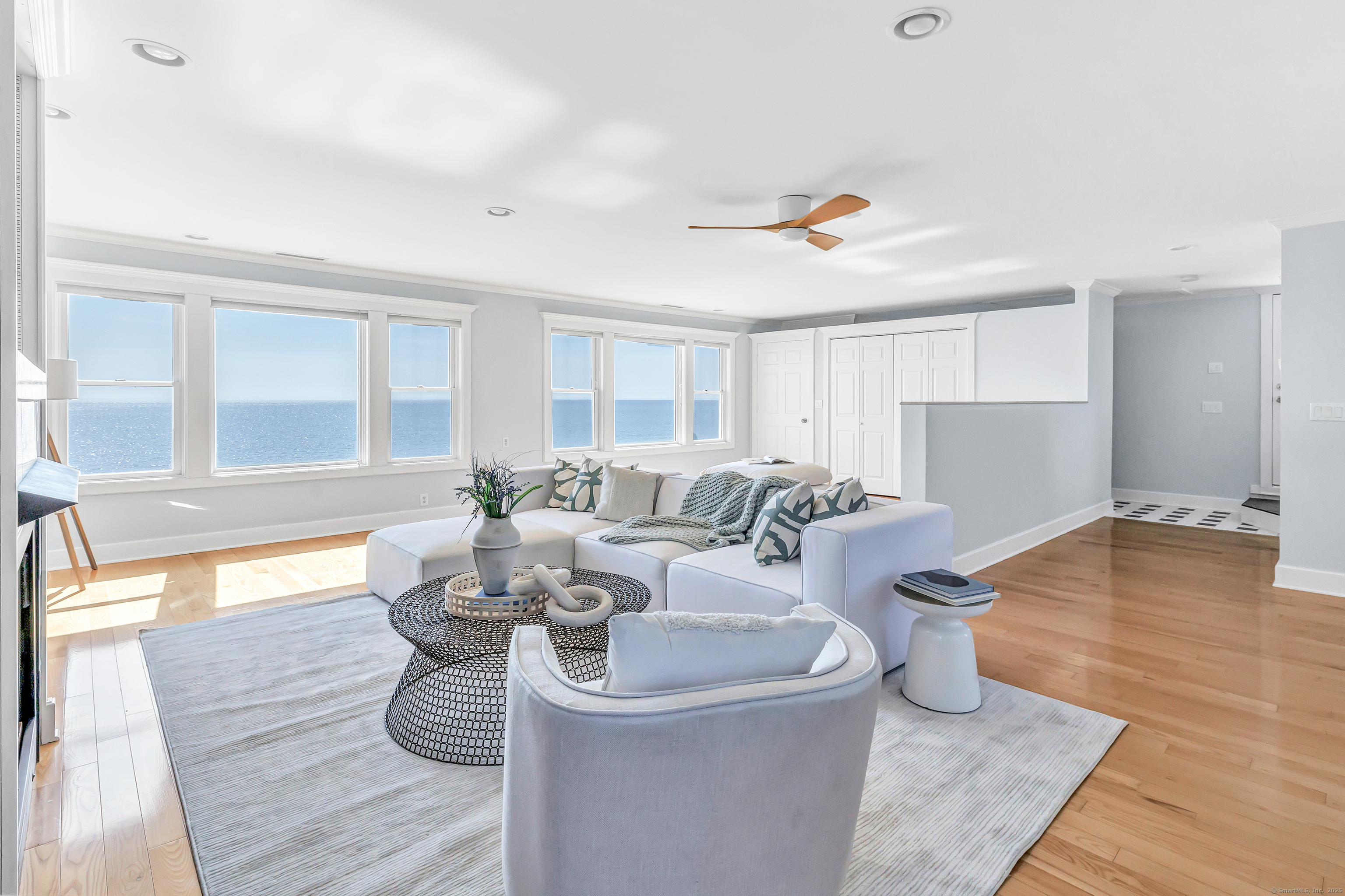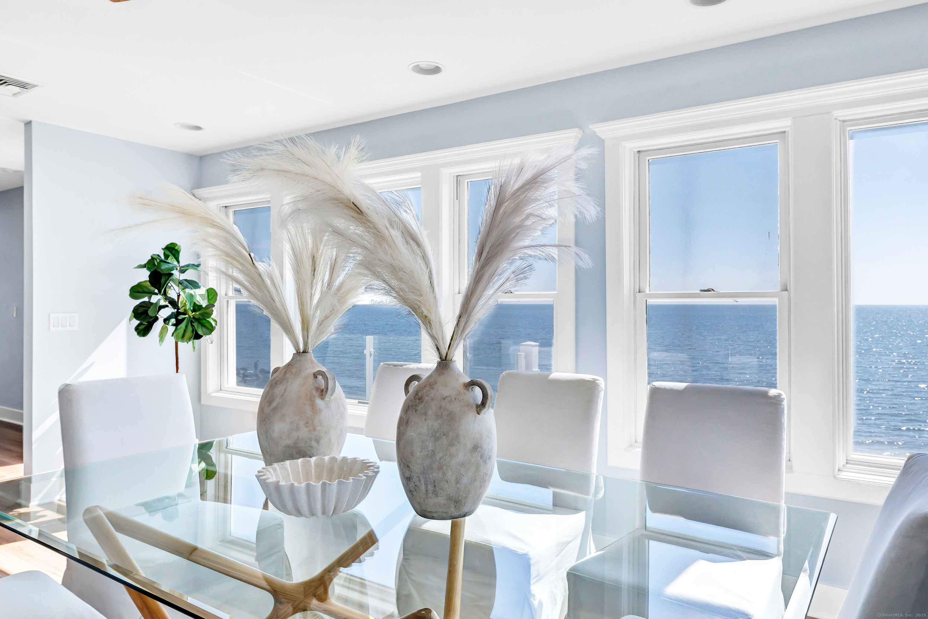 Beachfront Luxury with Panoramic Water Views!! Designed for effortless coastal living, this expansive residence offers sweeping vistas of Long Island Sound from nearly every room, with multiple terraces and decks overlooking the serene shoreline and glistening waters.The main level features a gourmet kitchen with high end Viking, Jenn-Air and Sub-Zero appliances, Calacatta Quartz countertops, and custom cabinetry, flowing seamlessly into a dining area with fireplace and walls of glass, plus a separate living room with fireplace and full wet bar, oversized Calacatta Quartz island, wine chiller, and ice maker. The upper level presents six beautifully updated bedrooms and four full baths, while the third level boasts a luxurious guest suite or family/bonus room with fireplace and access to an expansive rooftop terrace. Step outside to direct access to the sandy shore, perfect for kayaking, paddleboarding, or simply enjoying the tranquil waterfront. Stroll the scenic boardwalk to Silver Sands State Park, and savor seasonal concerts at the Walnut Beach pavilion. This exceptional home offers the ultimate combination of refined coastal living, walkable convenience, and sophisticated shoreline lifestyle, creating a rare and highly desirable opportunity for those seeking a premier coastal retreat.