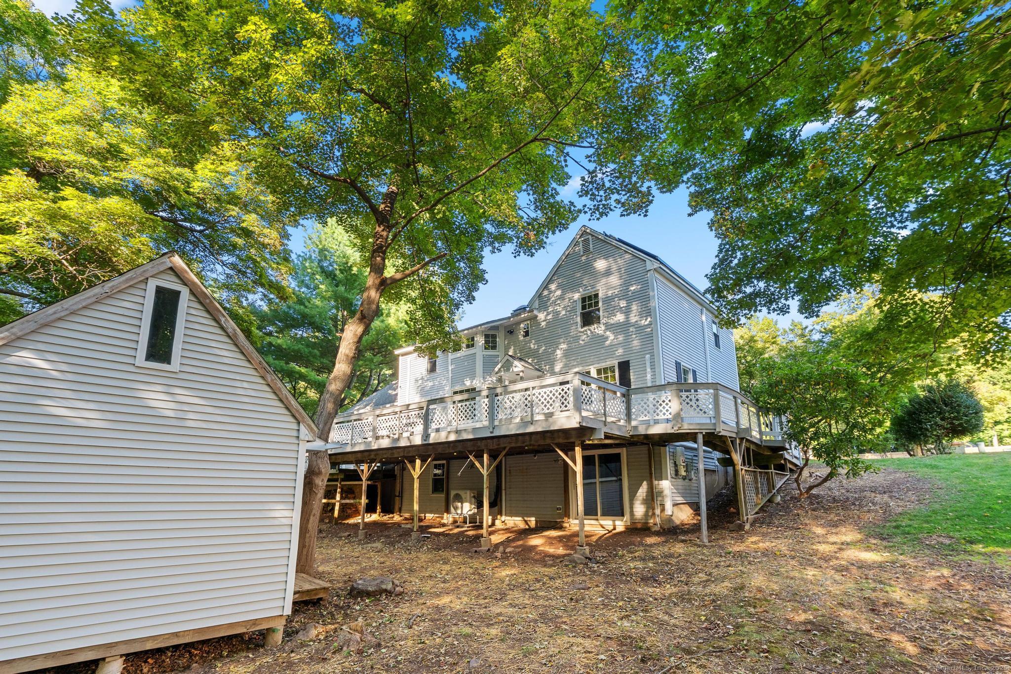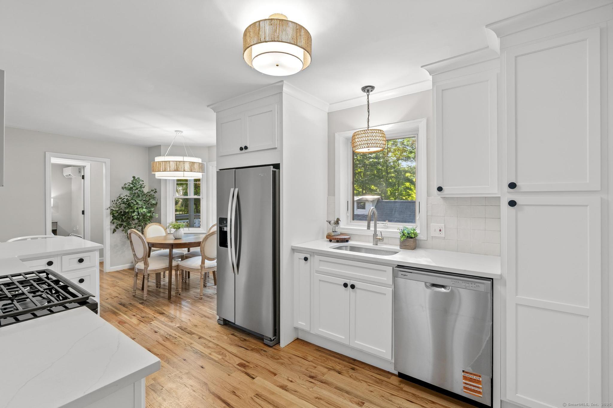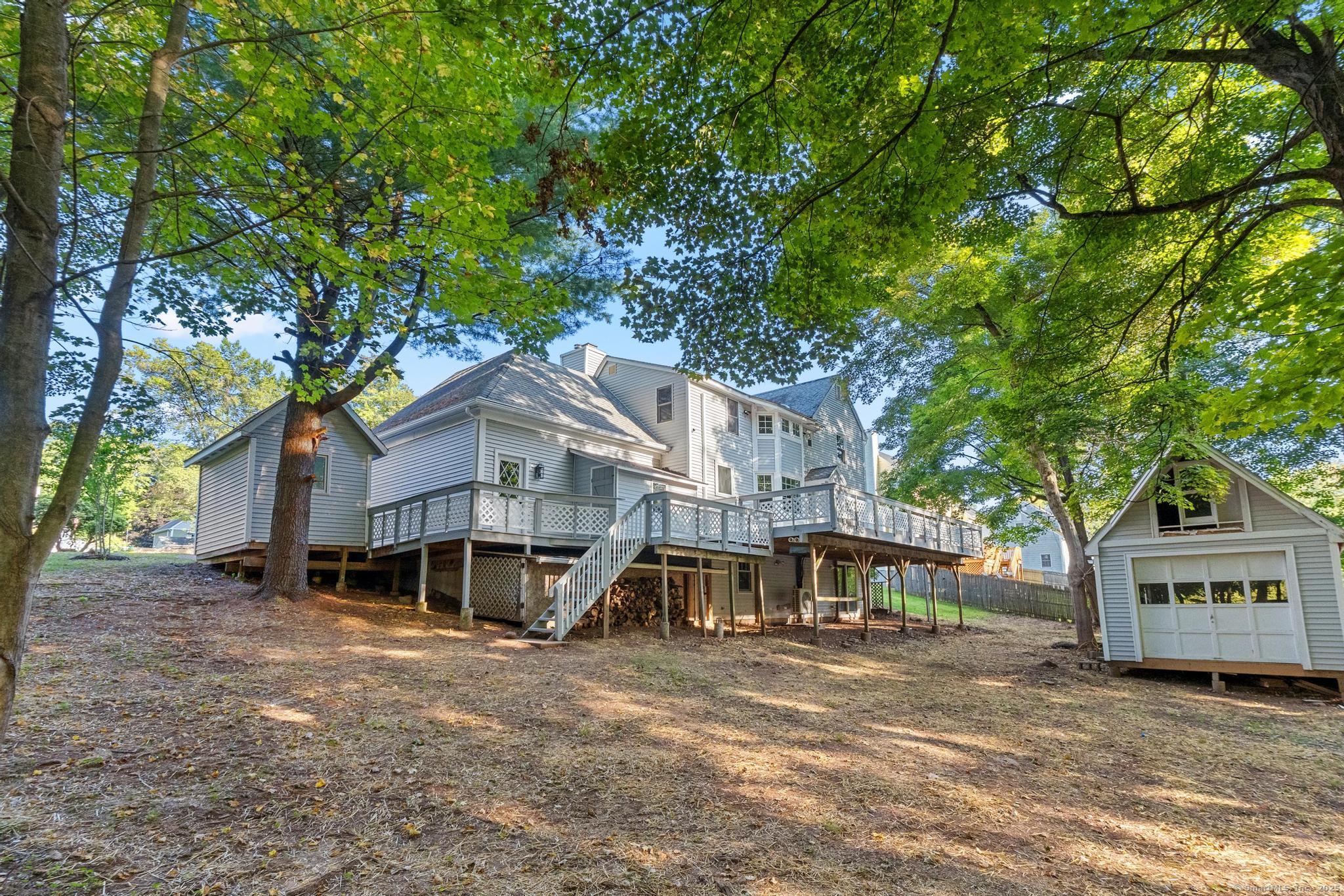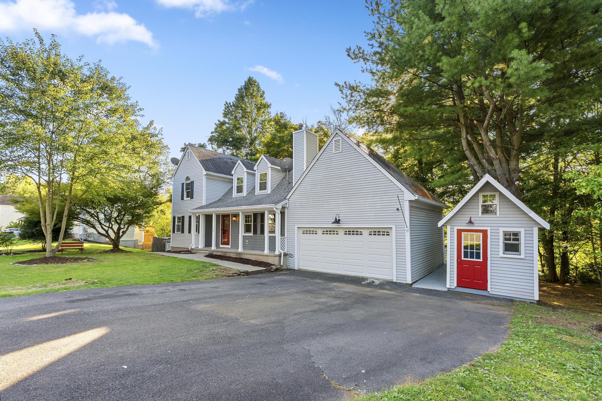 This oversized 3-bedroom, 2.5-bath Cape Cod with attached 2 car garage located on a desirable cul-de-sac has a finished basement with plenty of storage. This home has been beautifully updated inside and out. Step into a bright interior with refinished hardwood floors throughout. The stunning new kitchen with all-new cabinetry, and appliances, and a gas stove, The primary suite on the main level includes a walk-in closet and a fully remodeled bathroom with gorgeous tile. glass shower doors. Additional highlights include new AC, new hot water tank, and two versatile outbuildings. Truly move-in ready, this home combines classic Cape charm with modern updates. Enjoy cozy evenings by the living room fireplace or entertain on the expansive back deck that spans the entire length of the home, easily accessed from the front porch and ramp walkway.
