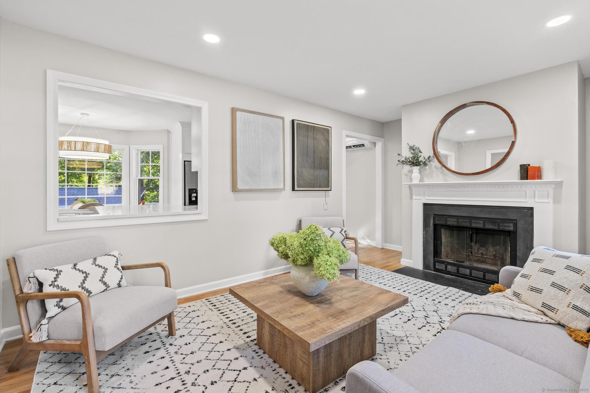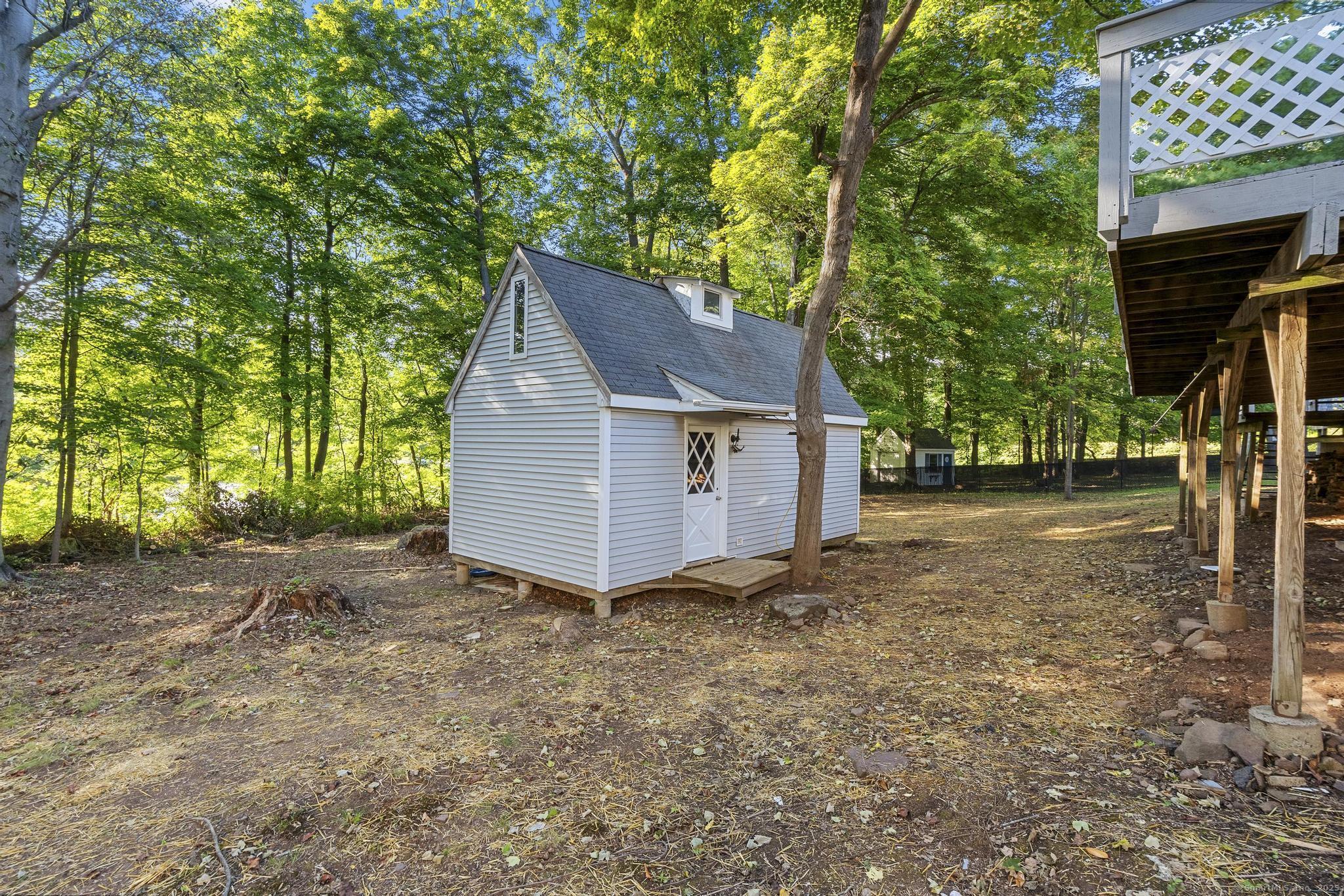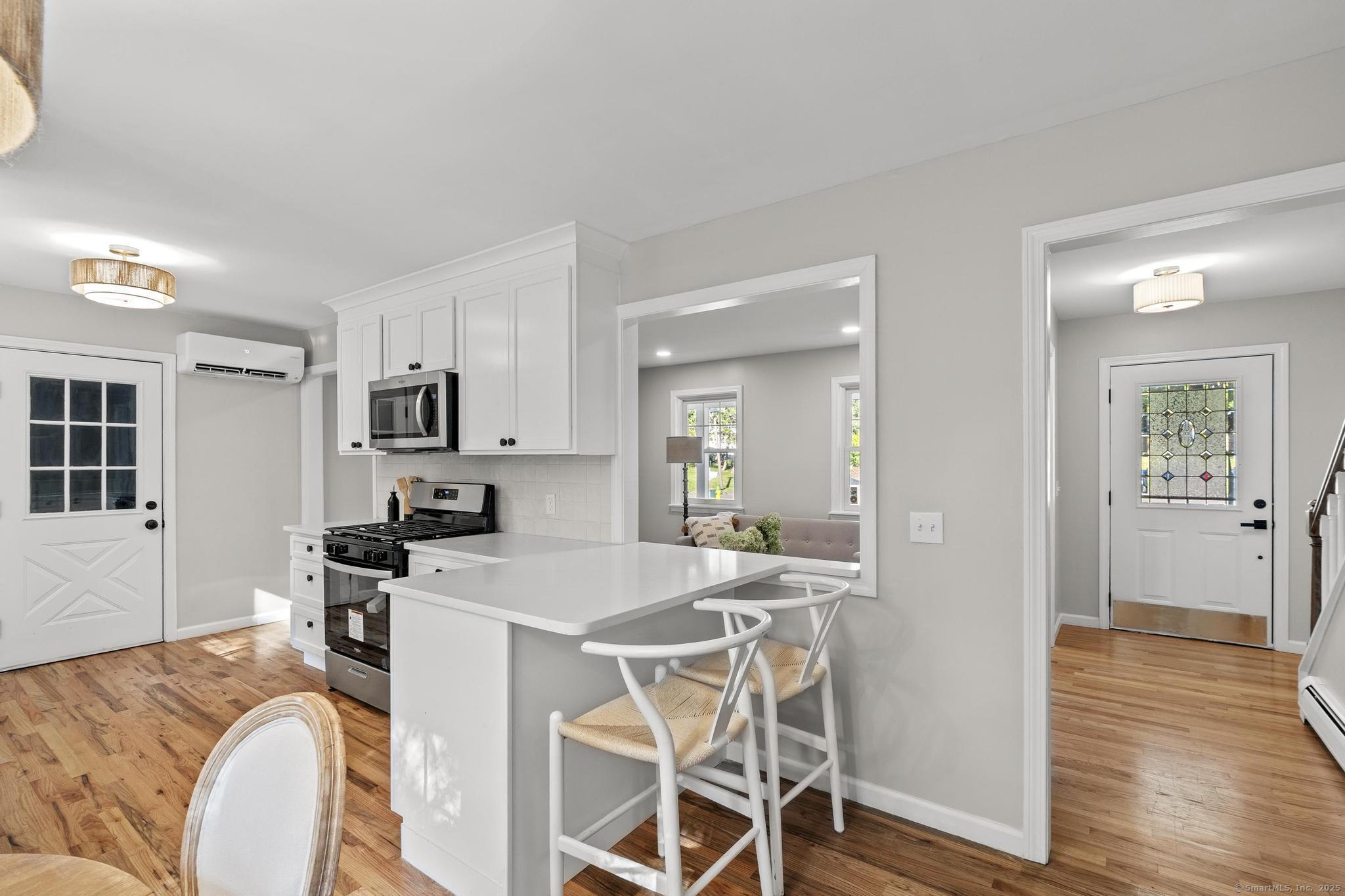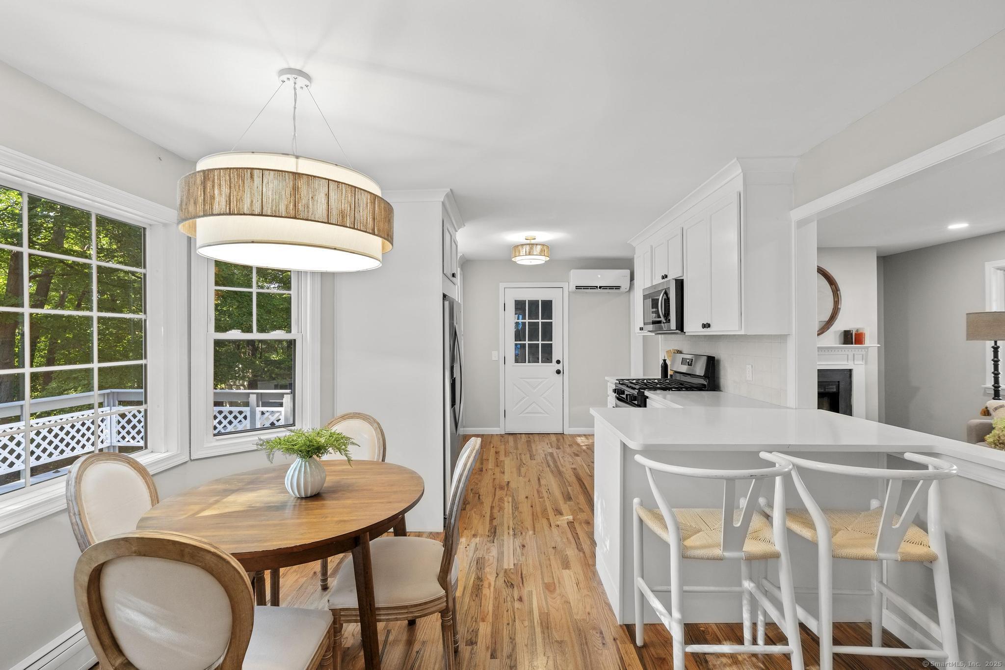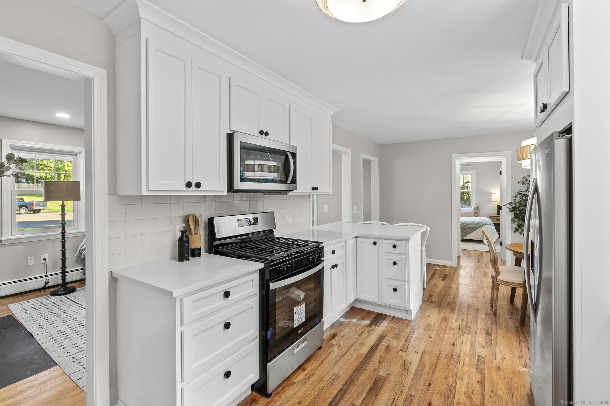 This oversized 3-bedroom, 2.5-bath Cape Cod with attached 2 car garage located on a desirable cul-de-sac has a finished basement with plenty of storage. This home has been beautifully updated inside and out. Step into a bright interior with refinished hardwood floors throughout. The stunning new kitchen with all-new cabinetry, and appliances, and a gas stove, The primary suite on the main level includes a walk-in closet and a fully remodeled bathroom with gorgeous tile. glass shower doors. Additional highlights include new AC, new hot water tank, and two versatile outbuildings. Truly move-in ready, this home combines classic Cape charm with modern updates. Enjoy cozy evenings by the living room fireplace or entertain on the expansive back deck that spans the entire length of the home, easily accessed from the front porch and ramp walkway.