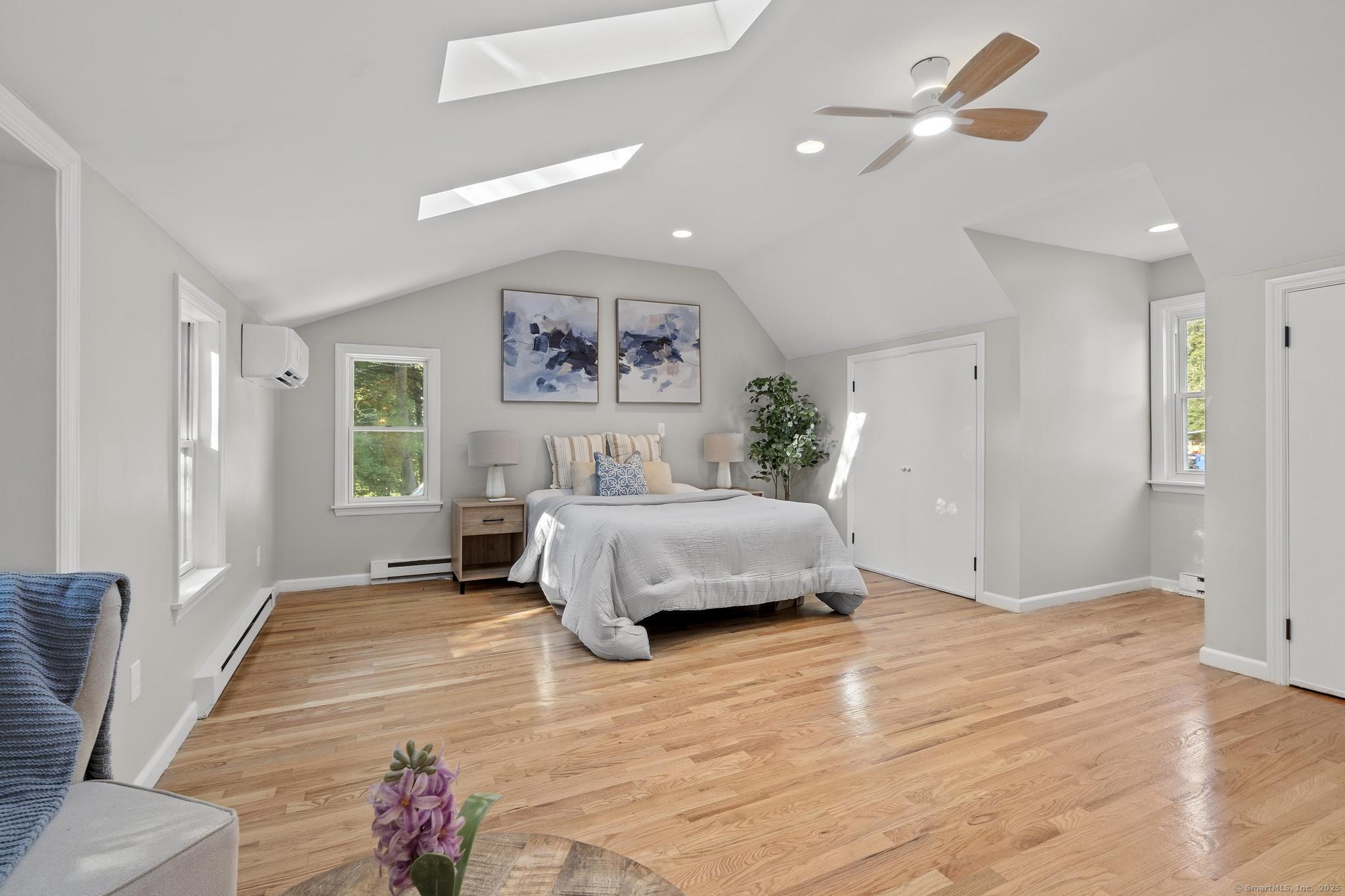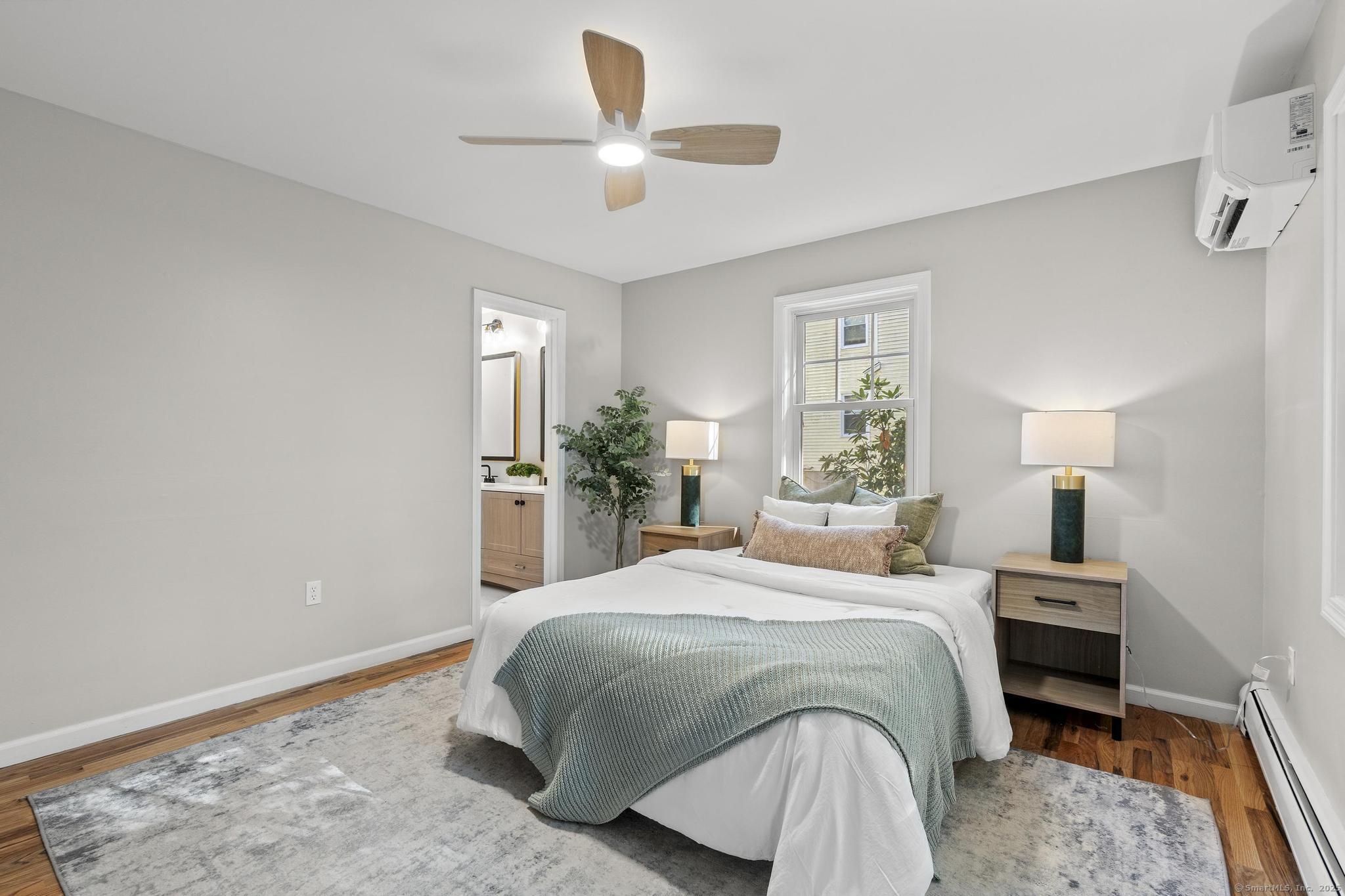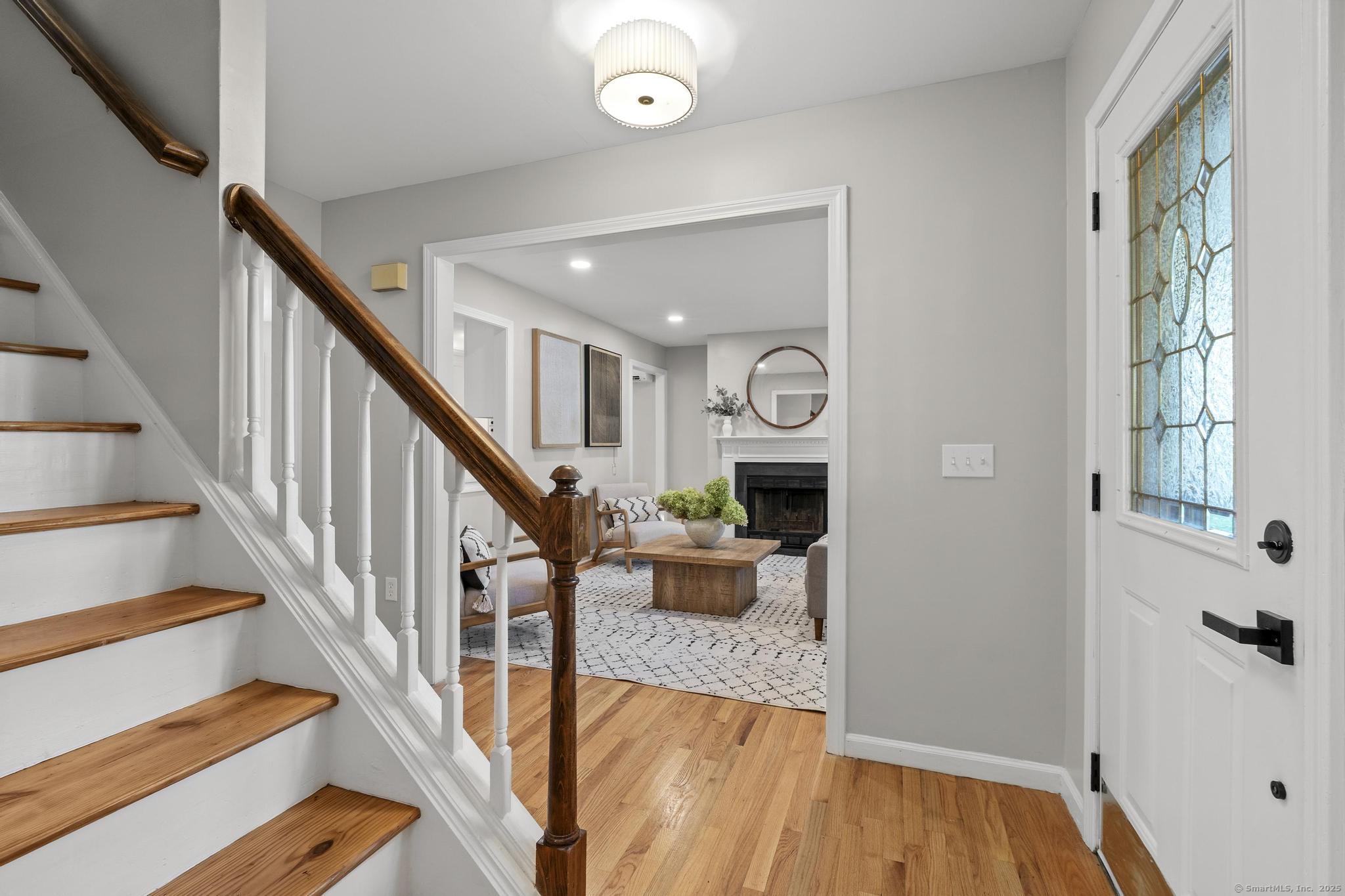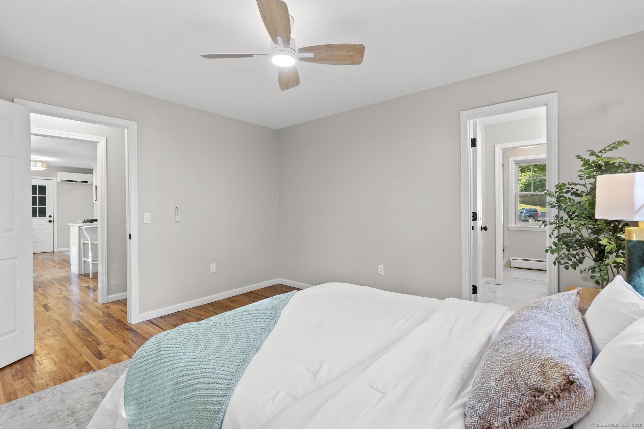 This oversized 3-bedroom, 2.5-bath Cape Cod with attached 2 car garage located on a desirable cul-de-sac has a finished basement with plenty of storage. This home has been beautifully updated inside and out. Step into a bright interior with refinished hardwood floors throughout. The stunning new kitchen with all-new cabinetry, and appliances, and a gas stove, The primary suite on the main level includes a walk-in closet and a fully remodeled bathroom with gorgeous tile. glass shower doors. Additional highlights include new AC, new hot water tank, and two versatile outbuildings. Truly move-in ready, this home combines classic Cape charm with modern updates. Enjoy cozy evenings by the living room fireplace or entertain on the expansive back deck that spans the entire length of the home, easily accessed from the front porch and ramp walkway.
