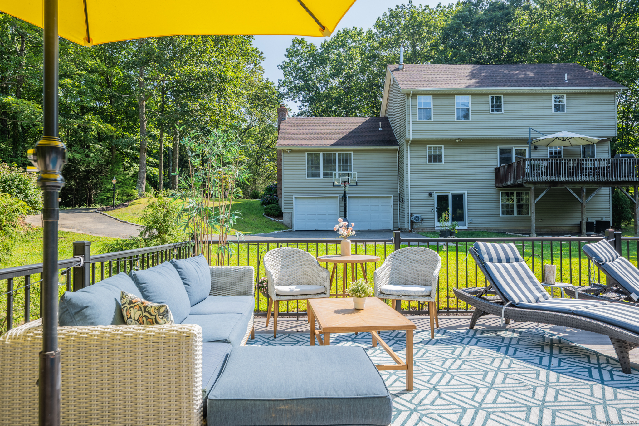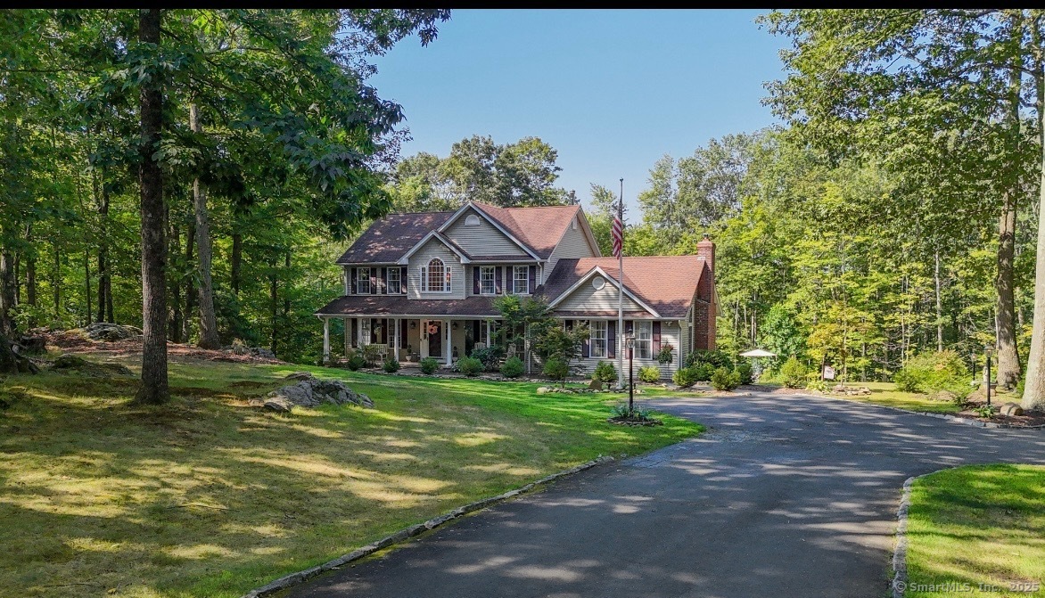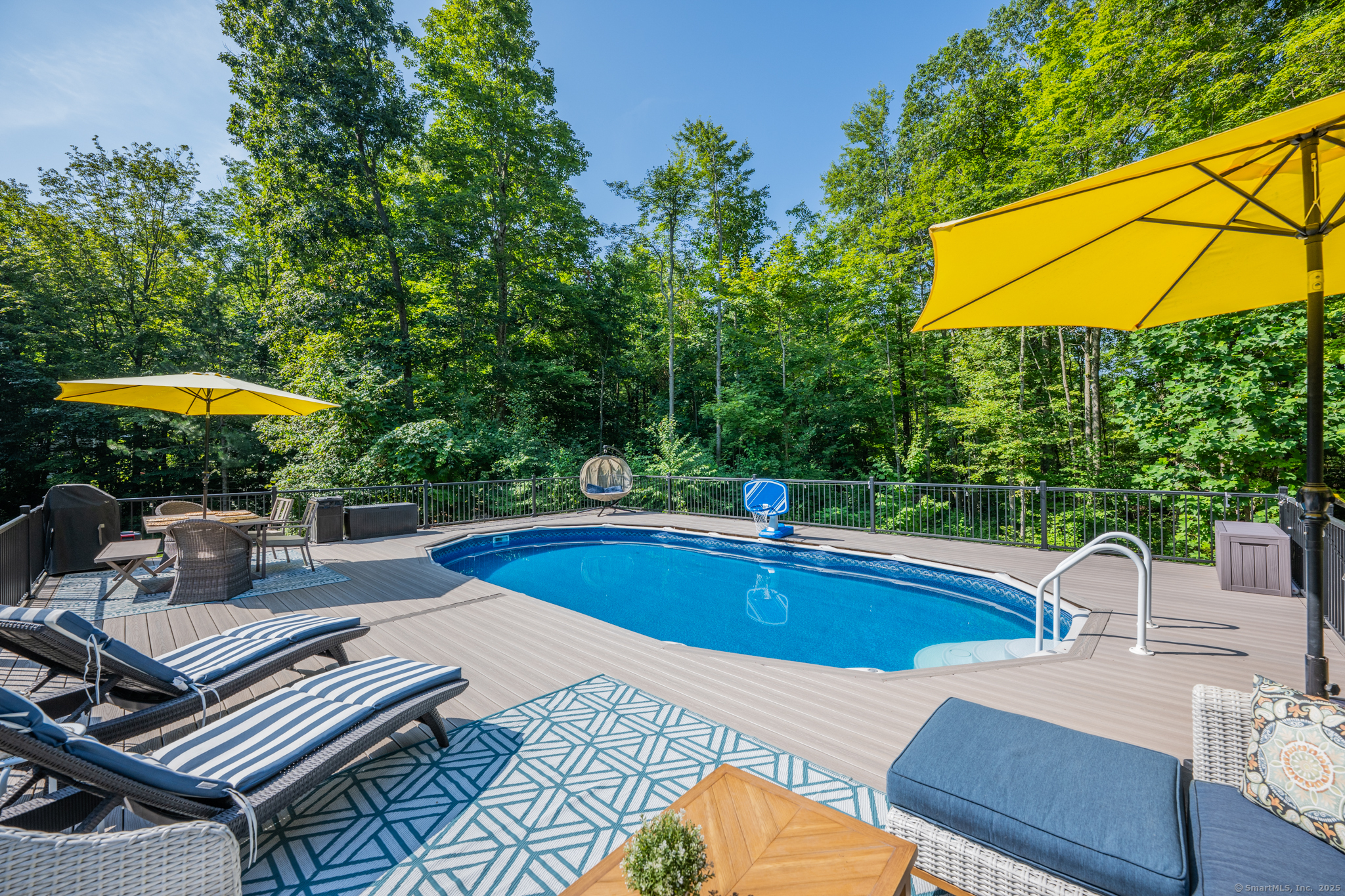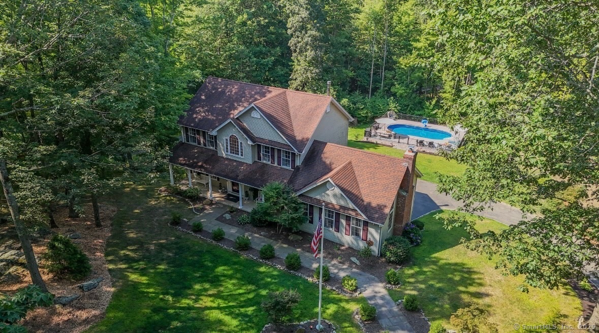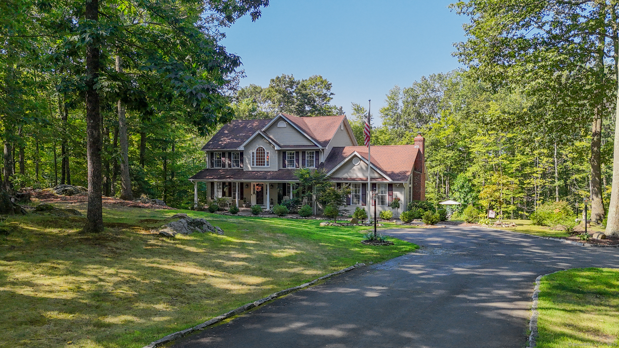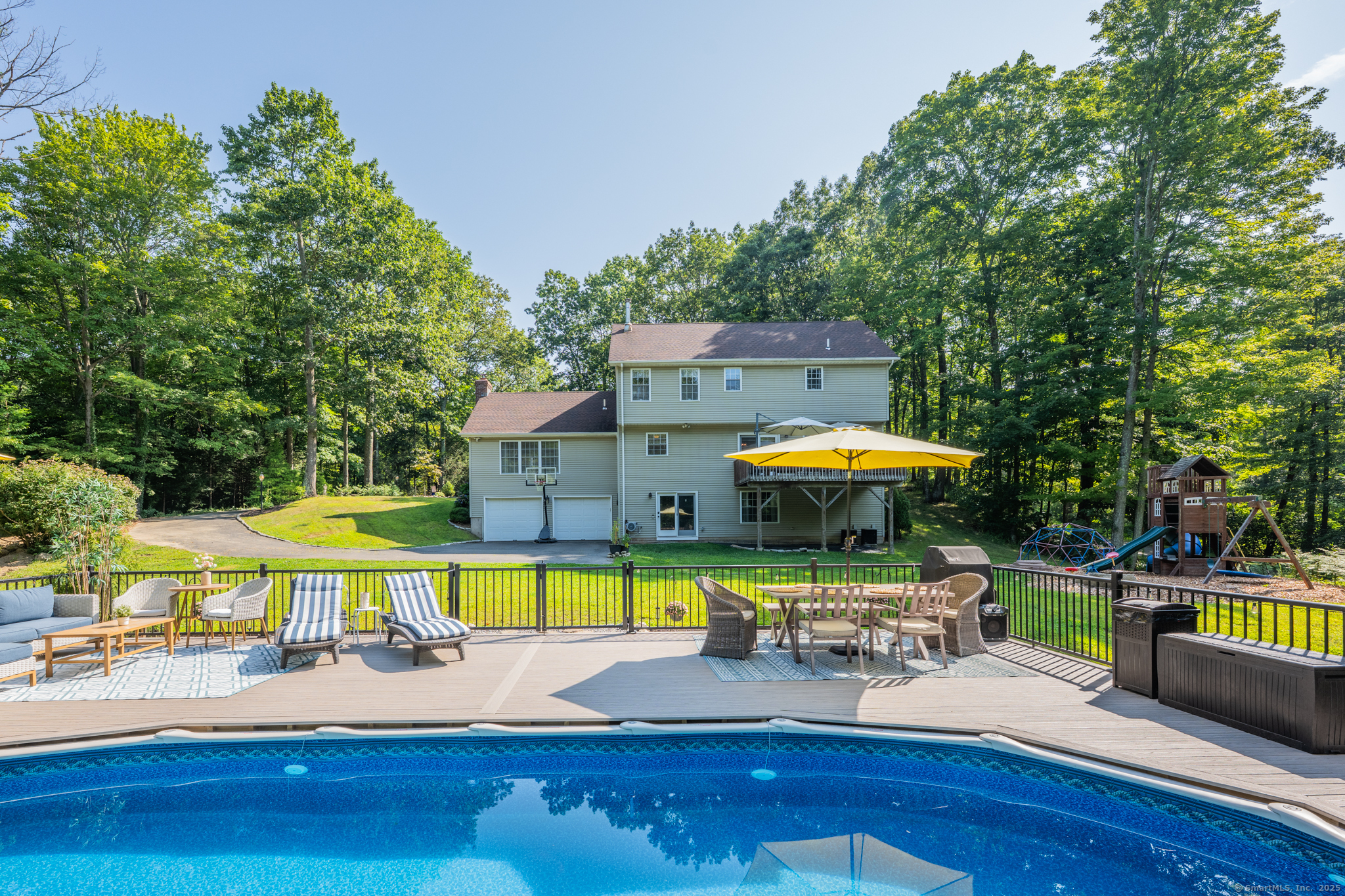 Beautiful 4 bedroom colonial with front porch set on 2.13 acres of secluded, landscaped grounds. Located in a highly desirable section of Watertown and minutes from Litchfield center! This home delivers privacy, comfort, and a perfect blend of indoor/outdoor living. The inviting main level, all freshly painted, features a 2 story foyer, first floor bedroom, hardwood floors, and an easy flow layout with convenient first floor laundry. An intimate living room with propane fireplace creates the perfect cozy retreat, while the expansive family room offers a wood stove, wet bar, updated half bath, & soaring, vaulted ceilings that fill the space with natural light from the beautiful, oversized windows. The bright and functional kitchen features granite counters, double ovens, and a breakfast bar. Upstairs you'll find the primary bedroom complete with cathedral ceilings, a walk in closet , and a full size bath with private vanity. Two additional well proportioned bedrooms and a full size guest bath complete the upstairs. Step outside to your brand new sports pool and composite deck, perfect for summer entertaining or relaxing. A large walk out basement offers incredible storage or the potential for future finished space. Extra long driveway for tons of parking and 2 car garage. Other highlights include a bluestone walkway, extensive landscape renovations, brand new water softener system, & a 6 stage reverse osmosis system. Property line extends all the way back into the woods.