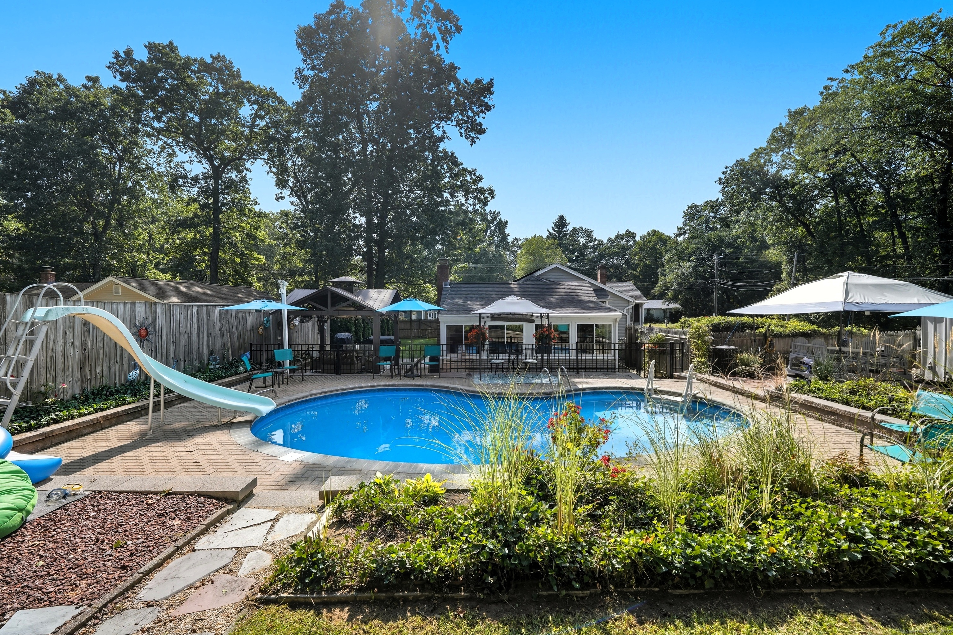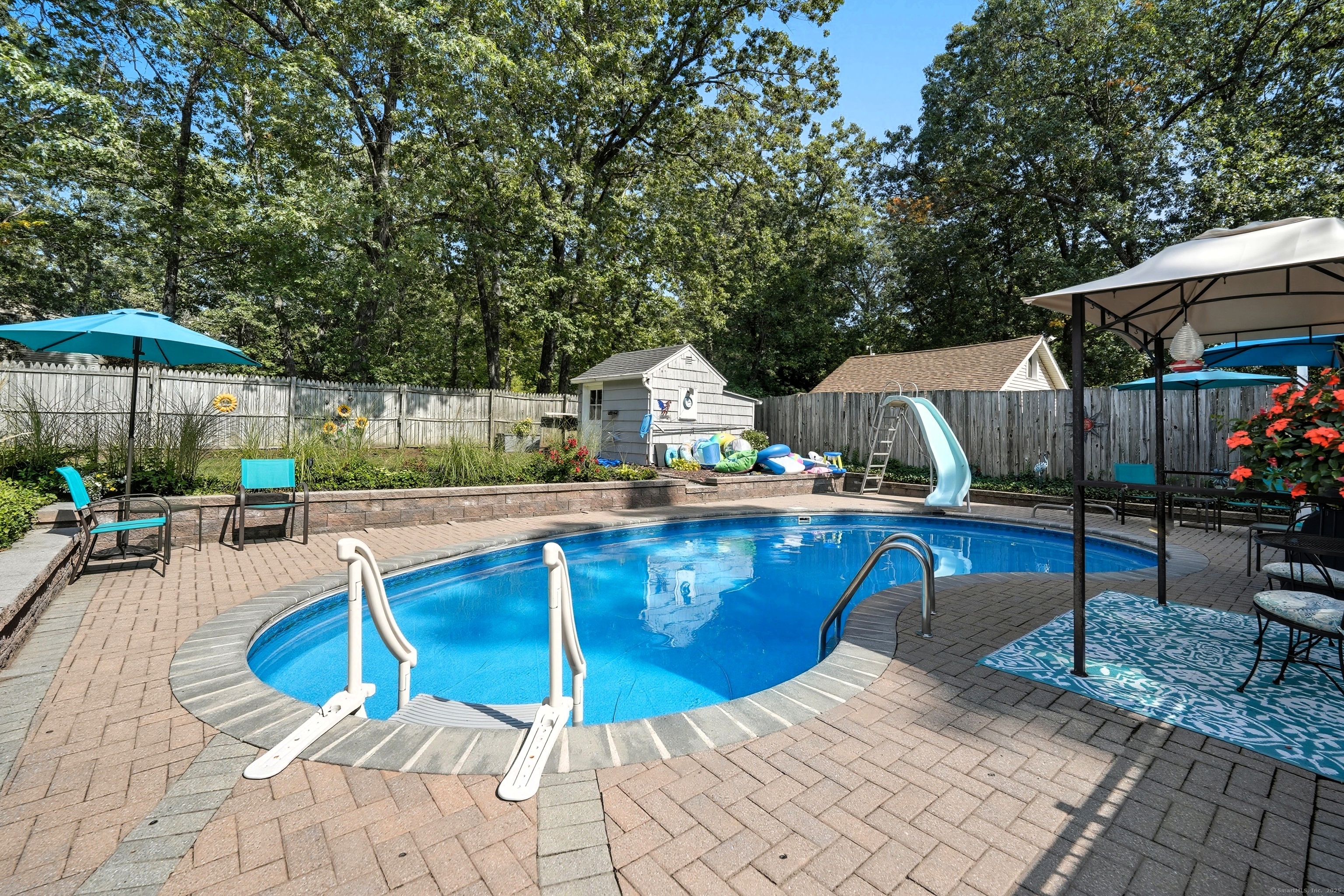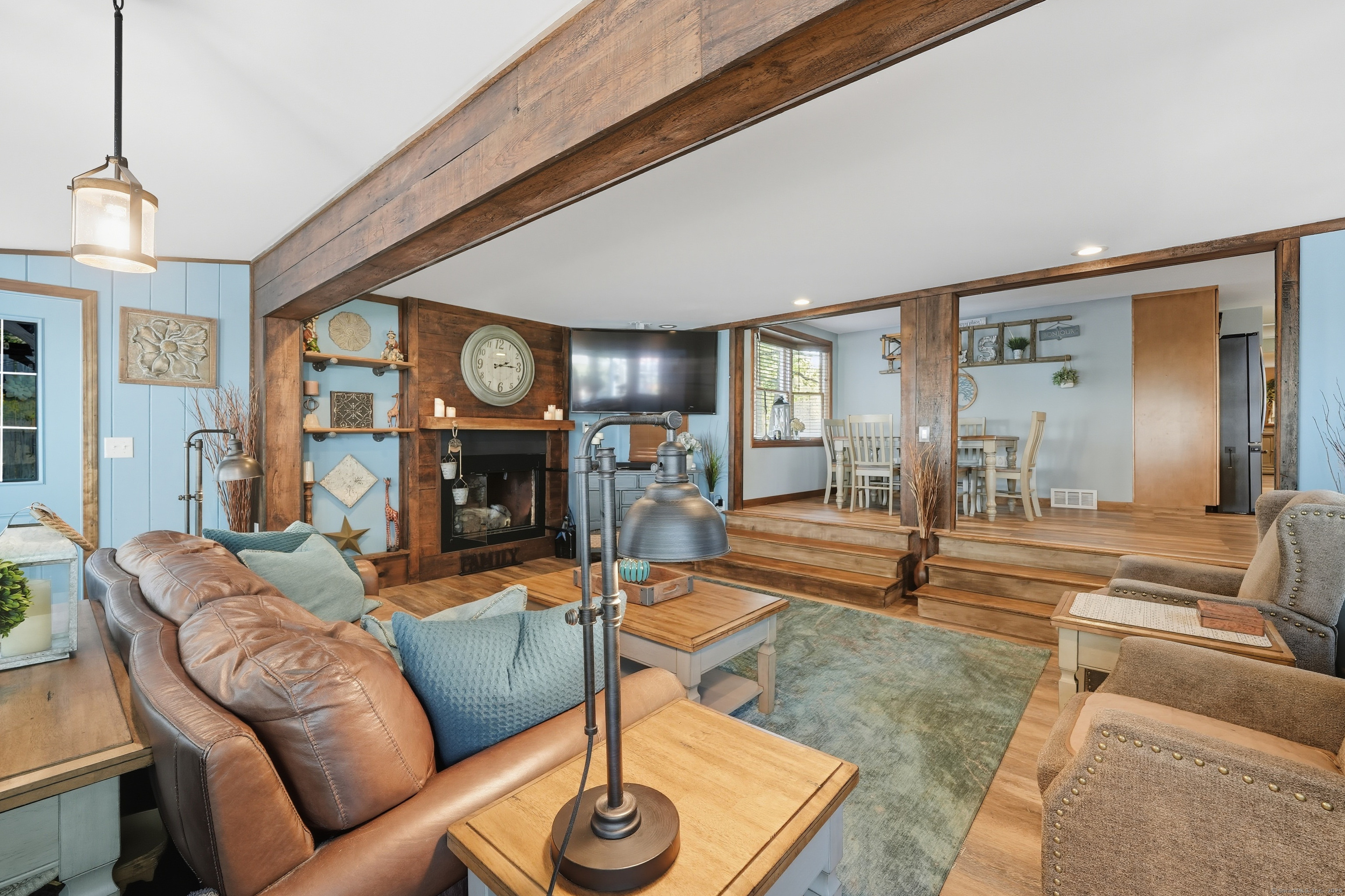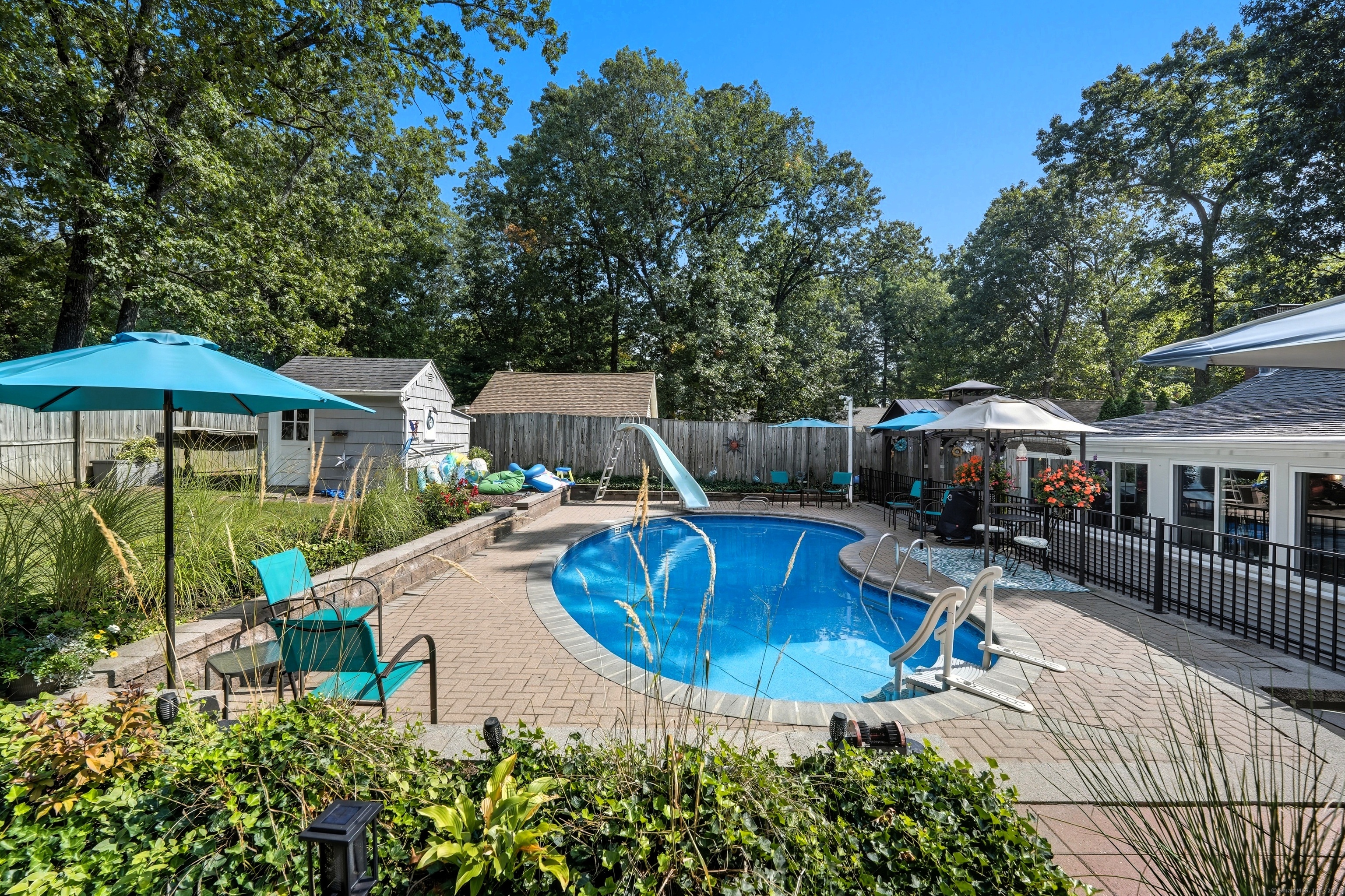 Welcome to the epitome of luxury ranch-style living! This 1,733 sq. ft. custom ranch features 3 bedrooms, 1.5 baths, and an array of impressive updates throughout. The sunken living room is a true showpiece with a gas fireplace, exposed beams framed in reclaimed 1800s barnwood, and oversized windows with remote-powered mini blinds. The spacious kitchen combines style and functionality with a large center island, abundant cabinetry, subway tile backsplash, Dekton Trillium countertops, and luxury vinyl plank flooring. Offering three generously sized bedrooms, one of which features a spacious walk-in closet. A partially finished basement loaded with closet space adds versatile living space, while a whole-house generator provides year-round peace of mind. Step outside to your private backyard retreat complete with an inground pool and a gazebo equipped with a ceiling fan and flat-screen TV-perfect for entertaining. The fully fenced yard and professionally landscaped grounds offer both beauty and privacy. Additional amenities include a one-car garage and two oversized storage sheds. This move-in ready home has been meticulously maintained-nothing to do but unpack and enjoy!
