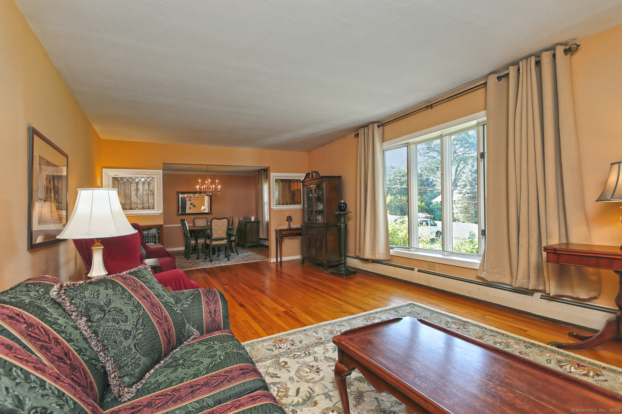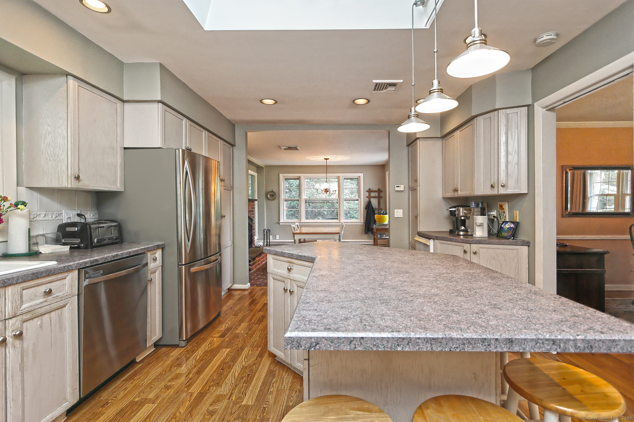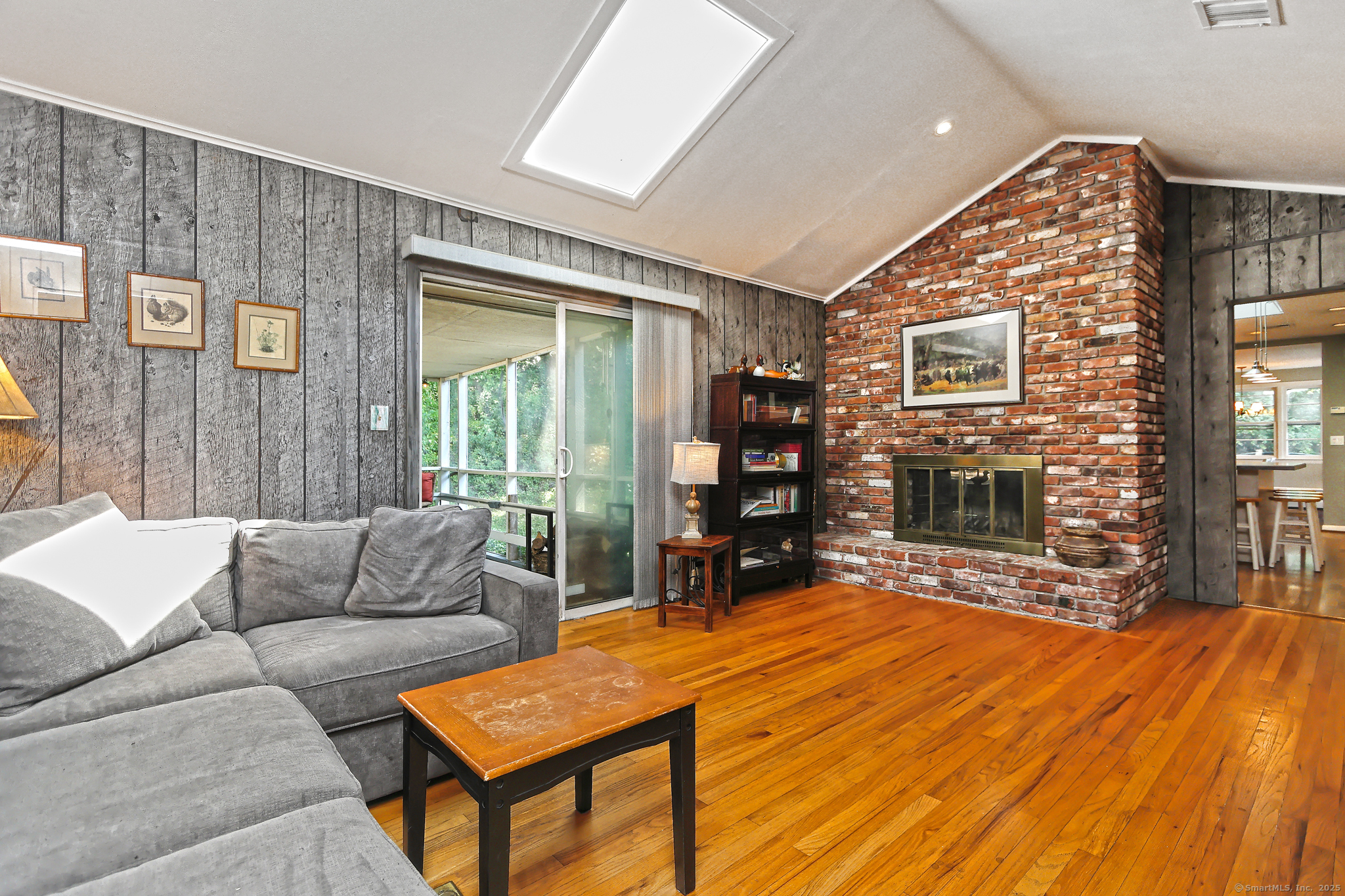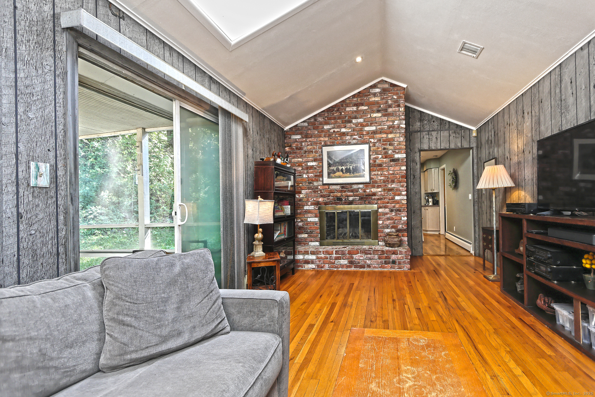 Welcome to this beautiful expanded 3-bedroom, 3-bathroom ranch style home in the highly sought-after town of Orange! This spacious home offers a versatile layout with plenty of room to live, work and entertain! Step inside the flagstone foyer with double closets to find a spacious, sun filled formal living room with big bow window, and beautiful hardwood floors, and a formal dining room with beautiful hardwood floors and double window, perfect for hosting gatherings. The rear family room with vaulted ceilings, skylight and tasteful brick fireplace features sliders to the enclosed porch area for outdoor enjoyment. The beautiful eat-in kitchen with large center skylight, large center island, stainless steel appliances and abundance of cabinets, flows seamlessly into a sun filled, picture-perfect breakfast nook/sunroom/office. The primary bedroom features 2 closets, an en-suite full bath with ceramic tile shower. The main hall bath with ceramic tile tub/shower services the additional 2 good size bedrooms with two windows and plenty of closet space. The finished basement adds even more living space, ideal for a playroom/second family room/gym and a bonus room for an office/hobby area. Additional highlights include, 2 driveways, one leading to an under house 2-car garage, ample storage, outdoor space with gardening potential or play and entertaining. Easy access to restaurants, shopping, major highways and award-winning school! Don't miss this great opportunity!