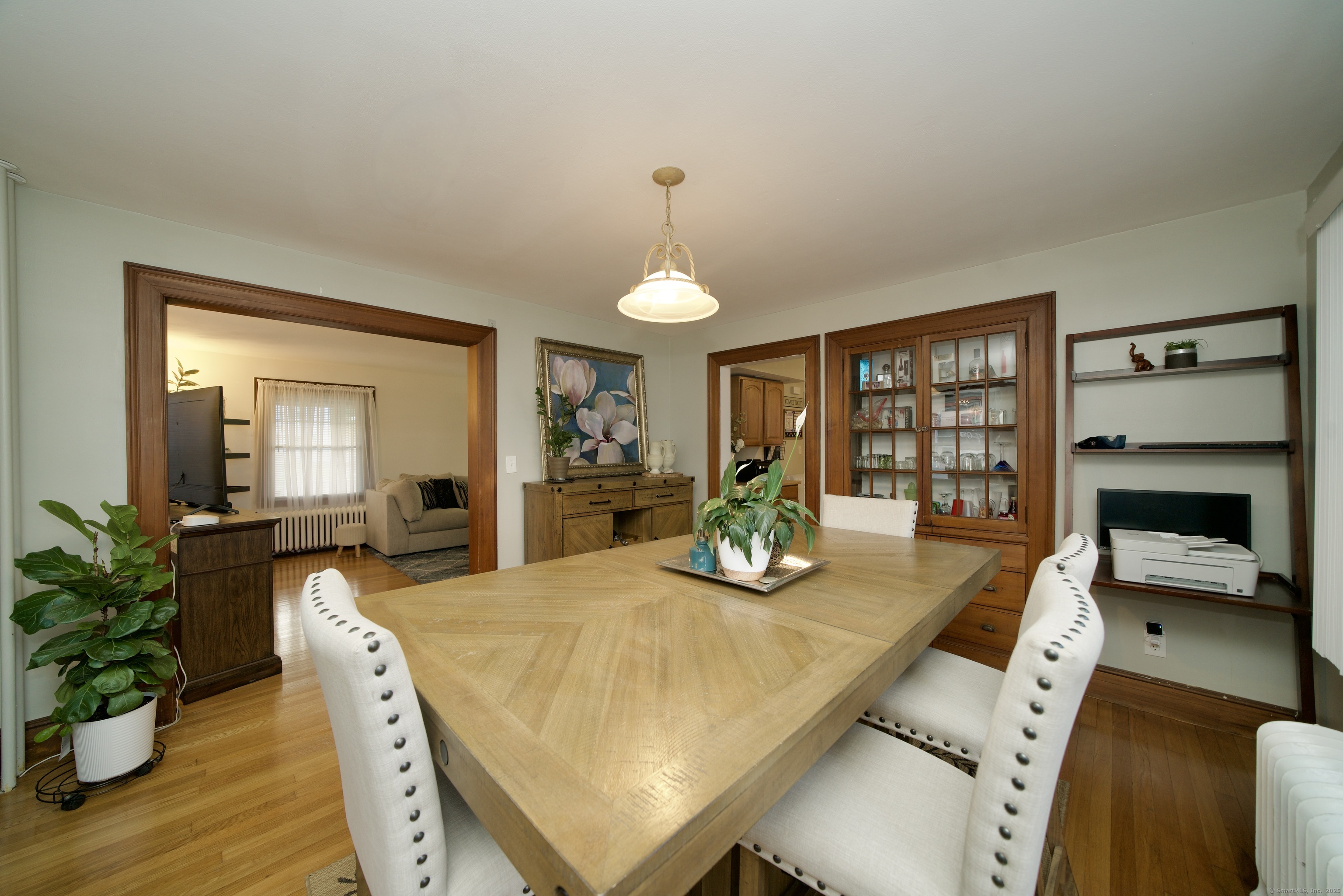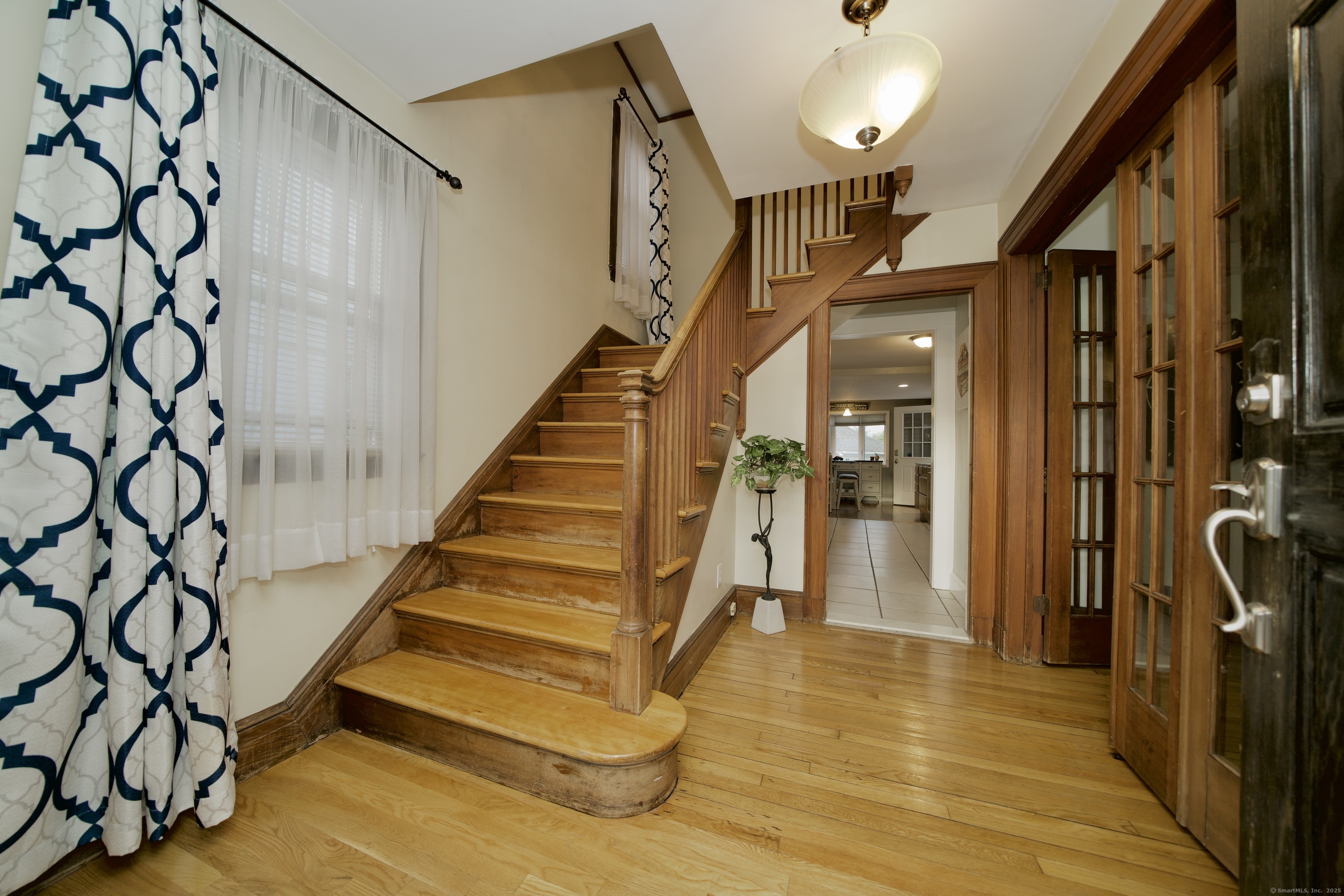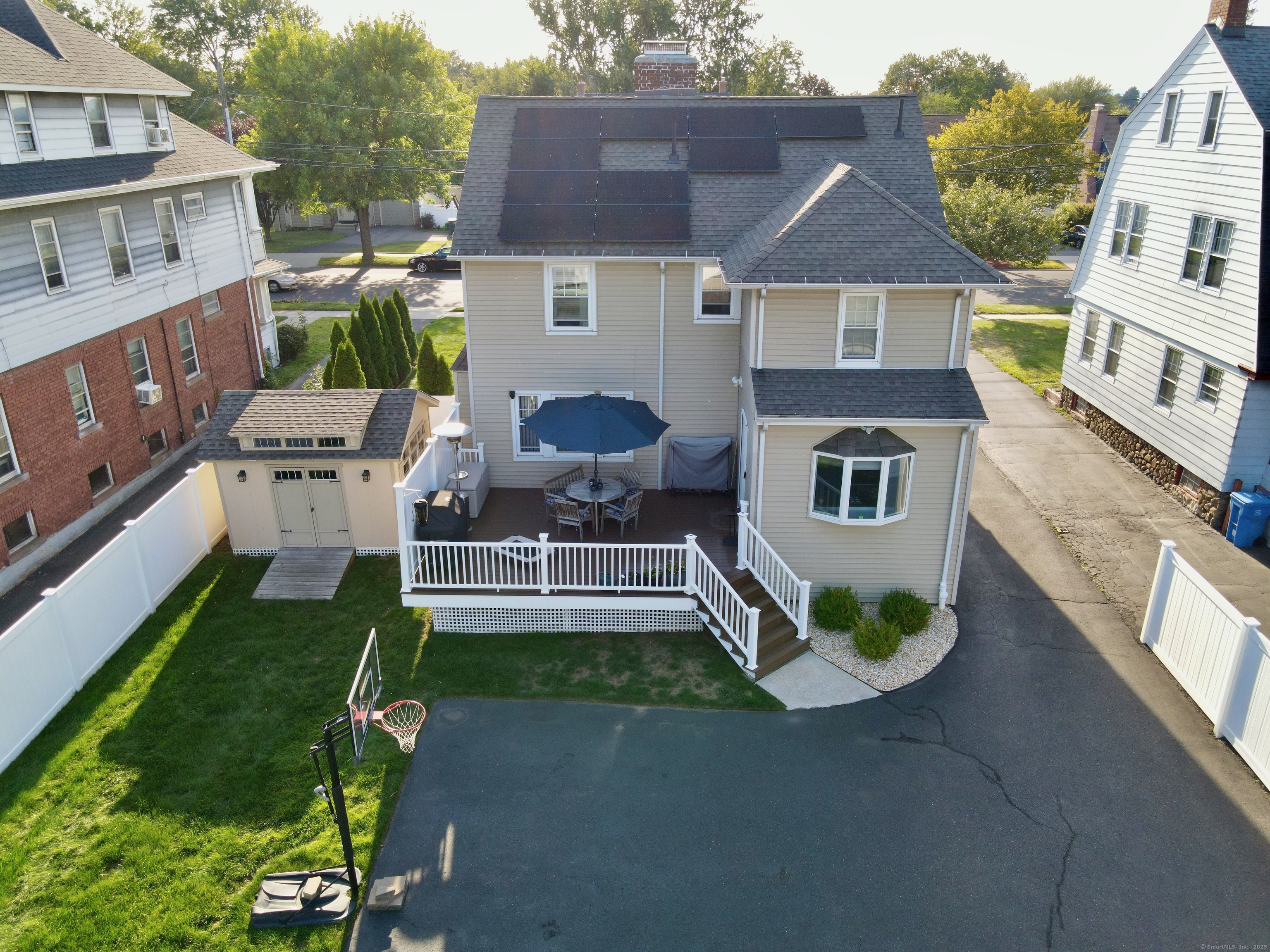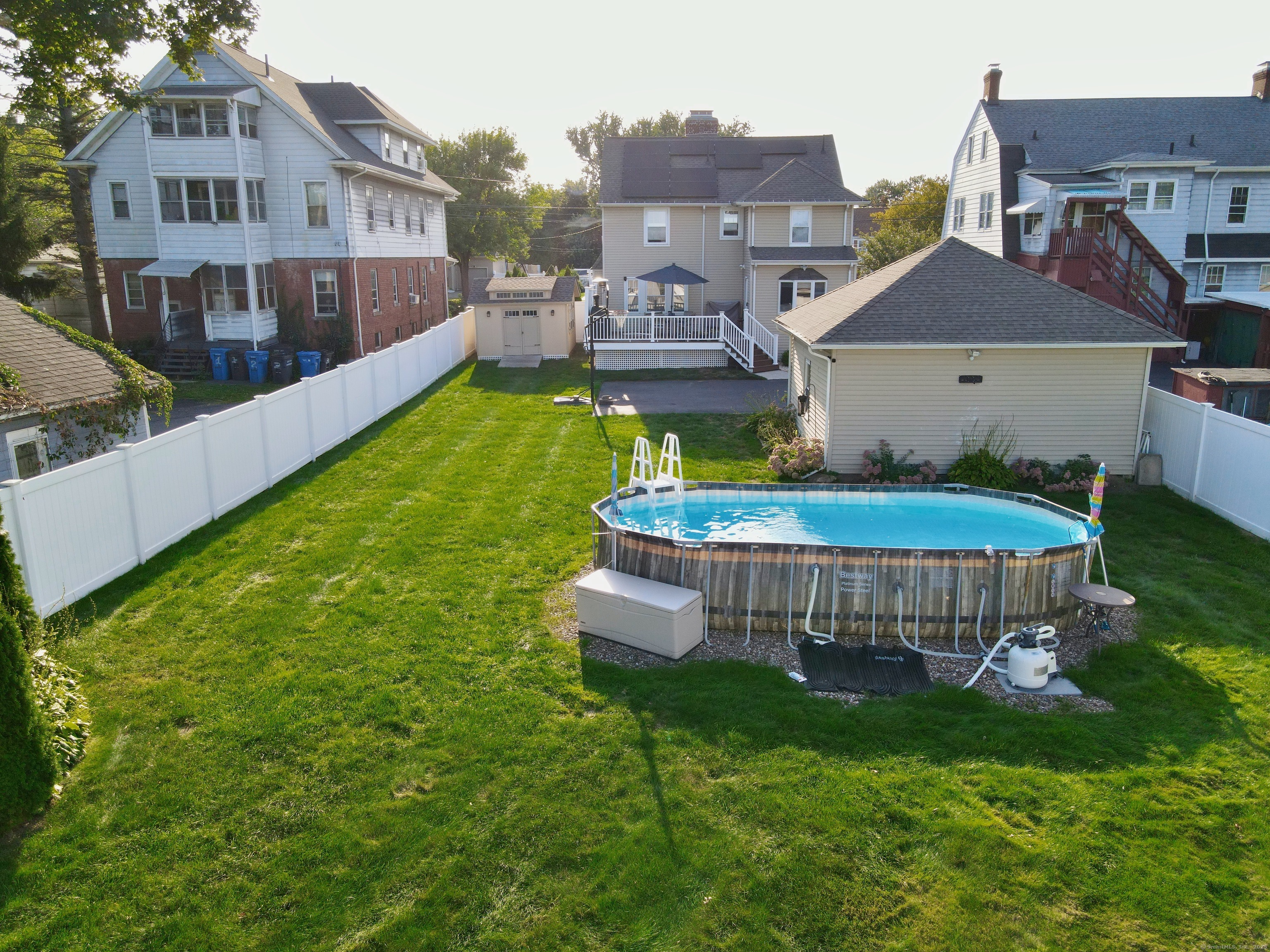 H & B Due Wednesday 9/24 5pm - Welcome to this timelessly elegant home that beautifully blends classic charm with modern comfort. Step onto the inviting covered front deck, complete with privacy awnings-perfect for enjoying crisp fall evenings. As you enter through the gracious front entryway, you're immediately greeted by the rich warmth of a gorgeous original wood staircase and gleaming hardwood floors that flow throughout. The living and dining rooms feature large, updated windows w/natural light & highlight the intricate original wood trim, creating a cozy yet sophisticated ambiance. The updated kitchen flows seamlessly into a charming breakfast nook-the perfect spot for casual meals & morning coffee. Step out onto the TREX deck and into your own backyard retreat-fully fenced & beautifully landscaped, ideal for entertaining. Whether you're hosting summer parties or relaxing in the above-ground heated pool, this backyard oasis is perfect. Upstairs, you'll find 4 generously sized bedrooms, each featuring hardwood floors, newer windows & AC for year-round comfort.1 bedroom offers a dressing/makeup room-a luxurious touch, another includes access to a walk-up finishable attic, perfect for transforming into your dream walk-in closet, studio, or home office. Upgrades include a newer roof, windows, vinyl fence, driveway, shed,2 car detached grg, boiler, hw heater & energy-saving solar panels.This is more than a home-it's a lifestyle of charm, comfort & elegance. You