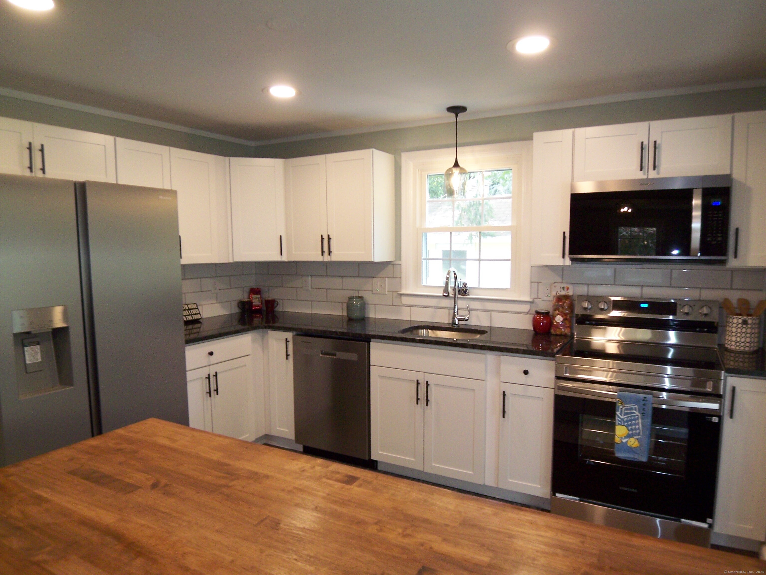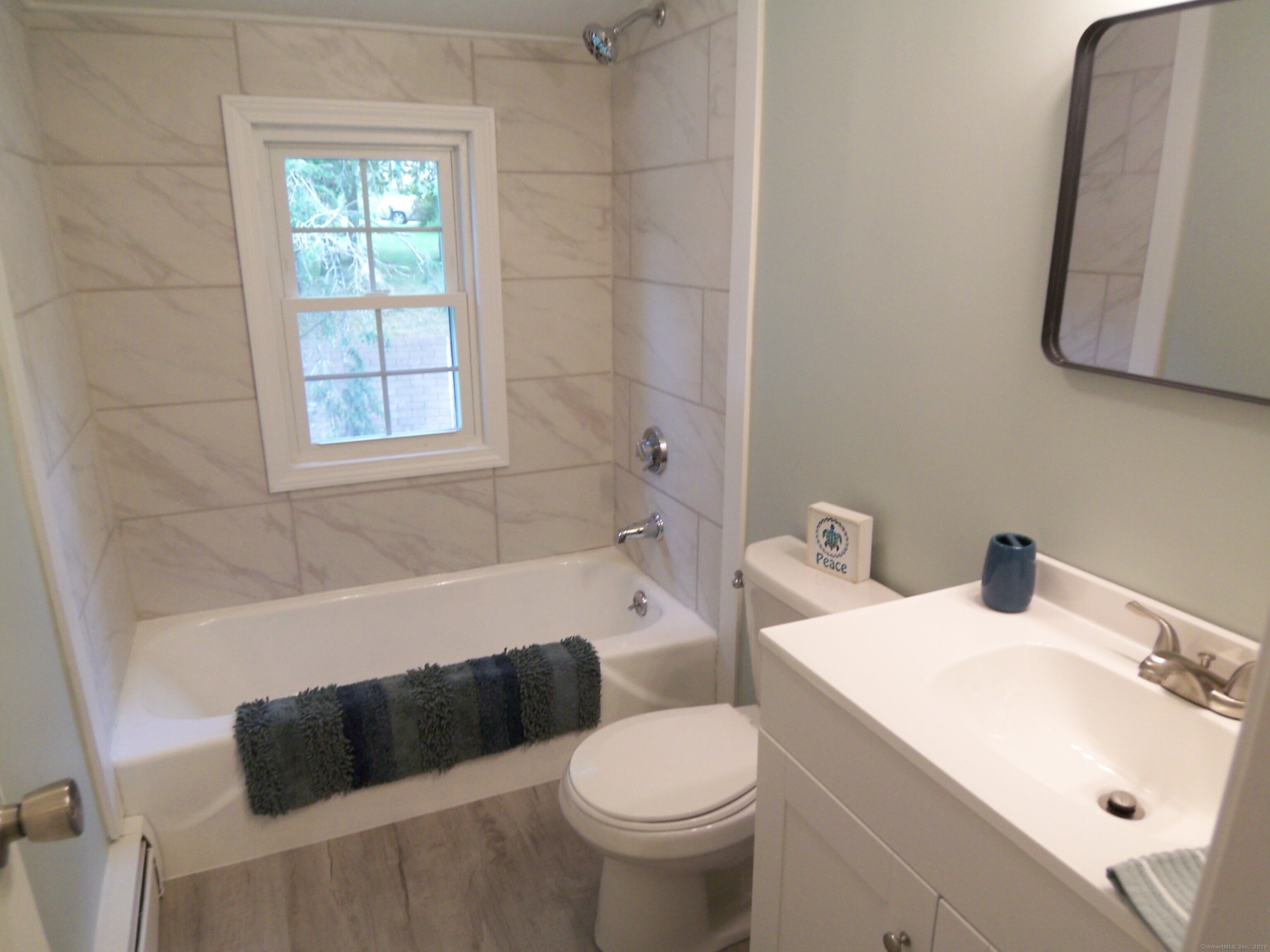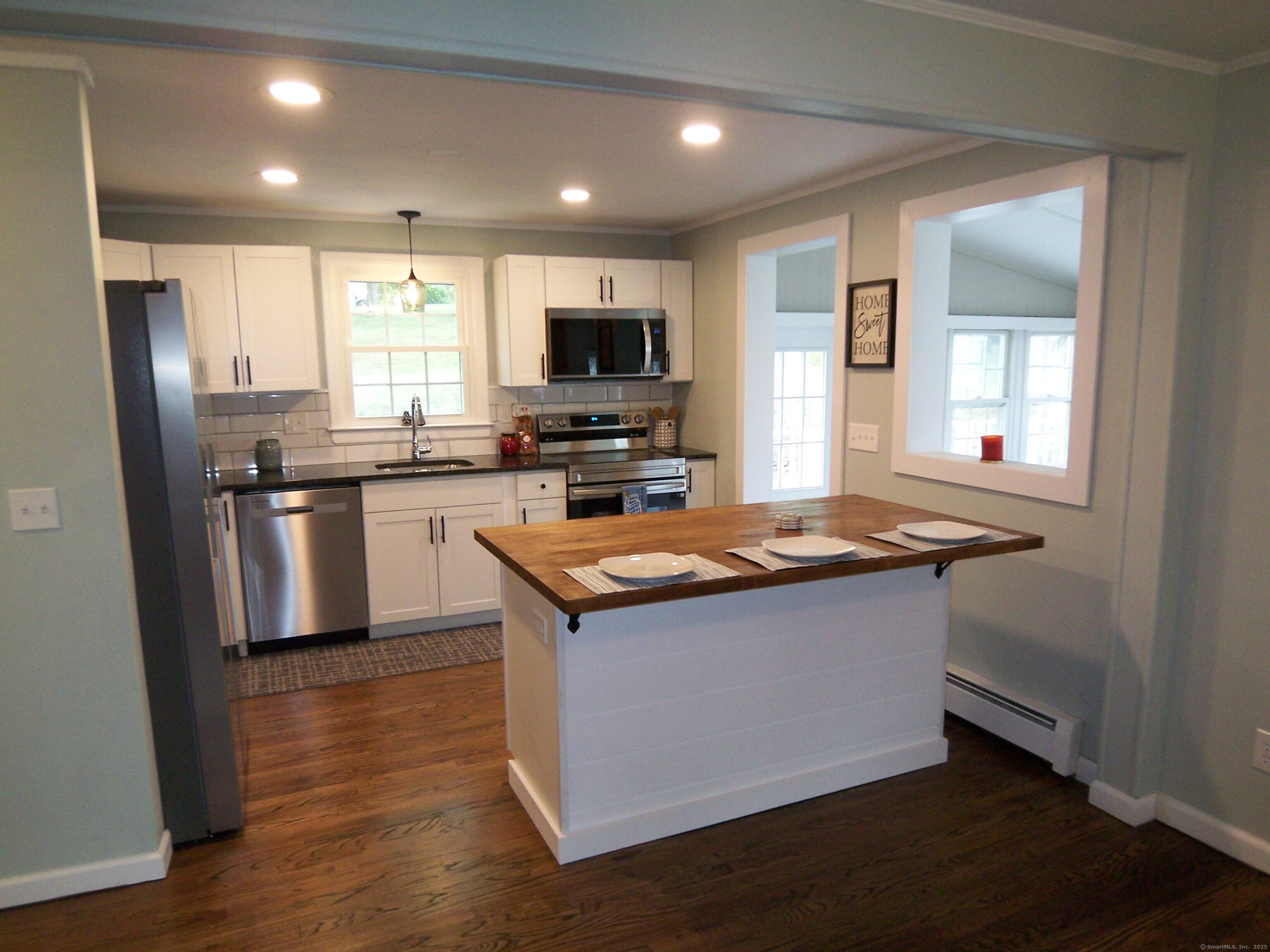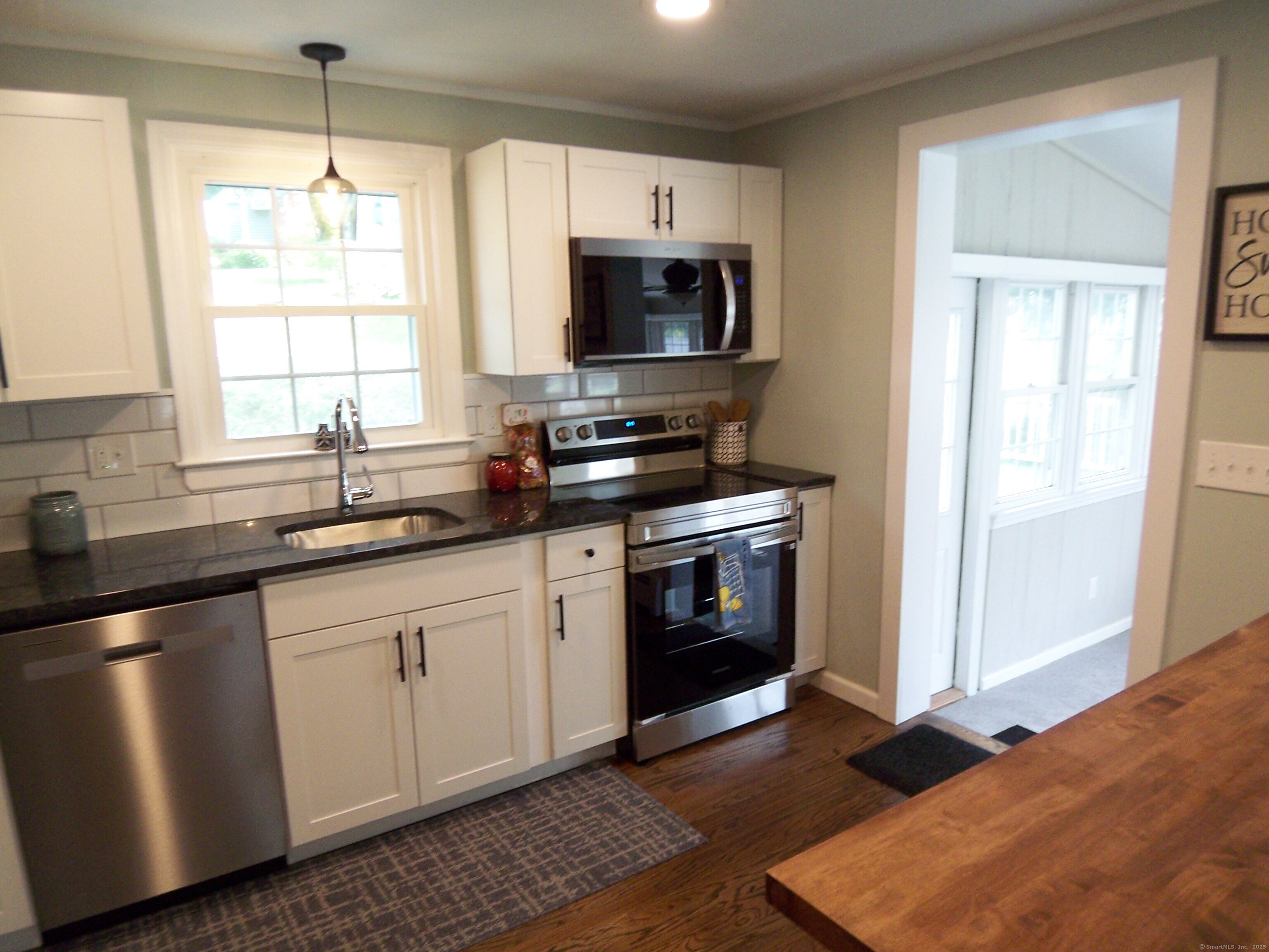Welcome to this spacious, beautifully renovated cape home in a sought after, quiet neighborhood in Ellington! A totally new kitchen is graced with shaker cabinets, granite counters, ss appliances,custom tile backsplash & a butcher block island & is open to the dining room & a huge bonus room off the kitchen. 1st and 2nd floor full bathrooms have been tastefully updated with new plumbing fixtures, tile surrounds, flooring & lighting. The gorgeous new kitchen floor has been finished to match the refinished hardwoods on both levels. The 1st floor bedroom has an 8' closet & the 2 upstairs bedrooms are large & also have tons of storage. In the living room, there's a cozy fireplace for those winter nights & on the lower level, yet another large finished, heated space to relax or entertain! The backyard is private with a huge deck & even a tiki bar on the end. A large storage shed will house all of your equipment & toys. This home has vinyl siding, energy efficient windows & a newer architectural roof. The location is fantastic and peaceful, yet close to everything & 6 minutes to 84. At almost 2200 sq ft including the lower level, you'll want to call this beautiful house your home for many years to come!