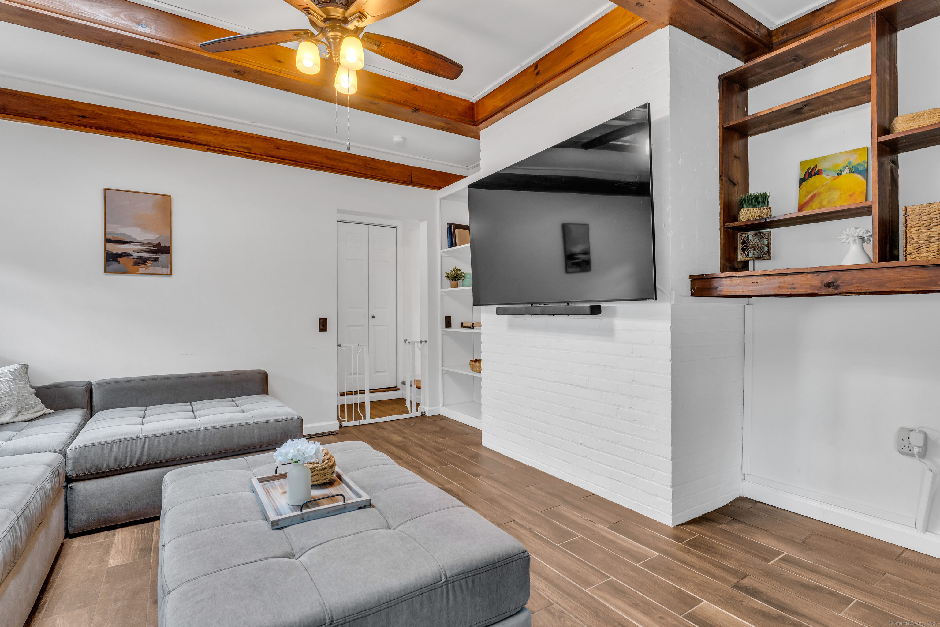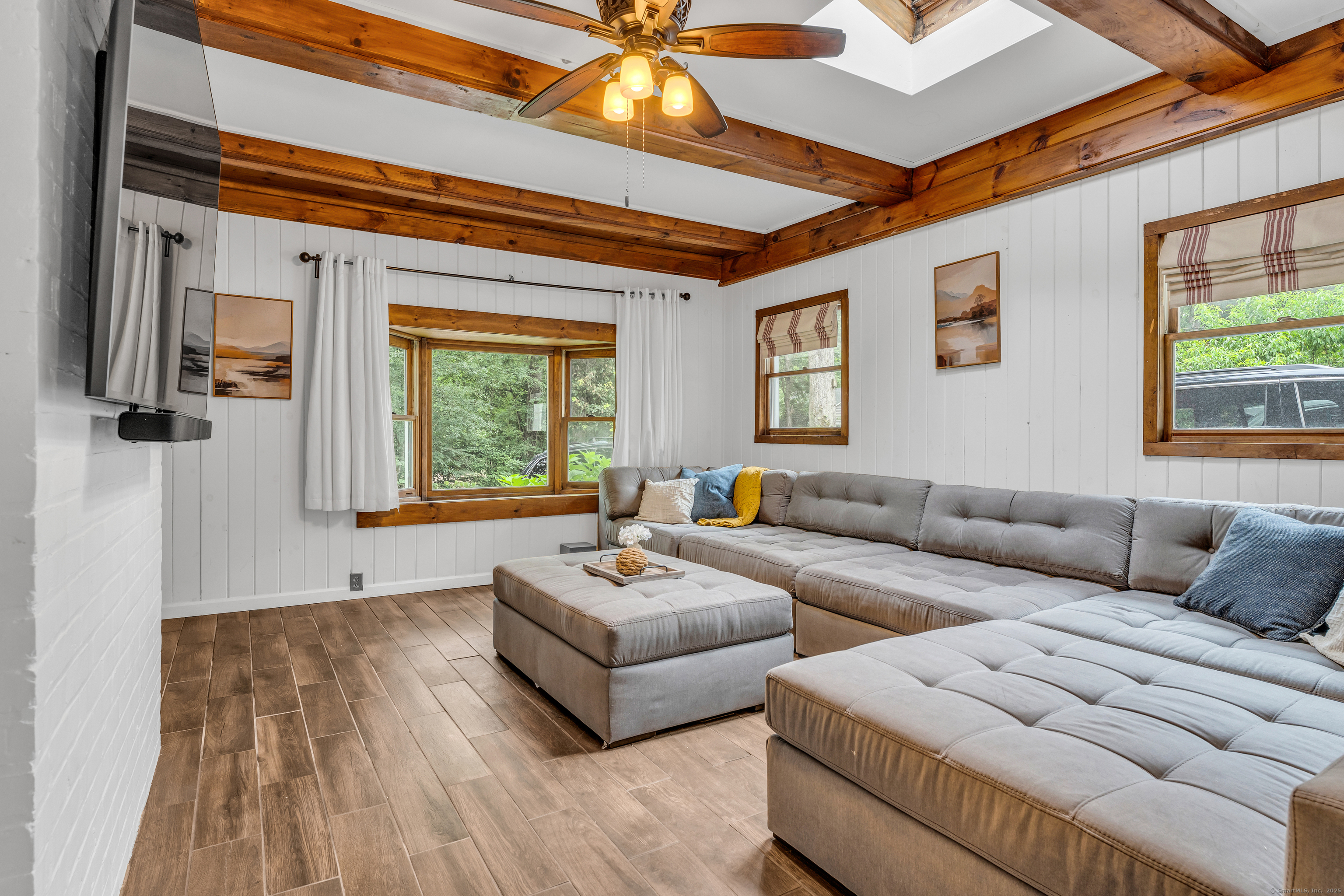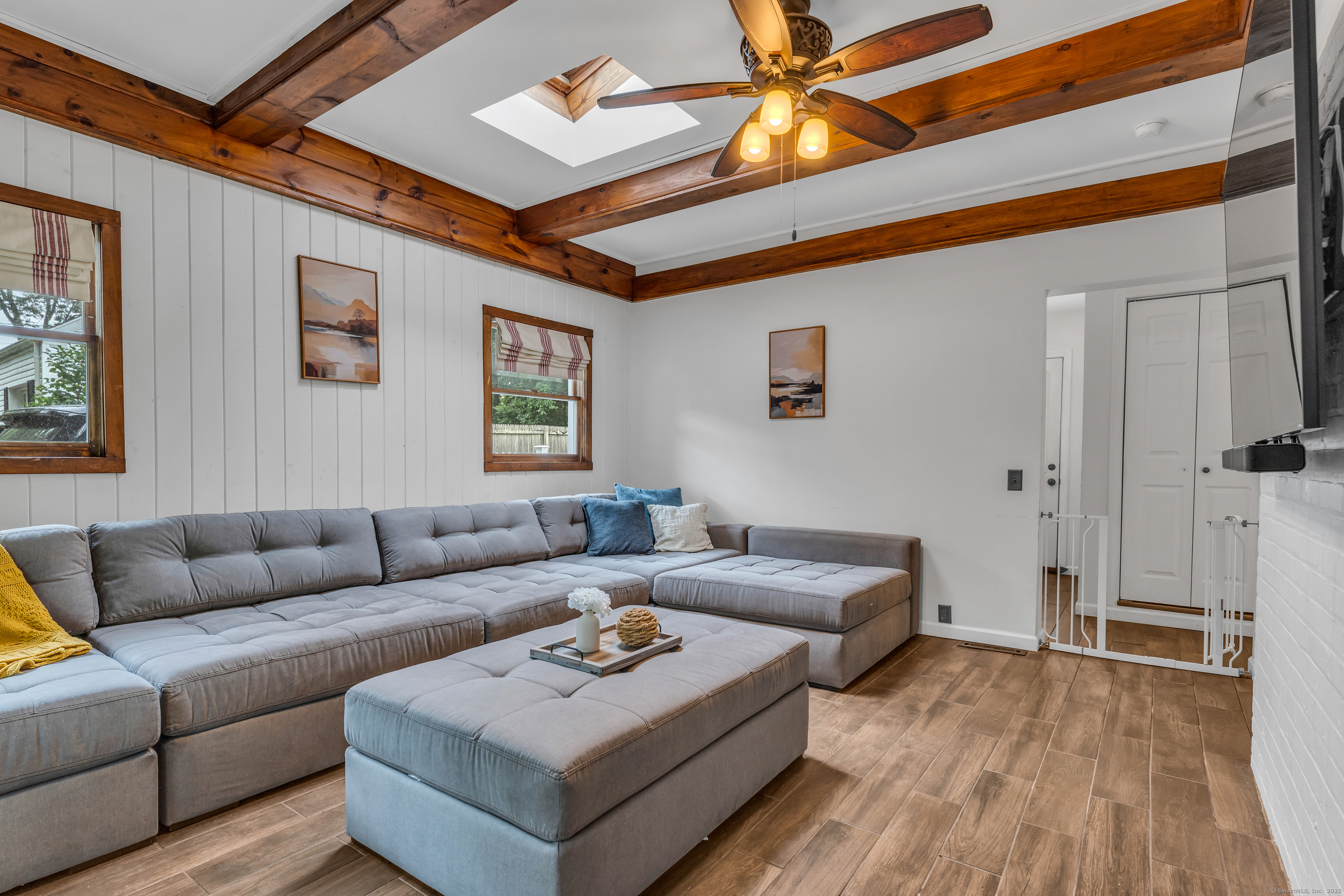 Experience the ease of single-level living in this beautifully updated 3-bedroom, 1.5-bath ranch, part of the Guilford Lakes Association, offering exclusive lake and beach rights. Designed for both comfort and style, the home features an open-concept layout with hardwood floors and a modern, yet warm kitchen equipped with granite countertops, soft-close cabinetry, gas cooktop range, stainless steel appliances, and a pantry for added convenience. A cozy breakfast area flows seamlessly into the inviting living room, where a stone-surround wood-burning fireplace creates a warm focal point visible from all main living spaces. The spacious family room showcases exposed beams, shiplap walls, built-in bookshelves, and a skylight that fills the space with natural light. Adjacent to the family room, a mudroom with a half bath and laundry adds everyday functionality. Step outside through sliding glass doors to a brick patio and fully fenced, level backyard-ideal for relaxing, and entertaining. As part of the Guilford Lakes Association, residents have access to a tranquil, non-motorized lake perfect for swimming, kayaking, and fishing, along with a private beach and picnic area. Located just steps from the Timberland Preserve, a 600-acre natural retreat with trails for hiking, biking, horseback riding, and cross-country skiing. Just minutes from Guilford's historic town Green, beaches, schools, golf course and the Shoreline East commuter rail.