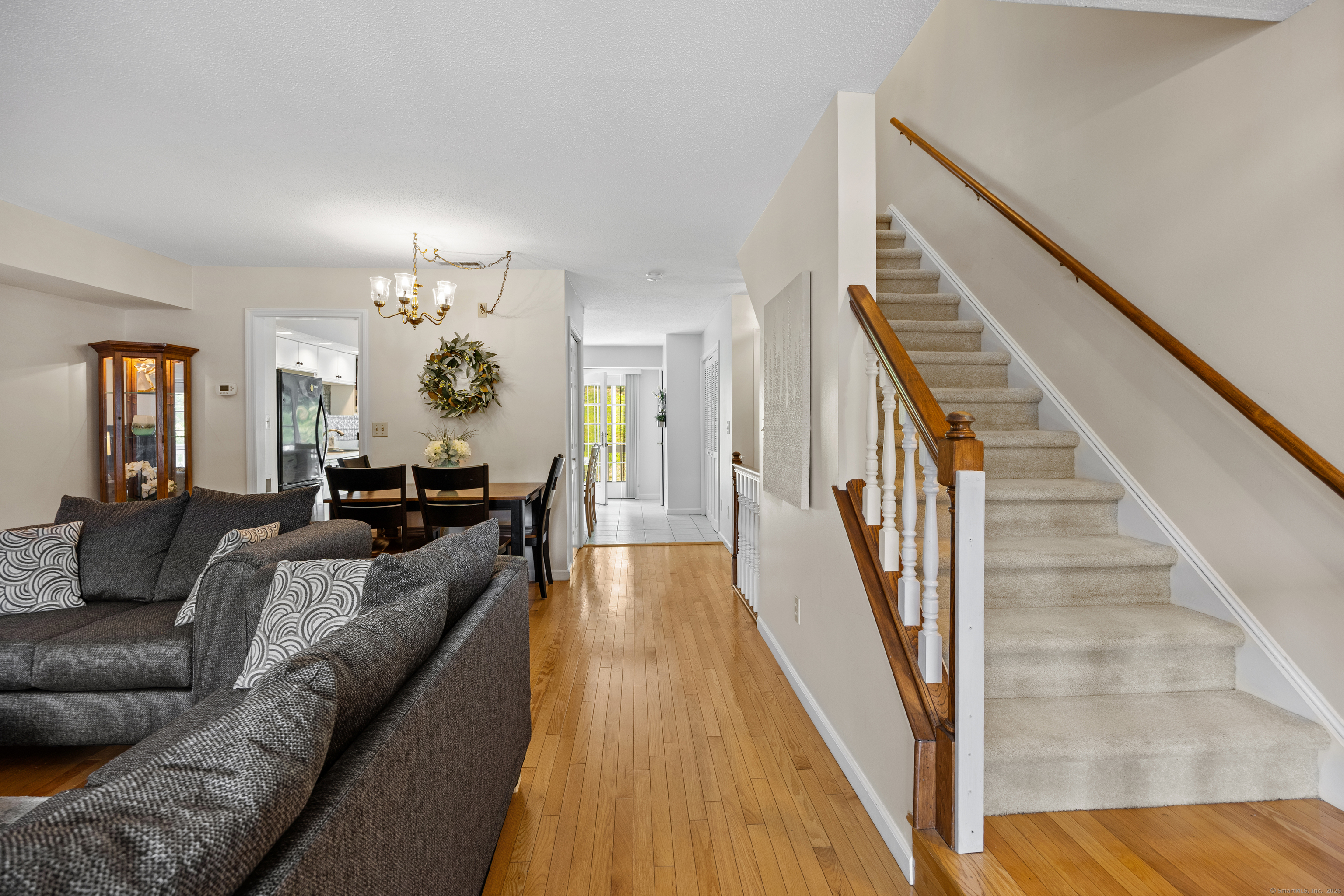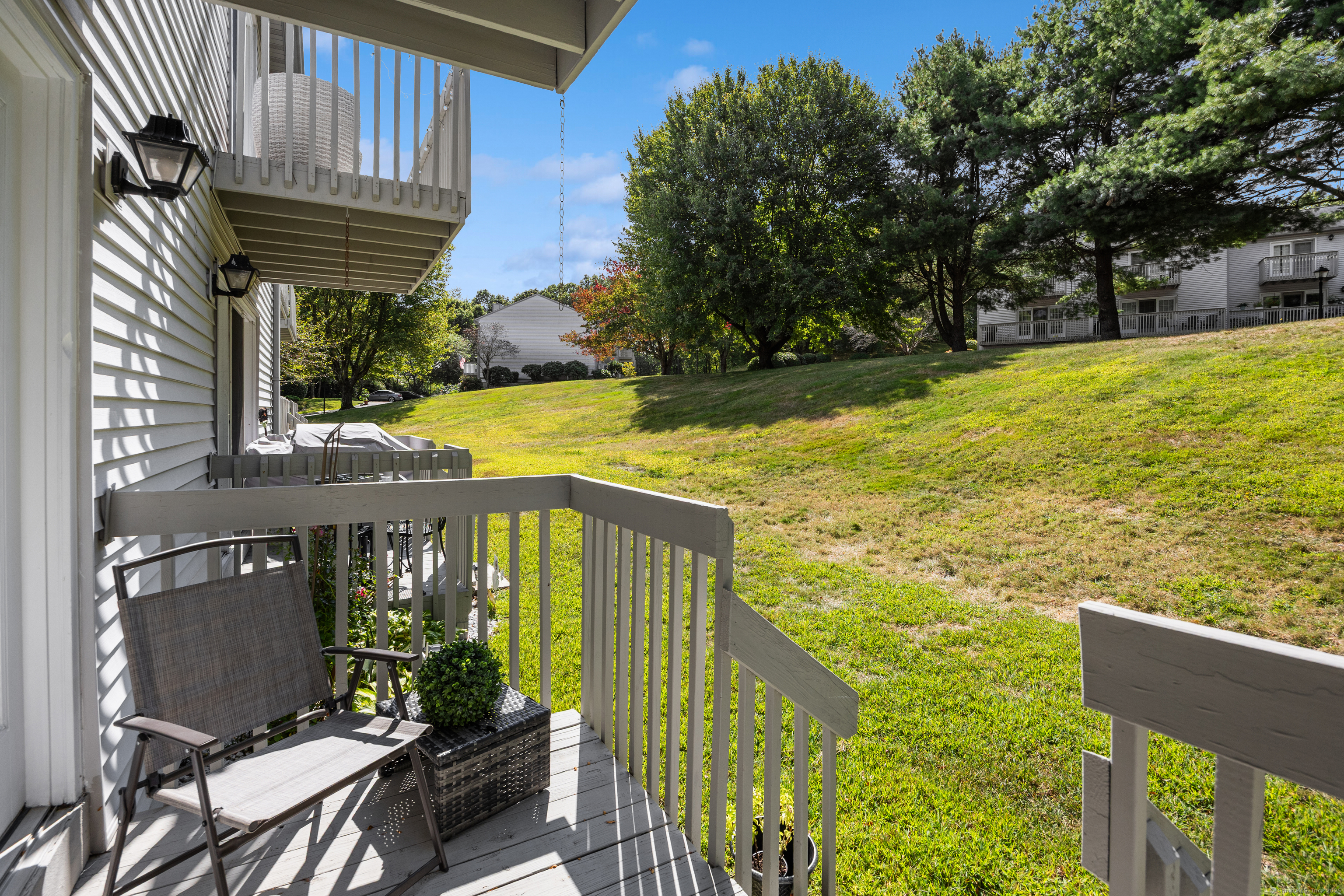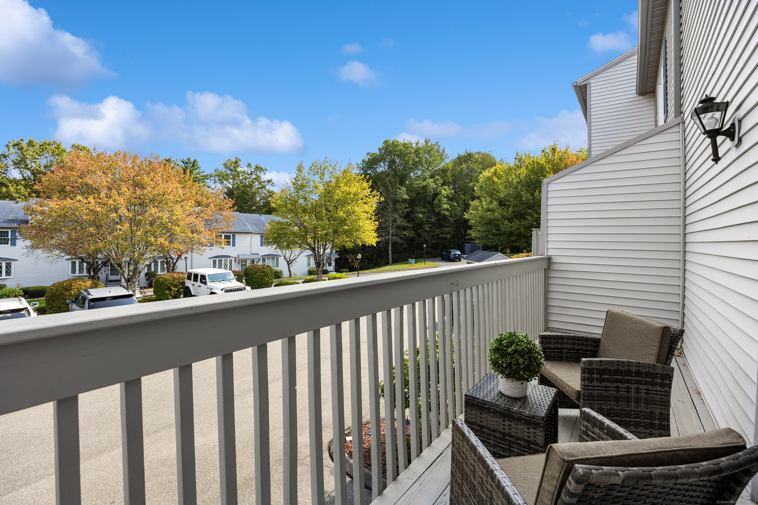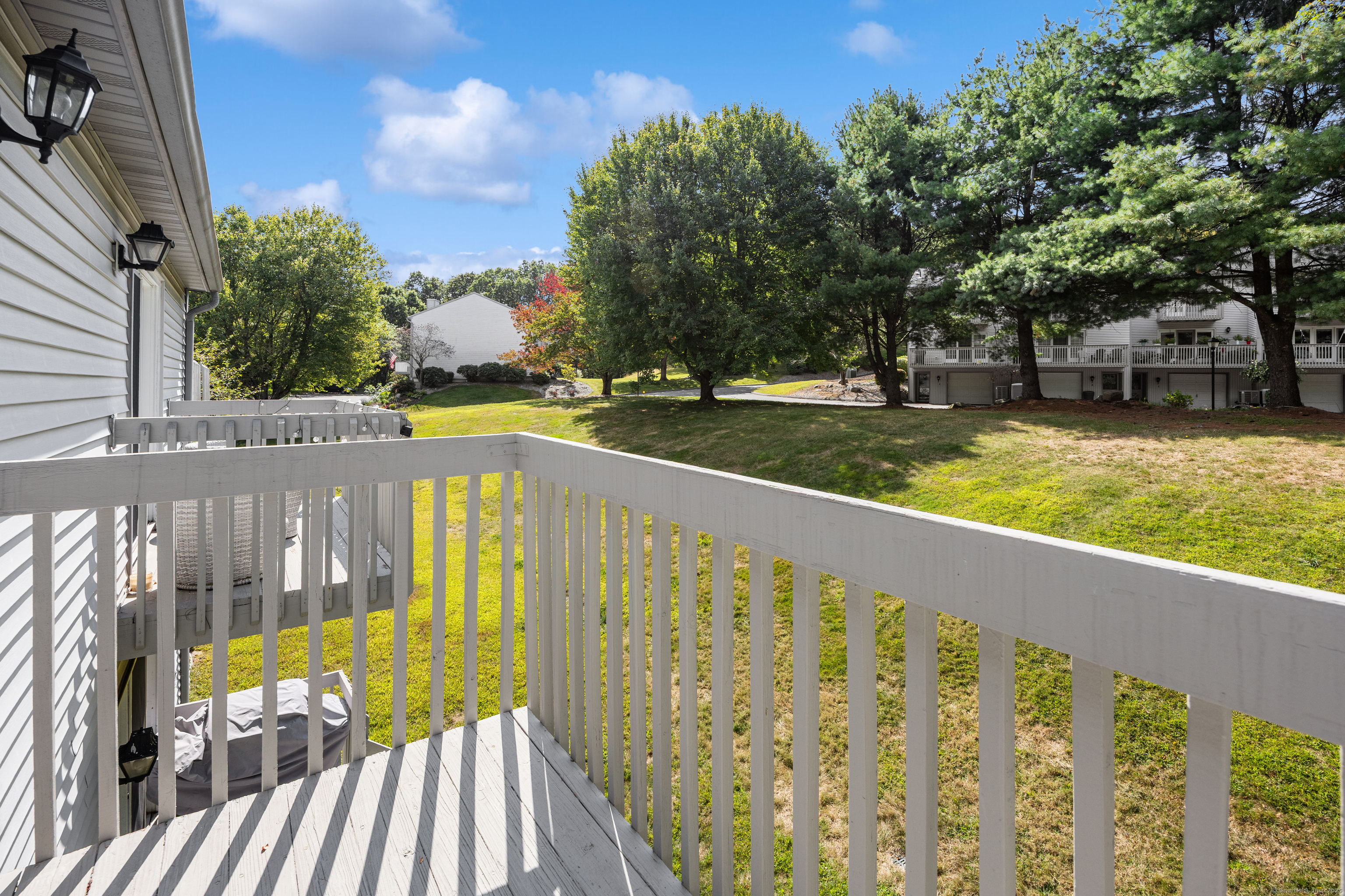 You will surely be delighted the moment you enter this beautiful, tastefully updated home. It features gleaming hardwood floors, and a cozy wood-burning fireplace in the spacious living room with French Doors leading to a lovely deck. Perfect for entertaining or simply unwinding at the end of the day. The eat-in kitchen is flooded with natural light, and is freshly updated with white cabinets, new counter tops, recessed lights and two pantries for ample storage. Laundry area and updated powder room are conveniently located on the main level. The second level features two large bedrooms, each with its own full bathroom, ensuring maximum privacy and comfort. The primary suite also boasts a balcony. Additionally, there is a one car garage with storage room. The serene location is just across from the Scoville Reservoir scenic walking trail. A true gem blending beauty, comfort and convenience!
