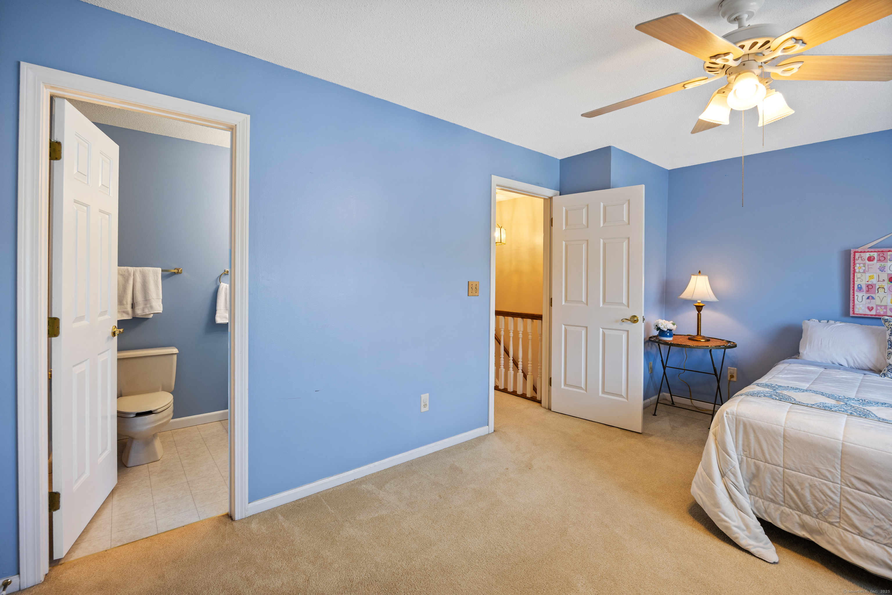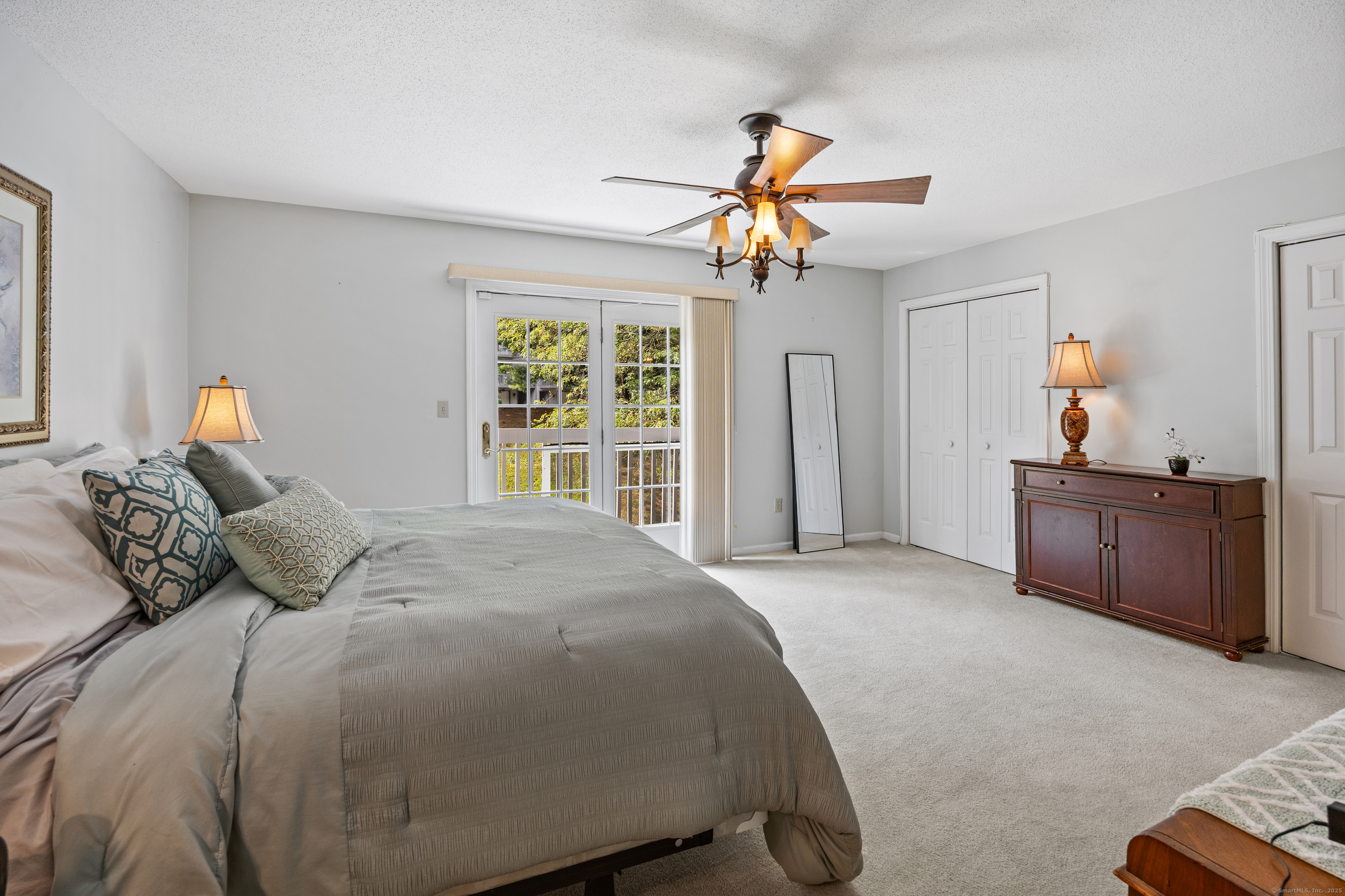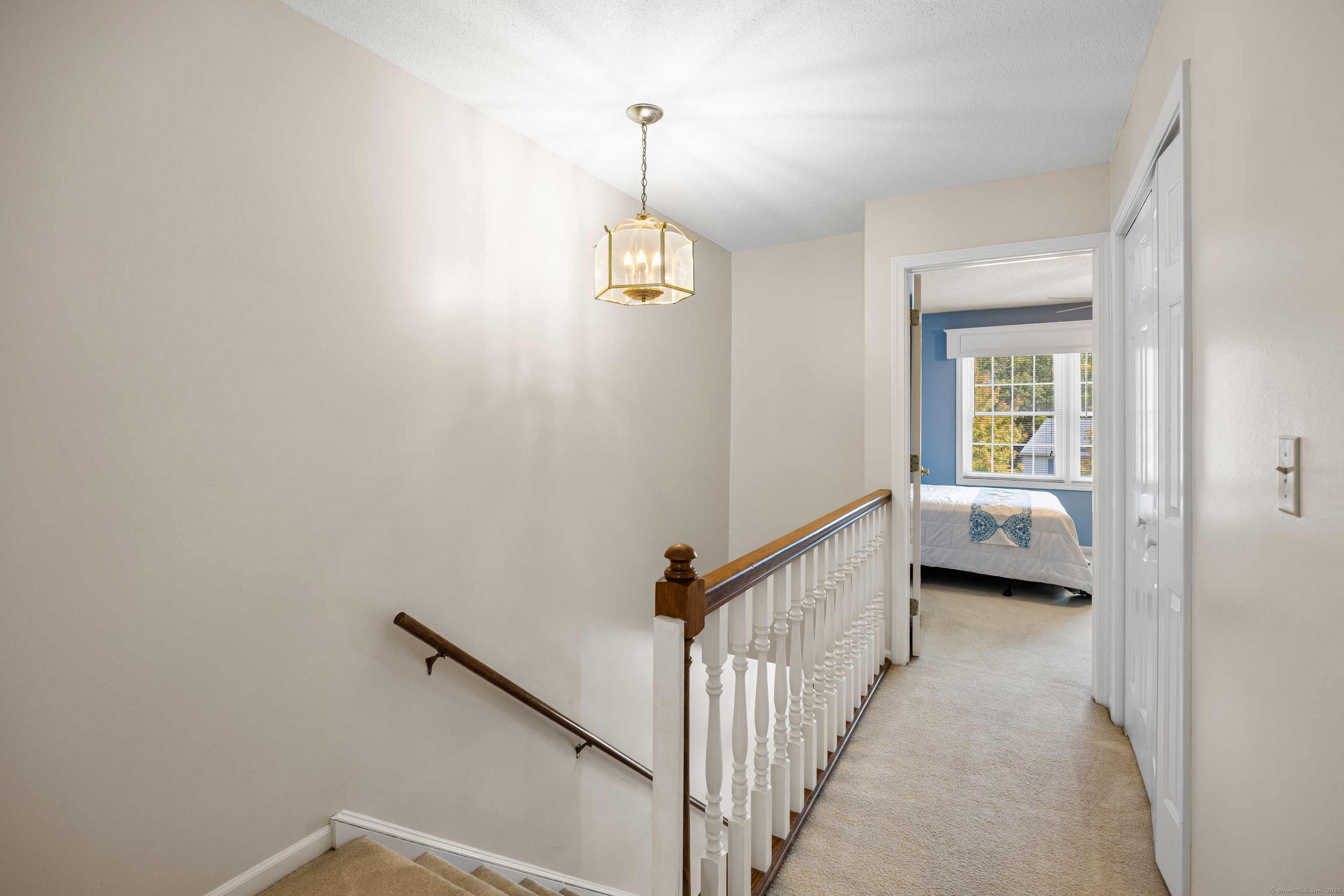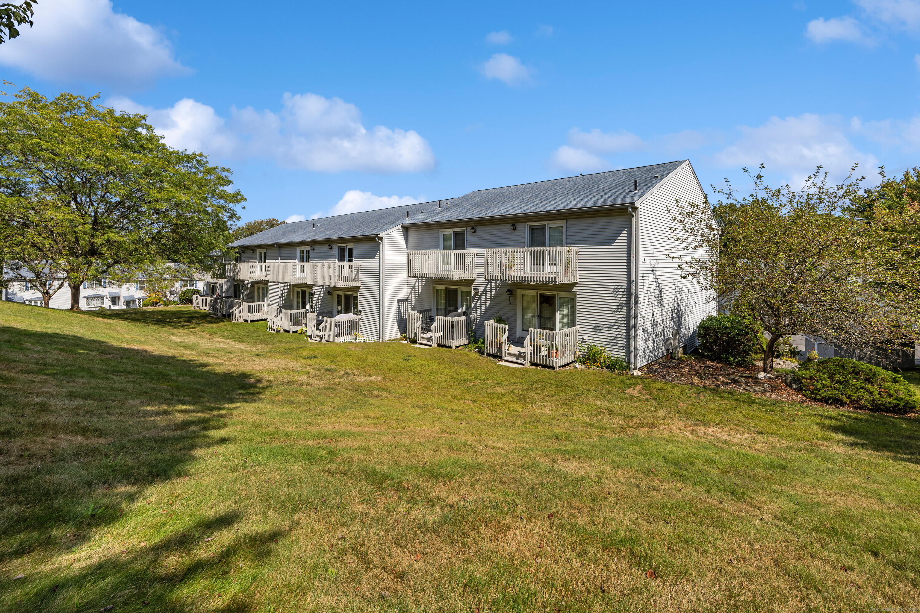 You will surely be delighted the moment you enter this beautiful, tastefully updated home. It features gleaming hardwood floors, and a cozy wood-burning fireplace in the spacious living room with French Doors leading to a lovely deck. Perfect for entertaining or simply unwinding at the end of the day. The eat-in kitchen is flooded with natural light, and is freshly updated with white cabinets, new counter tops, recessed lights and two pantries for ample storage. Laundry area and updated powder room are conveniently located on the main level. The second level features two large bedrooms, each with its own full bathroom, ensuring maximum privacy and comfort. The primary suite also boasts a balcony. Additionally, there is a one car garage with storage room. The serene location is just across from the Scoville Reservoir scenic walking trail. A true gem blending beauty, comfort and convenience!
