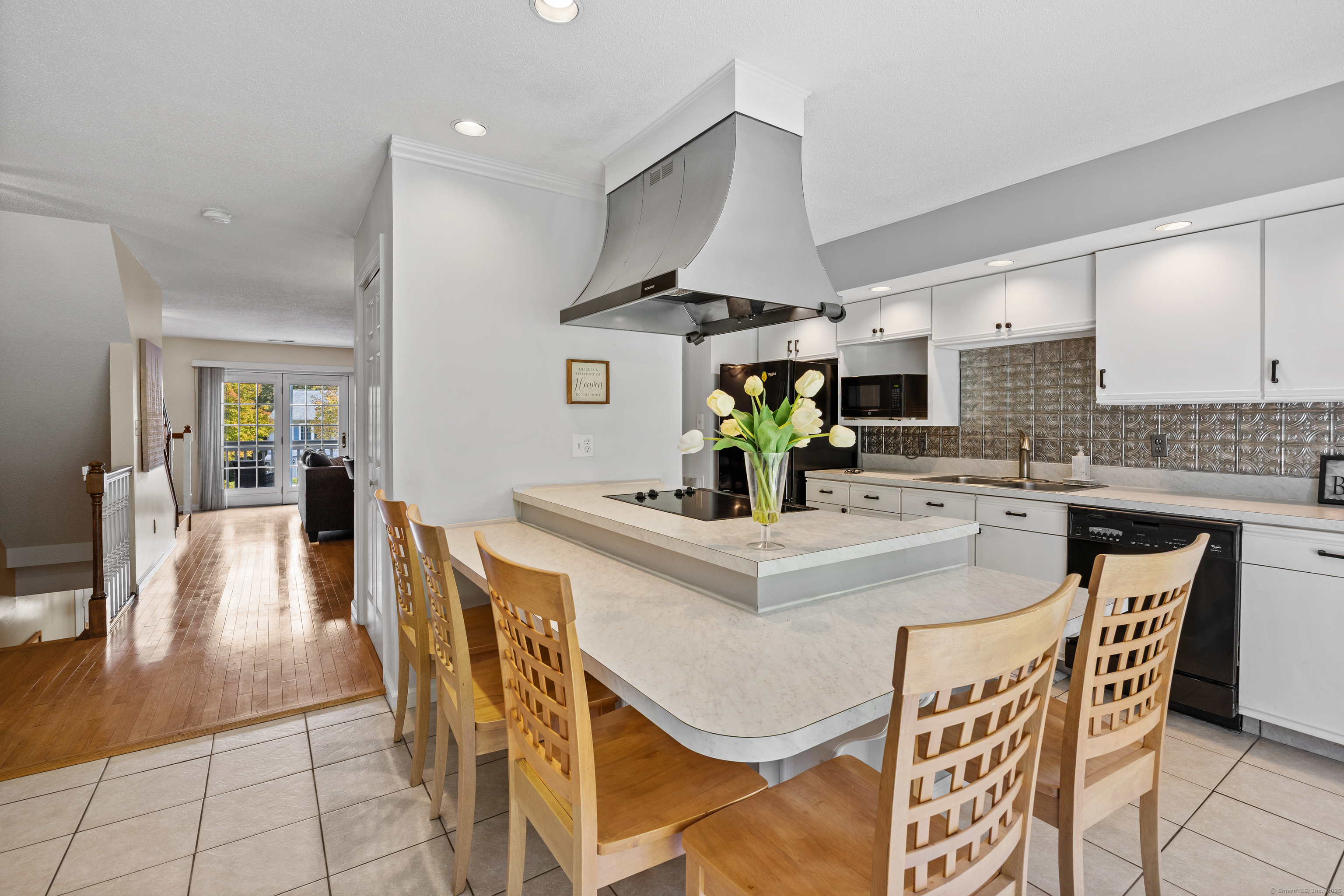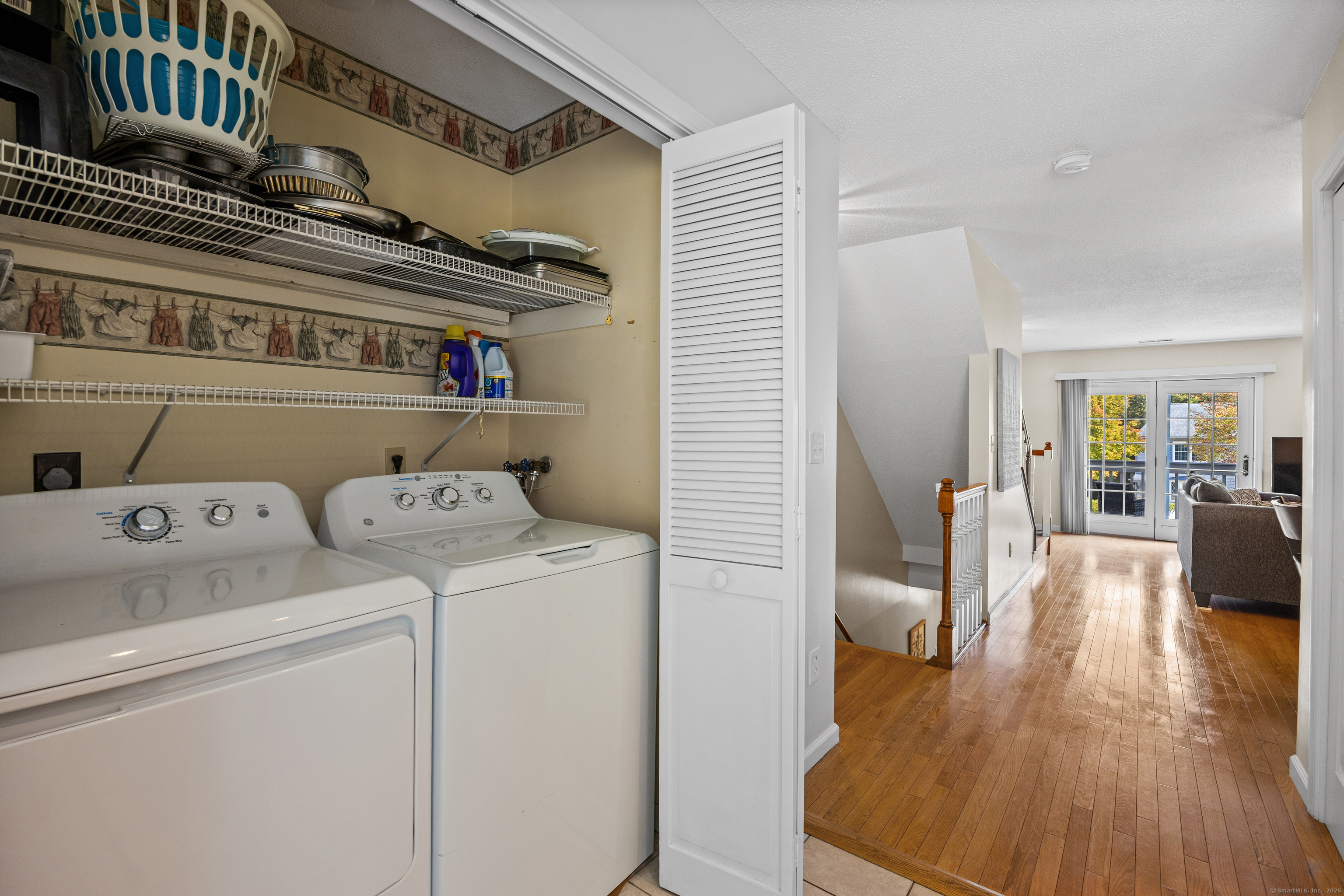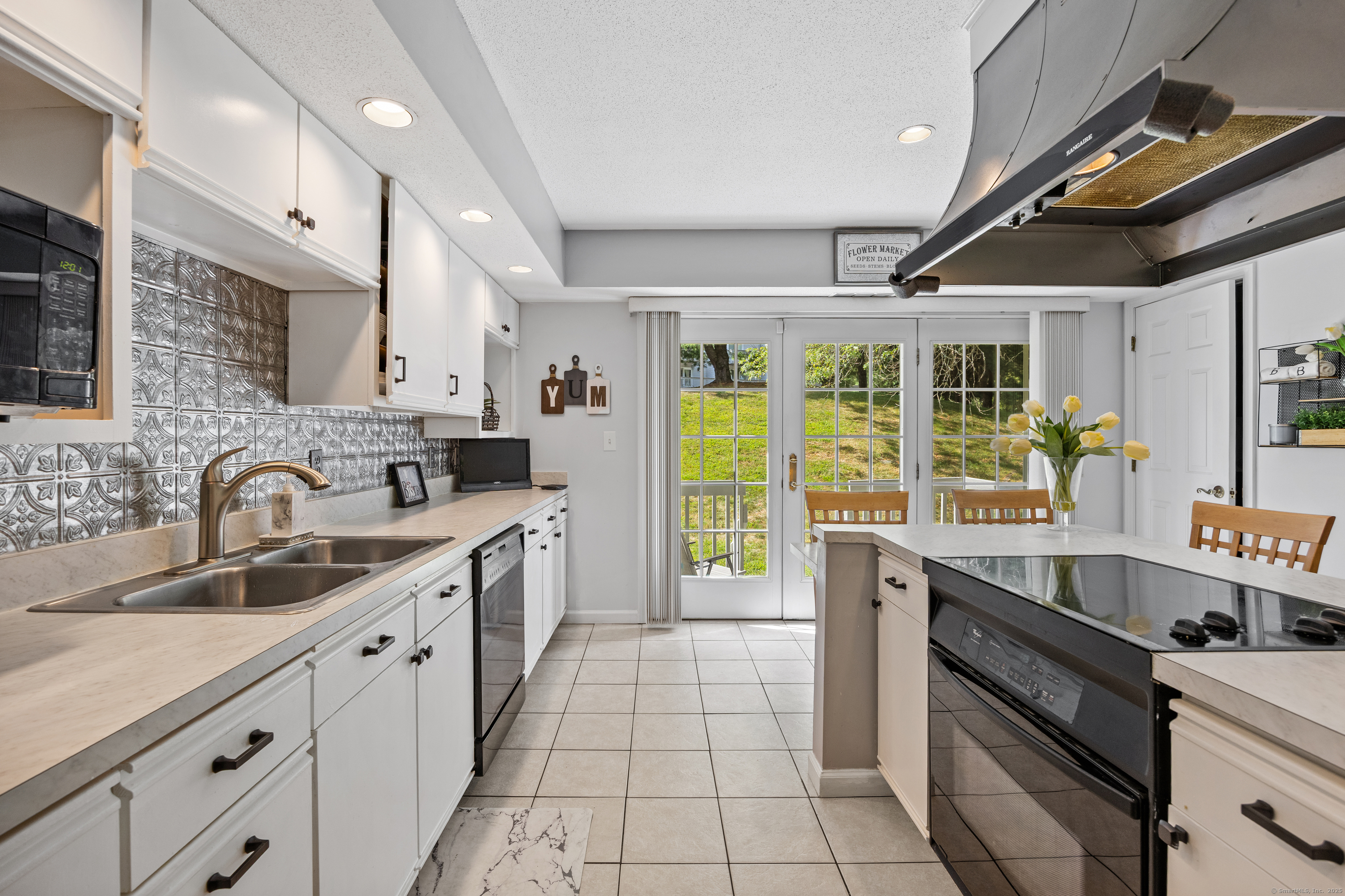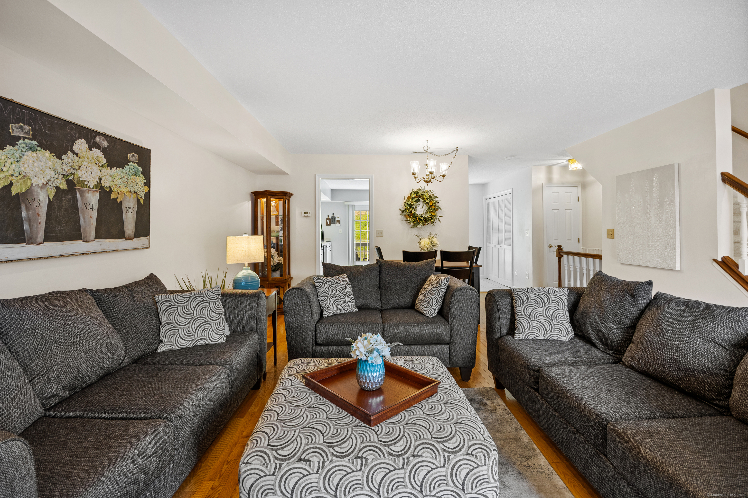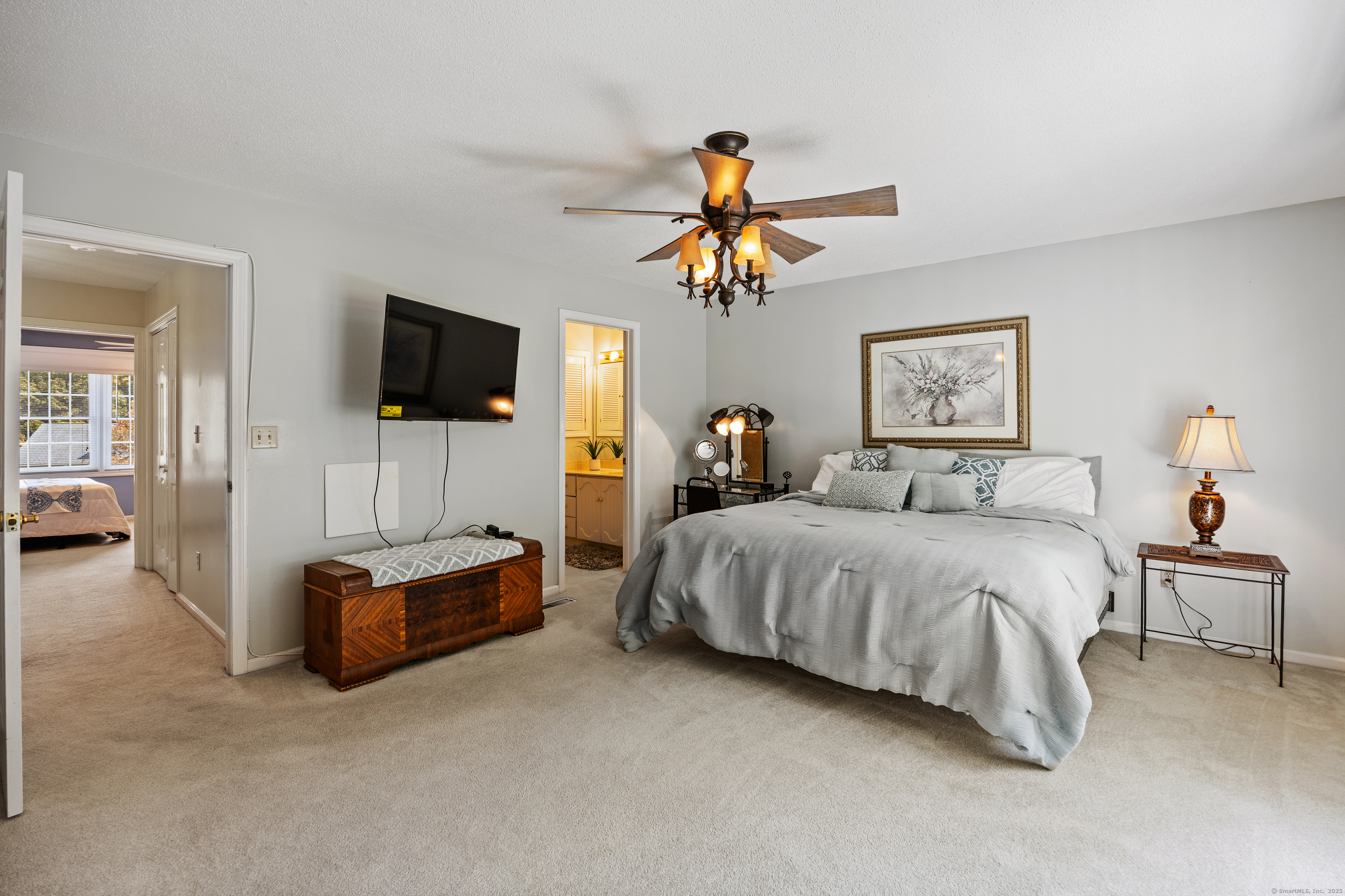 You will surely be delighted the moment you enter this beautiful, tastefully updated home. It features gleaming hardwood floors, and a cozy wood-burning fireplace in the spacious living room with French Doors leading to a lovely deck. Perfect for entertaining or simply unwinding at the end of the day. The eat-in kitchen is flooded with natural light, and is freshly updated with white cabinets, new counter tops, recessed lights and two pantries for ample storage. Laundry area and updated powder room are conveniently located on the main level. The second level features two large bedrooms, each with its own full bathroom, ensuring maximum privacy and comfort. The primary suite also boasts a balcony. Additionally, there is a one car garage with storage room. The serene location is just across from the Scoville Reservoir scenic walking trail. A true gem blending beauty, comfort and convenience!