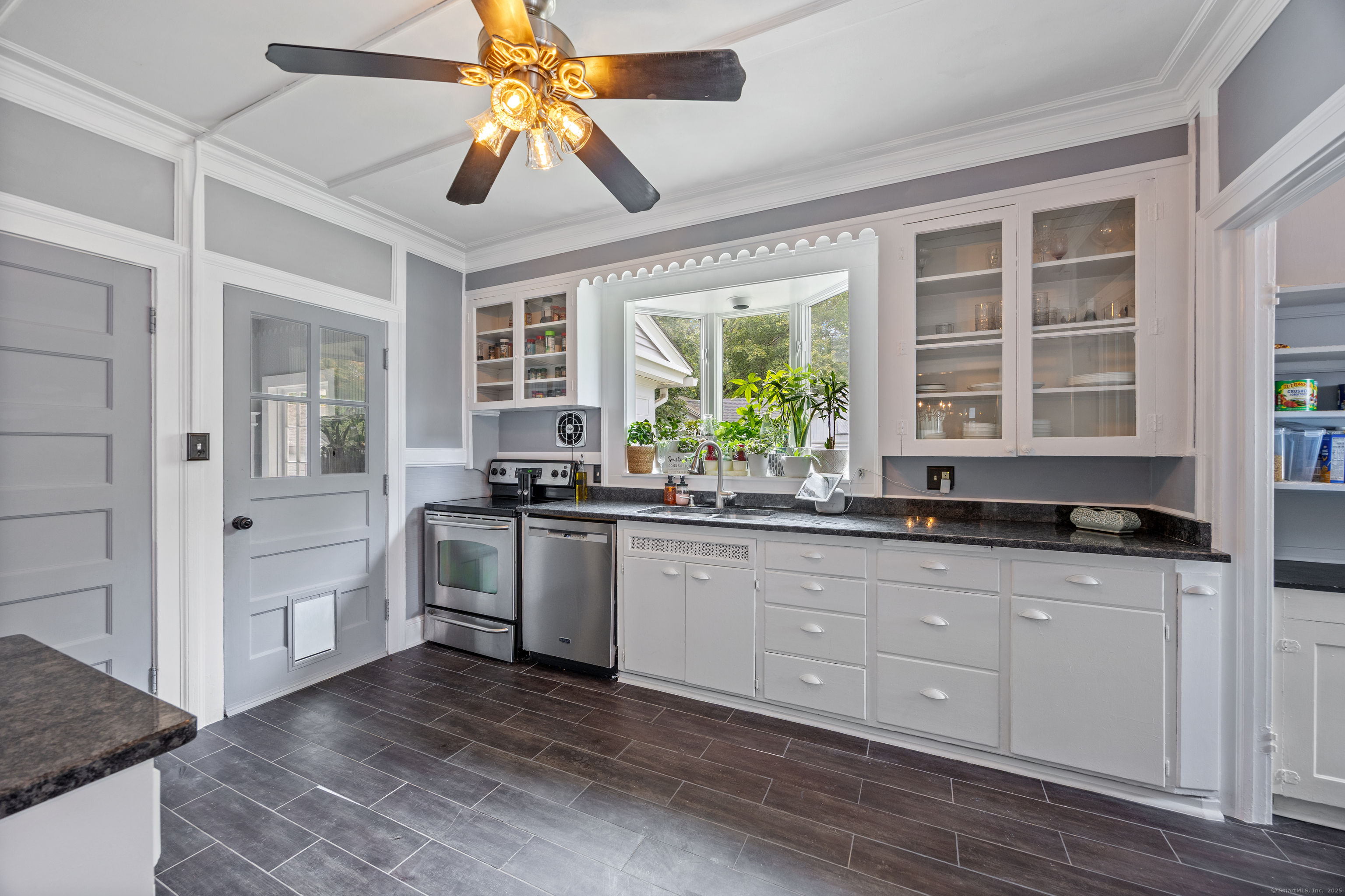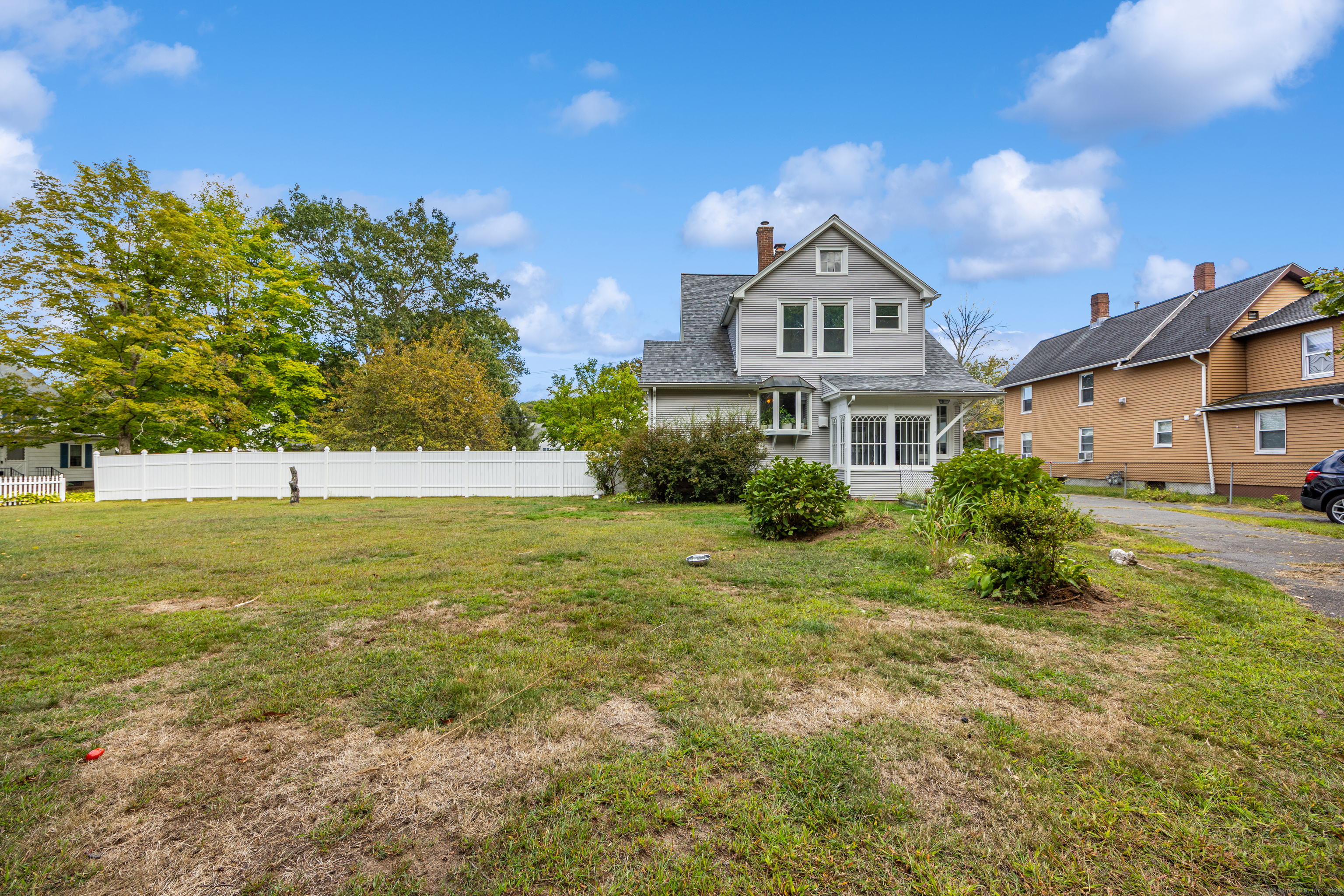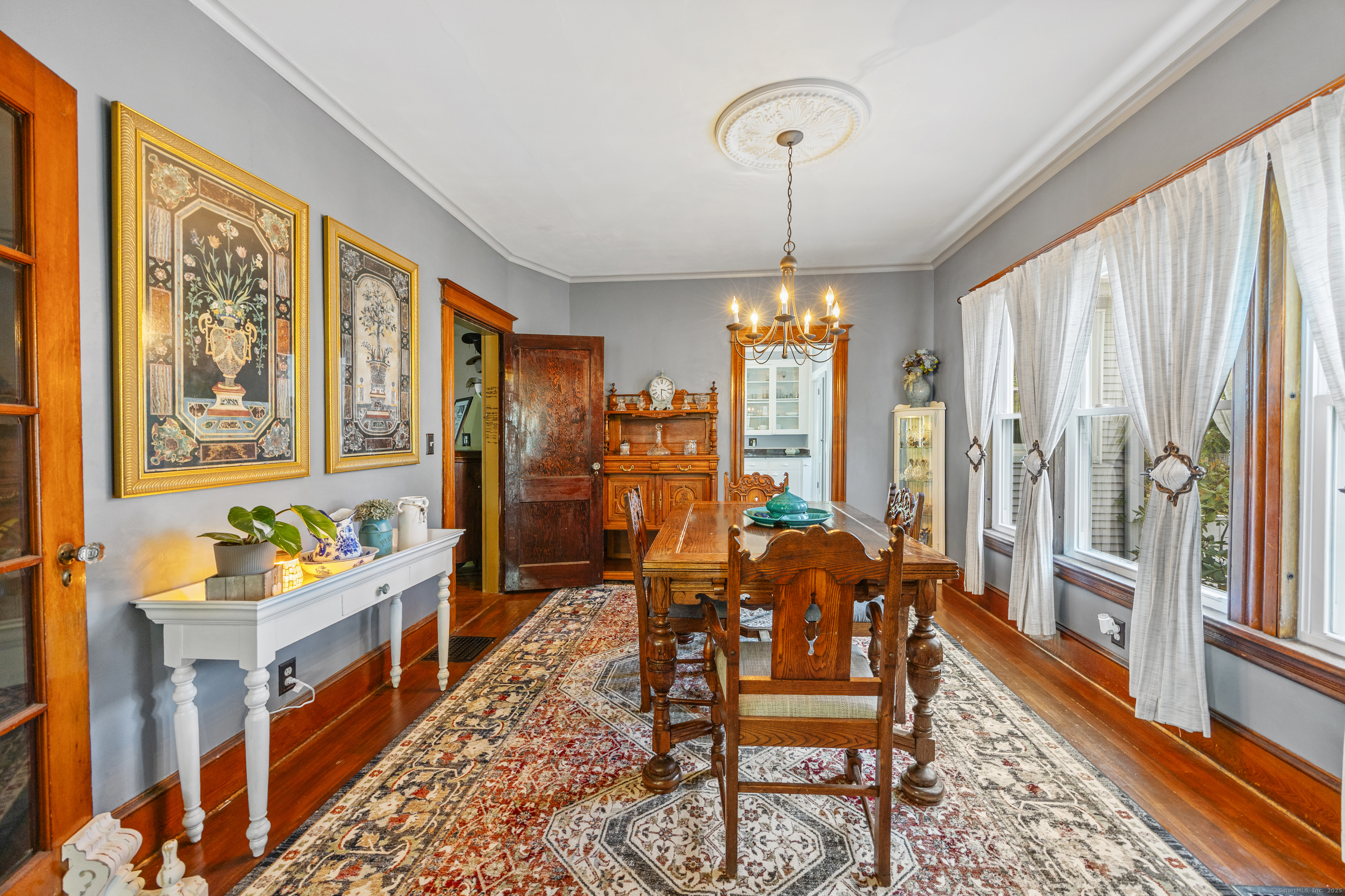 Step into a piece of history with this stately 100-year-old home, where old-world craftsmanship meets timeless elegance. From the original crown molding and ten-foot ceilings to beveled French glass doors, a warm beamed ceiling, and a grand wooden staircase, every detail whispers of an era when homes were built with artistry and care. The inviting fireplace in the office and graceful flow of rooms create a sense of comfort. The updated kitchen blends seamlessly with the home's antique character, featuring granite counters, stainless steel appliances, and a butler's pantry. Upstairs, discover three spacious bedrooms, a versatile flex room, and a beautifully finished bath. Two charming three-season rooms and partially finished third floor offer endless possibilities. Enjoy a large level lot with a brick fireplace, property abuts right to the Quinnipiac River. Two car garage and workshop for added storage. With new windows, new roof, and a location just minutes from downtown shops, & dining-this home is a rare blend of history and convenience. Make 308 Bristol Street your forever home, where every corner tells a story.