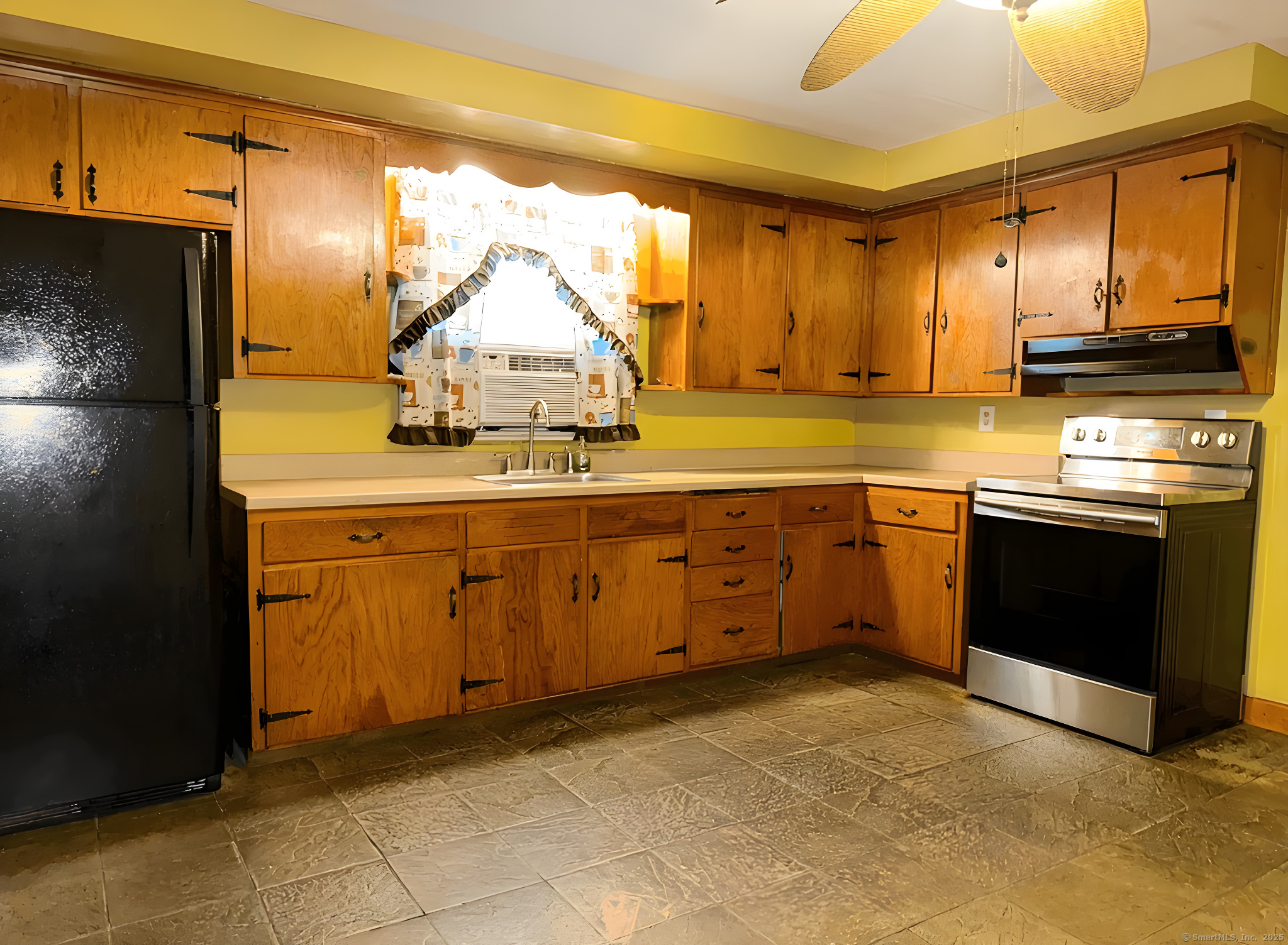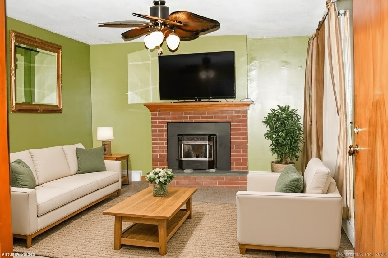 Welcome to 17 Hudson St in the Town Plot section of Waterbury. Tucked away yet seconds from highways and major routes, you won't want to miss the opportunity to secure this one level living, adorable ranch home! Upon entering, a lovely living room with fireplace and pellet stove insert welcomes you, open to the eat in kitchen with access to the basement, and the enclosed breezeway, which offers dual entry/exits to both front and backyard. Leading back through the family room, a full bathroom with tub and shower, updated vanity, perfectly centered to two bedrooms with ample closet space. The basement is clean, dry and offers plenty of room for finishing, a home office or gym, or immense storage. Laundry is also found here! The basement offers entry to the one car garage which is home to the Well-McLain furnace, installed in 2016 and regularly serviced. The backyard is quite private, and a perfect place for entertaining, gardening, even a pool or hot tub! The roof still has over a decade of standard life use remaining. If you choose to make some updates, the kitchen would be an easy start that would make a huge impact! Whether this is your first home, investment/rental, or downsizing/retirement option - this is an easy commuter location, convenient to stores, medical facilities, 24-hour pharmacy, NVCC, ACES at Chase Academy, walking distance from both the middle and high schools, restaurants, every single need or want is here. This home is the one to choose! AS IS. CAMERAS.