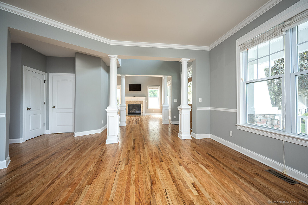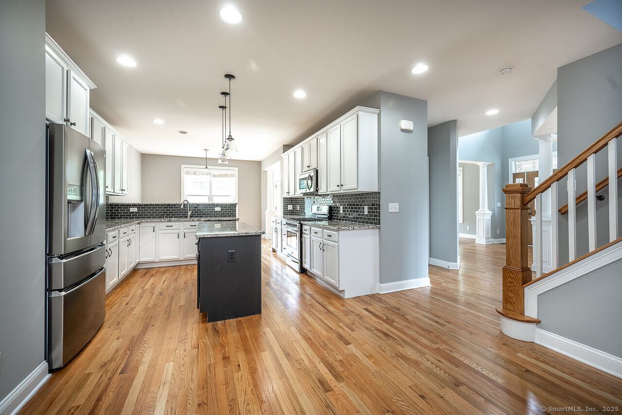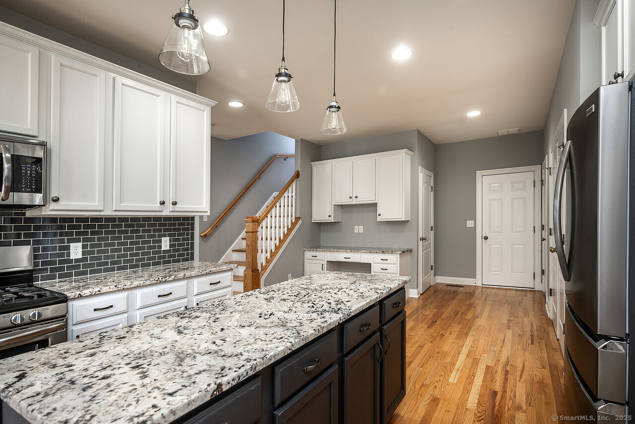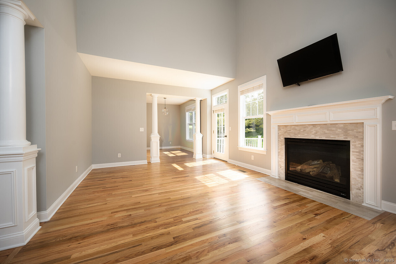 Fall in love with this stunning 3BR 3.5BA duplex that captivates from the moment you arrive! With its dramatic open floor plan, vaulted ceilings and sun-drenched interiors. Meticulously refreshed with crisp new paint, refinished hardwood floors and premium finishes throughout. The foyer with elegant columns opens to a sophisticated formal dining room and breathtaking two-story living room anchored by a cozy gas fireplace-perfect for intimate gatherings or entertaining in style. French doors beckon you to your private deck overlooking peaceful surroundings. The show-stopping kitchen is every chef's dream, featuring Alaska Ice granite countertops, center island, cabinetry galore, stainless appliances, including a brand new refrigerator, tile backsplash, and a generous walk-in pantry complete this culinary masterpiece. The thoughtful desk nook keeps life organized, while direct garage access makes daily routines effortless. Upstairs you'll find the primary bedroom with two walk-in closets, full bath, dual vanity sinks, tiled shower with seat and glass enclosure, plus soaking tub. Two additional bedrooms, full bath and laundry complete the upper level. Finished LL with full bath. TV in LR stays. Super Desirable Timber Oaks Community. Perfectly situated at end of cul-de-sac and just minutes to charming downtown Bethel. Convenient to major highways, shopping and numerous restaurants. Only a 15 minute drive from NY line!