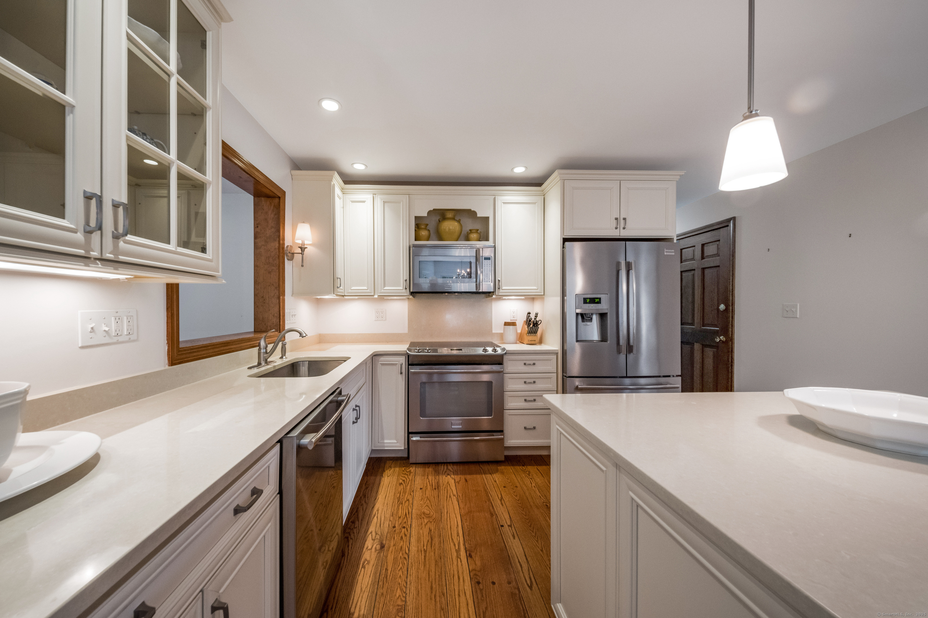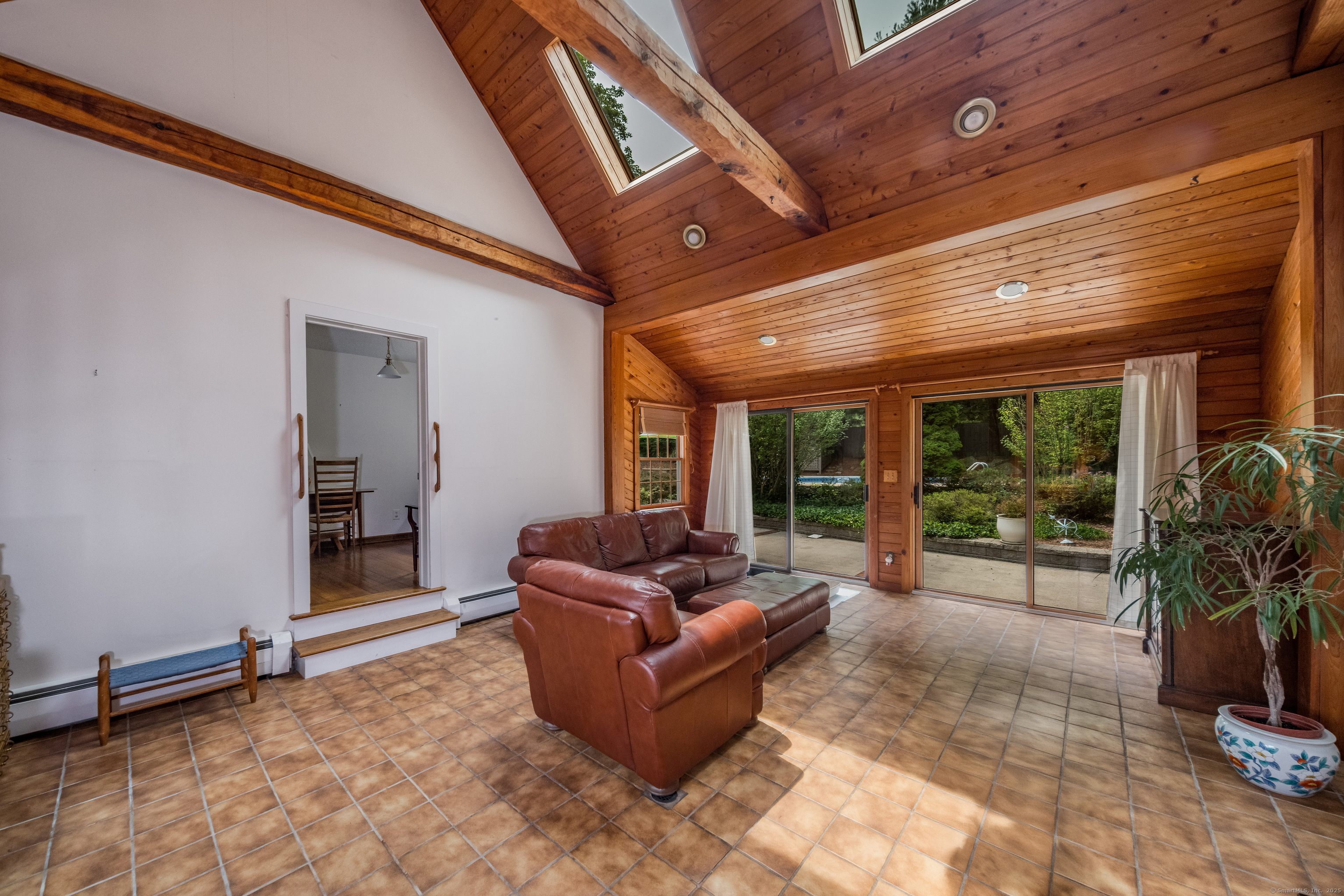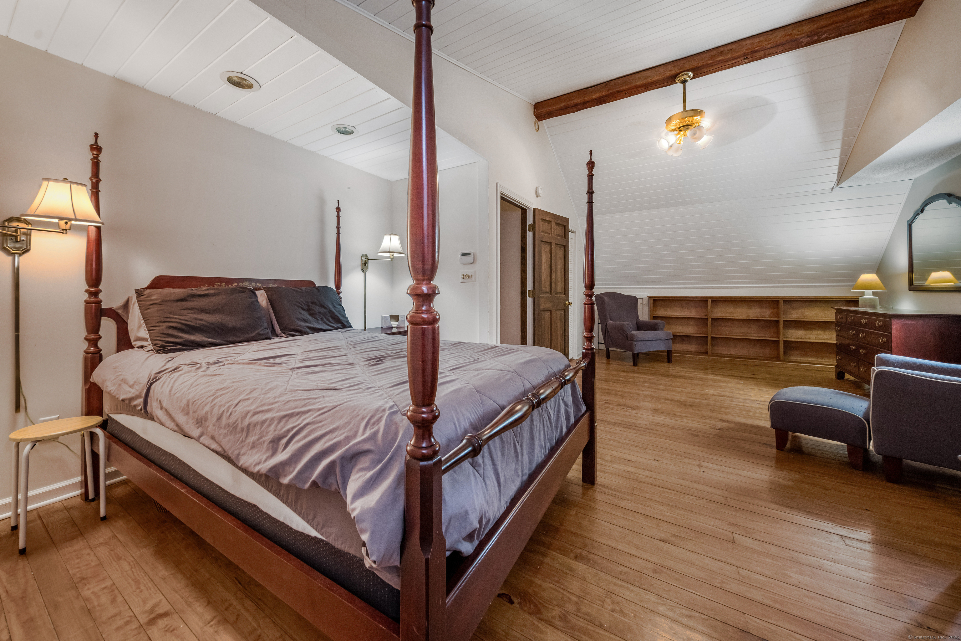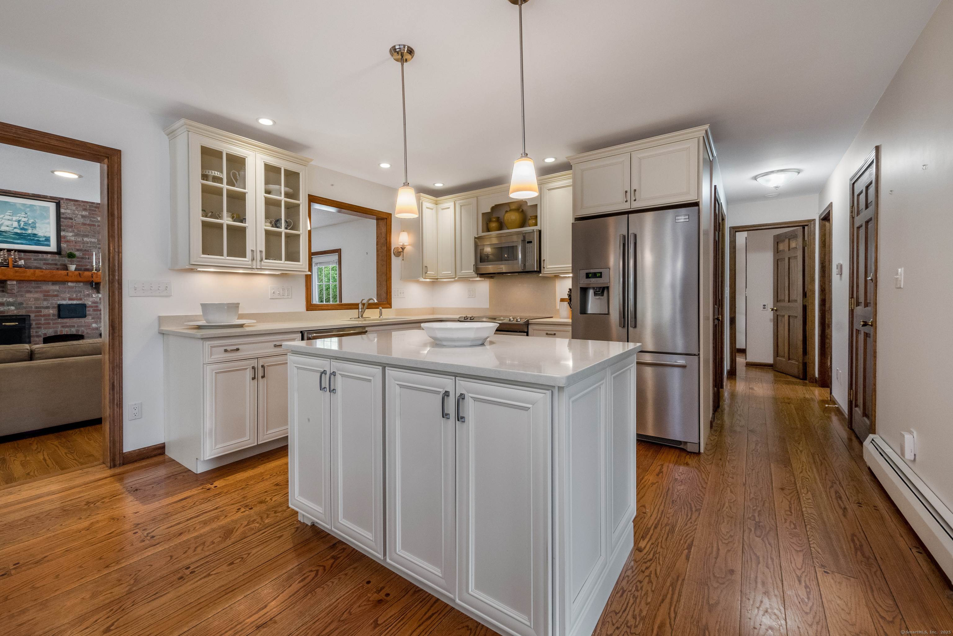 Discover exceptional living on this private interior lot featuring your own tranquil pond and over 3,000 square feet of beautifully appointed living space. This impressive Guilford home offers endless possibilities with an additional 260 square feet of finished basement space and a remarkable 650 square feet of unfinished area above the oversized two-car garage, complete with its own balcony-perfect for future in-law suite or home office. The heart of the home showcases a recently remodeled kitchen that seamlessly flows into the expansive family room featuring soaring cathedral ceilings and a cozy wood-burning fireplace. Natural light floods the generous sunroom with its dramatic vaulted ceilings and skylights, creating the perfect year-round retreat with sliders that open to the back patio. The second-floor primary suite impresses with cathedral ceilings and dual walk-in closets for ultimate comfort and storage. The flexible first-floor dining room currently serves as a bedroom, offering versatile living arrangements to suit your needs. Outdoor entertainment reaches new heights with the built-in saltwater pool featuring a heat pump system and recently replaced liner. The private pond adds serene natural beauty to this already exceptional property. This rare offering combines spacious living, recent updates, expansion potential, and unmatched privacy in one of Guilford's most desirable settings.