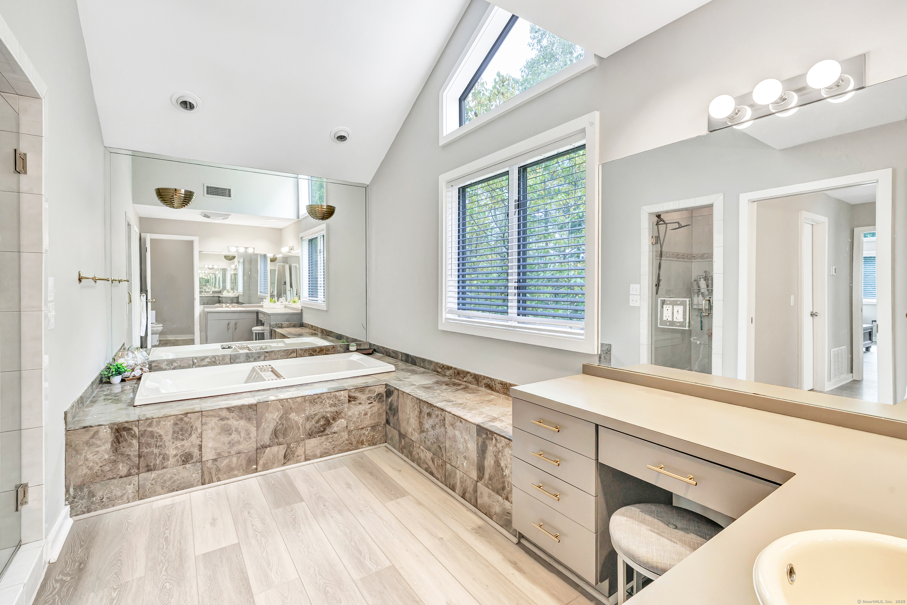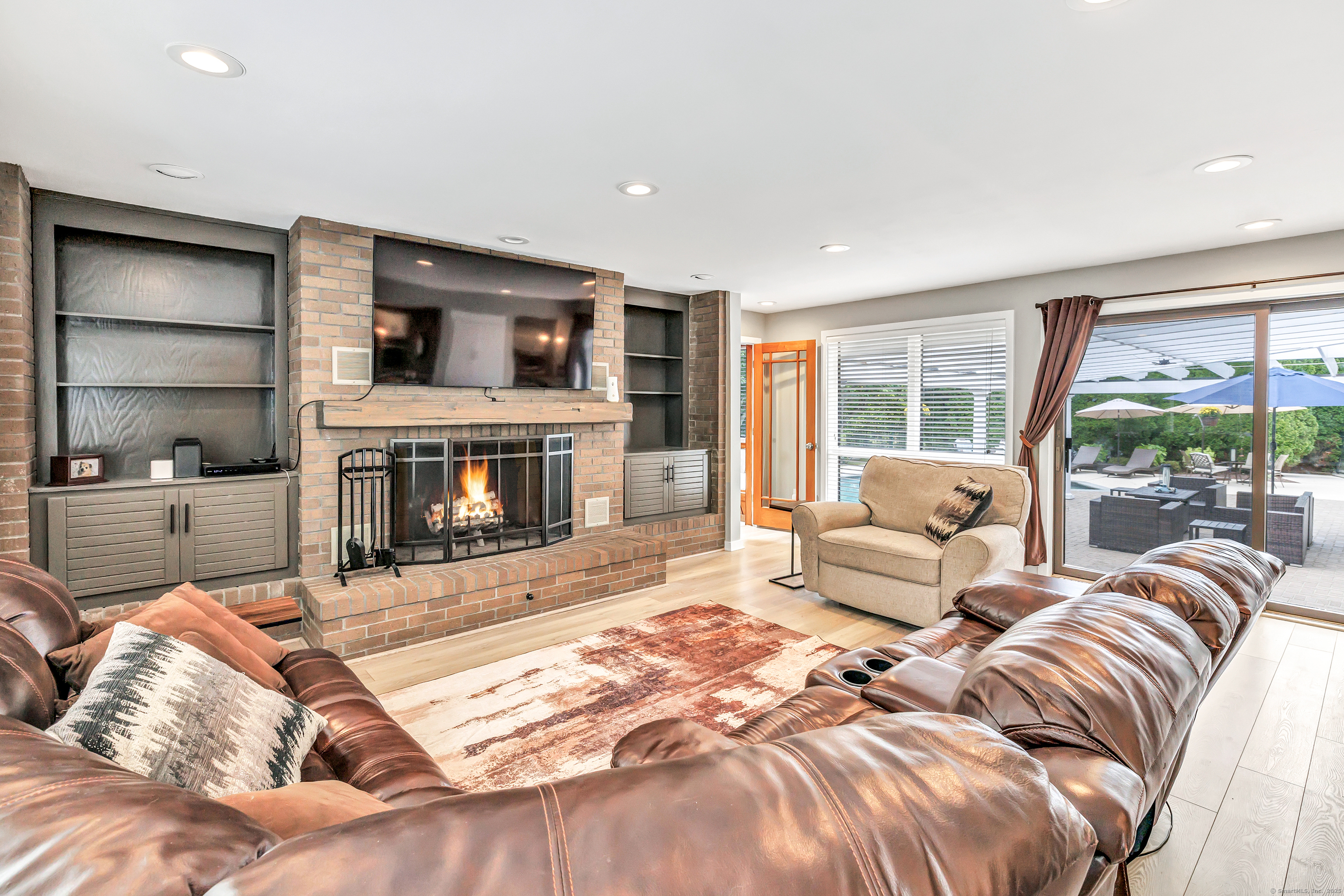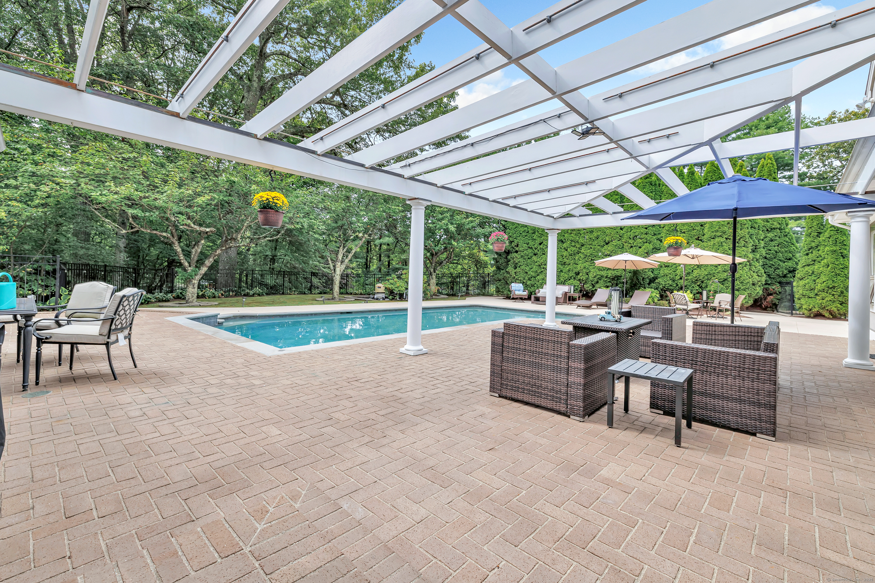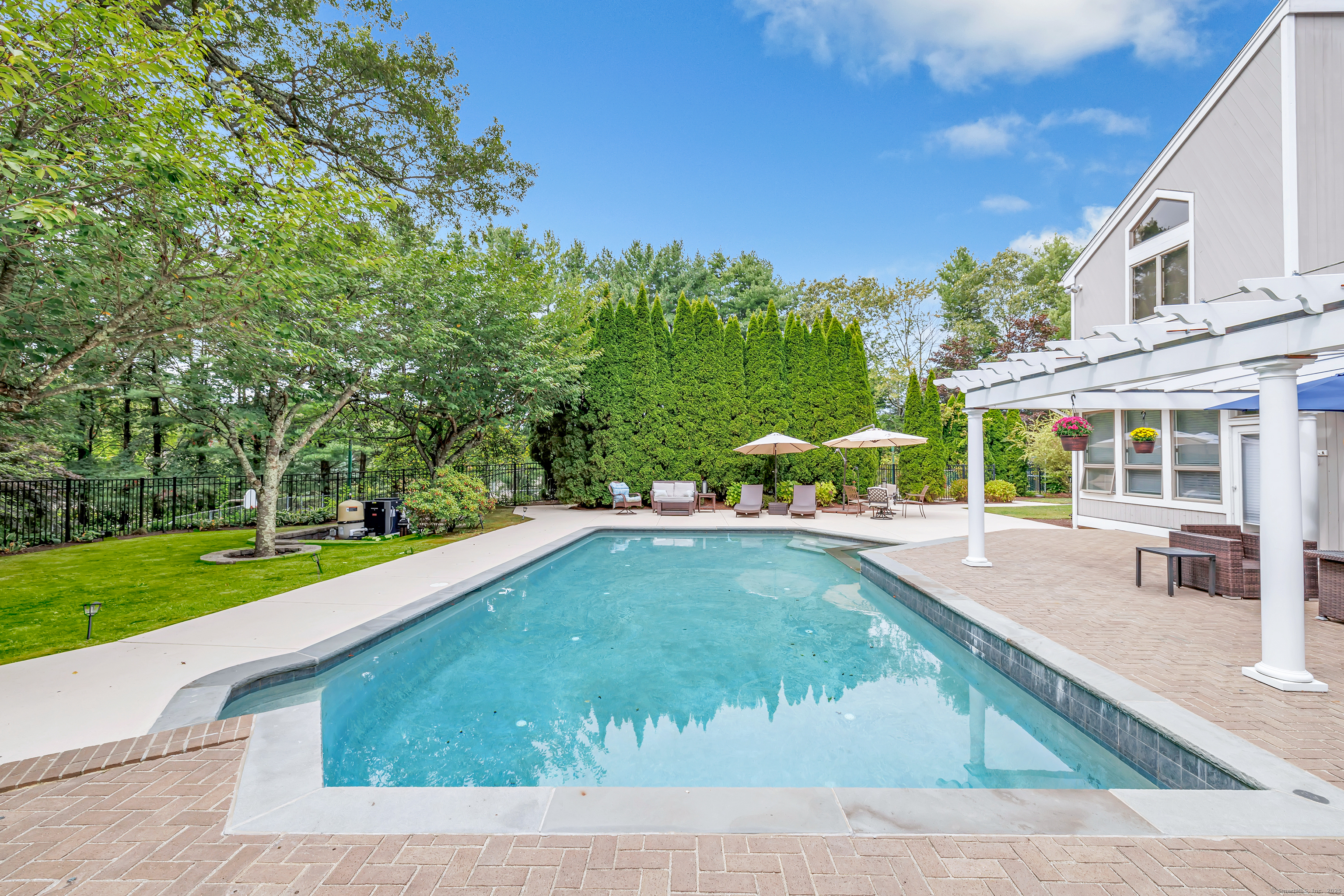 One-of-a-kind contemporary in the "Berries" of Huntington offering over 7,000 sq ft of living space on a private 1.82-acre lot. Professionally landscaped grounds feature, full size tennis court, basketball hoop, stone walls, and an in-ground pool with brick patio and pergola. Sun-filled interior boasts a vaulted sunken living room with marble fireplace, gourmet kitchen with high-end appliances, family room with fireplace & hot tub room, plus formal dining, office, and pub room. Upstairs has 6 bedrooms including a dramatic primary suite with cathedral ceiling, 2 walk-in closets & spa bath. Finished Walk-out lower level (approx. 2000 sqft) adds endless options. Recent updates: new flooring, Bosch high-efficiency HVAC, Generator and new pool filter/cover.