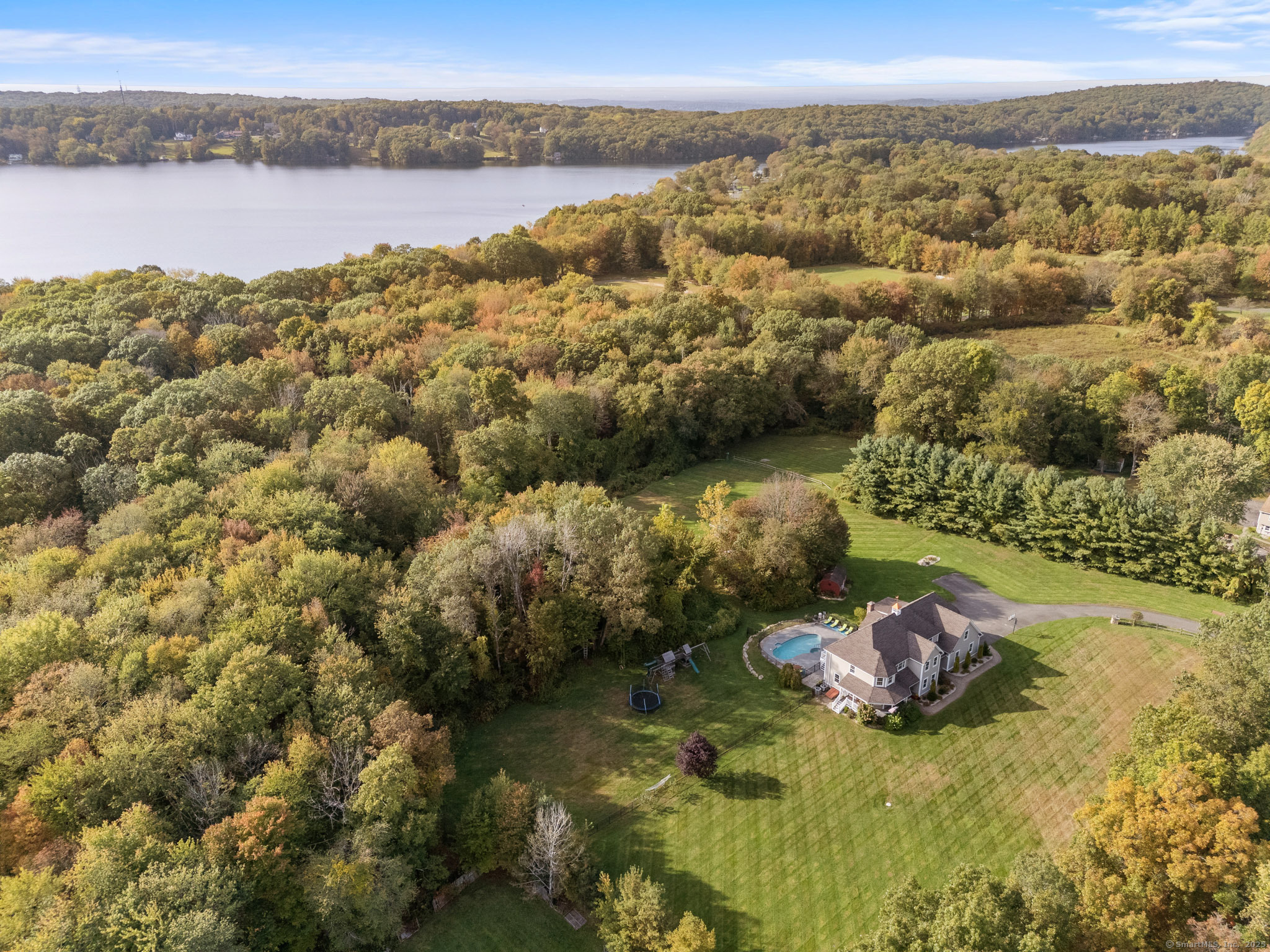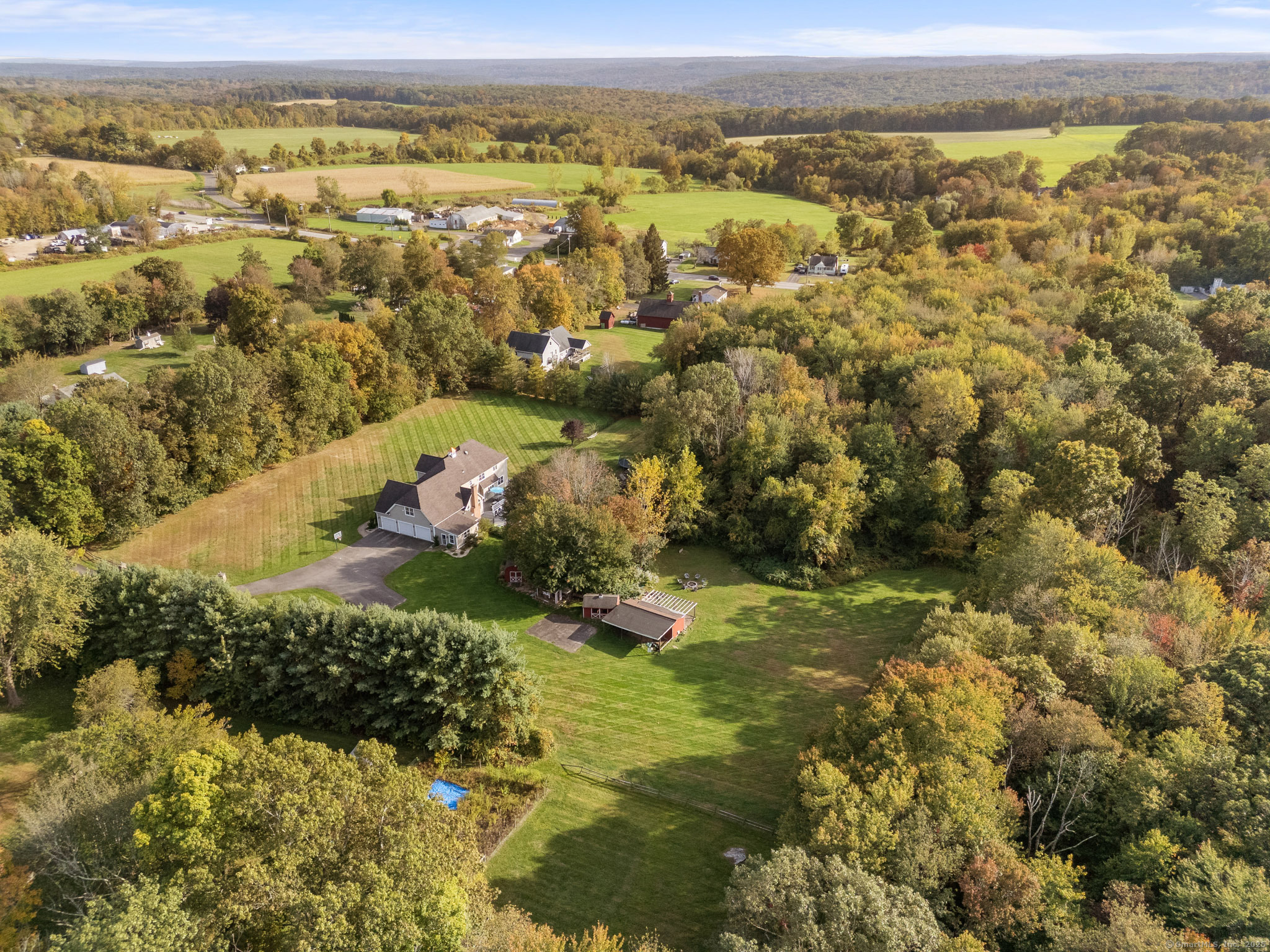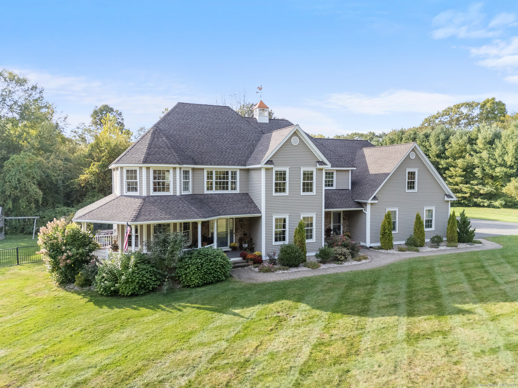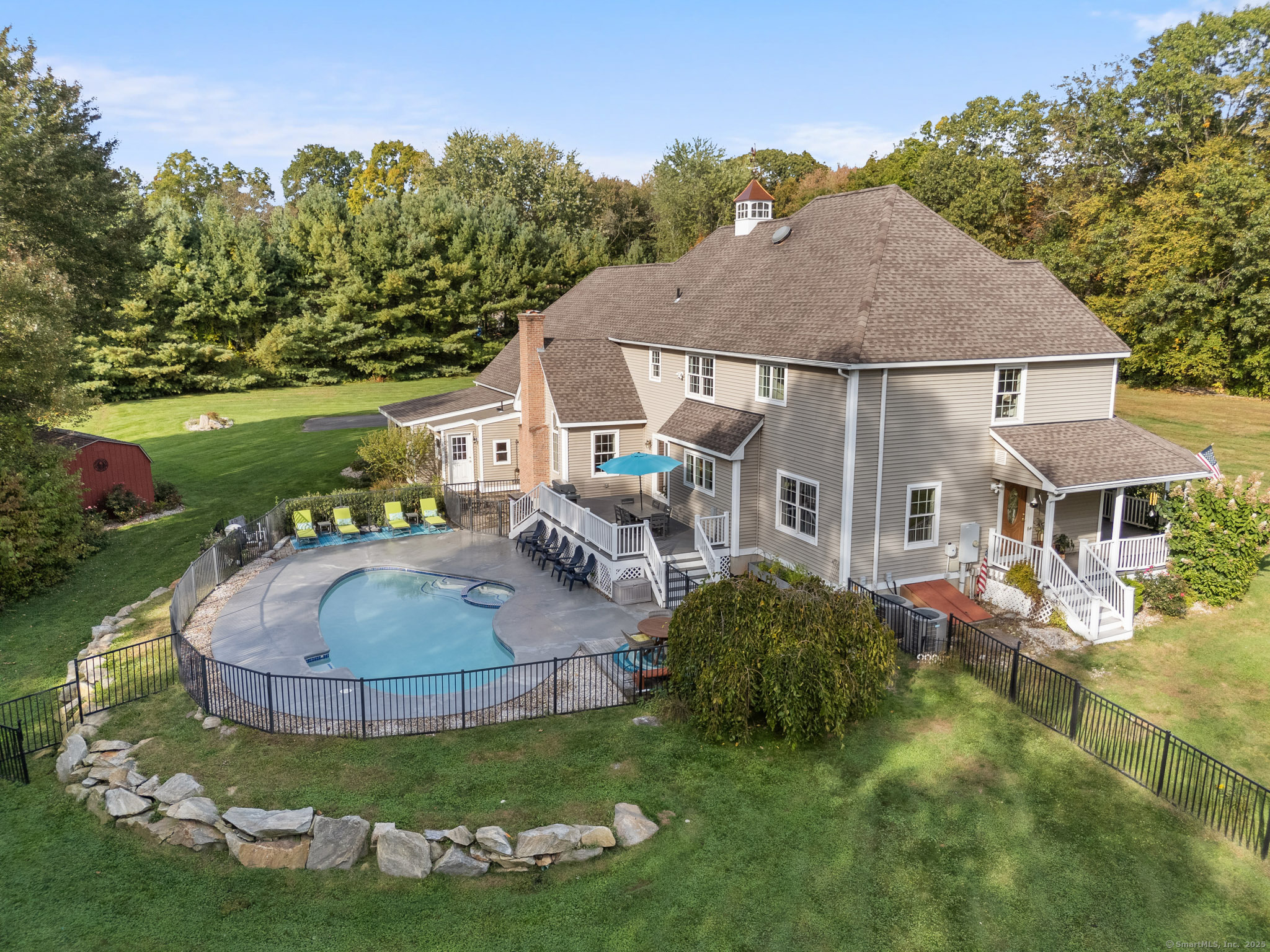 This stunning 5-bedroom Colonial is perfectly situated on more than 6 acres, offering true resort-style living. Open eat-in kitchen features granite countertops, center island with seating, all new stainless steel appliances, and a new slider to the deck. The impressive great room boasts a floor-to-ceiling stone fireplace, while the formal dining room includes a wet bar with granite counters and custom cabinetry. A cozy family room with a fireplace and hardwood floors throughout completes the inviting main level, along with a separate home office for today's lifestyle needs. Upstairs, the spacious primary suite offers a large walk-in closet and a luxurious bath with a deep jetted tub. Three additional bedrooms and a full bath complete the second floor. An exceptional in-law apartment is located over the garage with a private entrance, featuring its own bedroom, kitchen, living/dining area, and full bath. Additional office with private entry is attached to the oversized 3-bay garage, providing ideal space for remote work or a home business. Step outside to your own backyard oasis with a heated in-ground gunite pool (reblasted in 2024) with new pool heater, night lights, attached hot tub, perfect for entertaining day or night. The property also includes a 3-stall barn with tack area and a shed. Enjoy seasonal lake views, a firepit area, and a fully fenced space great for dogs or young kids. Huge open basement with tall ceilings Highest & best is due Monday October 13th at 4 PM