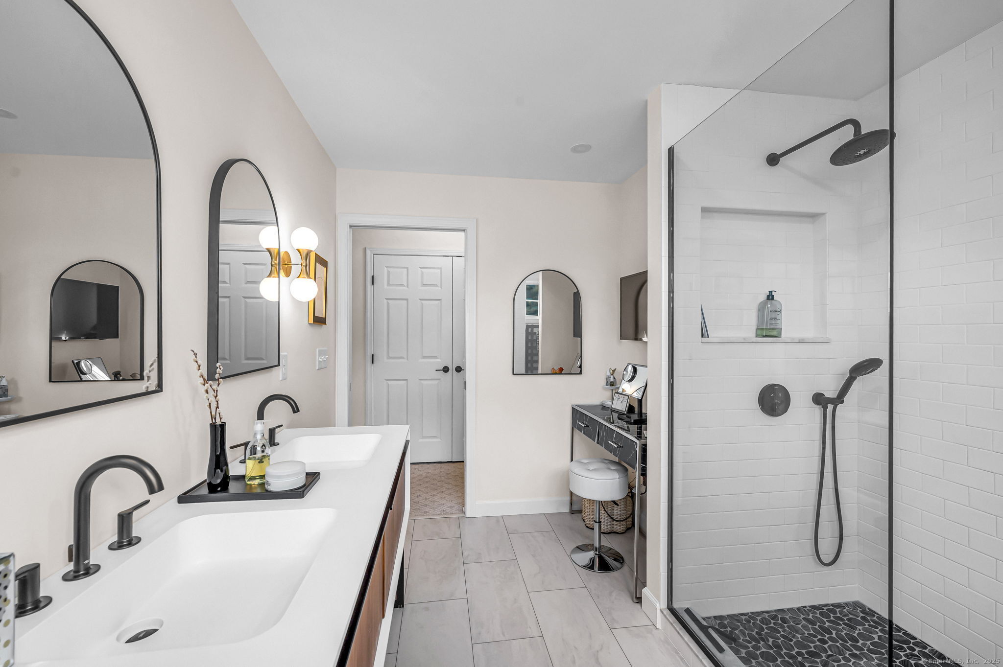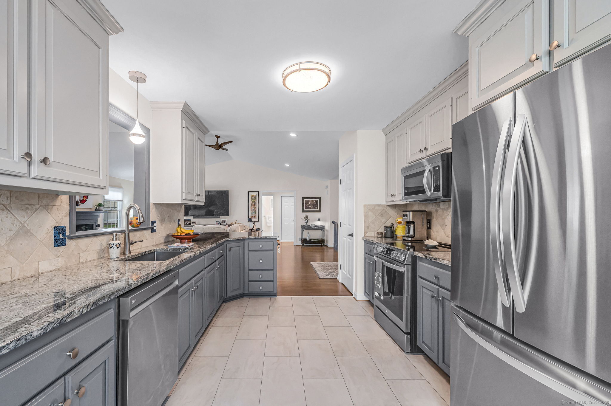 Better Than New! Tastefully Renovated & Move-In Ready! Impeccably updated inside & out, this free-standing 2-bedroom, 3-bath Ranch in desirable Shaker Heights, active adult-over 55 community offers a perfect blend of comfort, style & convenience. Inviting open floor plan features new entry door, gleaming hardwood floors, custom window treatments & abundant natural light throughout the main living area. Chef's kitchen boasts custom cabinetry, new granite countertops, tile flooring, pantry, modern hardware & fixtures & a bay-windowed eating area. Living room impresses w/ vaulted ceilings, ceiling fan & gas fireplace, creating a warm, welcoming space for entertaining/relaxing. Primary suite is completely transformed with redesigned luxury bath featuring stunning 7-foot spa shower, elegant finishes and custom closets. Entire home has been freshly painted, including new smooth ceilings, new entry door & custom closets & window treatments, offering a bright & modern aesthetic. Enjoy seamless indoor-outdoor living; sliders off dining area open to new oversized patio w/custom privacy wall, perfect for entertaining or quiet evenings outdoors. Finished lower level provides exceptional versatility, featuring a guest room, two walk-in off-season closets & a full bath-ideal for guests, a home office, or hobby space. Pet-friendly community with low monthly HOA, this PUD home combines ease of condo living & the privacy of a single-family home. Near I-91, shopping & many local amenities.