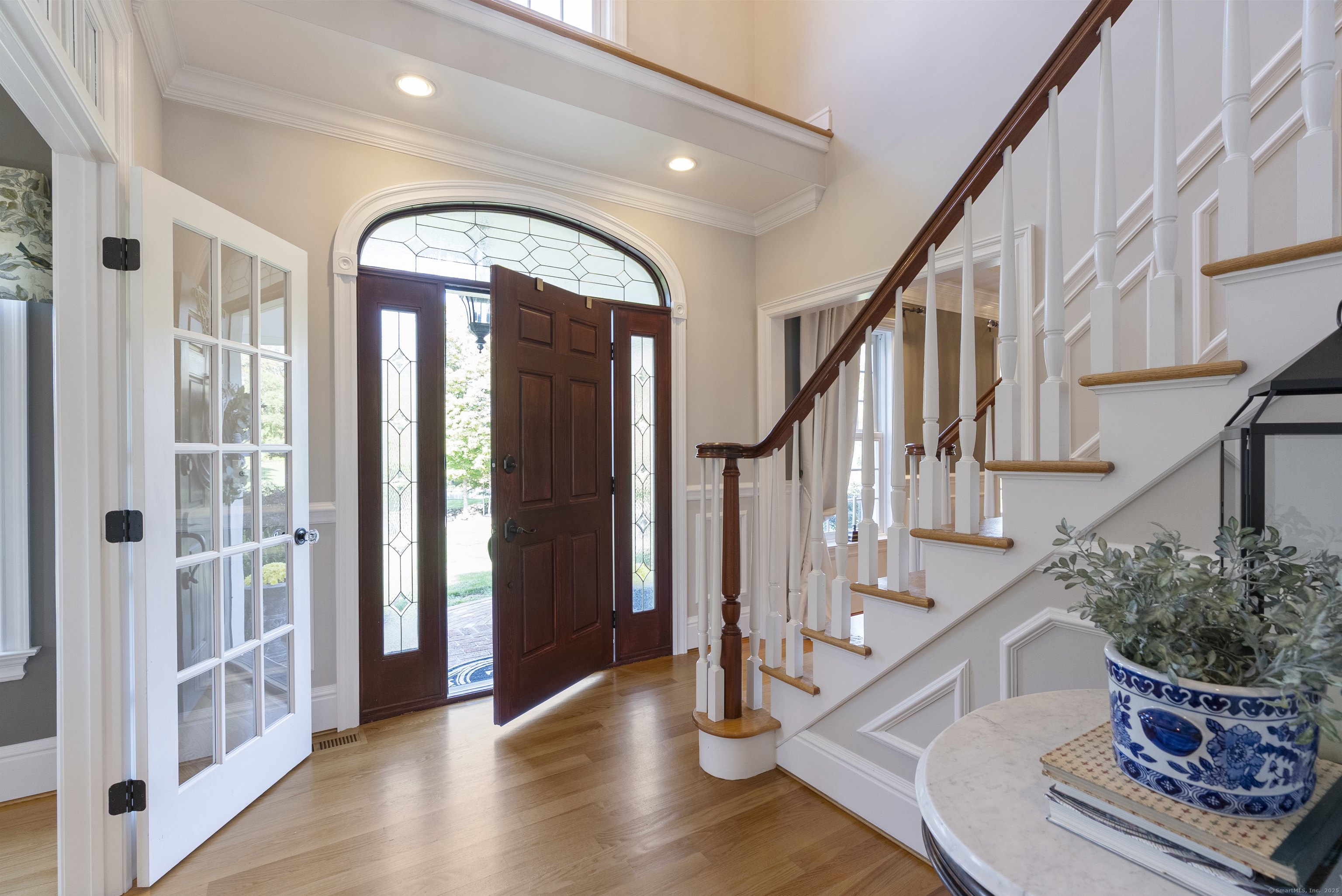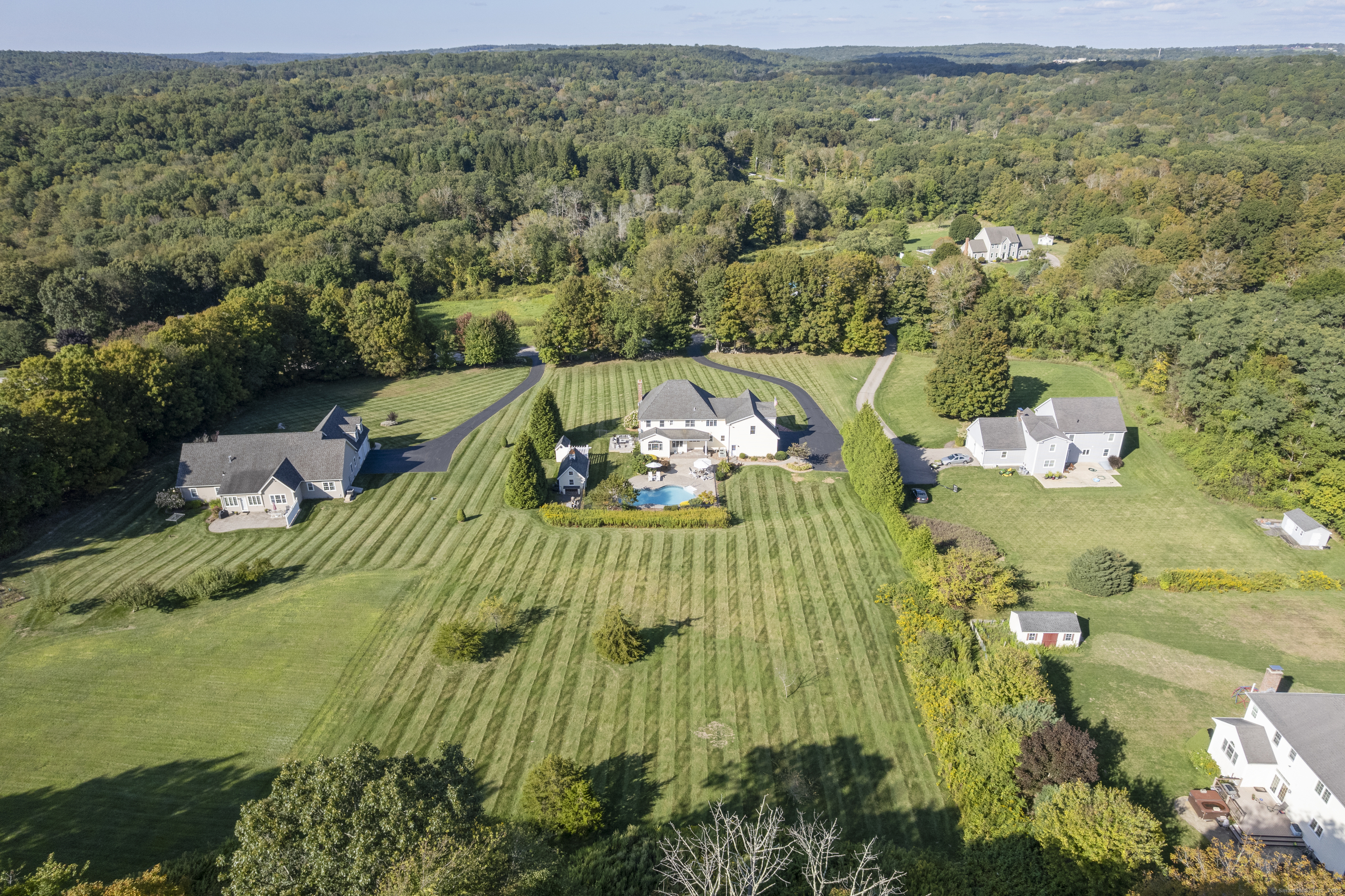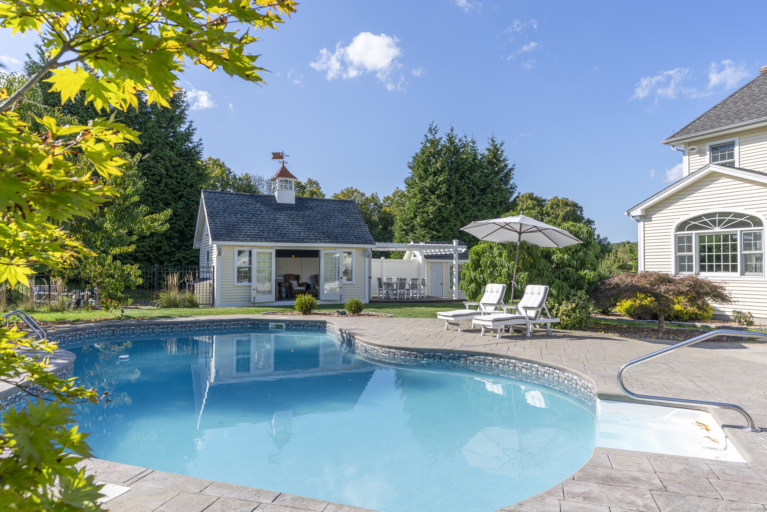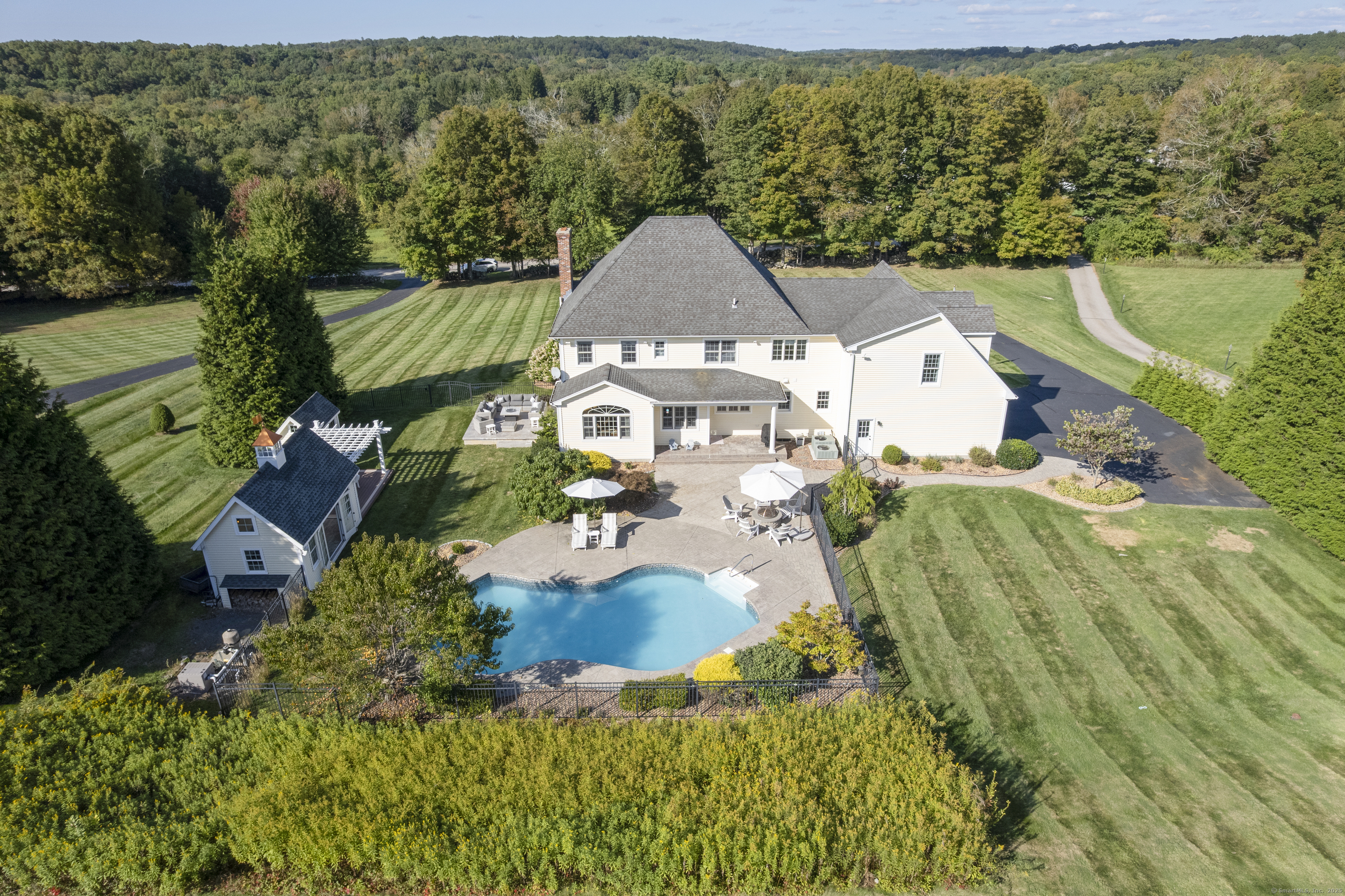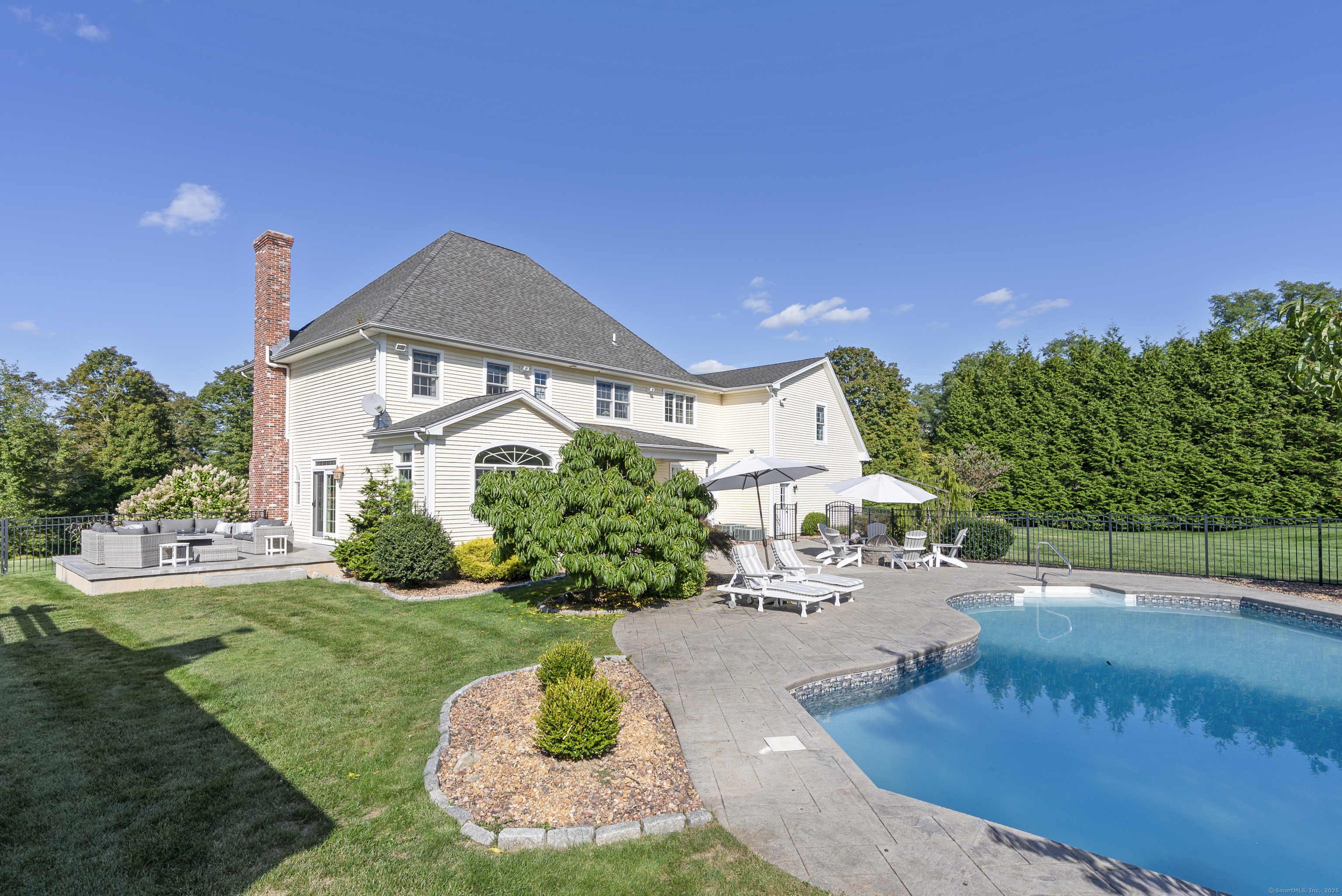 Prominently set on 2.6 acres of manicured grounds, this highly appointed Colonial exudes elegance, while offering a layout designed for everyday living. From the moment you arrive, the setting impresses-lush greenery, striking curb appeal, and an outdoor oasis designed for both relaxation and entertaining. The resort-style outdoor living is nothing short of spectacular..in-ground pool framed by two expansive patios, beautifully crafted cabana with detailed trim, and pergola-topped deck make every day feel like you are vacationing at a luxury resort. Custom designed with no details spared; the home is a showcase of unparalleled craftsmanship featuring multi-tiered crown moldings, shadow-boxing, tray ceilings, transom windows, and gleaming hardwood floors throughout. At the heart of the home, is the chef's kitchen featuring custom cabinetry, intricate millwork, professional-grade appliances, large center island, pantry. The floorplan was designed to naturally and seamlessly blend together between the kitchen, living room, dining room, family room, and extend outdoors to the resort-style pool area. The upper level offers four large bedrooms, highlighted by the luxurious primary suite. French doors lead to a spa-inspired bath with dual sinks, jetted tub, tiled shower, and spectacular walk-in closet with custom built-ins. The spacious great room with built-ins and a full bath, is the perfect game room, office, or guest suite.
