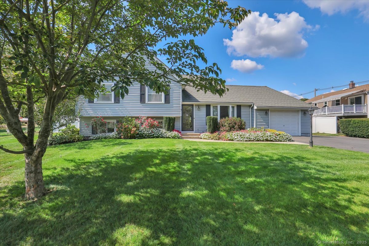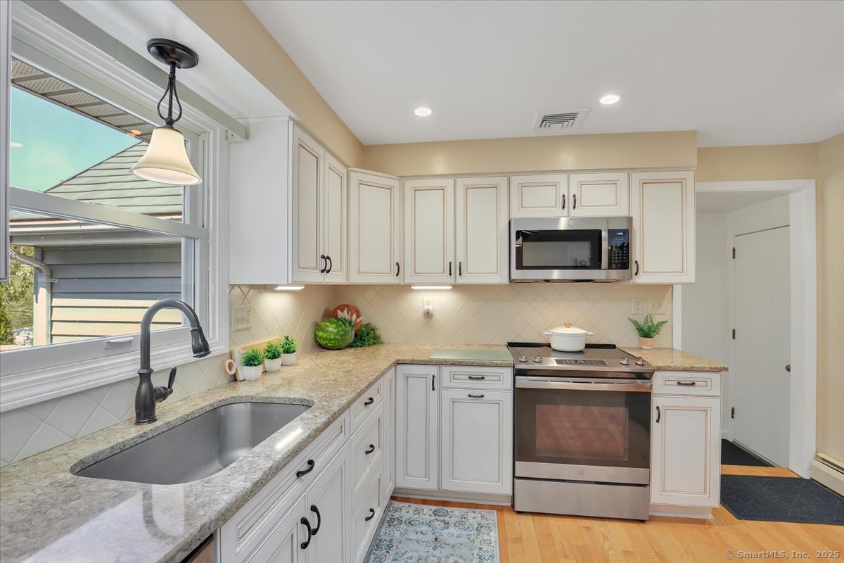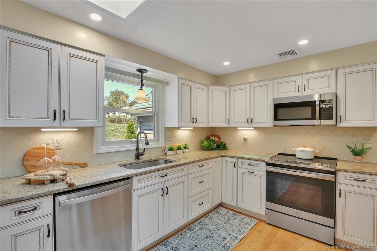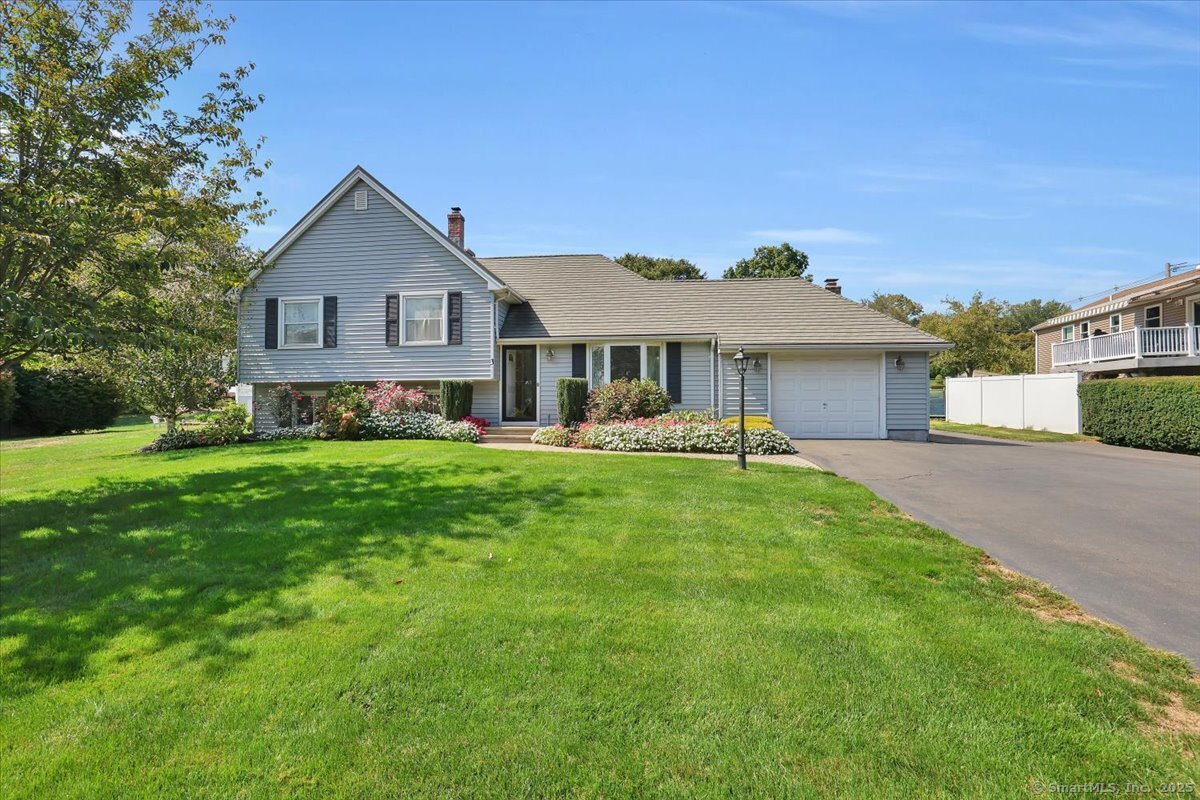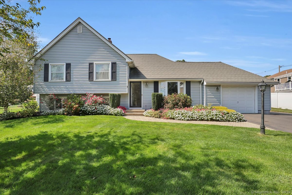 Ideally located just 10 minutes from downtown Wallingford with easy access to the highways, this raised ranch pairs everyday convenience with welcoming, inviting spaces. The beautifully landscaped front lawn with its sprinkler system and walkway lead you into a home with refreshed walls and hardwood floors throughout. Listed as a 3 BR, there is a possibility of a 4th BR or let your imagination take hold when you view the back room on the main level, currently being used as an office. The recently remodeled kitchen, flooded with natural light from 2 skylights has gleaming quartz countertops, soft closed cabinets, stainless steel appliances and a generous pantry and a half. Enjoy your morning beverage of choice in the 3 season sunroom that leads out to a beautifully landscaped patio. The lower level adds 288 extra square feet, perfect for an entertainment center. Did I forget to mention the architectural metal roof? That's right, installed 12 years ago with a useful life of 50 years! And there is ample off street parking, the oversized driveway can park 6 vehicles. Book your showing now!!