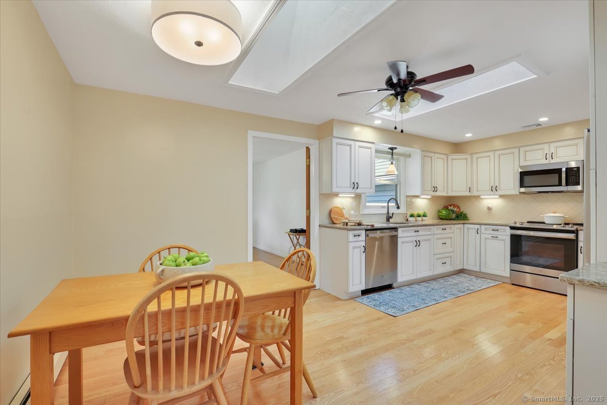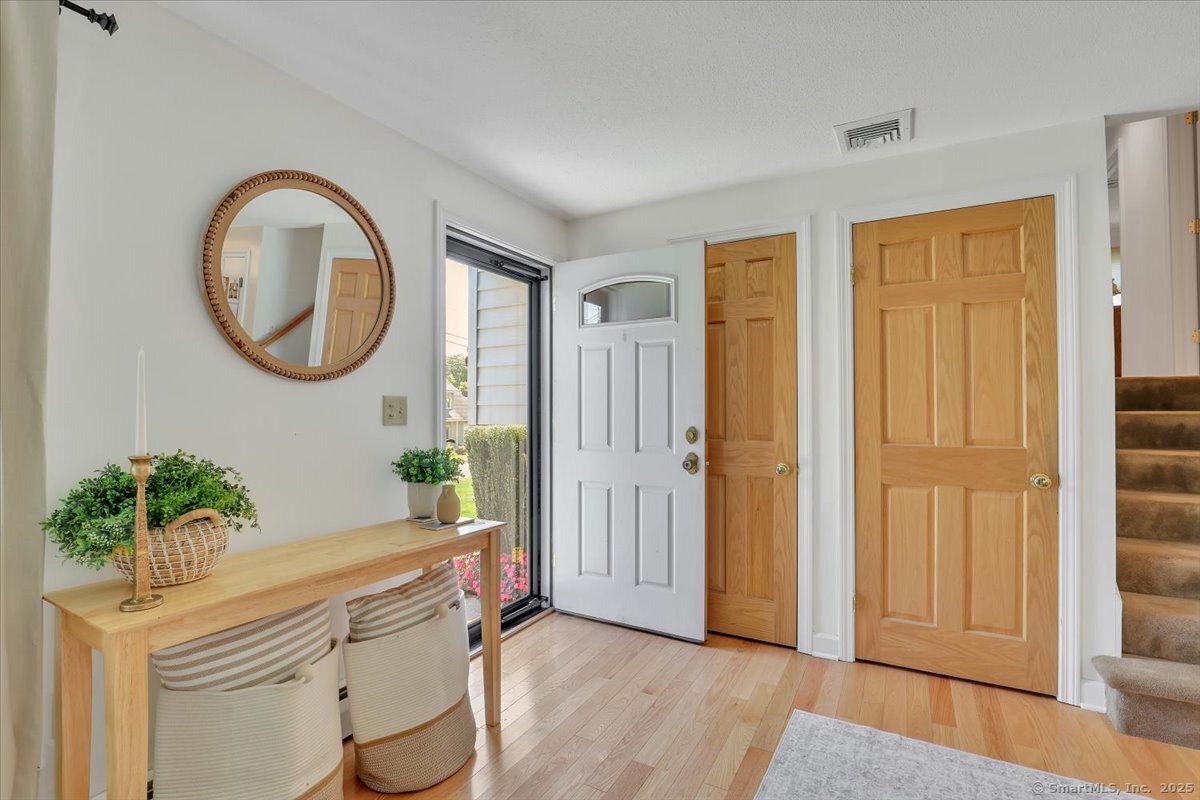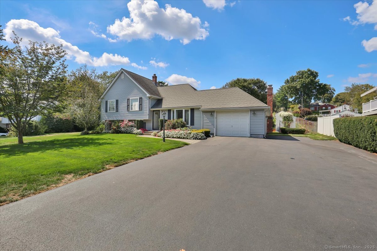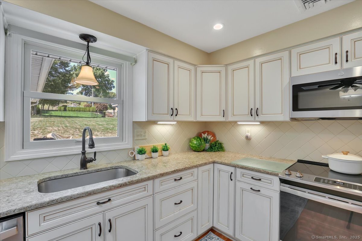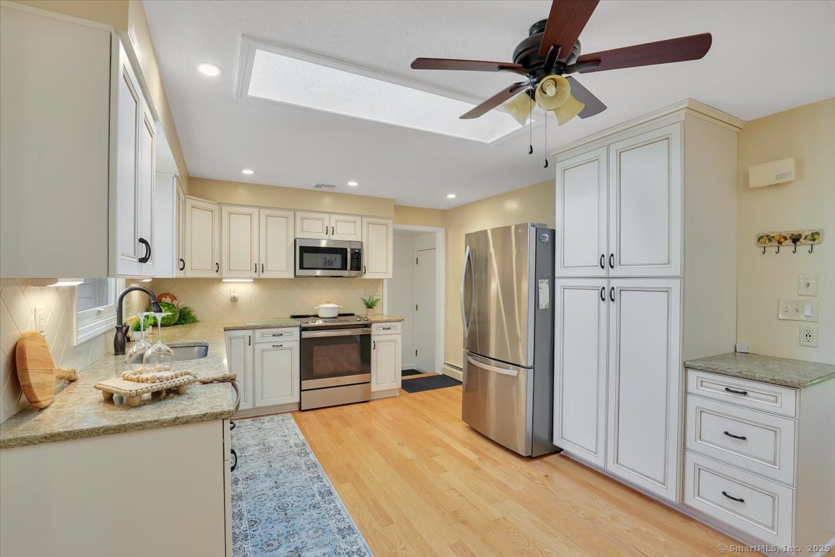Ideally located just 10 minutes from downtown Wallingford with easy access to the highways, this raised ranch pairs everyday convenience with welcoming, inviting spaces. The beautifully landscaped front lawn with its sprinkler system and walkway lead you into a home with refreshed walls and hardwood floors throughout. Listed as a 3 BR, there is a possibility of a 4th BR or let your imagination take hold when you view the back room on the main level, currently being used as an office. The recently remodeled kitchen, flooded with natural light from 2 skylights has gleaming quartz countertops, soft closed cabinets, stainless steel appliances and a generous pantry and a half. Enjoy your morning beverage of choice in the 3 season sunroom that leads out to a beautifully landscaped patio. The lower level adds 288 extra square feet, perfect for an entertainment center. Did I forget to mention the architectural metal roof? That's right, installed 12 years ago with a useful life of 50 years! And there is ample off street parking, the oversized driveway can park 6 vehicles. Book your showing now!!