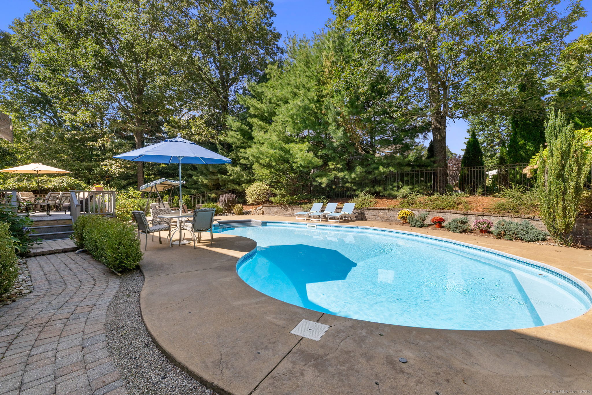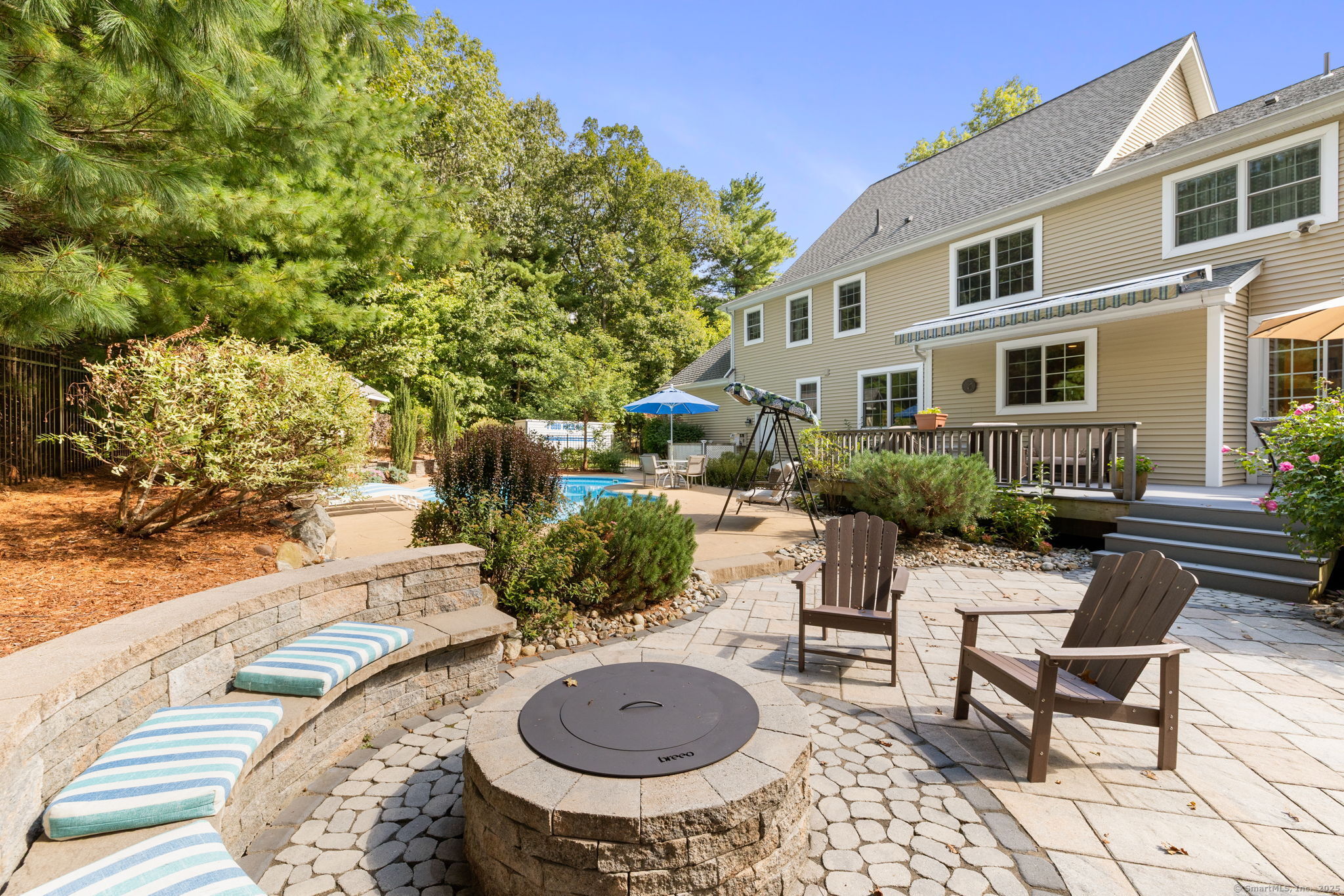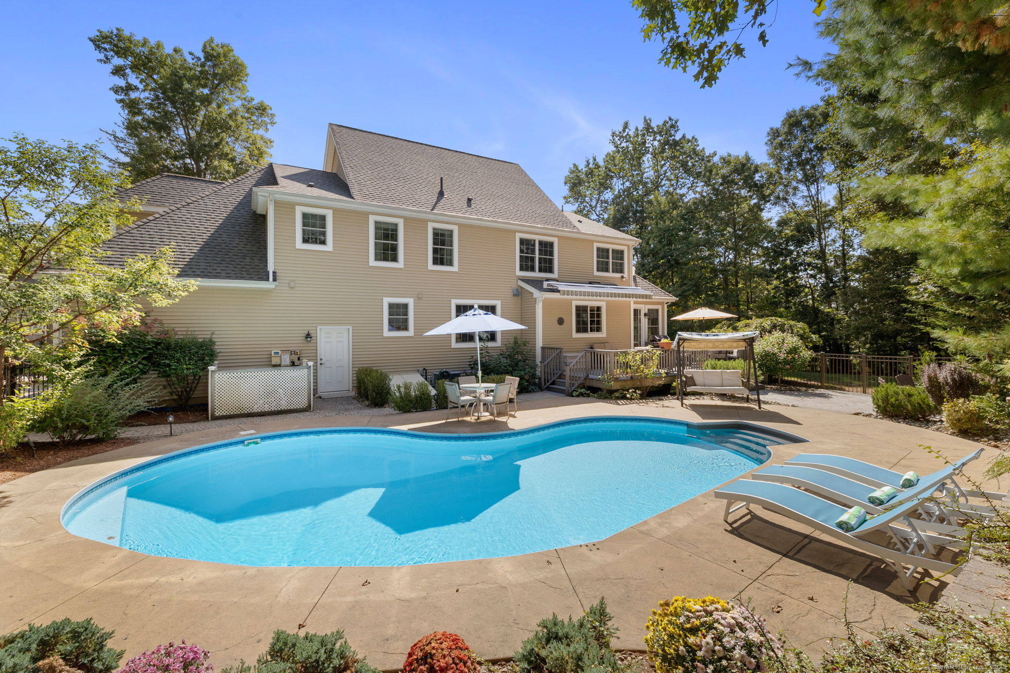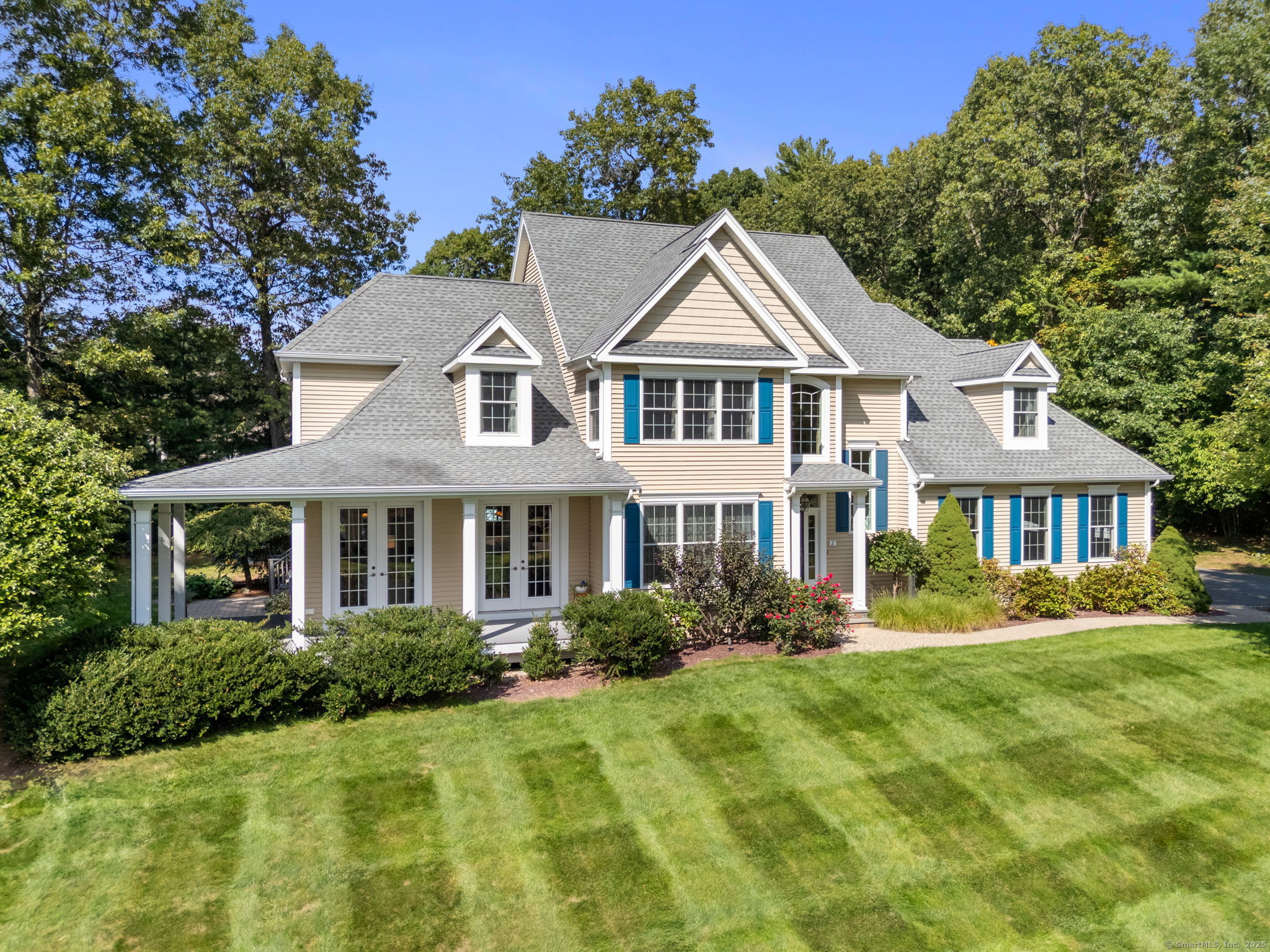 Indulge in timeless elegance, classic craftsmanship, and refined design in this distinguished Santini-built Colonial with a wrap-around porch, set on a 3-home subdivision. Built in 2009, this 3,344 sq. ft. residence showcases 4 BDRMS, 3.1 baths, with a harmonious blend of sophistication and comfort. Inside, dramatic architectural elements abound: a grand two-story foyer with a motorized chandelier, an elegant formal DR ideal for hosting, a private office framed by French doors accented with a coffered ceiling. The gourmet eat-in kitchen is a chef's dream, featuring rich cherry cabinetry, granite counters a generous center island, gas cooktop, double wall ovens and a pantry closet. A double-sided gas FP creates an inviting ambiance, seamlessly connecting the kitchen and FR. Step outside to your private resort like sanctuary, complete with an in-ground heated pool, expansive deck with a retractable awning, a stone trimmed patio with a built in firepit - perfect for entertaining or relaxing in style. The upper level is the home to the lavish primary suite offering a cozy sitting area, a spa inspired bath with a walk-in tiled shower, soaking tub, dual sink vanity and a w/in closet. A 2nd ensuite BDRM with its own w/in closet and f/bath provides an additional retreat while 2 bedrooms share a well-appointed Jack & Jill bath. Nestled within walking distance to Windermere Elementary School and Ellington Ridge Country Club, this exceptional home can be yours, don't delay!