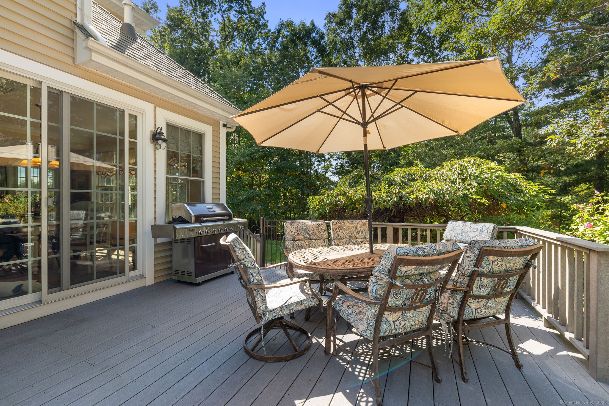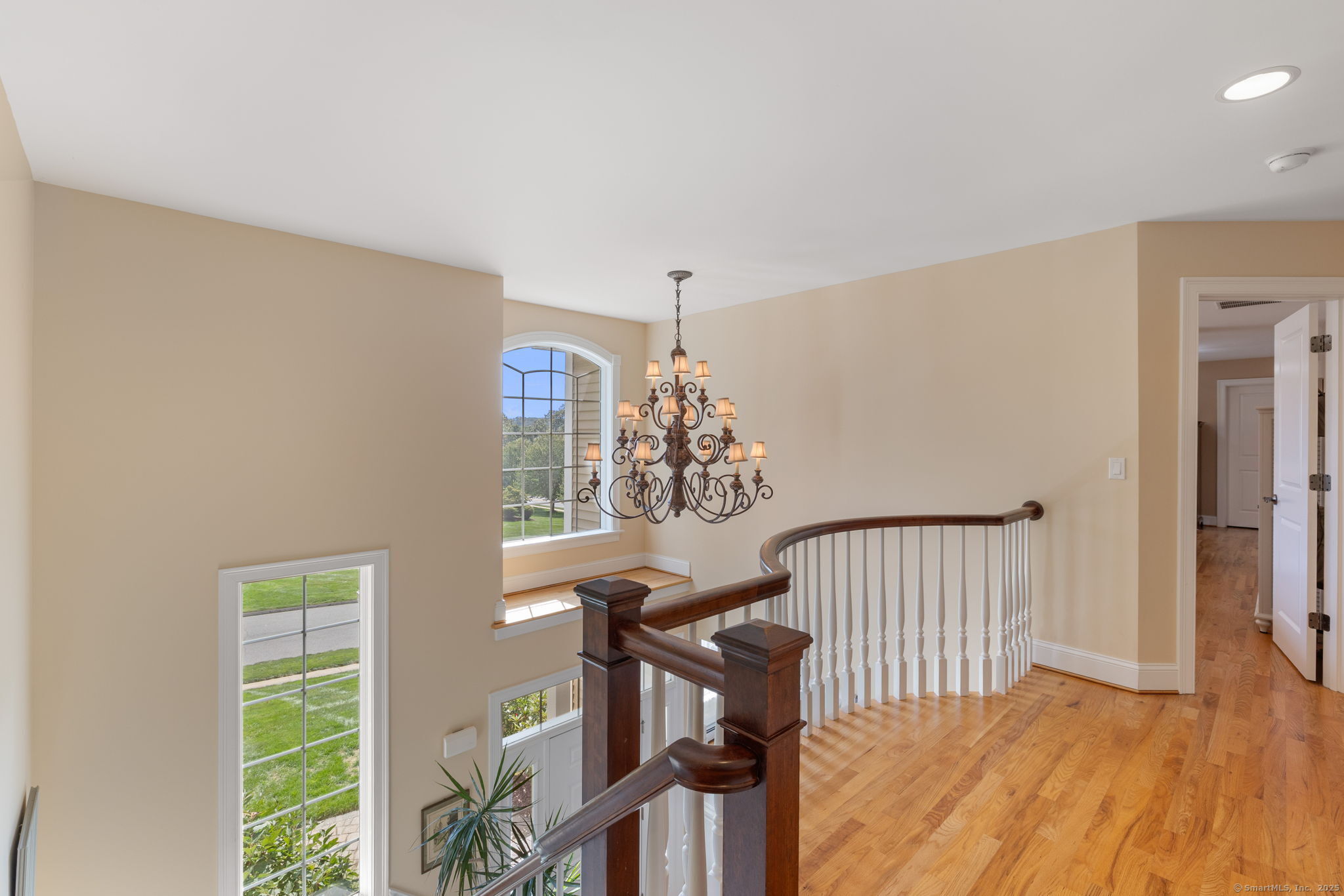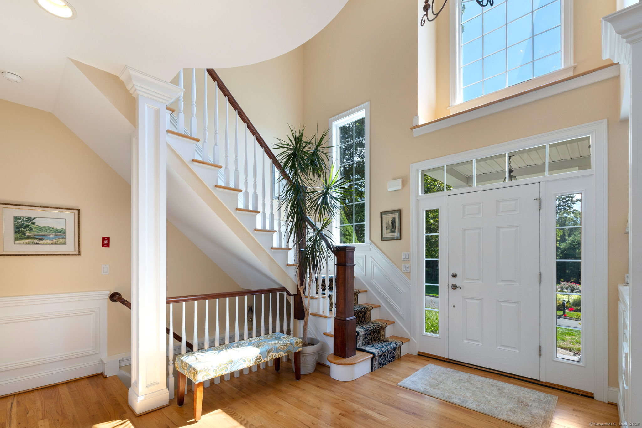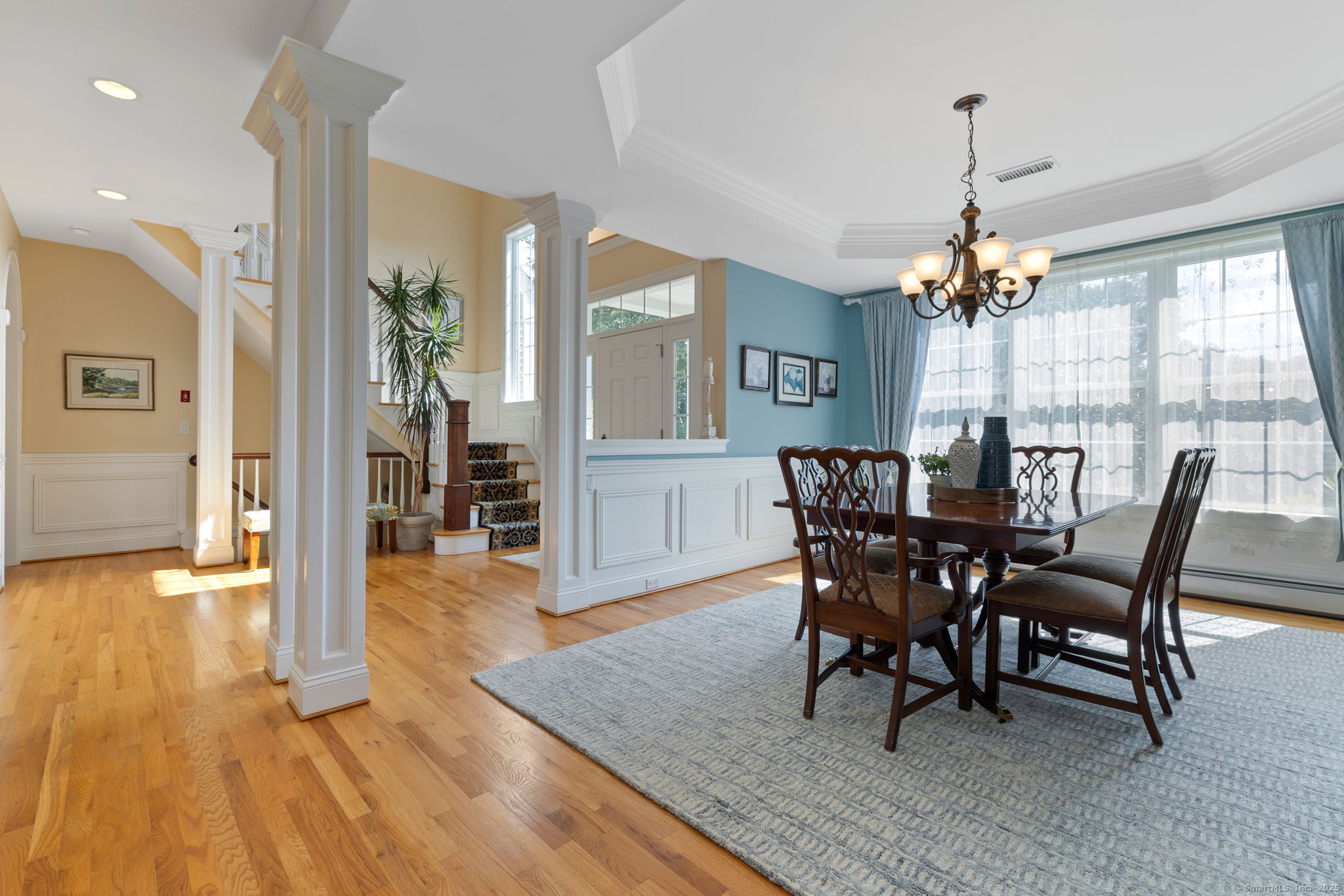 Indulge in timeless elegance, classic craftsmanship, and refined design in this distinguished Santini-built Colonial with a wrap-around porch, set on a 3-home subdivision. Built in 2009, this 3,344 sq. ft. residence showcases 4 BDRMS, 3.1 baths, with a harmonious blend of sophistication and comfort. Inside, dramatic architectural elements abound: a grand two-story foyer with a motorized chandelier, an elegant formal DR ideal for hosting, a private office framed by French doors accented with a coffered ceiling. The gourmet eat-in kitchen is a chef's dream, featuring rich cherry cabinetry, granite counters a generous center island, gas cooktop, double wall ovens and a pantry closet. A double-sided gas FP creates an inviting ambiance, seamlessly connecting the kitchen and FR. Step outside to your private resort like sanctuary, complete with an in-ground heated pool, expansive deck with a retractable awning, a stone trimmed patio with a built in firepit - perfect for entertaining or relaxing in style. The upper level is the home to the lavish primary suite offering a cozy sitting area, a spa inspired bath with a walk-in tiled shower, soaking tub, dual sink vanity and a w/in closet. A 2nd ensuite BDRM with its own w/in closet and f/bath provides an additional retreat while 2 bedrooms share a well-appointed Jack & Jill bath. Nestled within walking distance to Windermere Elementary School and Ellington Ridge Country Club, this exceptional home can be yours, don't delay!
