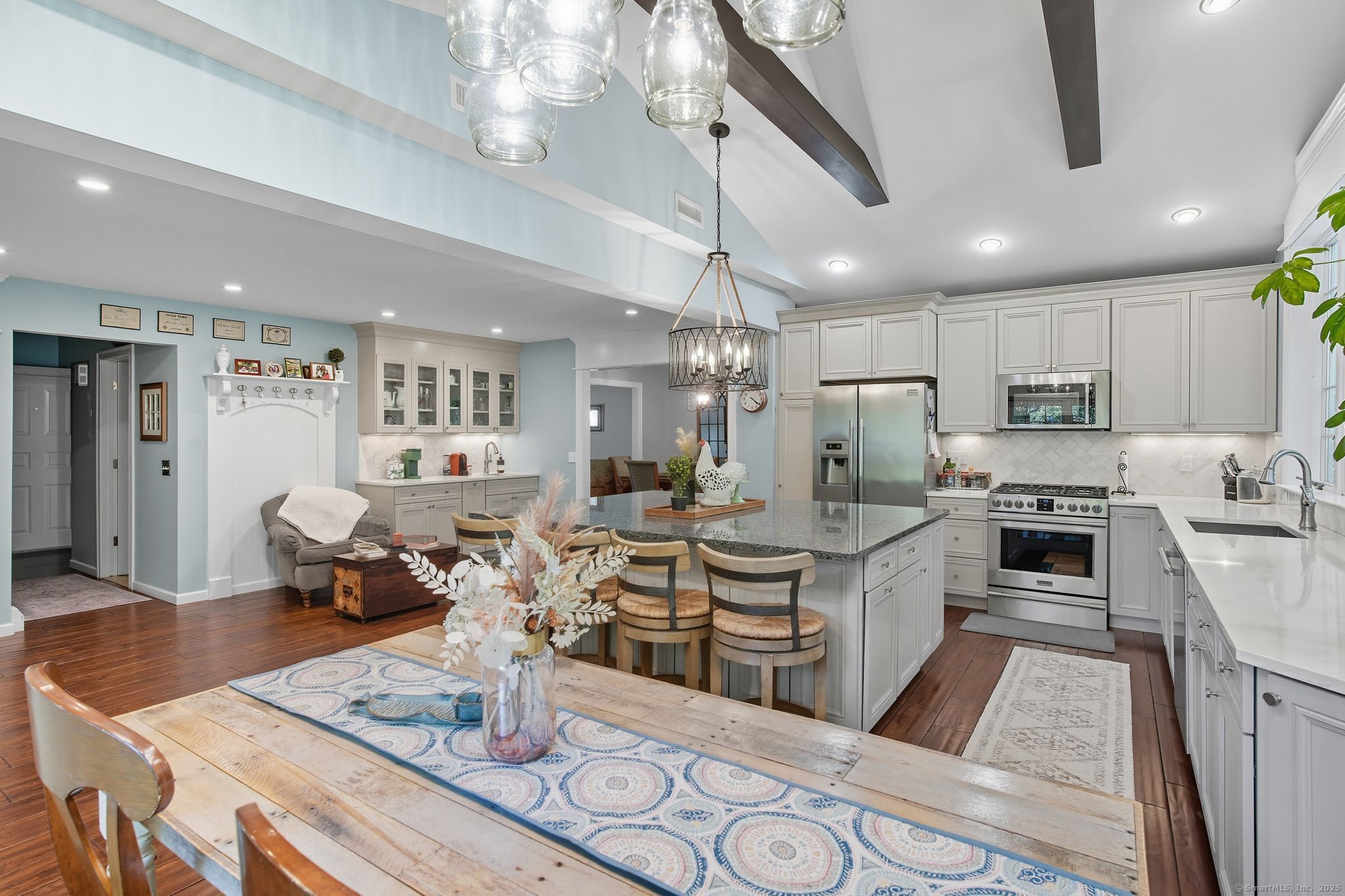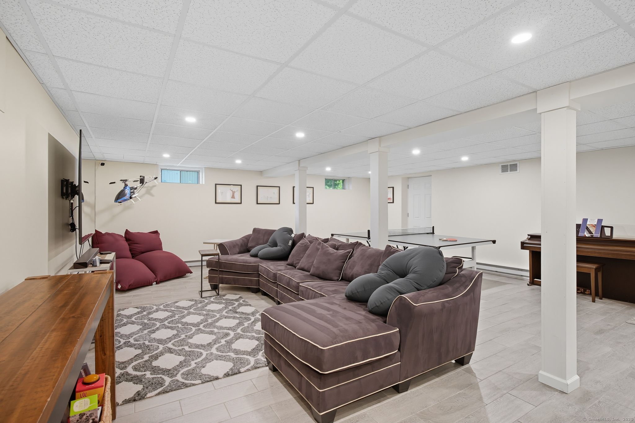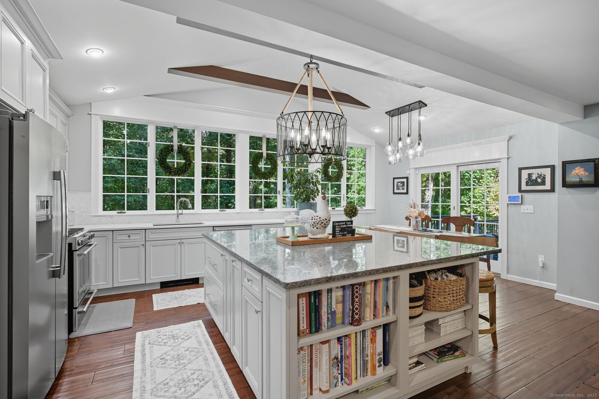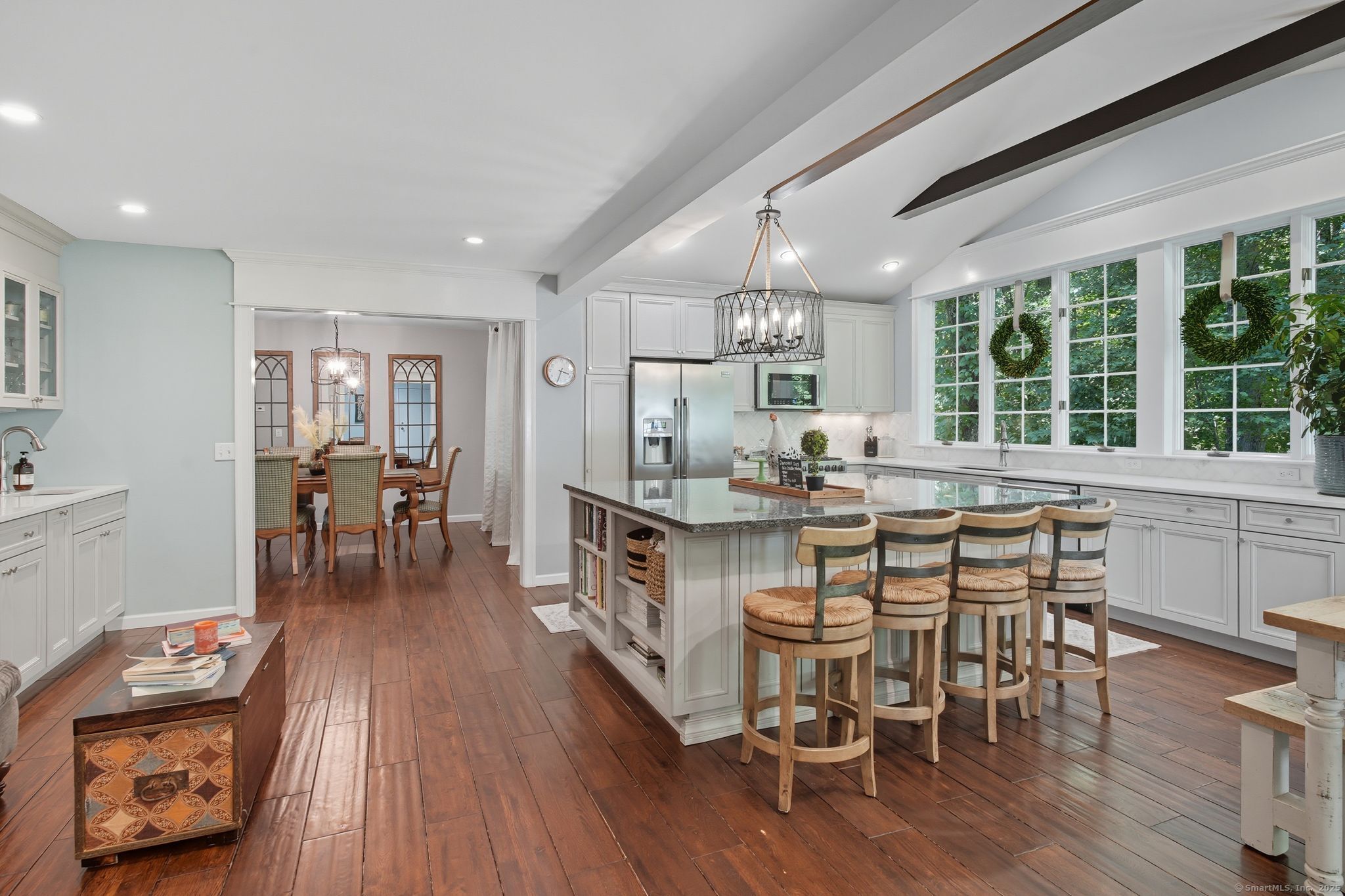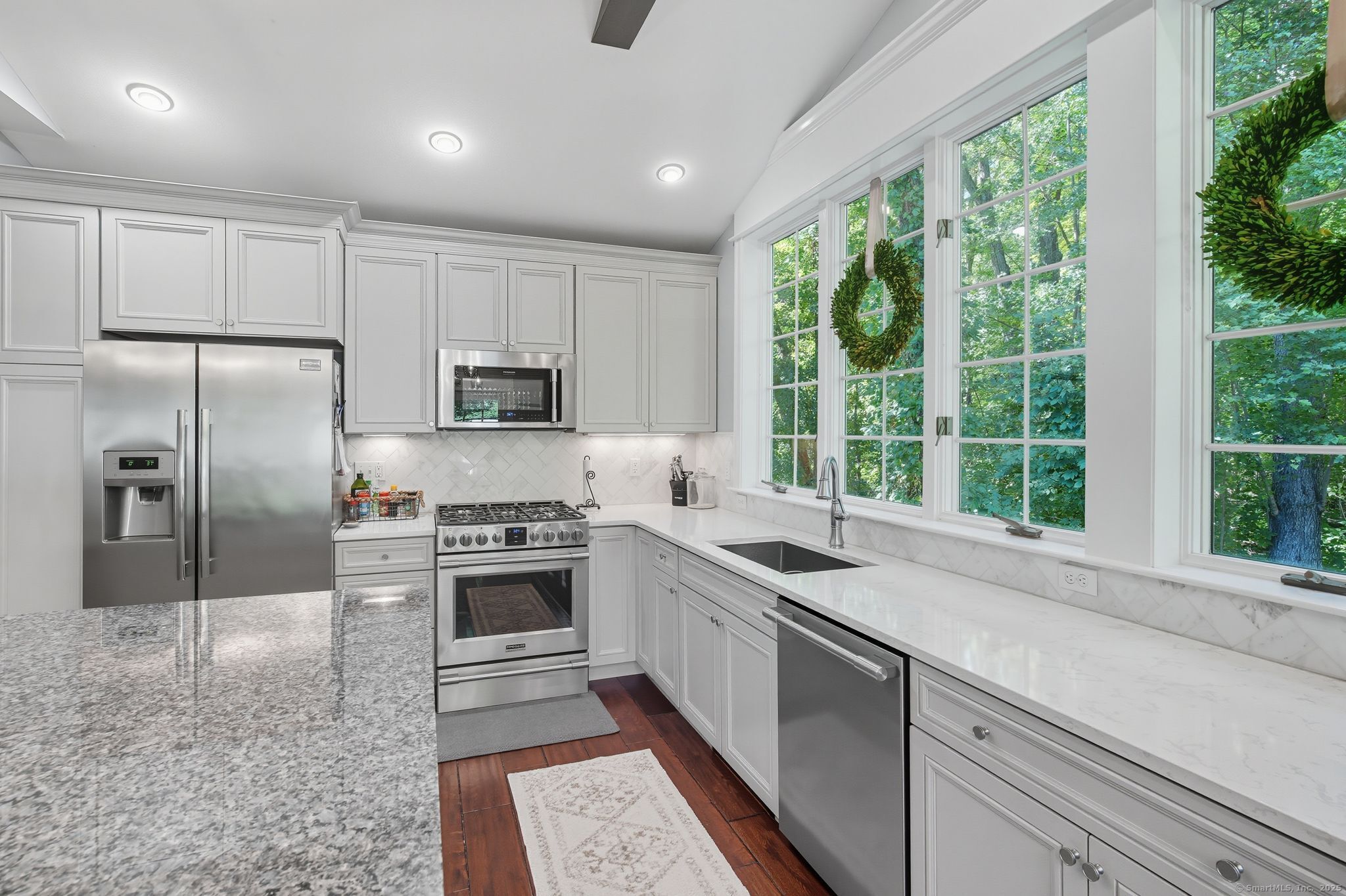 This stunning 10-room Colonial offers 2,500+ sq. ft. of living plus 1,000+ sq. ft. of finished lower level (2022 APO). Featuring 4 generously sized bedrooms and 2.5 stylish baths, it blends classic elegance with modern convenience for today's lifestyle. The first floor features a warm and welcoming flow filled with natural light. Enjoy the charming living room, formal dining room, and front-to-back family room anchored by a handsome brick fireplace. The show-stopping kitchen addition is a true centerpiece, boasting vaulted ceilings with wood beams, a grand center island, gleaming granite counters, stainless appliances, and a sun-drenched wall of windows overlooking the private backyard. A chic half bath and first of two laundries complete this level. Upstairs, the tranquil primary suite offers a renovated spa-like bath and custom closet system, plus 3 additional airy bedrooms. The expansive finished lower level includes a wet bar, recreation/playroom, fitness area, cozy sauna alcove, and second laundry with set tub. Highlights: hardwood floors, tastefully updated baths, fresh designer paint, landscaping. Outdoor living shines with a spacious deck and peaceful backyard backing to conservation land. Updates: roof (2015 APO), AC condenser (2023 APO), vinyl siding/windows (2014 APO), and new shed (2023 APO). Beautifully maintained and thoughtfully upgraded, this exceptional Colonial blends sophistication, comfort, and convenience in a highly desirable neighborhood.