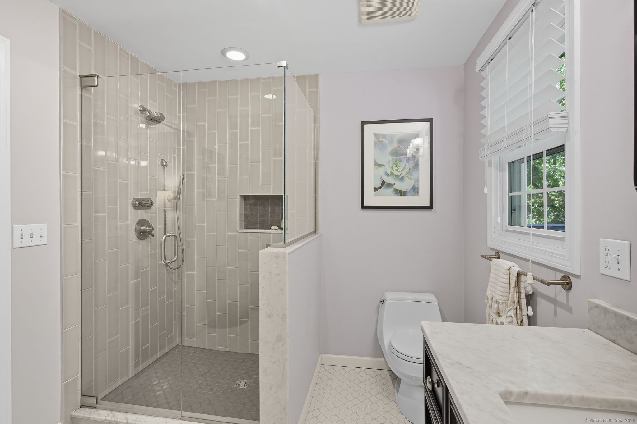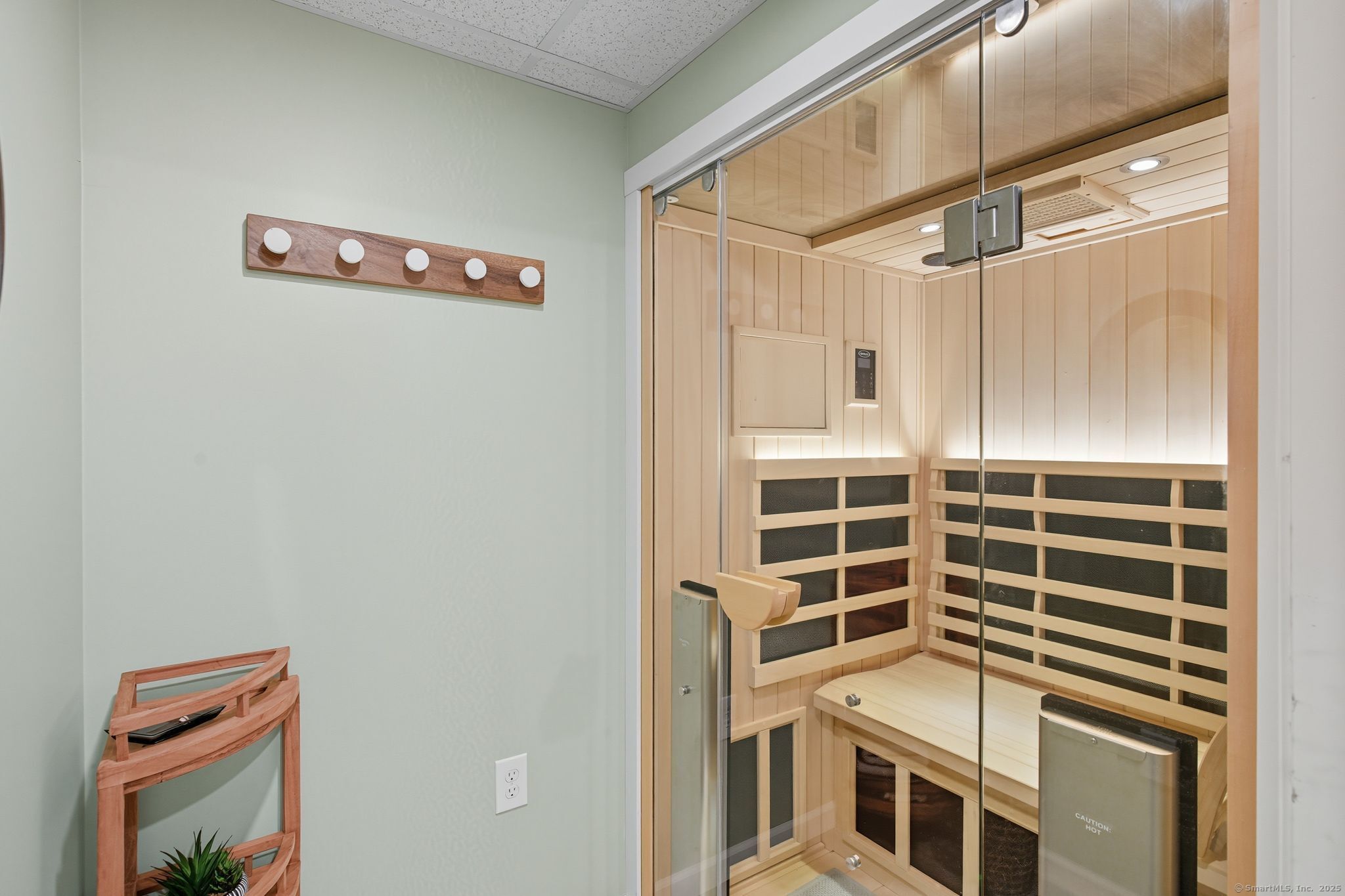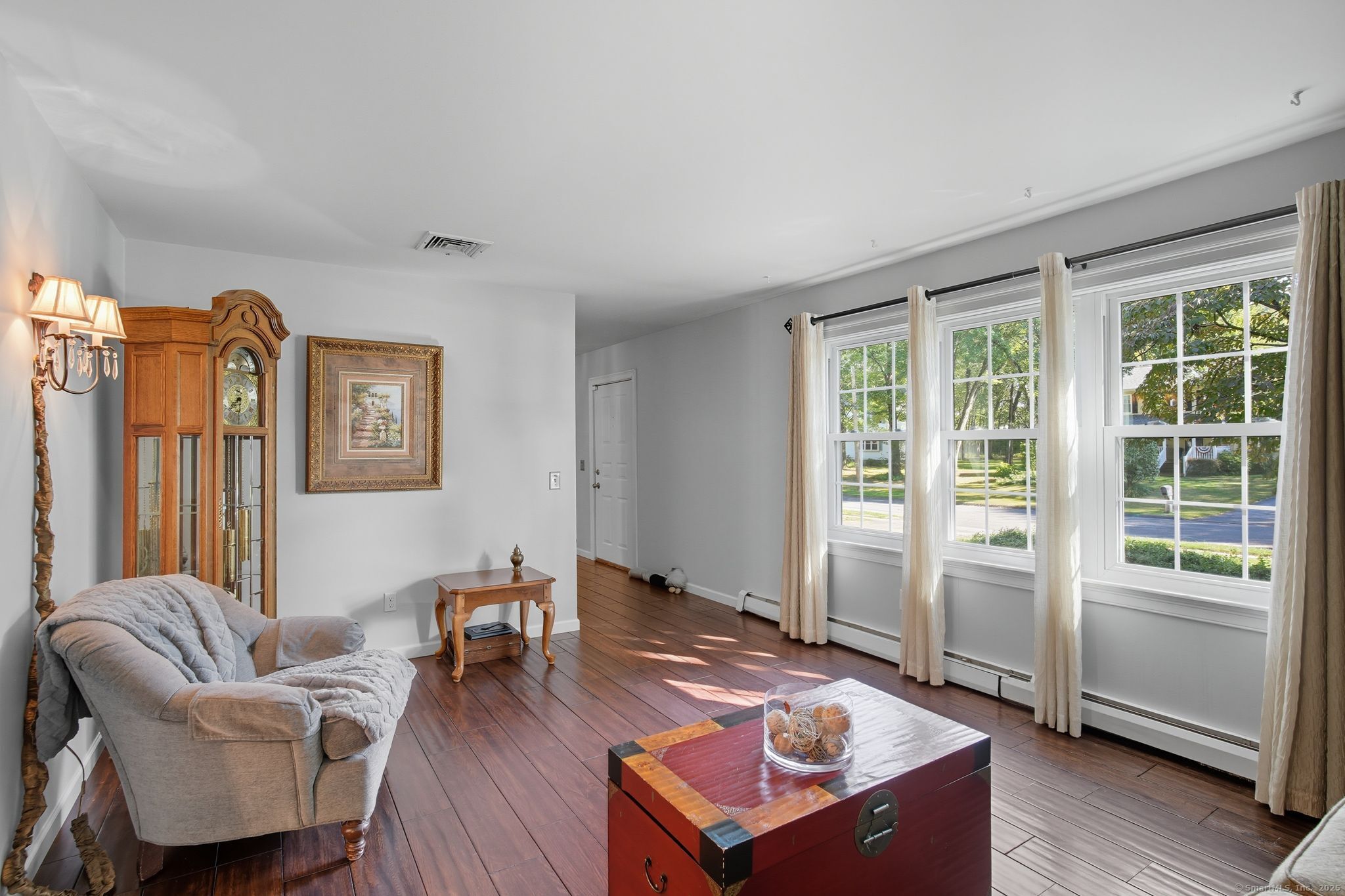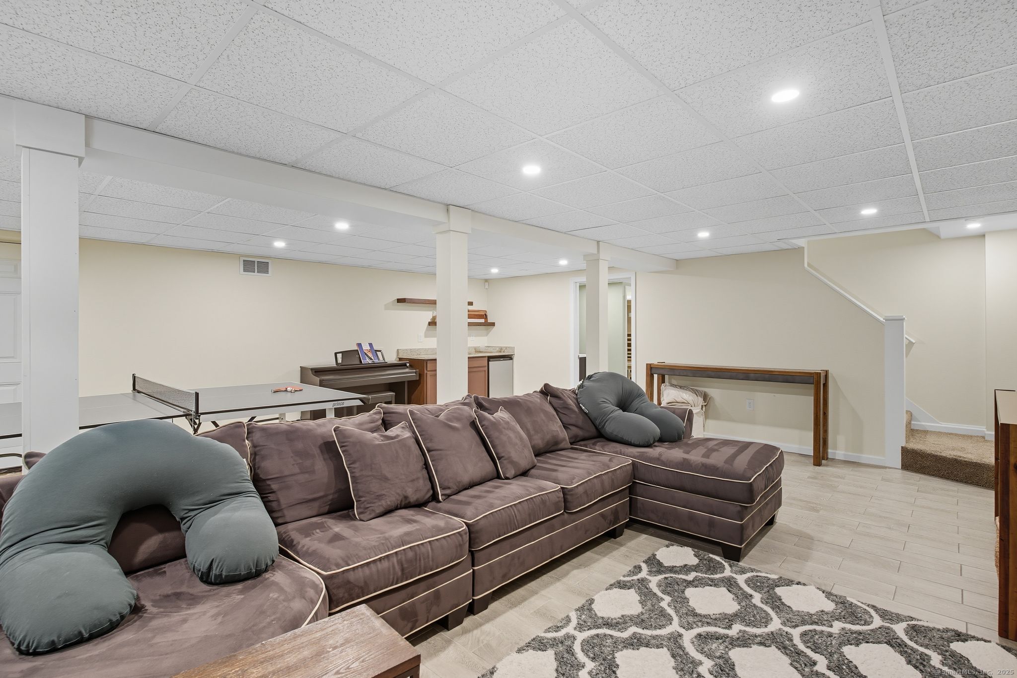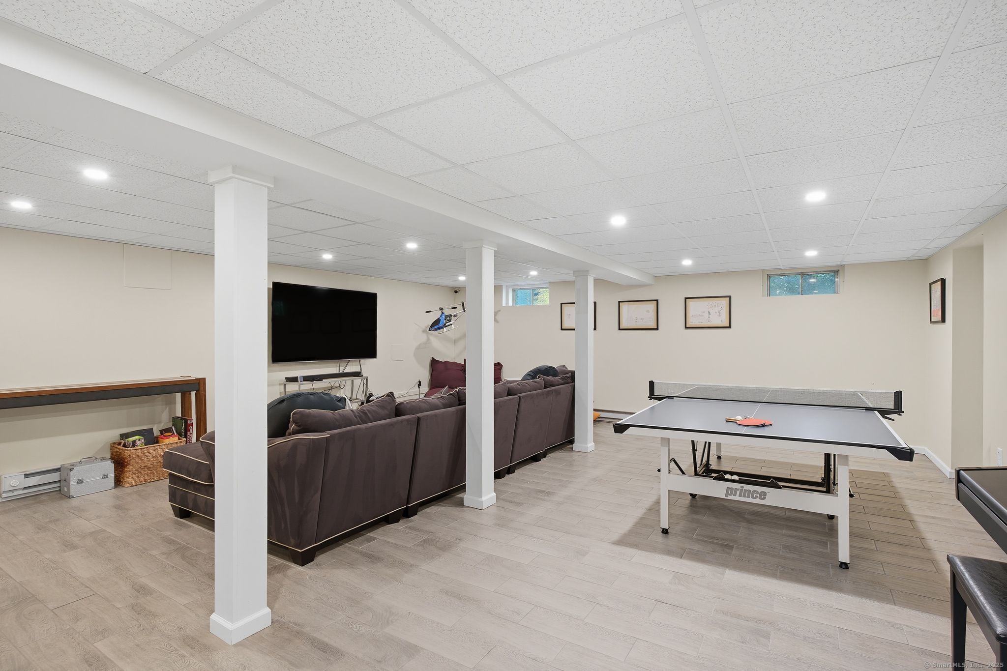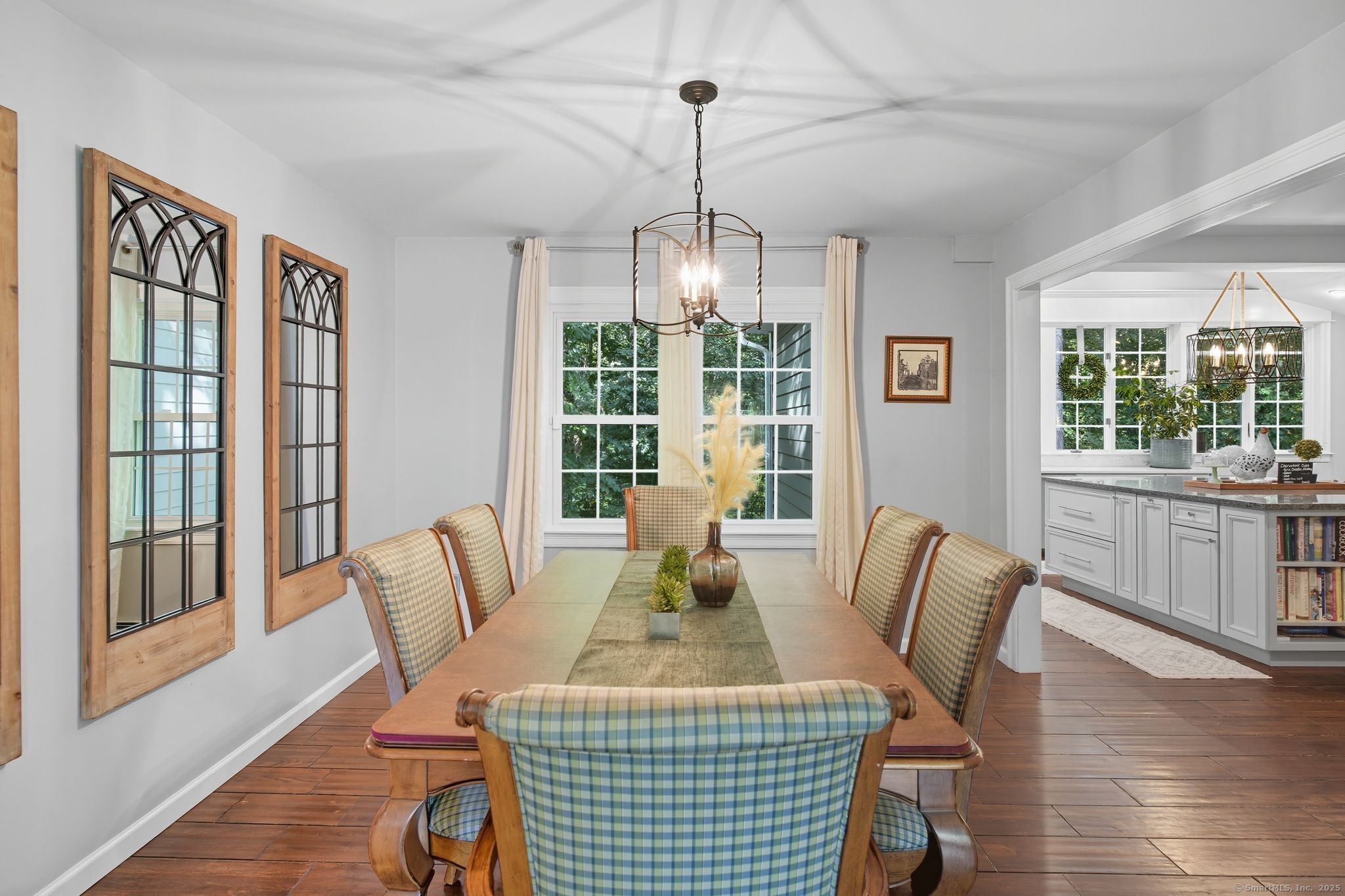 This stunning 10-room Colonial offers 2,500+ sq. ft. of living plus 1,000+ sq. ft. of finished lower level (2022 APO). Featuring 4 generously sized bedrooms and 2.5 stylish baths, it blends classic elegance with modern convenience for today's lifestyle. The first floor features a warm and welcoming flow filled with natural light. Enjoy the charming living room, formal dining room, and front-to-back family room anchored by a handsome brick fireplace. The show-stopping kitchen addition is a true centerpiece, boasting vaulted ceilings with wood beams, a grand center island, gleaming granite counters, stainless appliances, and a sun-drenched wall of windows overlooking the private backyard. A chic half bath and first of two laundries complete this level. Upstairs, the tranquil primary suite offers a renovated spa-like bath and custom closet system, plus 3 additional airy bedrooms. The expansive finished lower level includes a wet bar, recreation/playroom, fitness area, cozy sauna alcove, and second laundry with set tub. Highlights: hardwood floors, tastefully updated baths, fresh designer paint, landscaping. Outdoor living shines with a spacious deck and peaceful backyard backing to conservation land. Updates: roof (2015 APO), AC condenser (2023 APO), vinyl siding/windows (2014 APO), and new shed (2023 APO). Beautifully maintained and thoughtfully upgraded, this exceptional Colonial blends sophistication, comfort, and convenience in a highly desirable neighborhood.