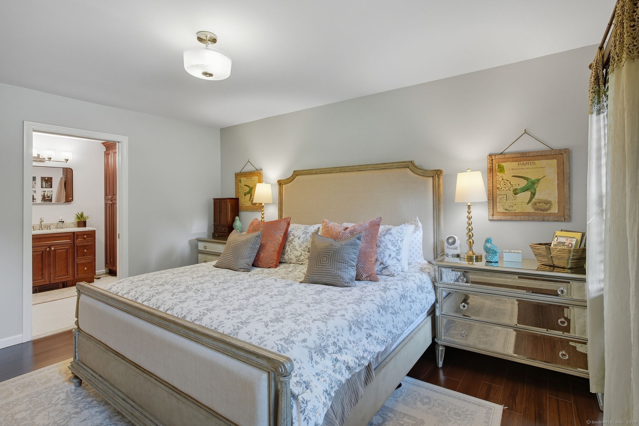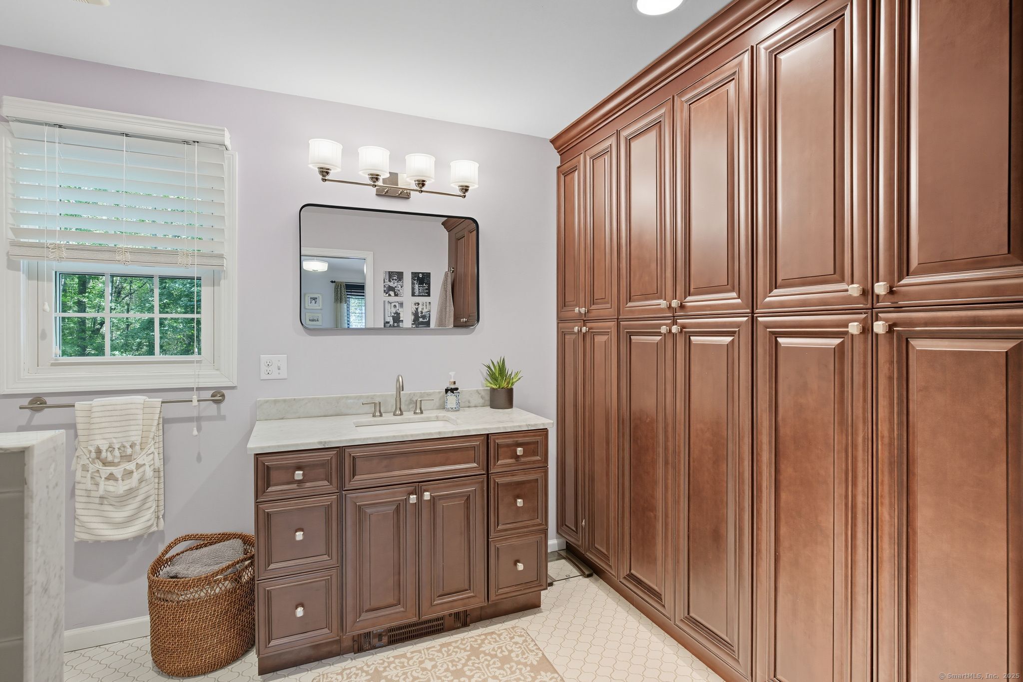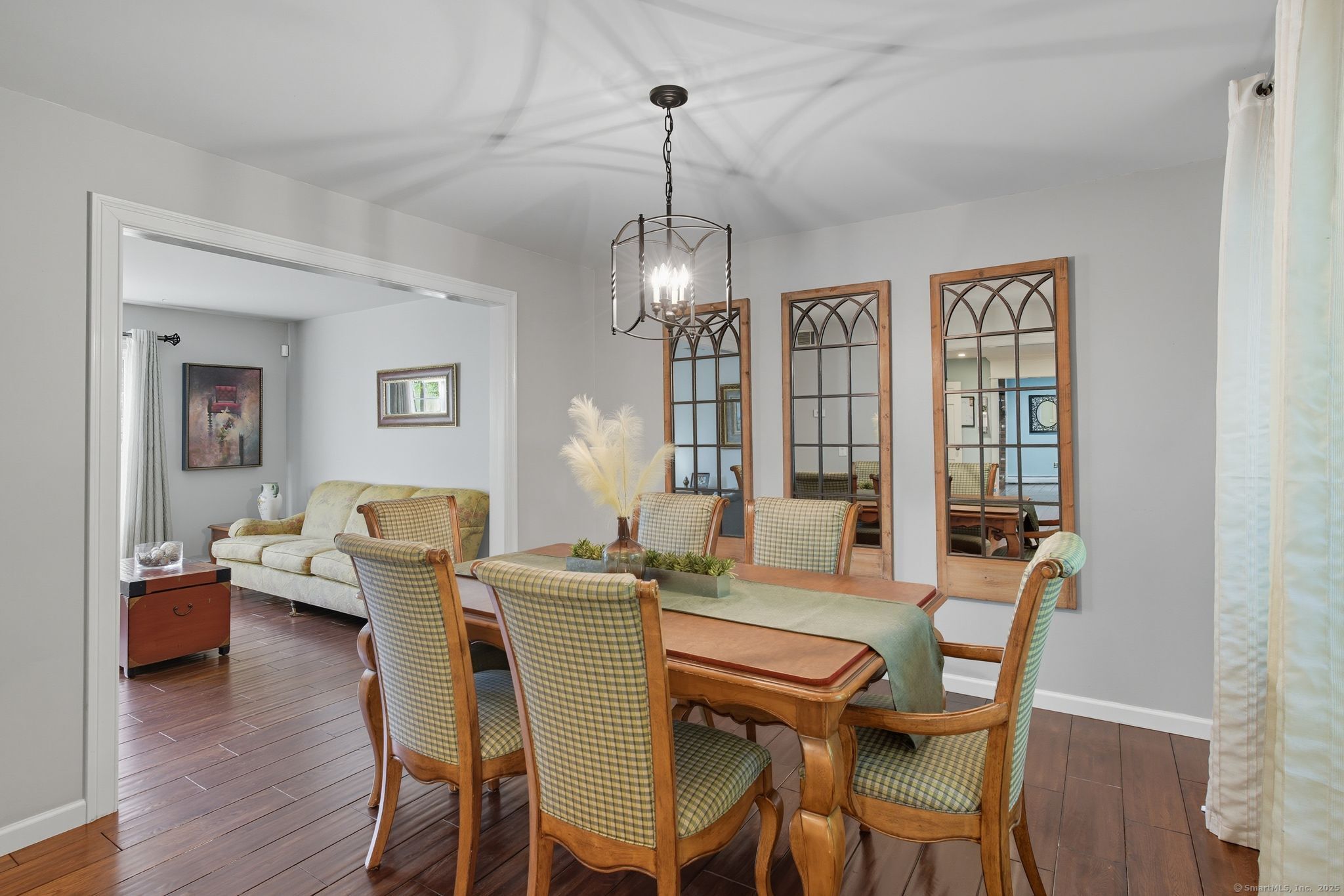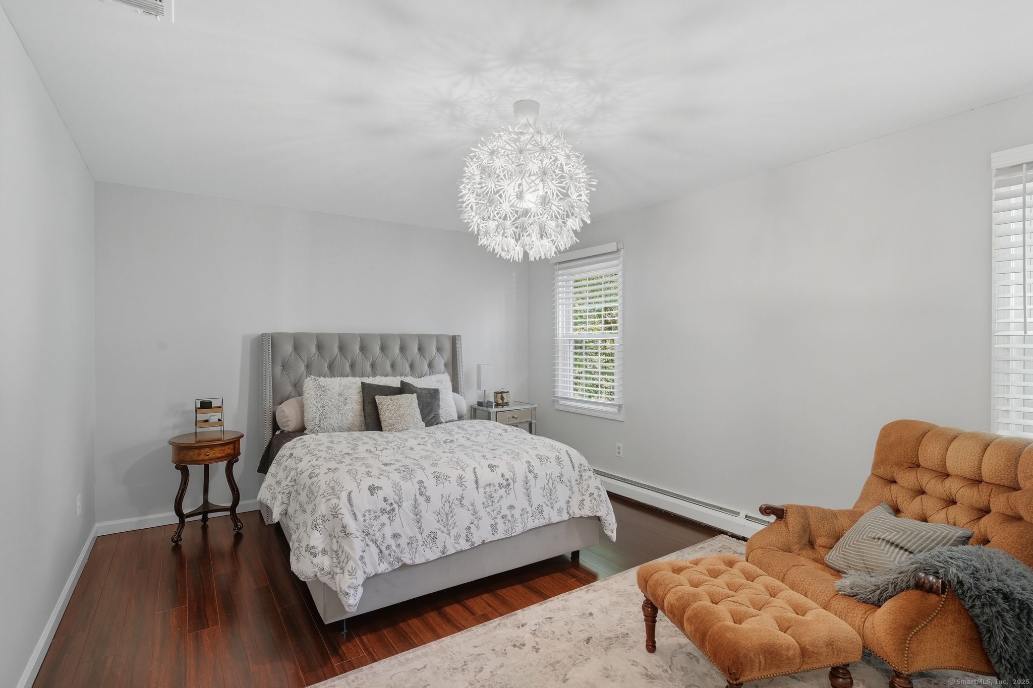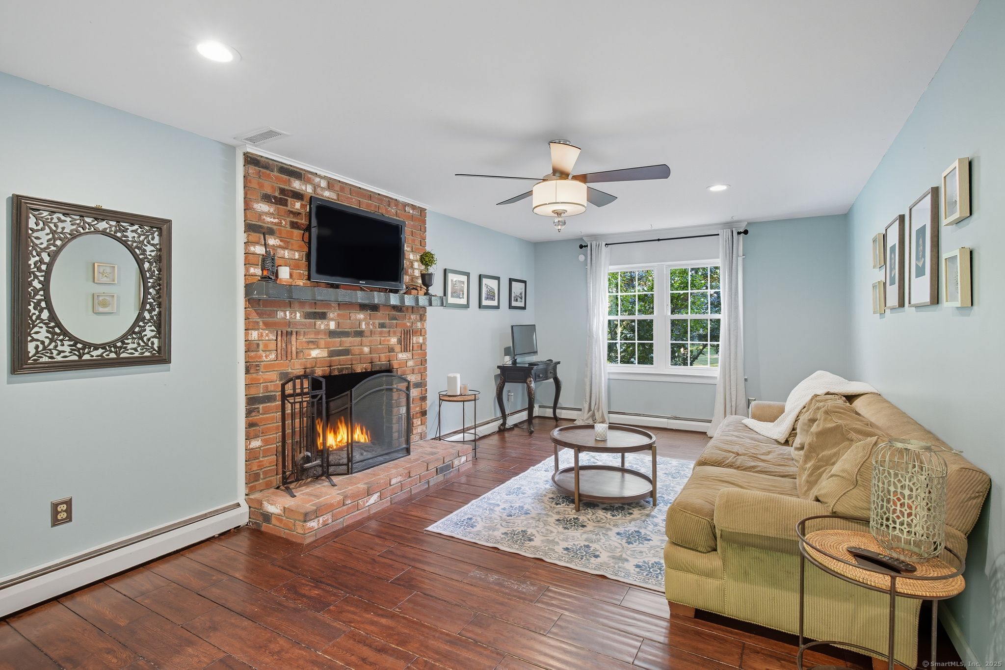 This stunning 10-room Colonial offers 2,500+ sq. ft. of living plus 1,000+ sq. ft. of finished lower level (2022 APO). Featuring 4 generously sized bedrooms and 2.5 stylish baths, it blends classic elegance with modern convenience for today's lifestyle. The first floor features a warm and welcoming flow filled with natural light. Enjoy the charming living room, formal dining room, and front-to-back family room anchored by a handsome brick fireplace. The show-stopping kitchen addition is a true centerpiece, boasting vaulted ceilings with wood beams, a grand center island, gleaming granite counters, stainless appliances, and a sun-drenched wall of windows overlooking the private backyard. A chic half bath and first of two laundries complete this level. Upstairs, the tranquil primary suite offers a renovated spa-like bath and custom closet system, plus 3 additional airy bedrooms. The expansive finished lower level includes a wet bar, recreation/playroom, fitness area, cozy sauna alcove, and second laundry with set tub. Highlights: hardwood floors, tastefully updated baths, fresh designer paint, landscaping. Outdoor living shines with a spacious deck and peaceful backyard backing to conservation land. Updates: roof (2015 APO), AC condenser (2023 APO), vinyl siding/windows (2014 APO), and new shed (2023 APO). Beautifully maintained and thoughtfully upgraded, this exceptional Colonial blends sophistication, comfort, and convenience in a highly desirable neighborhood.