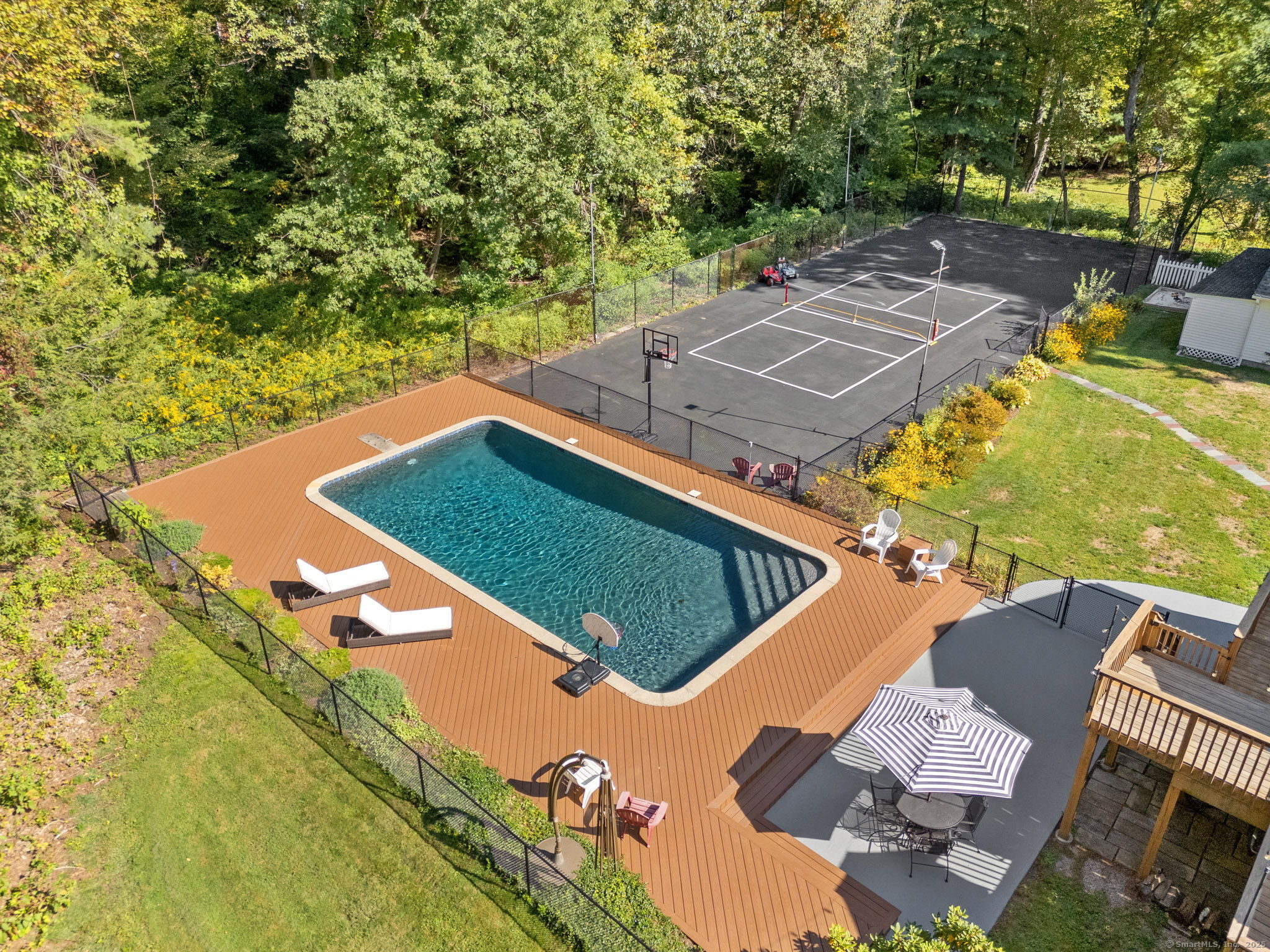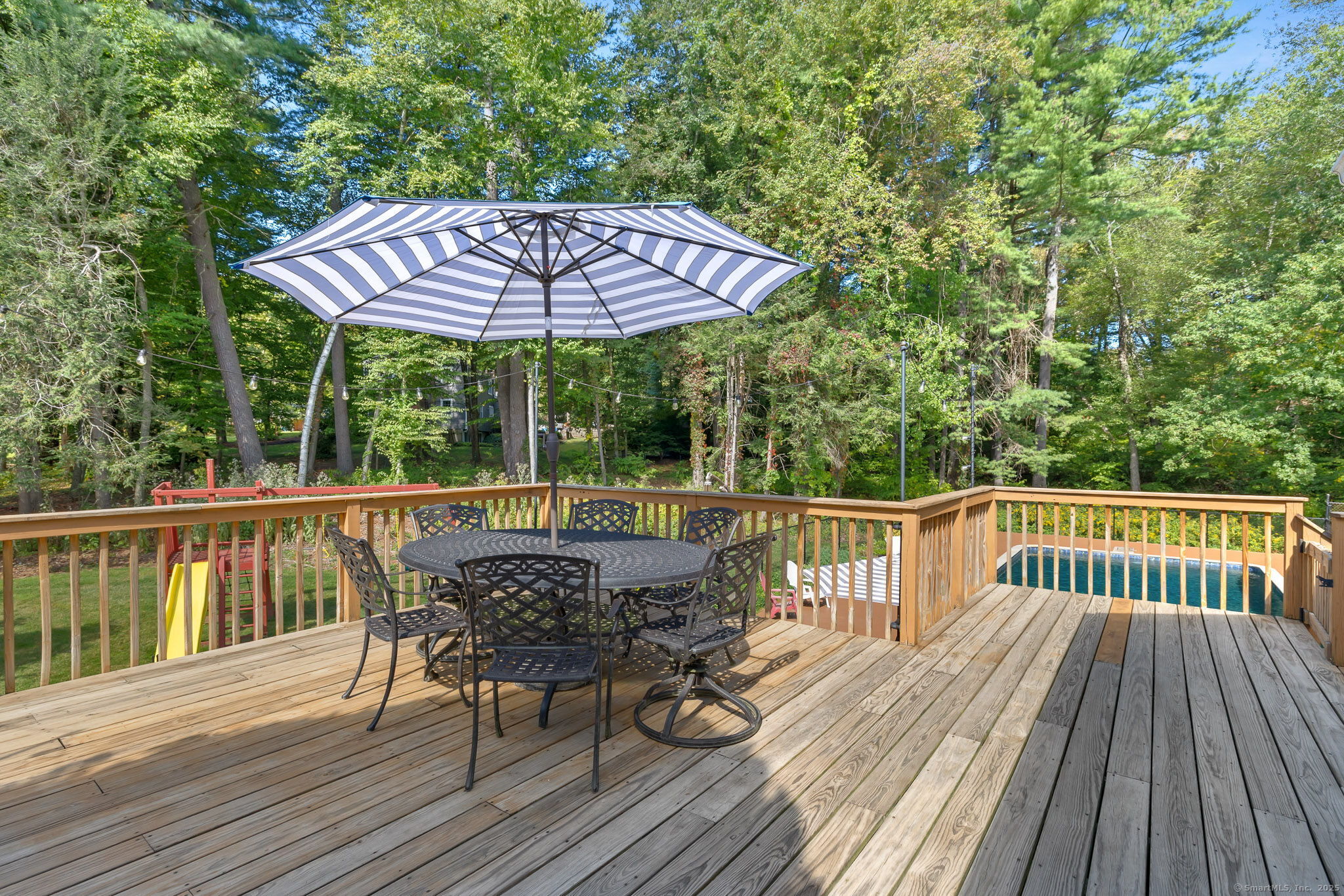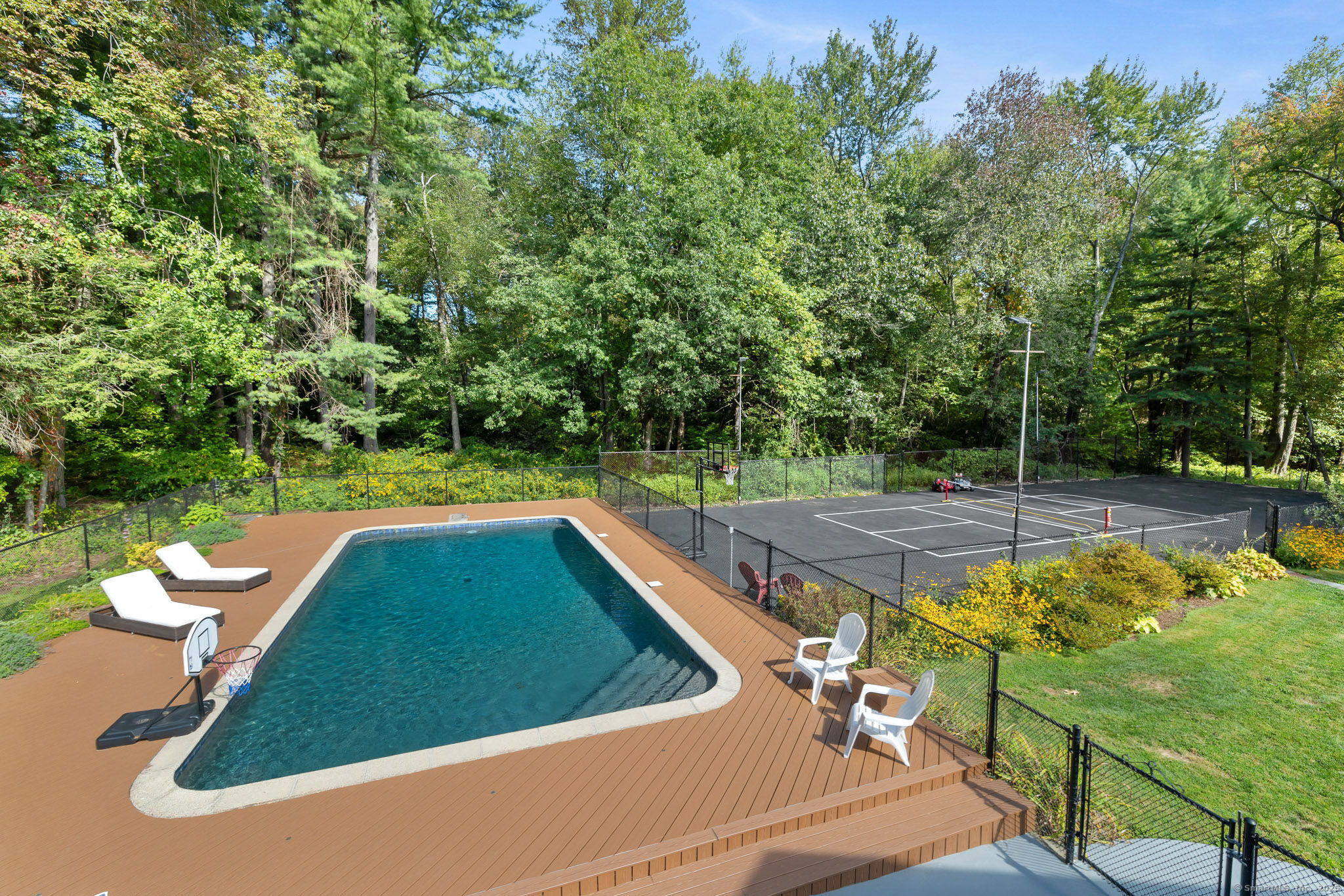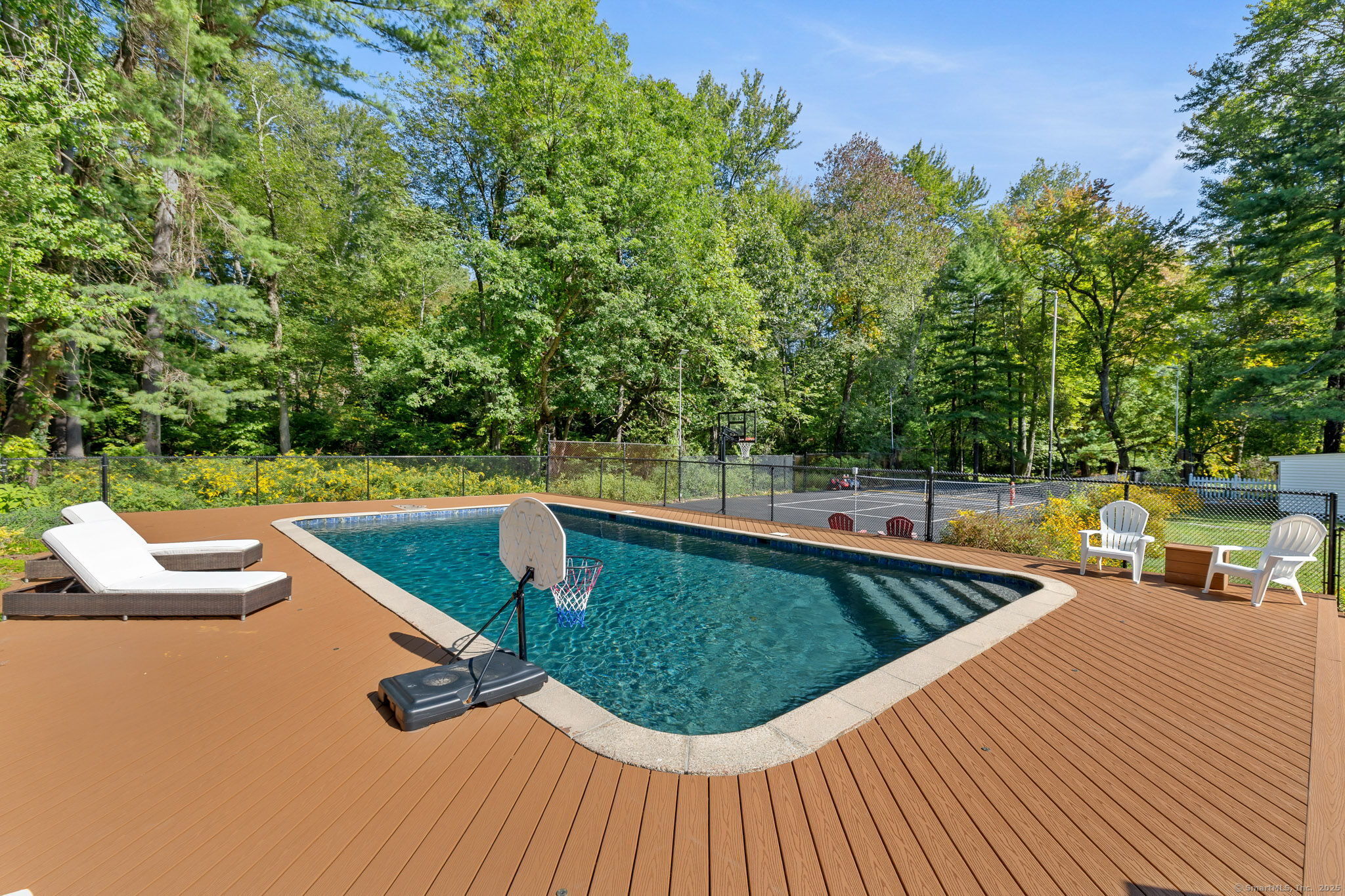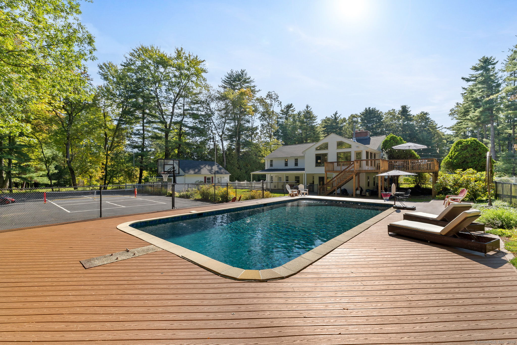 Live every day like you're on vacation in this stunning 3BR/3BA home with over 3,200 sq.ft. of beautifully updated living space! The gourmet kitchen features granite counters and stainless appliances, opening to a sun-drenched vaulted sunroom with natural gas hearth and gorgeous year-round views. Enjoy indoor/outdoor living with an expansive deck presiding over your private retreat.The open living/dining area includes a dual-sided gas fireplace. The main level also offers a serene primary suite with en-suite bath, two guest bedrooms, generous full bath, laundry room, and new bamboo flooring throughout. The walkout lower level is perfect for entertaining or an in-law suite-featuring a large rec room, gas stove, wet bar, fireplace, remodeled full bath, office/4th BR, den, cedar closet, and indoor Jacuzzi spa! Outside, unwind in your resort-like backyard with a heated saltwater pool, 2,500 sq.ft. of new composite decking, and tennis/pickleball court with brand new lighting. All set in a scenic neighborhood near UConn, highways, shopping & dining. A true staycation dream!