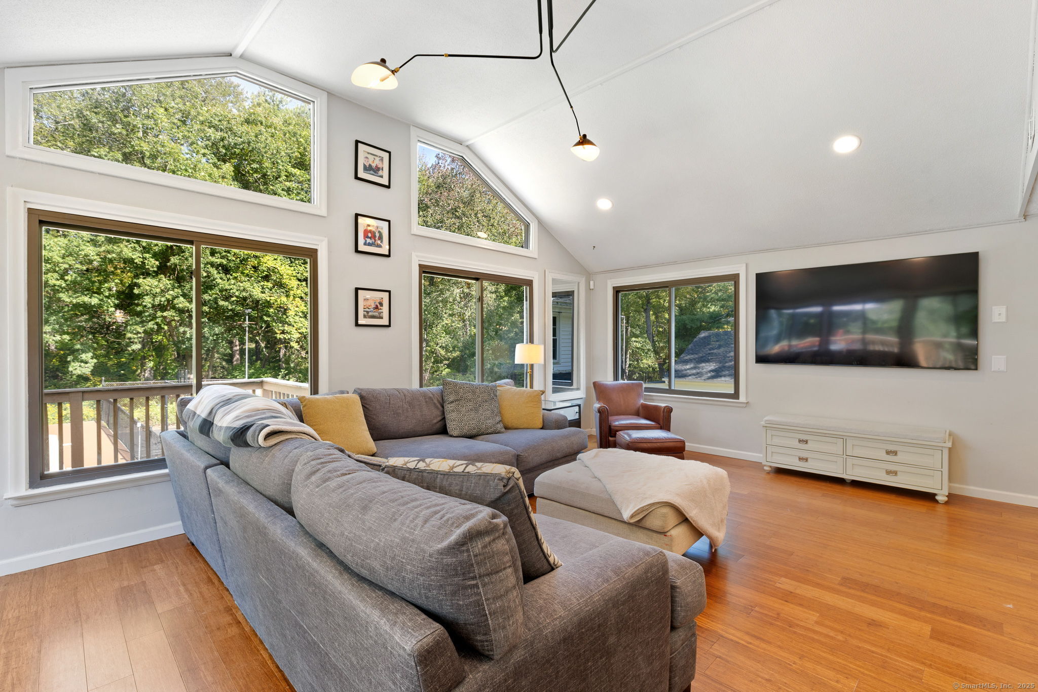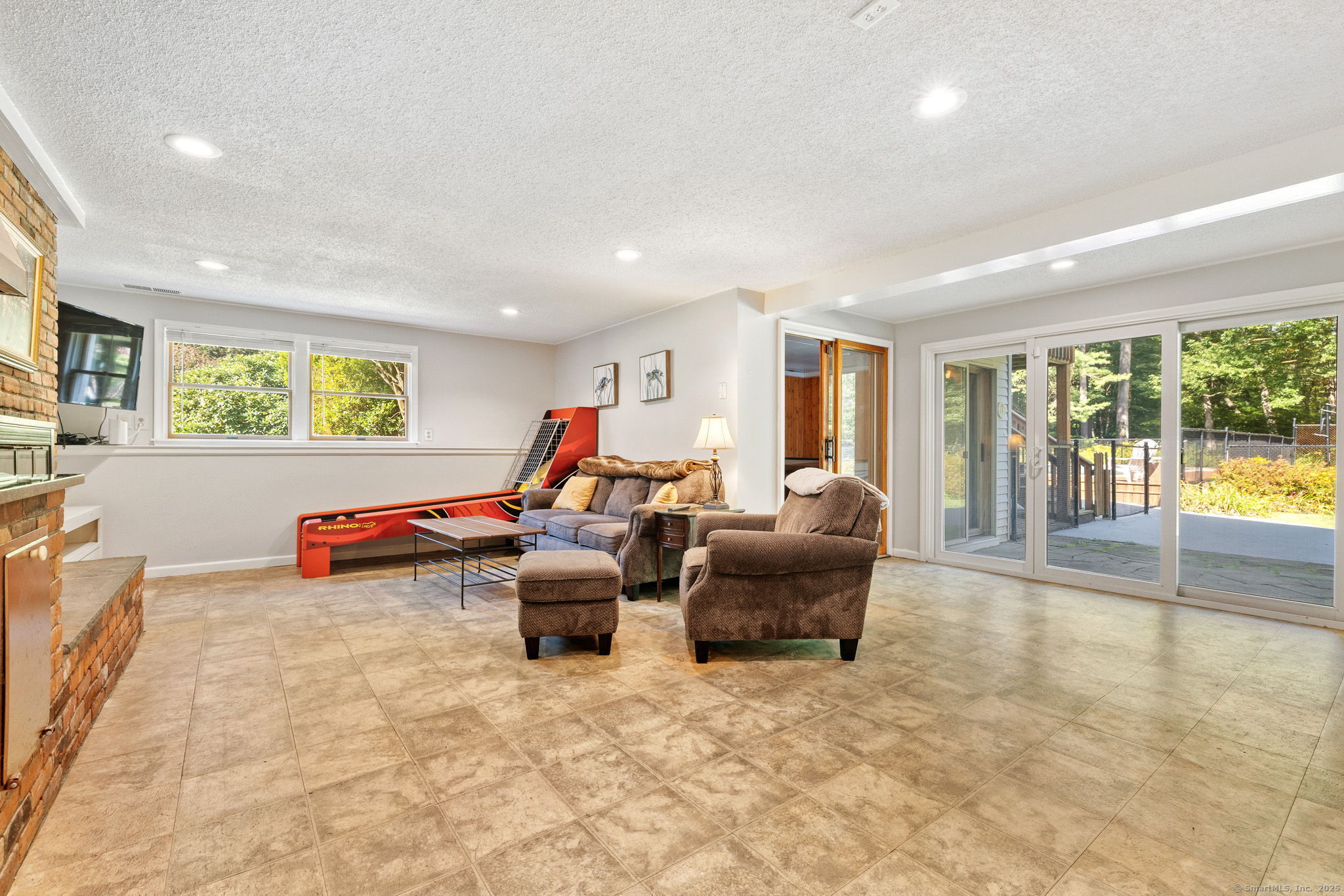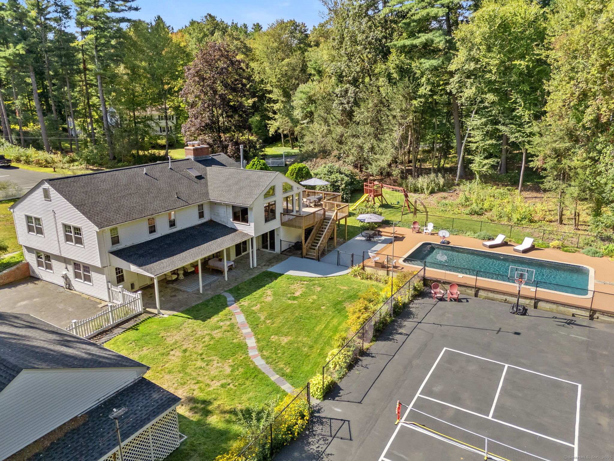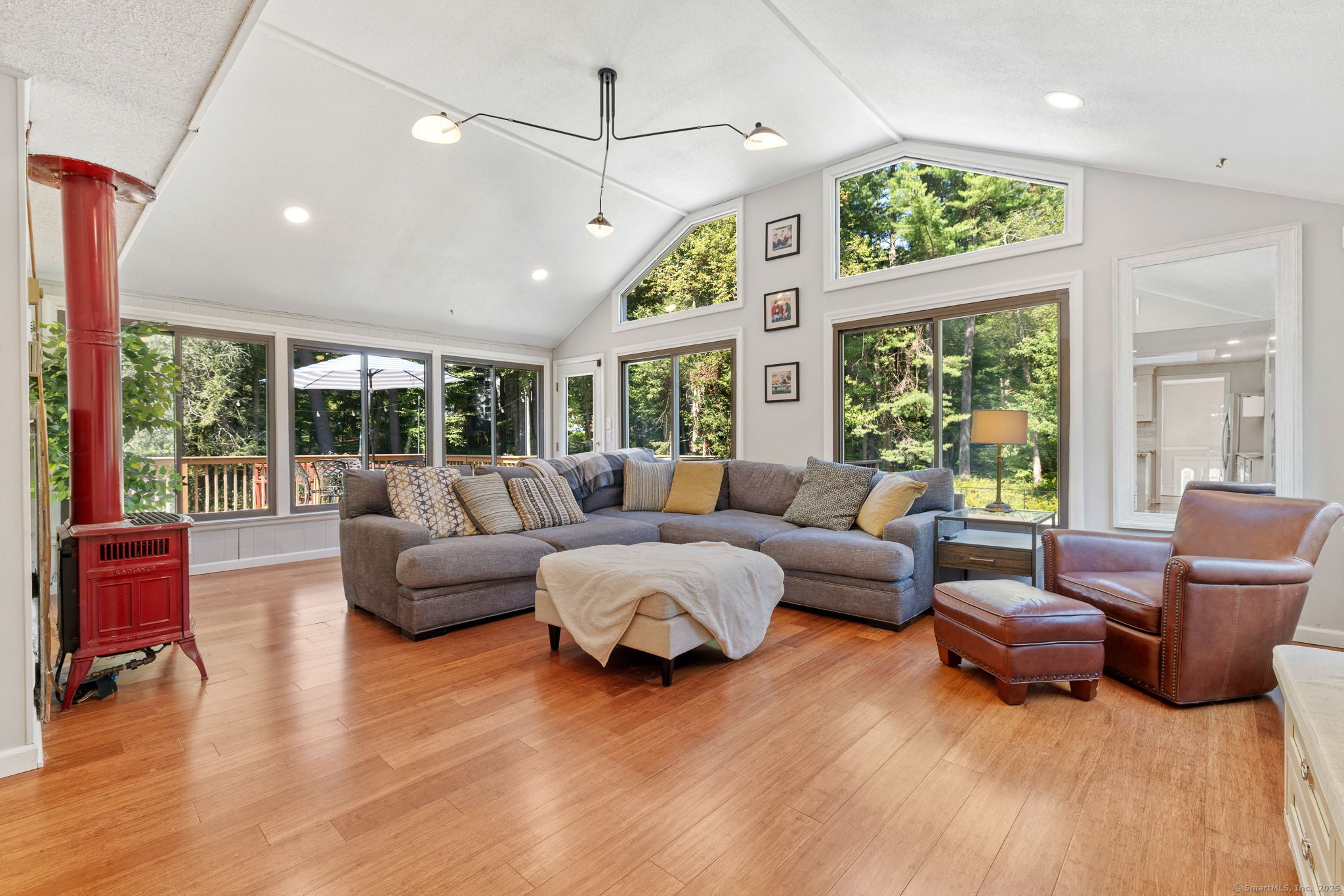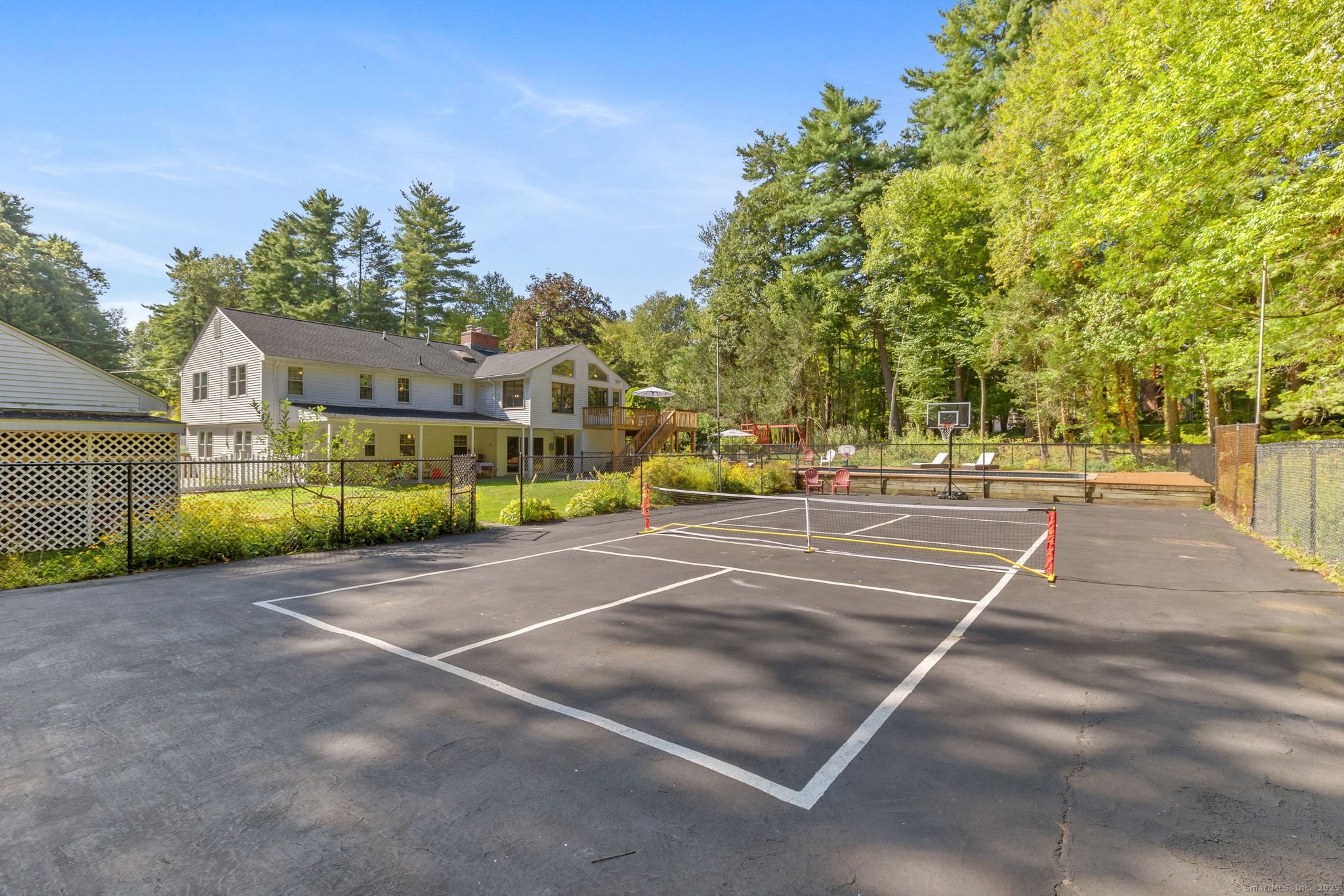Live every day like you're on vacation in this stunning 3BR/3BA home with over 3,200 sq.ft. of beautifully updated living space! The gourmet kitchen features granite counters and stainless appliances, opening to a sun-drenched vaulted sunroom with natural gas hearth and gorgeous year-round views. Enjoy indoor/outdoor living with an expansive deck presiding over your private retreat.The open living/dining area includes a dual-sided gas fireplace. The main level also offers a serene primary suite with en-suite bath, two guest bedrooms, generous full bath, laundry room, and new bamboo flooring throughout. The walkout lower level is perfect for entertaining or an in-law suite-featuring a large rec room, gas stove, wet bar, fireplace, remodeled full bath, office/4th BR, den, cedar closet, and indoor Jacuzzi spa! Outside, unwind in your resort-like backyard with a heated saltwater pool, 2,500 sq.ft. of new composite decking, and tennis/pickleball court with brand new lighting. All set in a scenic neighborhood near UConn, highways, shopping & dining. A true staycation dream!