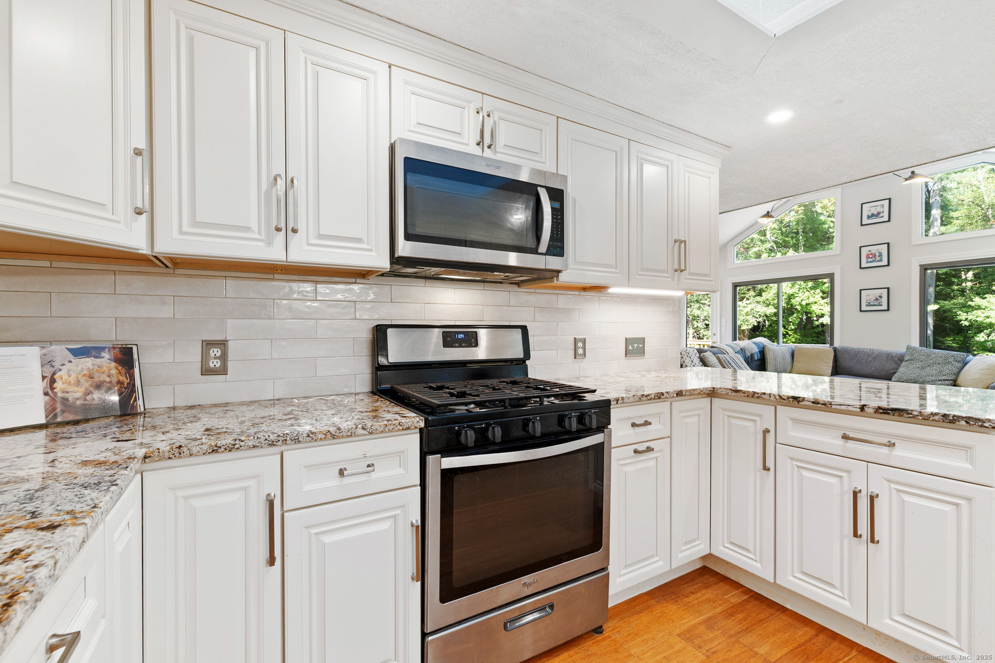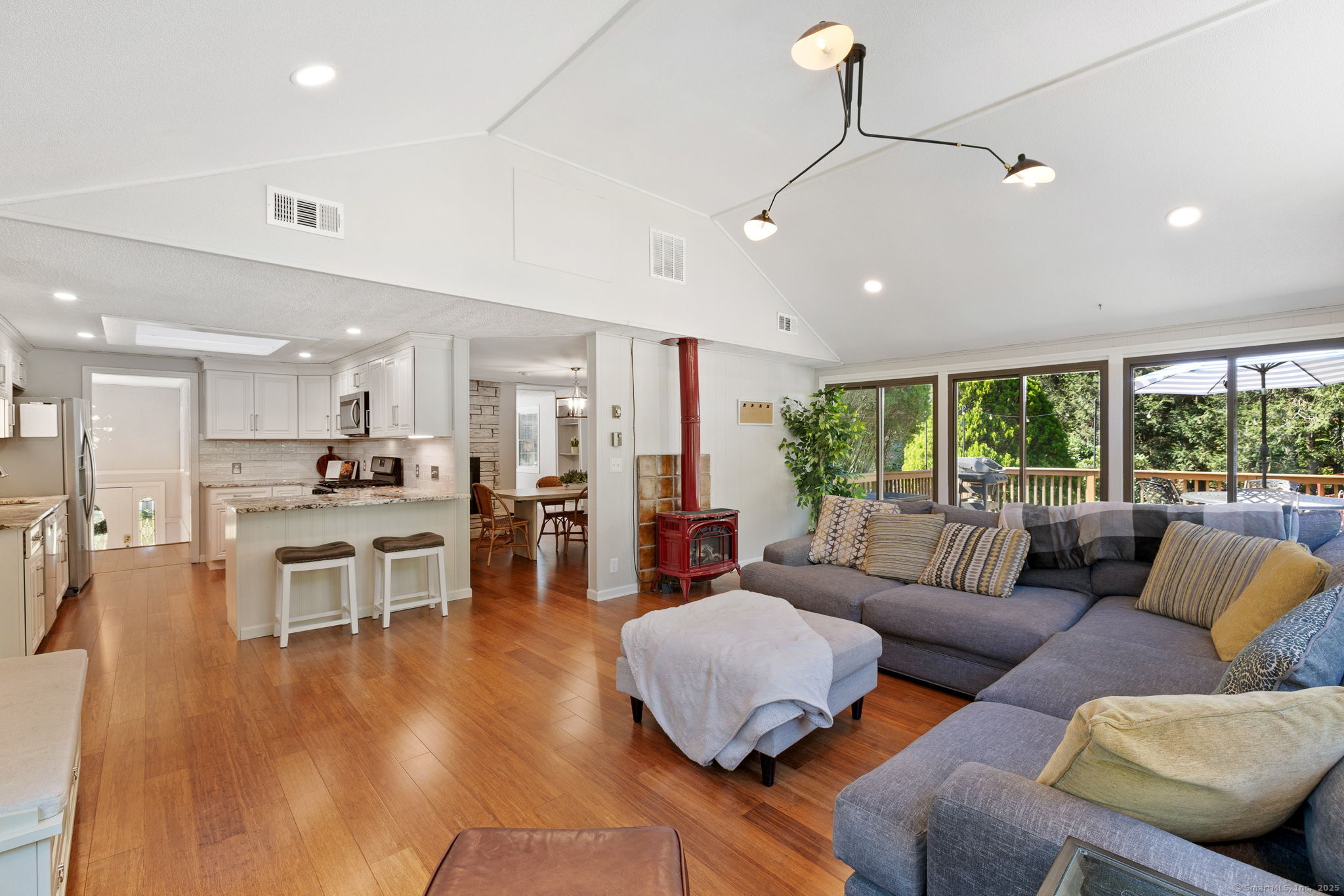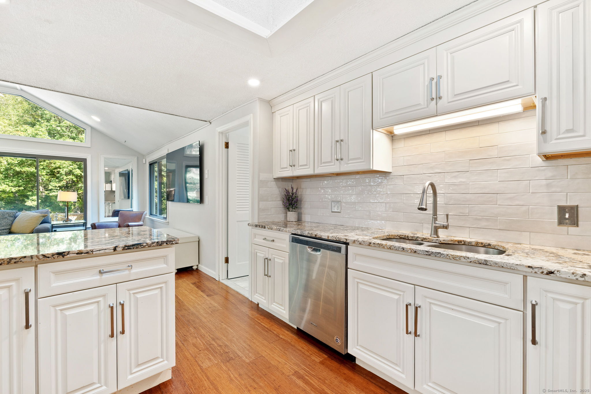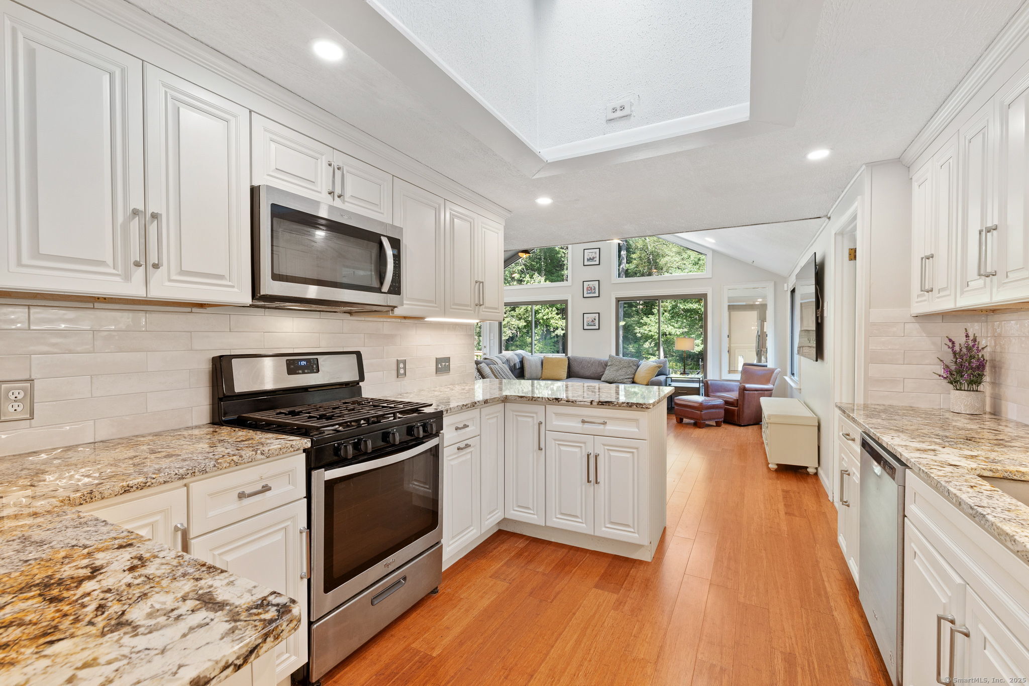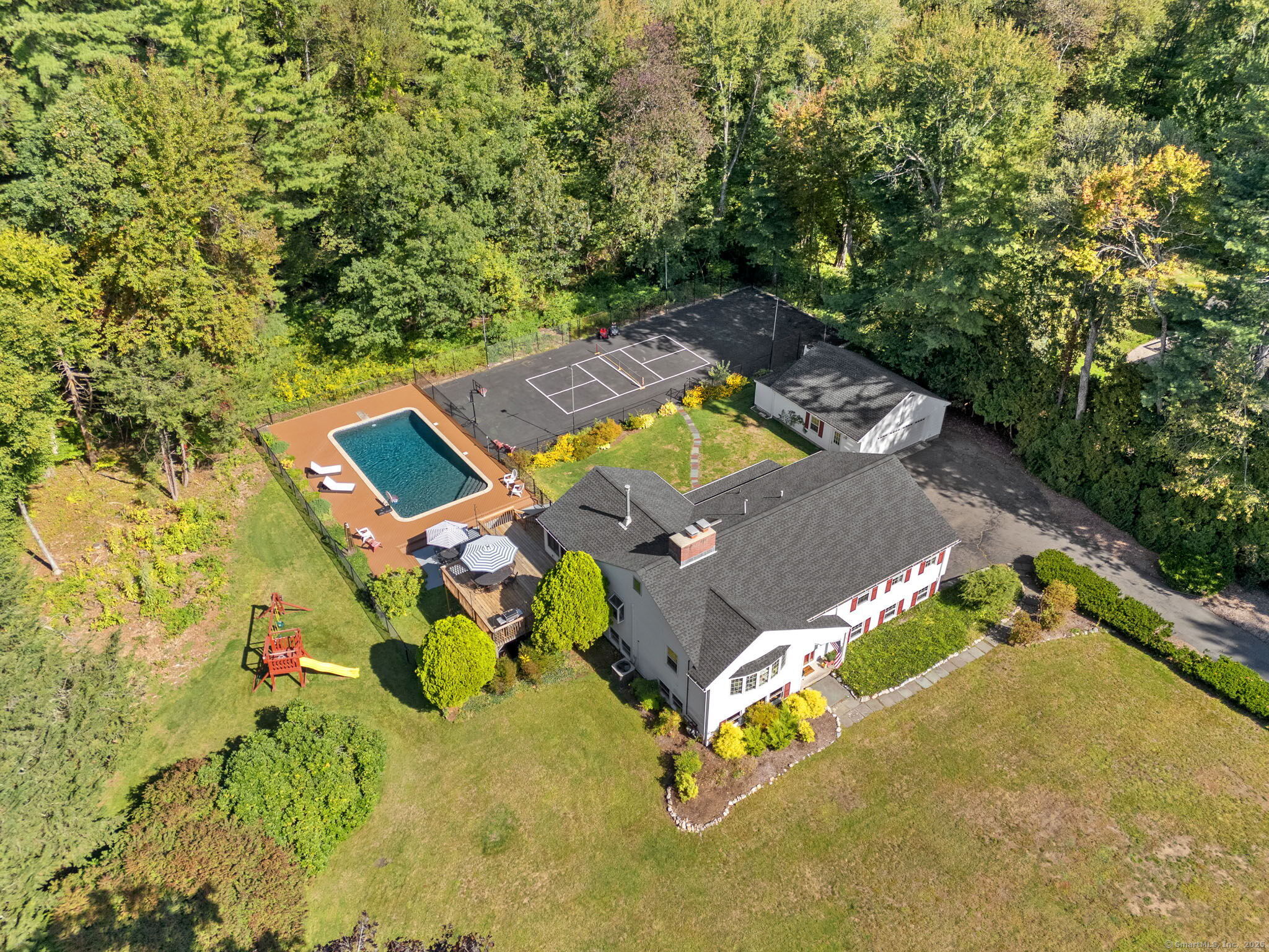 Live every day like you're on vacation in this stunning 3BR/3BA home with over 3,200 sq.ft. of beautifully updated living space! The gourmet kitchen features granite counters and stainless appliances, opening to a sun-drenched vaulted sunroom with natural gas hearth and gorgeous year-round views. Enjoy indoor/outdoor living with an expansive deck presiding over your private retreat.The open living/dining area includes a dual-sided gas fireplace. The main level also offers a serene primary suite with en-suite bath, two guest bedrooms, generous full bath, laundry room, and new bamboo flooring throughout. The walkout lower level is perfect for entertaining or an in-law suite-featuring a large rec room, gas stove, wet bar, fireplace, remodeled full bath, office/4th BR, den, cedar closet, and indoor Jacuzzi spa! Outside, unwind in your resort-like backyard with a heated saltwater pool, 2,500 sq.ft. of new composite decking, and tennis/pickleball court with brand new lighting. All set in a scenic neighborhood near UConn, highways, shopping & dining. A true staycation dream!