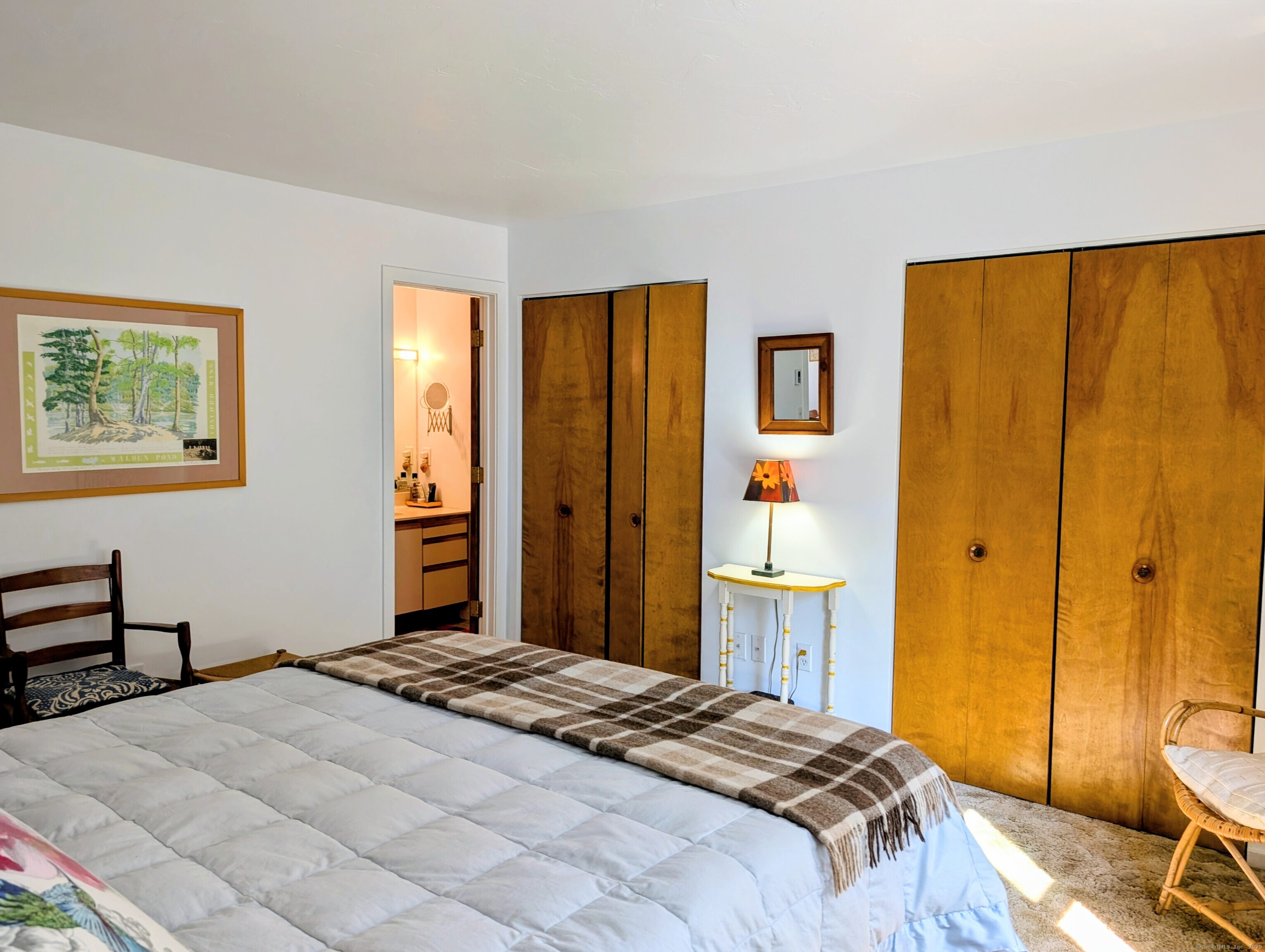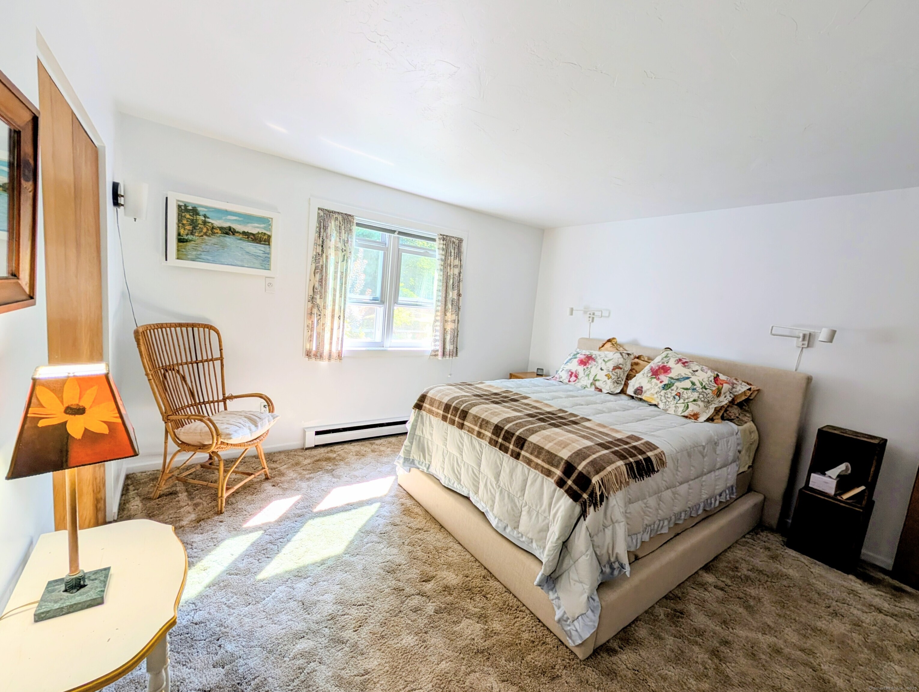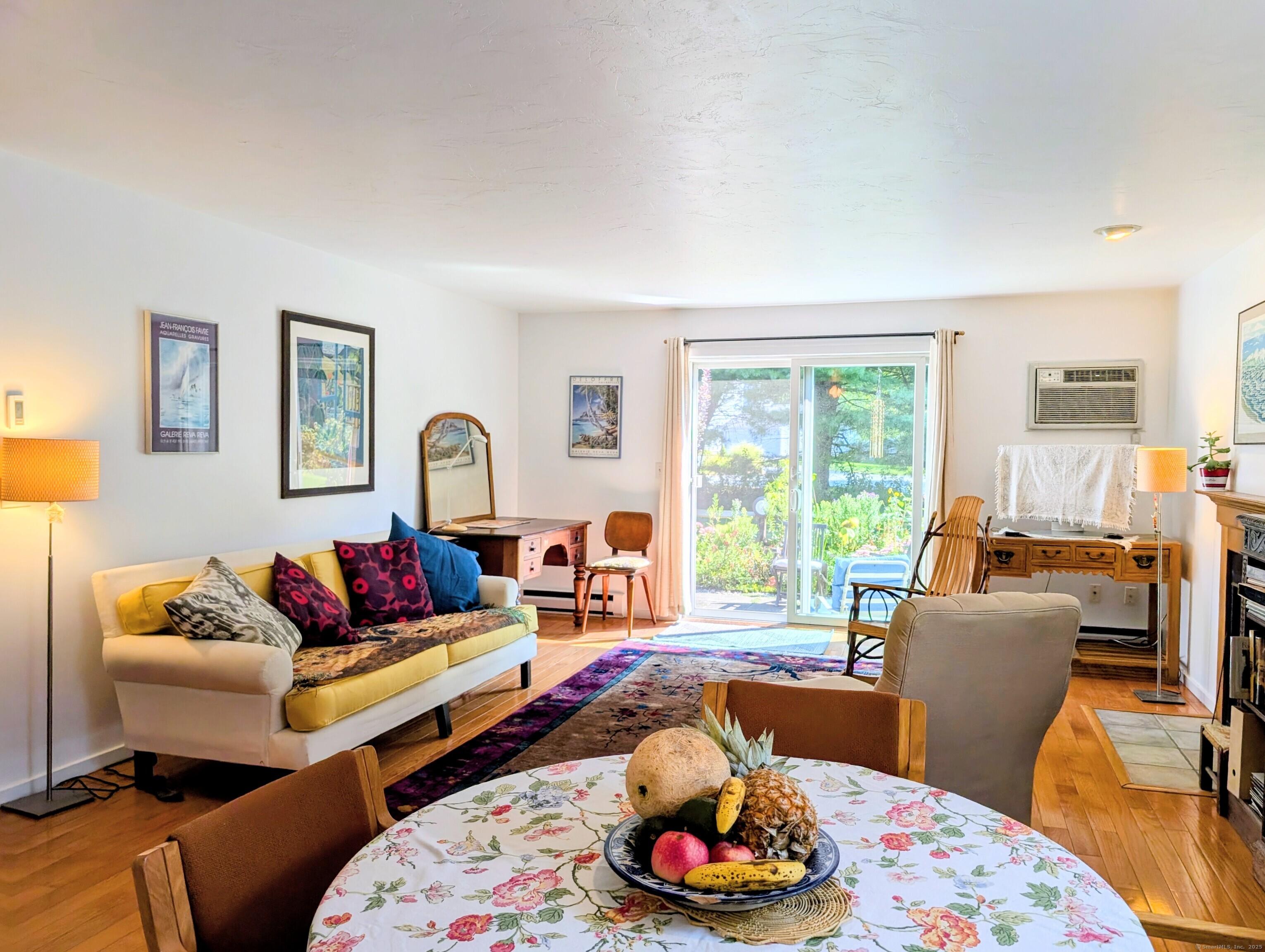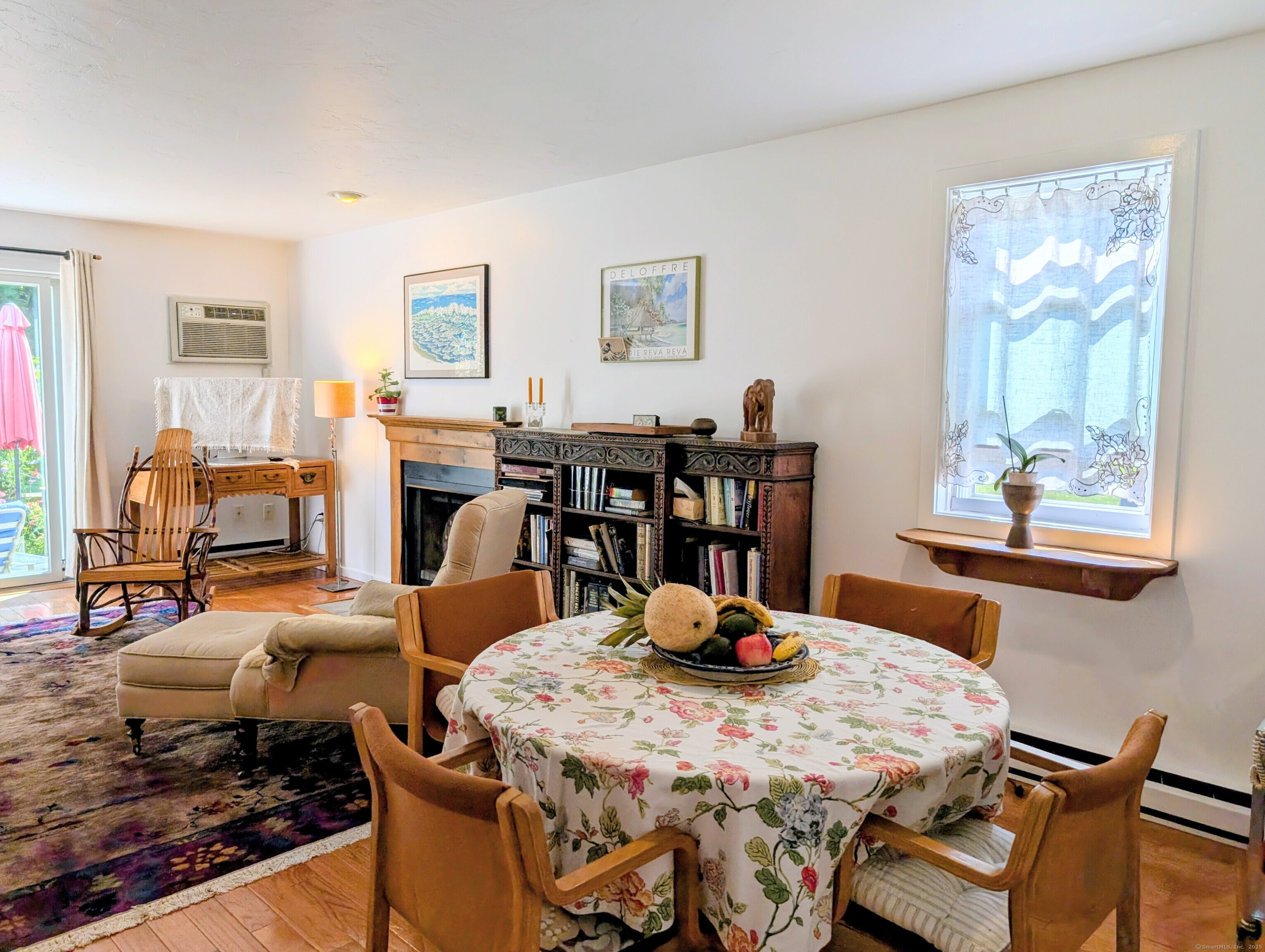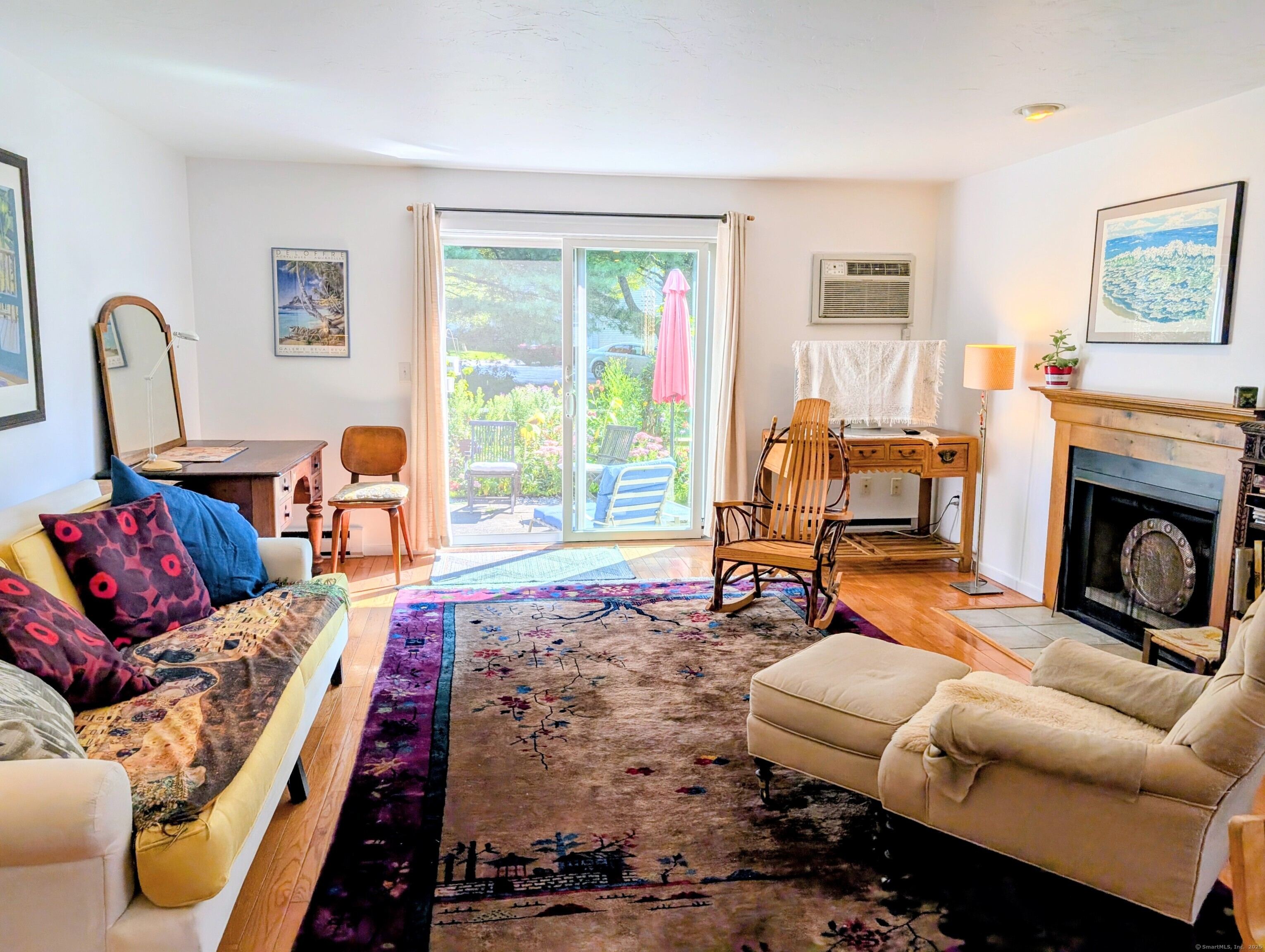 No more leaf-raking, mowing, gutter clean-outs or snowplowing for you! Experience the ease of the friendly Woodstock Meadows condo community within walking distance to Roseland Park & Golf course, and only ten minutes to Putnam shops and hospital. This is the "Cape" style, one level, south-facing end unit of a duplex, with two large bedrooms, two full baths. The primary bedroom has two large closets, and ensuite bathroom with a shower/bath. The second bedroom is next to another full bathroom with a double walk-in shower. All windows are easy clean energy efficient. The bright kitchen has new updated cupboards and counter tops. The large open plan living/dining room area features oak hardwood flooring, a working fireplace, and Anderson sliding doors out to a patio surrounded by a lovely garden and common area green space beyond. A carpeted staircase leads to the huge 31x15' bonus room downstairs. This room was built in 2022, and features a 4x4' window with a 6x6' egress window well to the outside, bringing in great natural light and creating another 455sq.ft. of heated living space. There is still another approximate 455' of unfinished basement space providing loads of totally dry secure storage. This end unit faces due south, with all day sunlight. There is a detached one-car garage, automatic garage door opener, electricity hookups and light. This is a quiet pet-friendly community in a lovely treed rural setting.