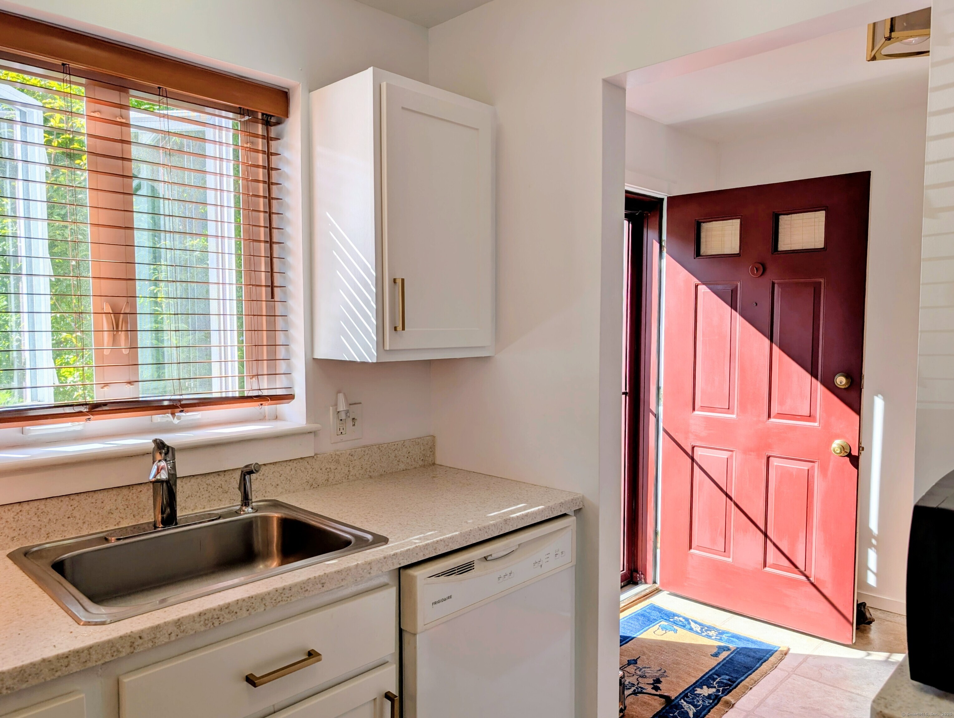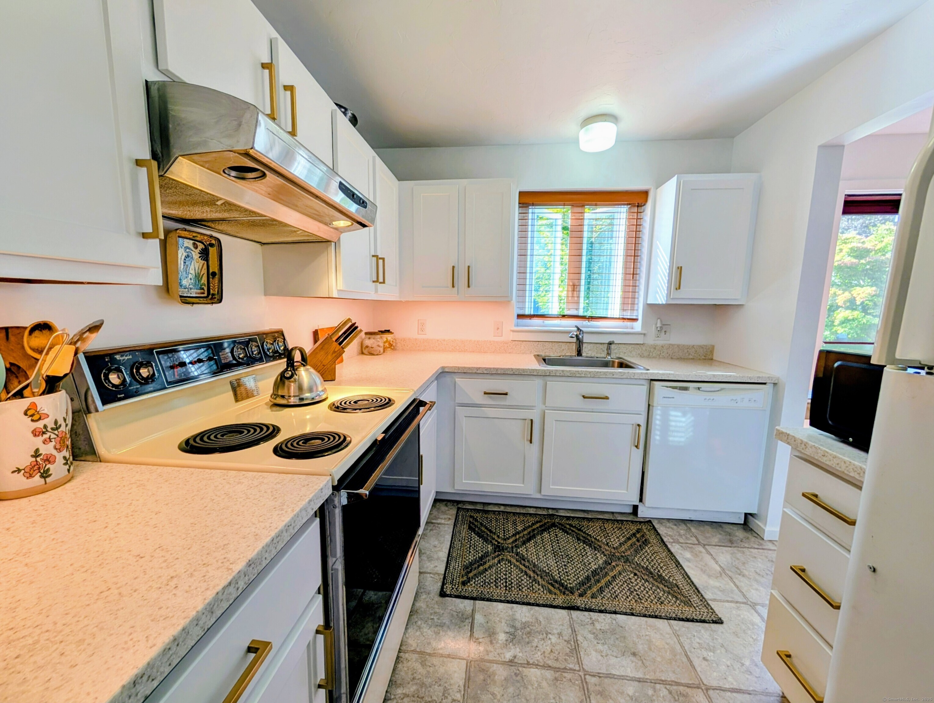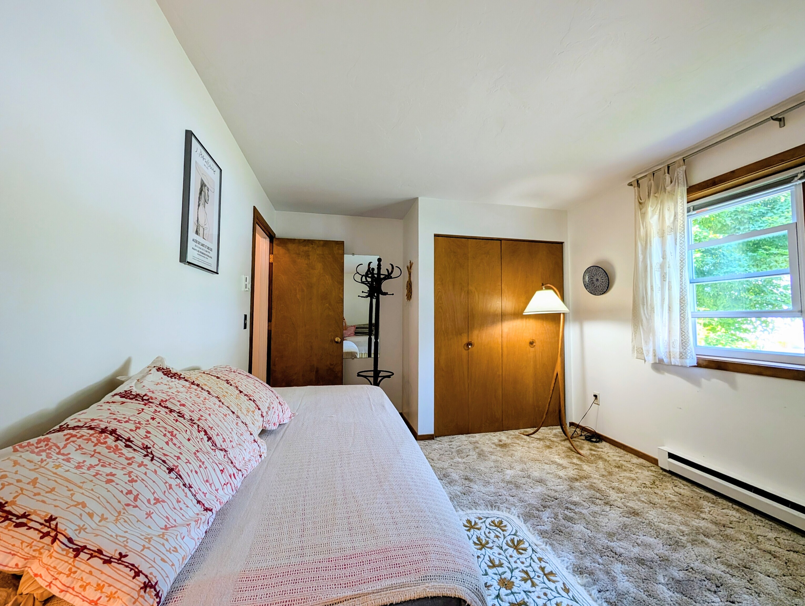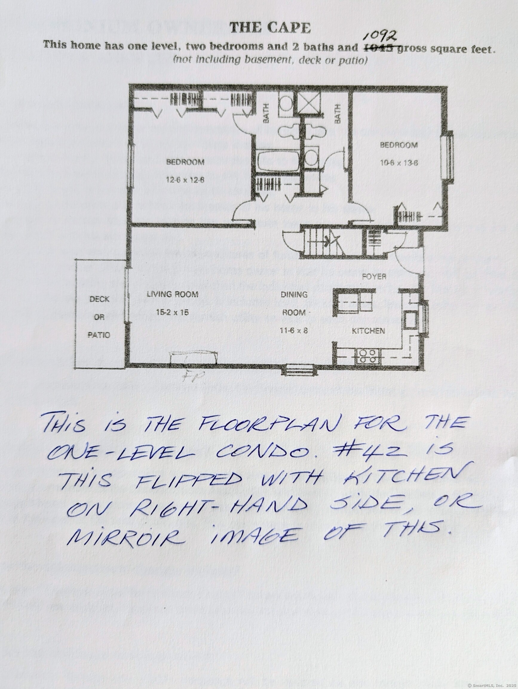 No more leaf-raking, mowing, gutter clean-outs or snowplowing for you! Experience the ease of the friendly Woodstock Meadows condo community within walking distance to Roseland Park & Golf course, and only ten minutes to Putnam shops and hospital. This is the "Cape" style, one level, south-facing end unit of a duplex, with two large bedrooms, two full baths. The primary bedroom has two large closets, and ensuite bathroom with a shower/bath. The second bedroom is next to another full bathroom with a double walk-in shower. All windows are easy clean energy efficient. The bright kitchen has new updated cupboards and counter tops. The large open plan living/dining room area features oak hardwood flooring, a working fireplace, and Anderson sliding doors out to a patio surrounded by a lovely garden and common area green space beyond. A carpeted staircase leads to the huge 31x15' bonus room downstairs. This room was built in 2022, and features a 4x4' window with a 6x6' egress window well to the outside, bringing in great natural light and creating another 455sq.ft. of heated living space. There is still another approximate 455' of unfinished basement space providing loads of totally dry secure storage. This end unit faces due south, with all day sunlight. There is a detached one-car garage, automatic garage door opener, electricity hookups and light. This is a quiet pet-friendly community in a lovely treed rural setting.