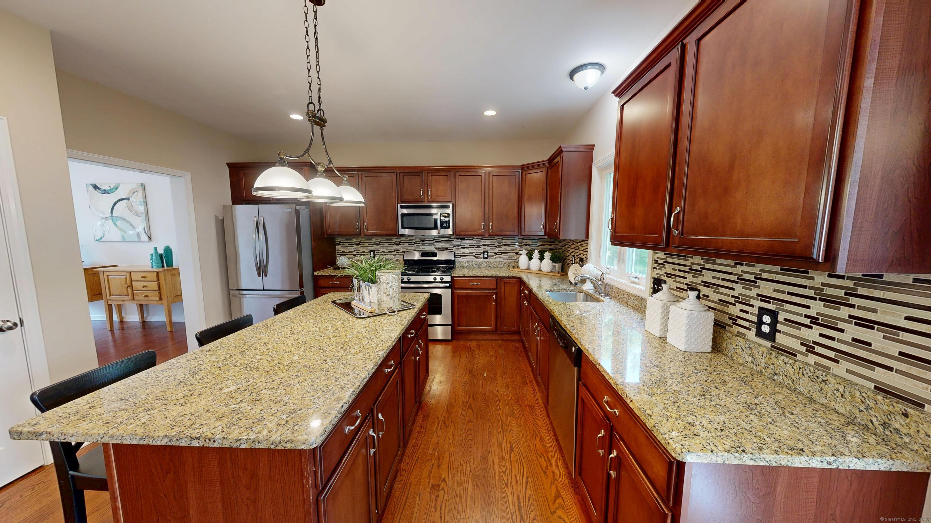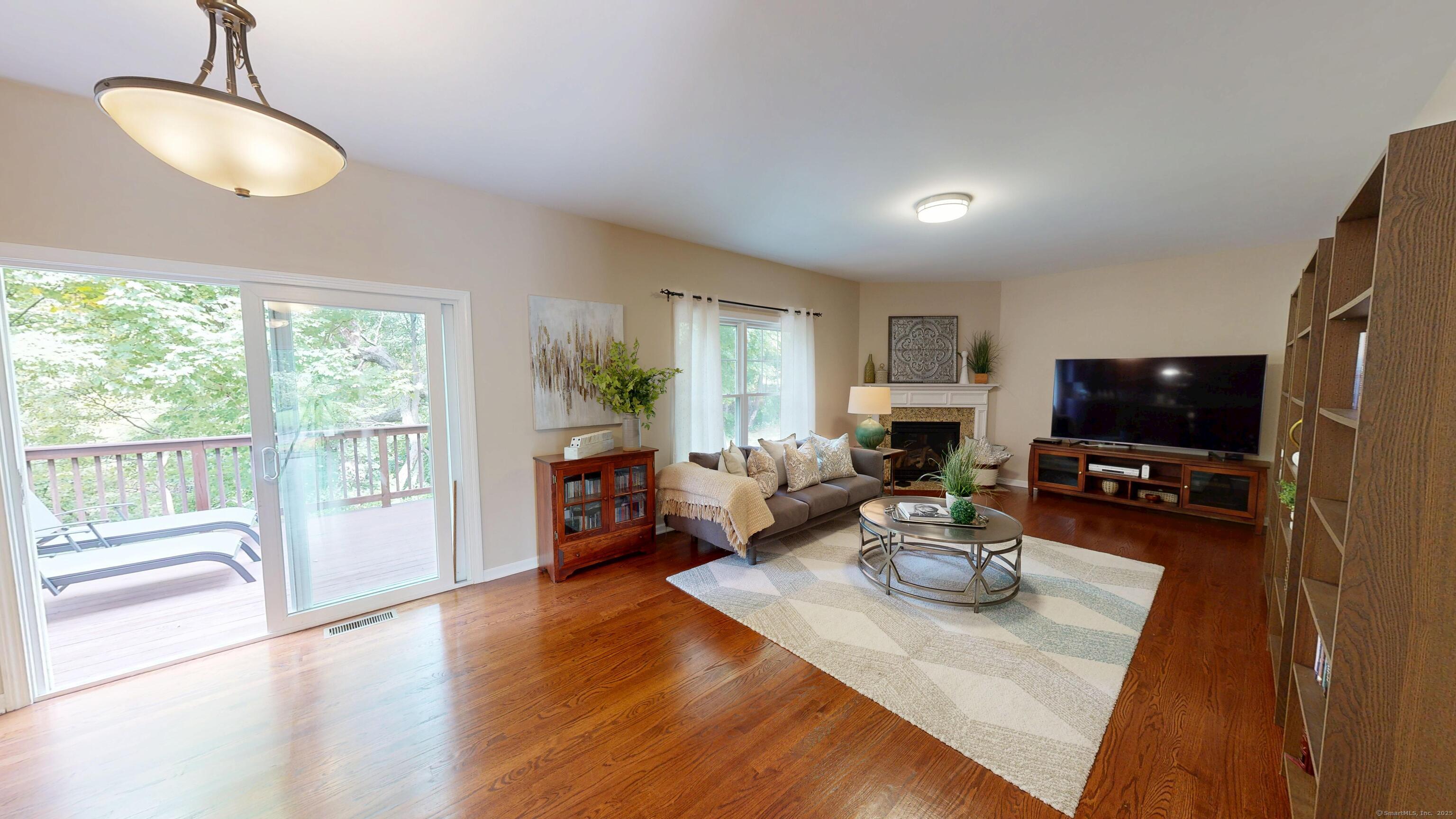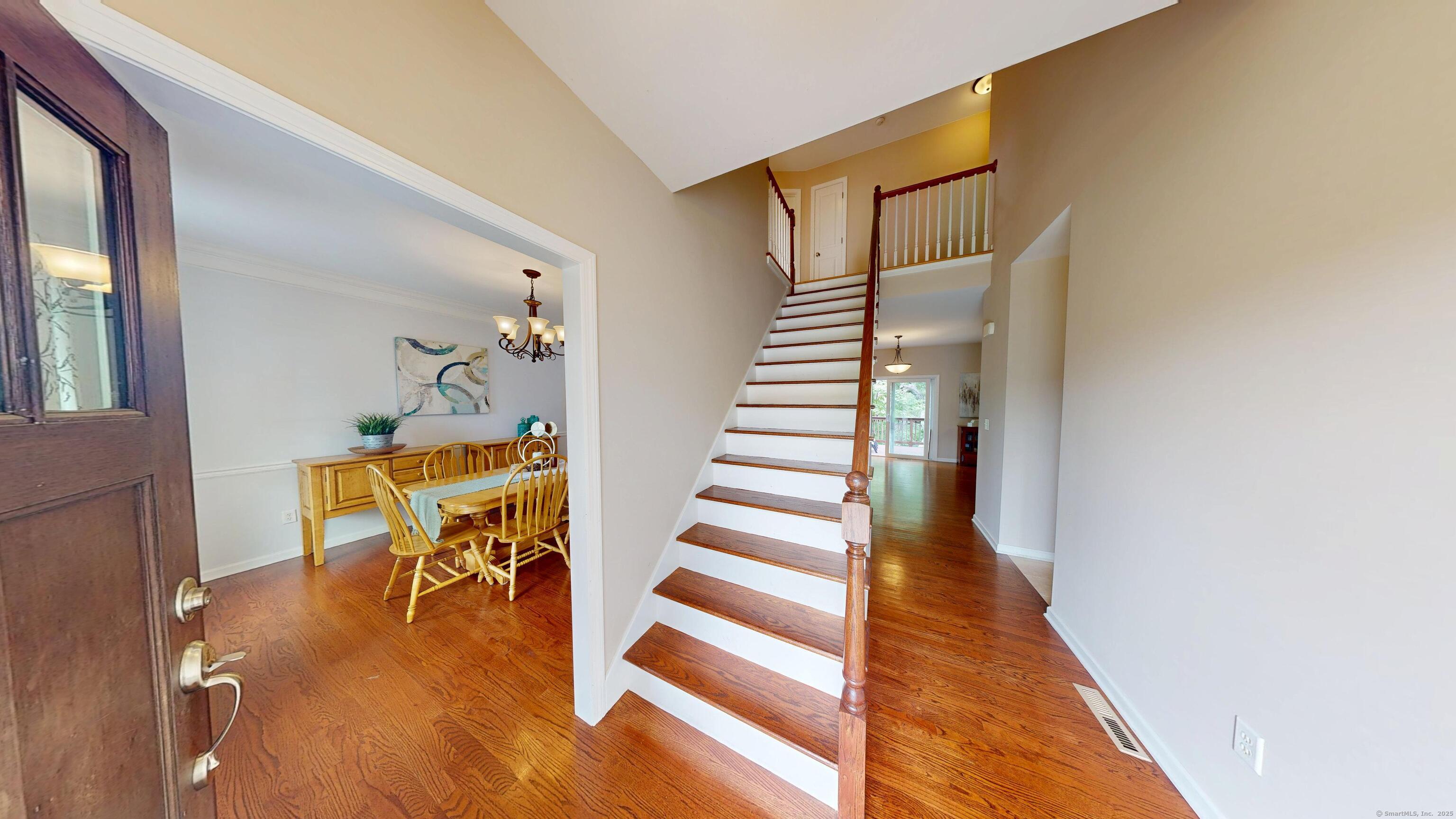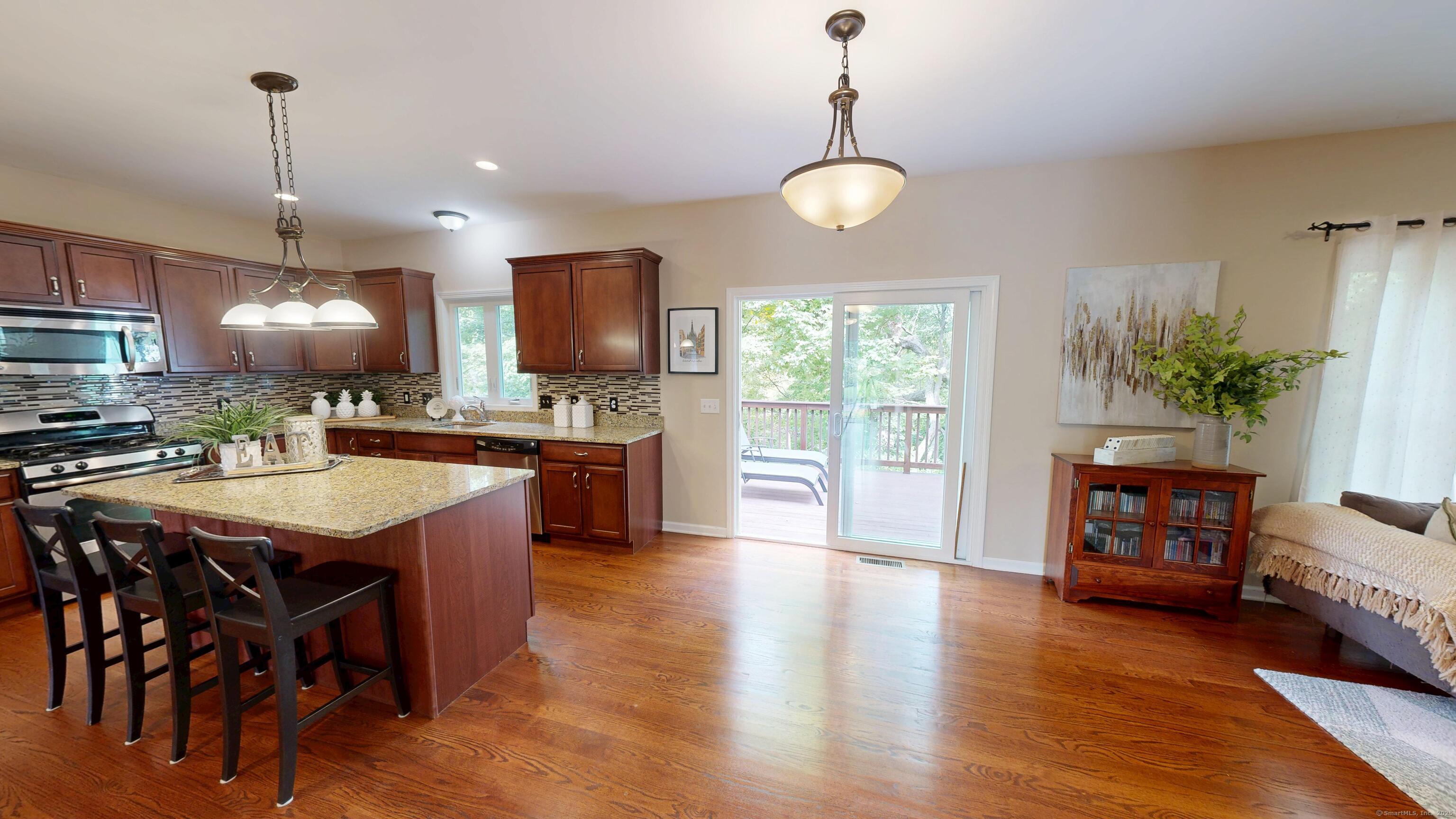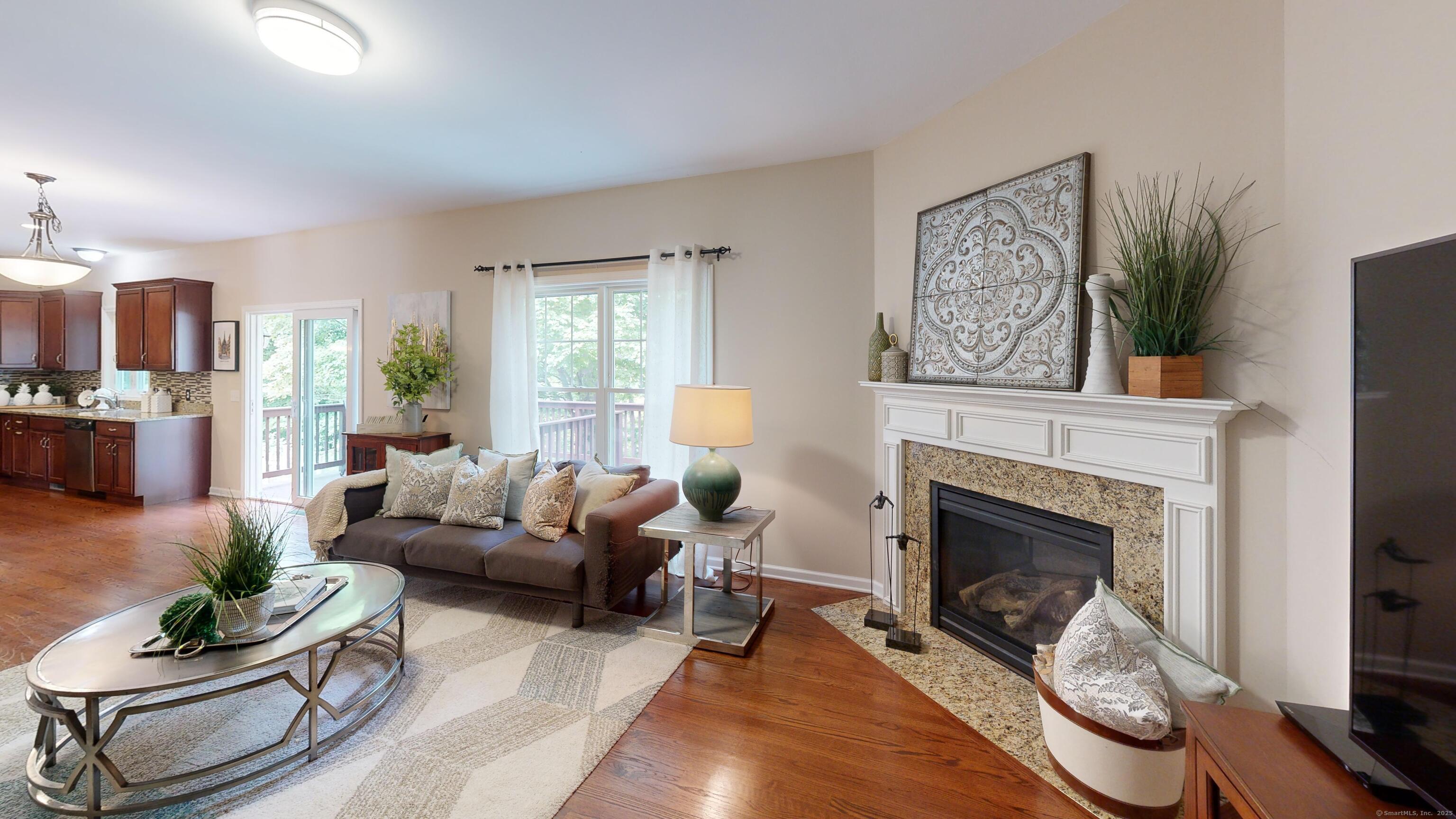 Well-maintained Colonial located in one of Wallingford's most sought-after cul-de-sac neighborhoods. This home offers an inviting open floor plan with a spacious kitchen featuring granite countertops, glass tile backsplash, center island, pantry, and eating area with sliders leading to a deck and newer patio overlooking a wooded lot for privacy. The kitchen opens seamlessly to the family room with a gas fireplace, perfect for gatherings. A freshly painted dining room with crown molding and chair rail adds elegance, while stunning mahogany-stained oak hardwood floors run throughout the first floor. The second level offers hardwood flooring throughout, a spacious primary suite with two walk-in closets, and a fully remodeled bathroom with double vanity. Two additional bedrooms, including one with a large walk-in closet, a full bath, and a laundry room complete the upstairs. The lower level provides excellent potential for future expansion. Additional highlights include a two-car garage with extra storage and a sidewalk-lined neighborhood close to Rt. 68, I-91, Rt. 15, shopping, restaurants, and more.