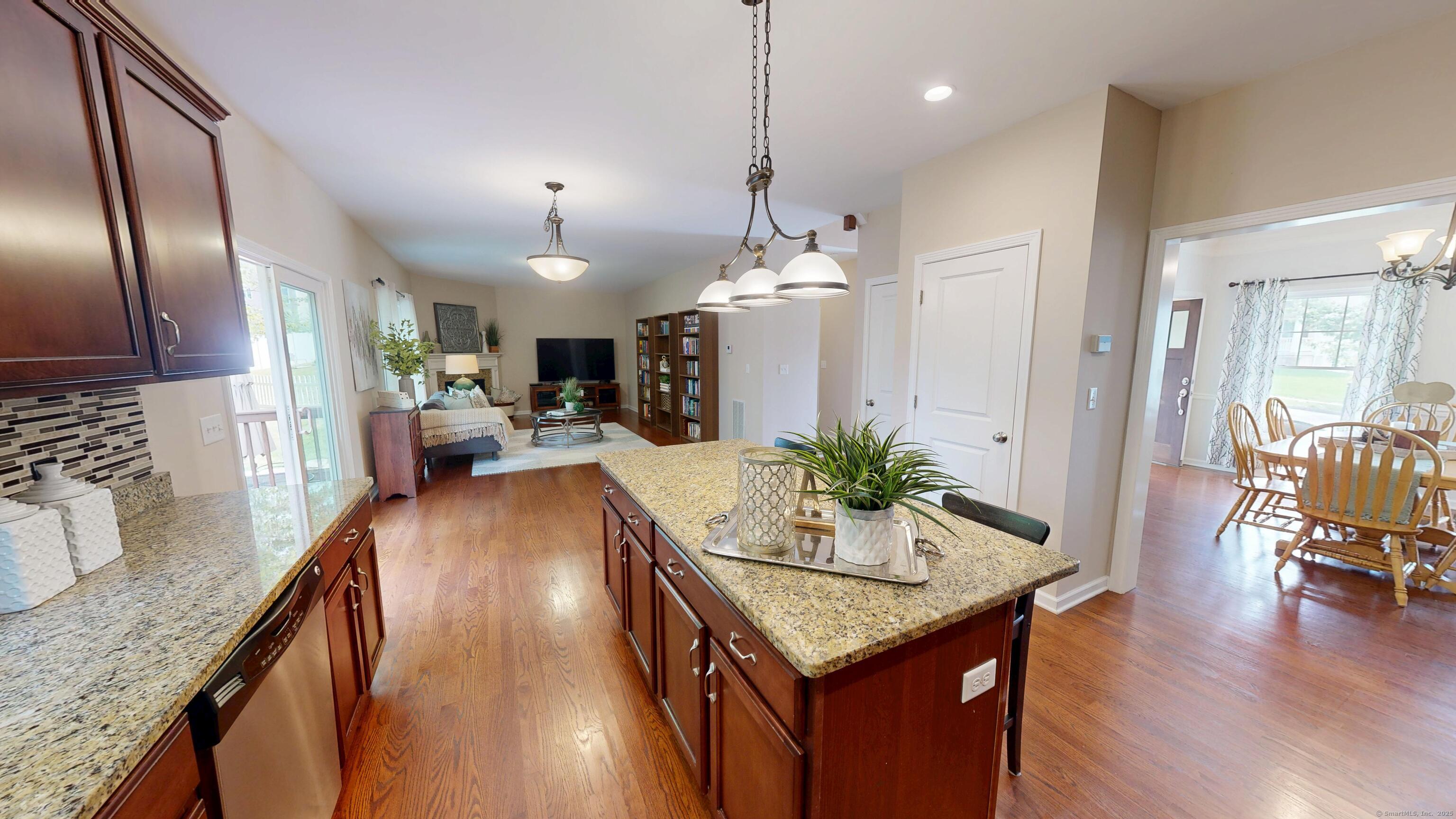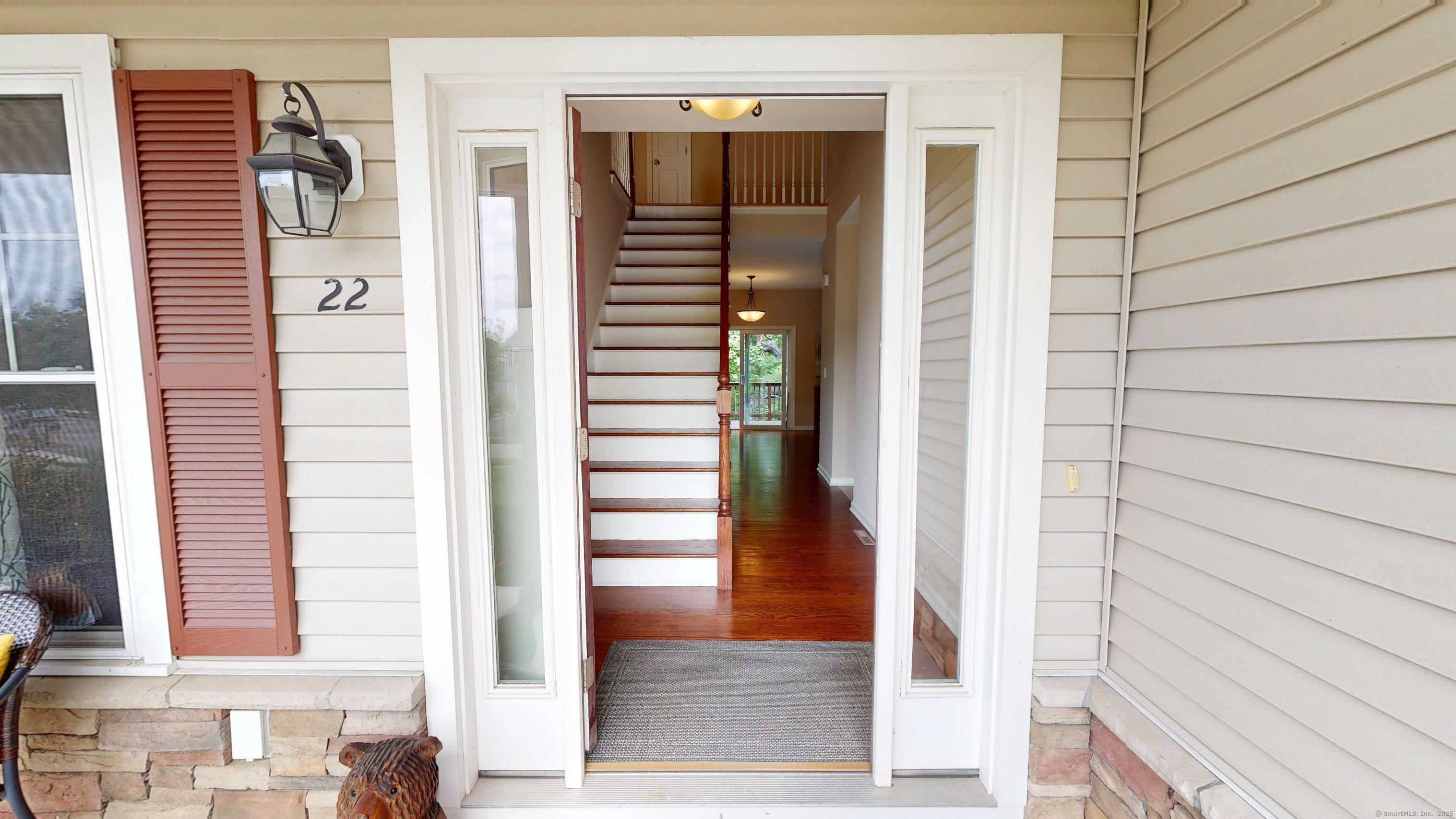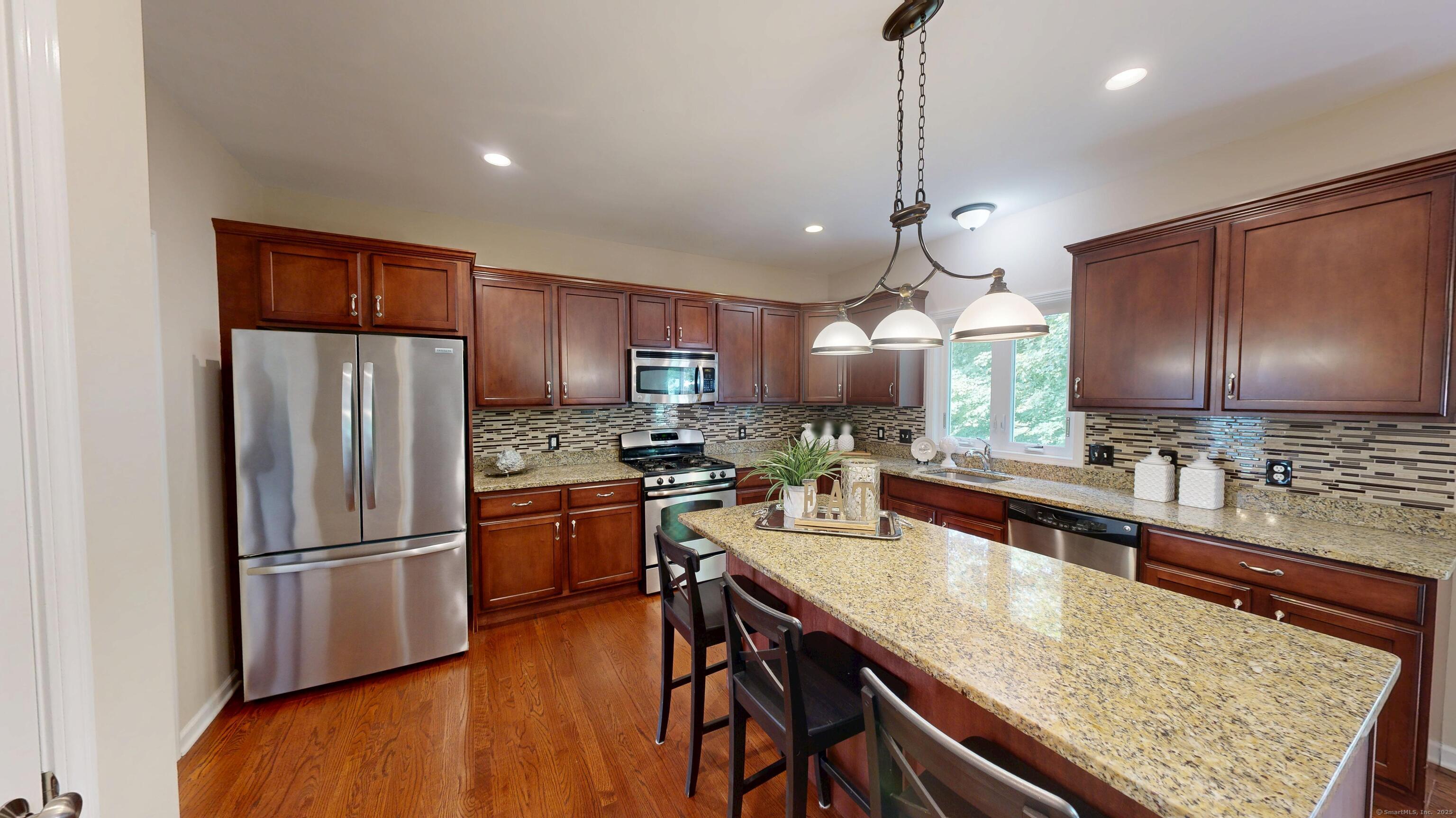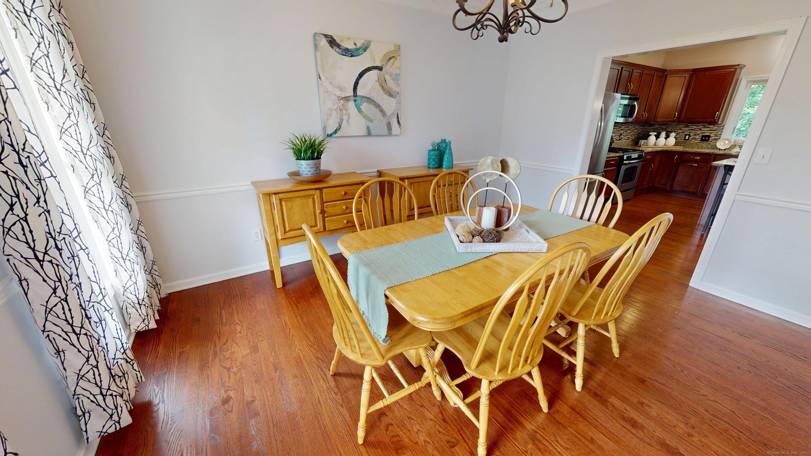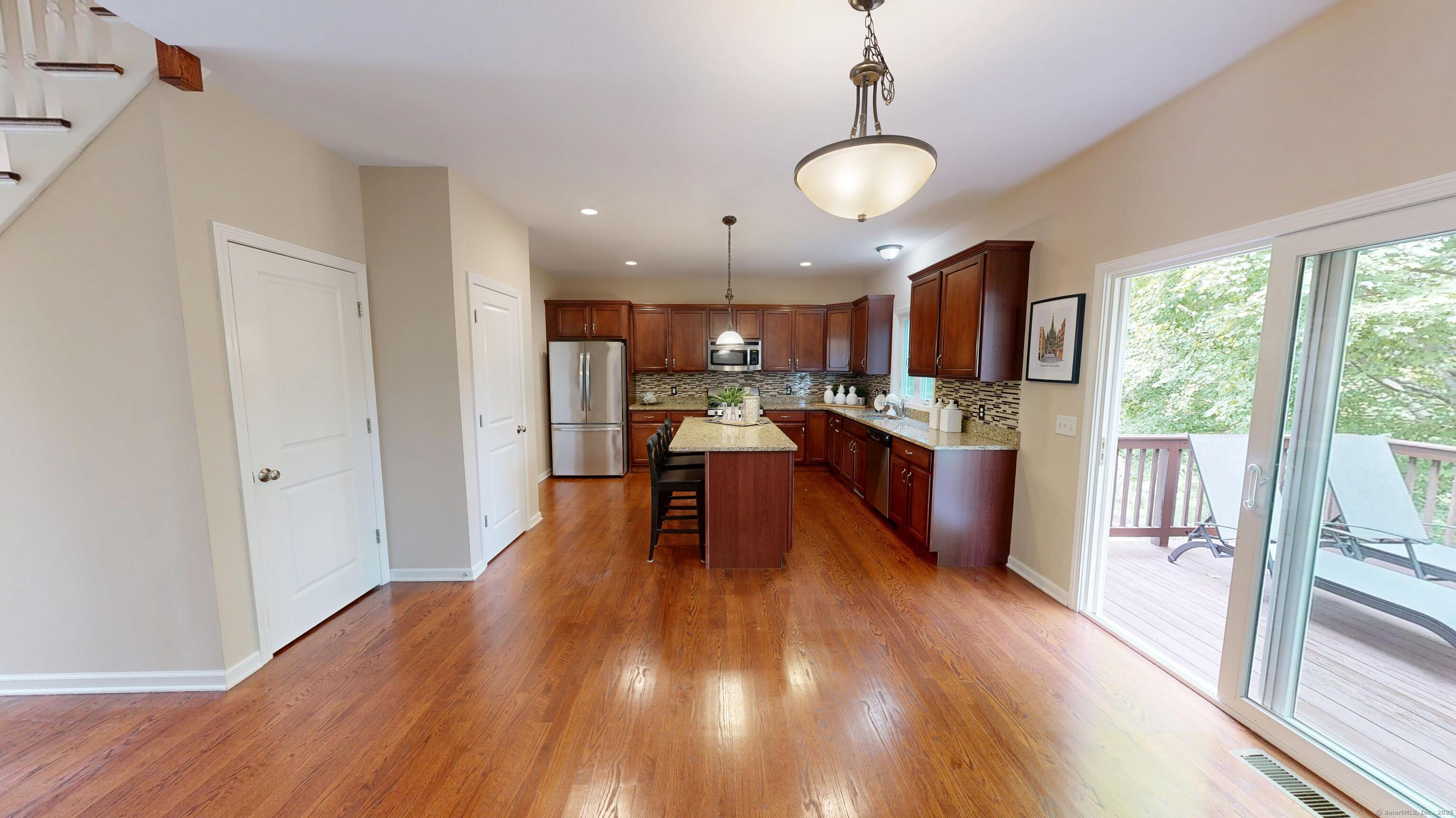 Well-maintained Colonial located in one of Wallingford's most sought-after cul-de-sac neighborhoods. This home offers an inviting open floor plan with a spacious kitchen featuring granite countertops, glass tile backsplash, center island, pantry, and eating area with sliders leading to a deck and newer patio overlooking a wooded lot for privacy. The kitchen opens seamlessly to the family room with a gas fireplace, perfect for gatherings. A freshly painted dining room with crown molding and chair rail adds elegance, while stunning mahogany-stained oak hardwood floors run throughout the first floor. The second level offers hardwood flooring throughout, a spacious primary suite with two walk-in closets, and a fully remodeled bathroom with double vanity. Two additional bedrooms, including one with a large walk-in closet, a full bath, and a laundry room complete the upstairs. The lower level provides excellent potential for future expansion. Additional highlights include a two-car garage with extra storage and a sidewalk-lined neighborhood close to Rt. 68, I-91, Rt. 15, shopping, restaurants, and more.