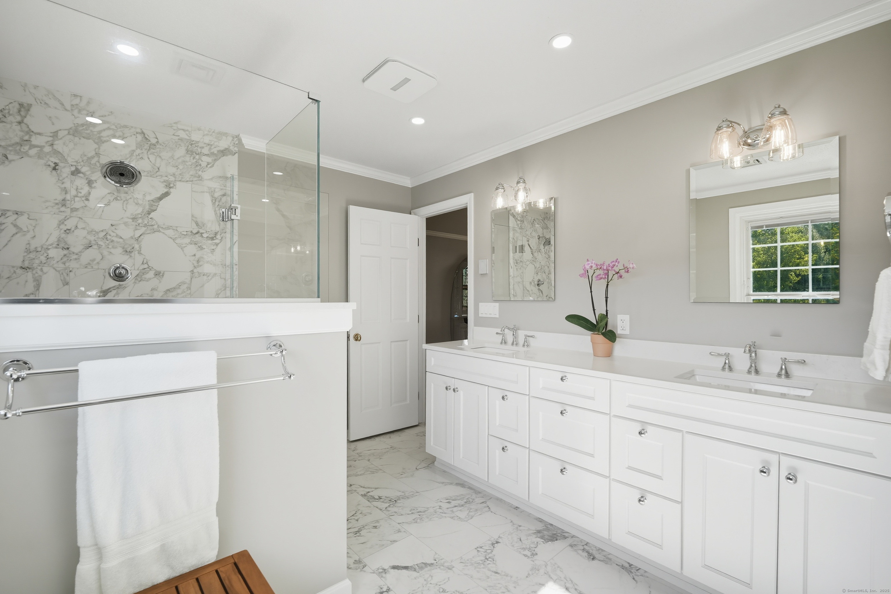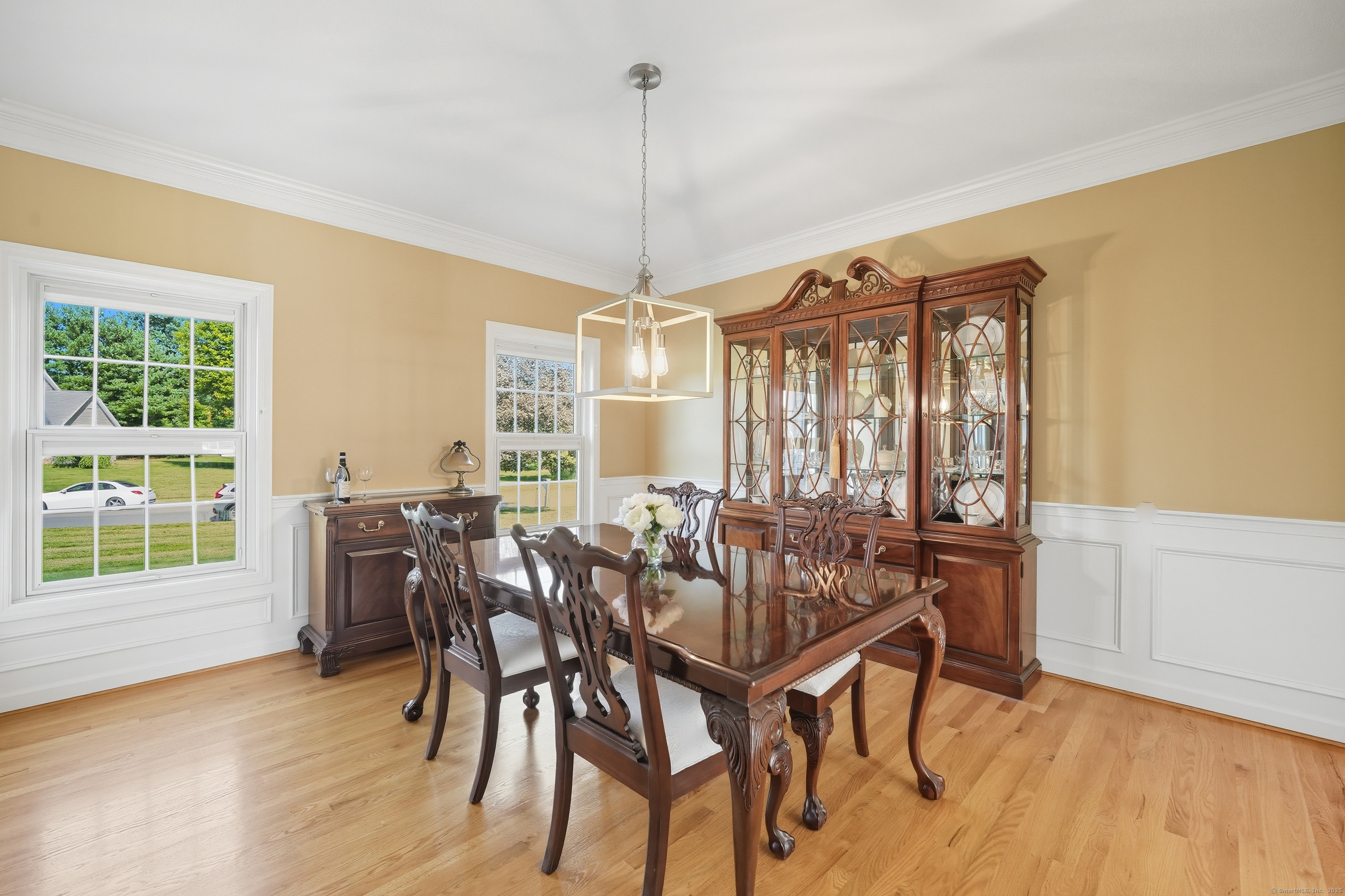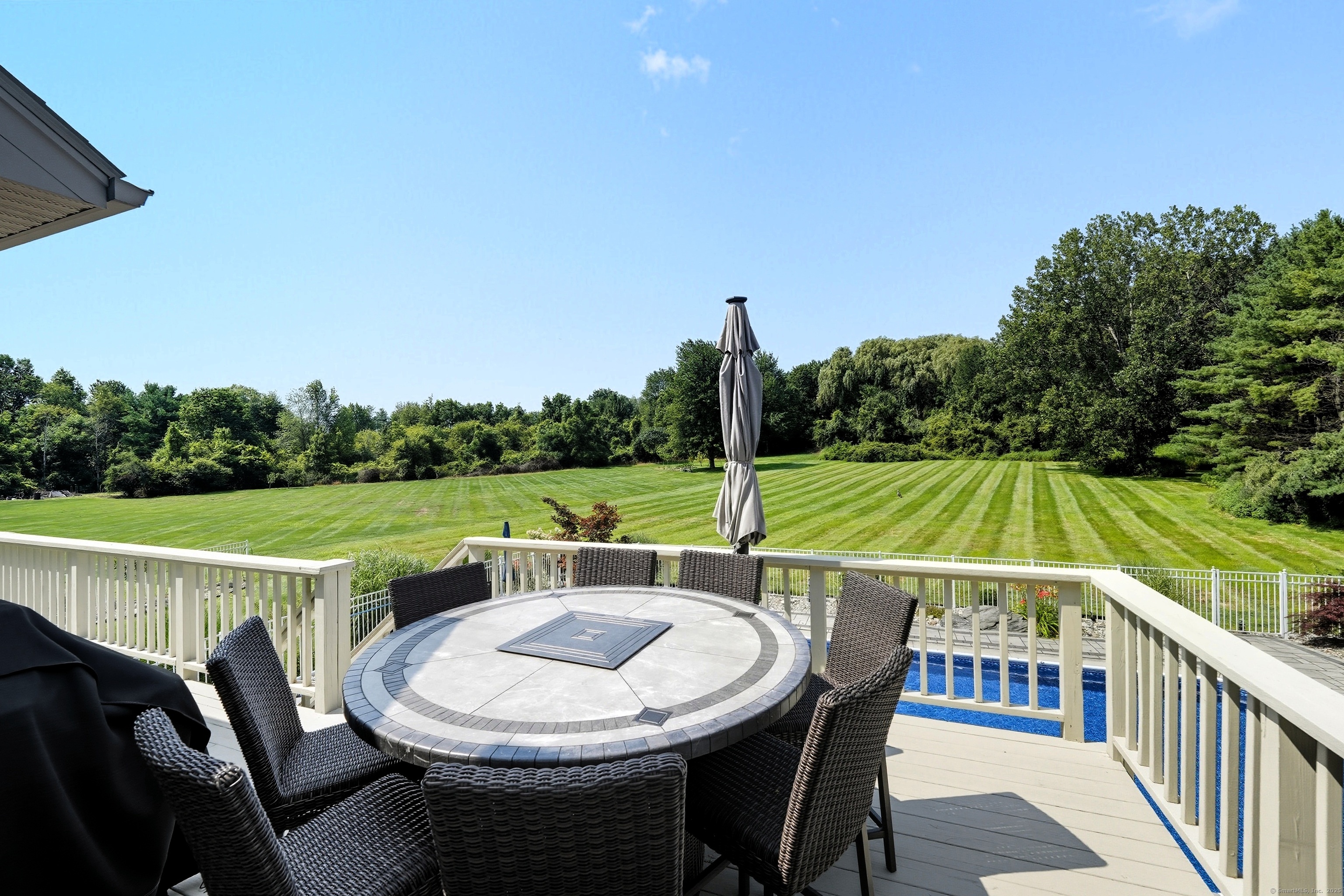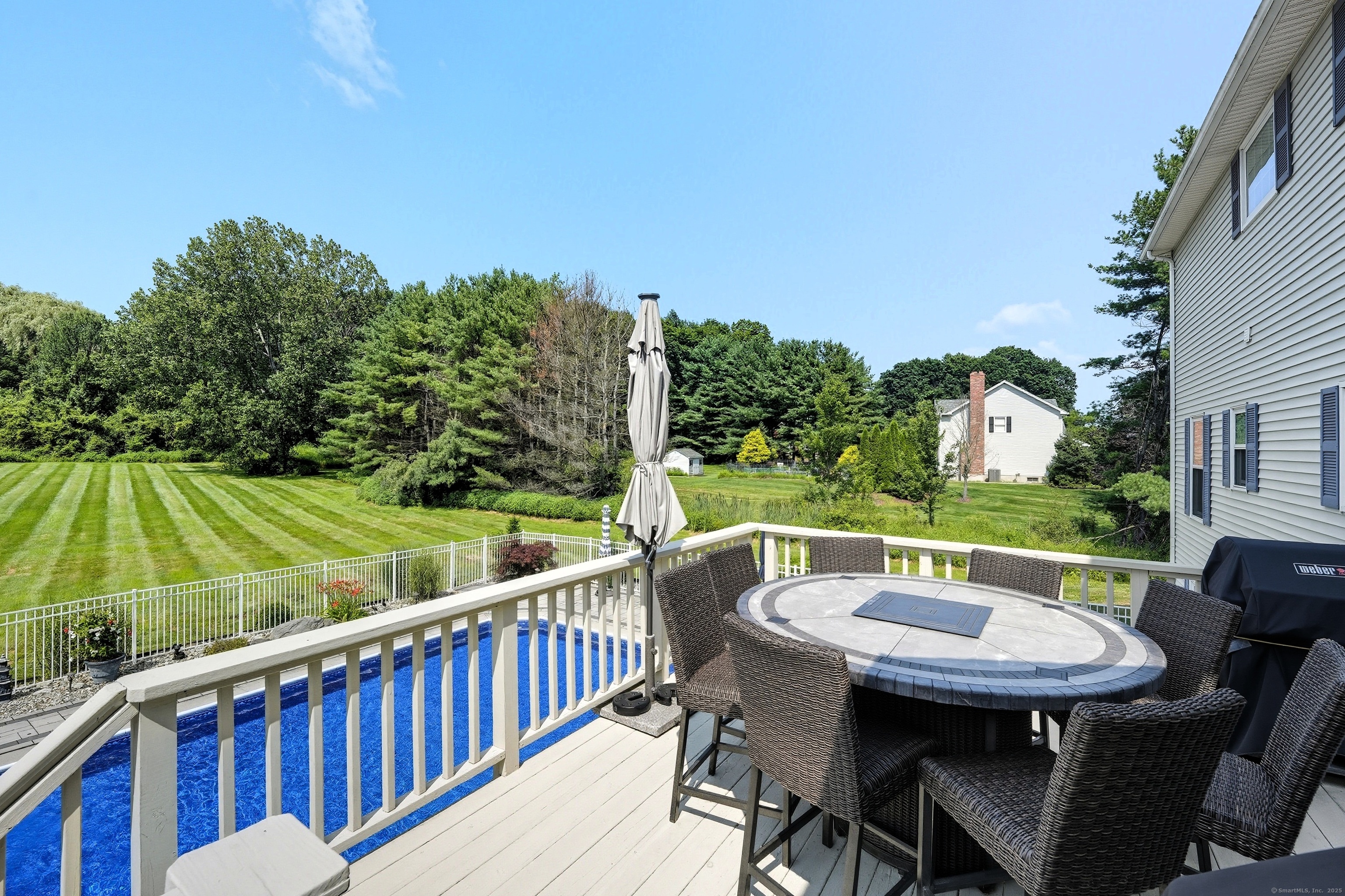Welcome to 1 Meadow Wood Dr, Suffield, CT, the distinguished model home of the neighborhood, crafted by the renowned Briarwood Homes and lovingly kept by the original owners since. Step inside to be greeted by a warm neutral palette that sets a backdrop of refined style. At its heart, the updated kitchen shines with quartz counters, a center island perfect for gathering, and a dining area that flows into the oversized family room. Soaring cathedral ceilings, a cozy gas fireplace, and a custom wet bar with matching cabinetry create a space made for entertaining. Sliders invite you to the oversized deck, overlooking the landscaped grounds. A formal dining room with crown molding and wainscot offers the perfect backdrop for holiday hosting, while the front living room with wood fireplace provides an inviting home office or study. A first-floor bedroom and full bath make multigenerational living or private guest space effortless. Upstairs, the primary suite features a walk-in closet and spa-like bath with double sinks, a glass walk-in shower, and heated floors and towel bar. Two more bedrooms and a full hall bath complete this level. The finished walk-out lower level offers custom built-ins, a half bath, and opens to the stunning yard with an in-ground pool with new liner. Surrounded by a fire pit, expansive yard, and complete with a 2-car garage and custom Pella windows, this home offers comfort, elegance, and thoughtful updates at every turn. Schedule your private tour today!