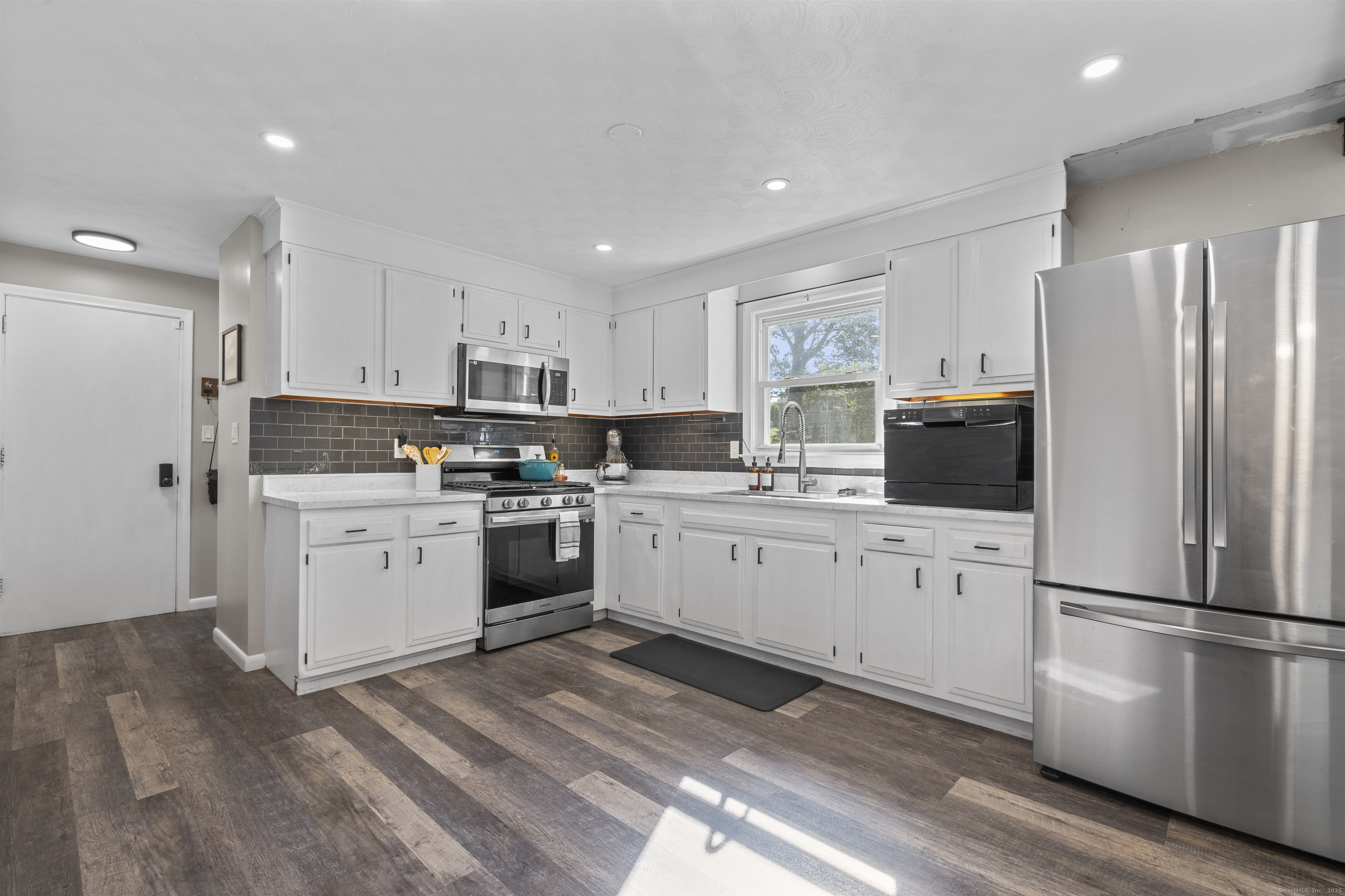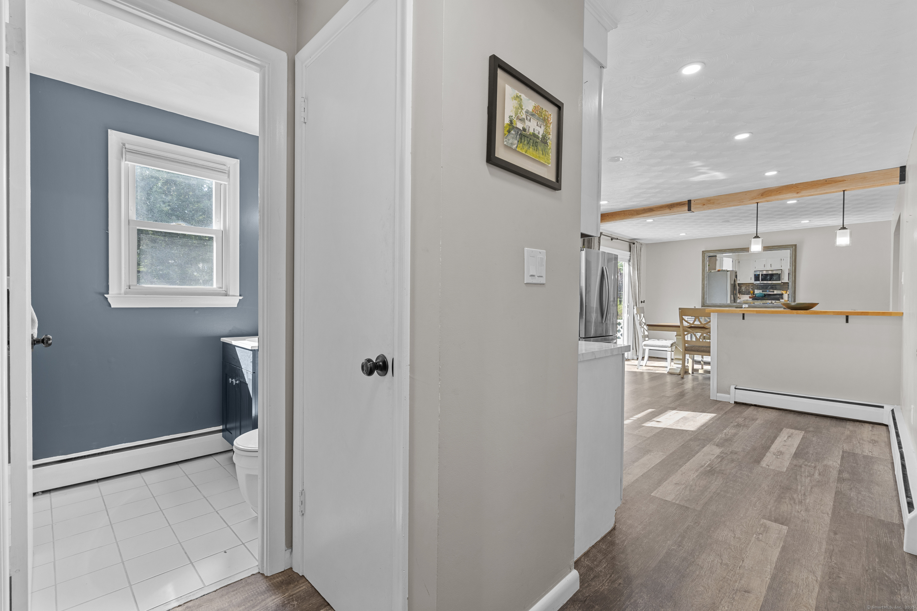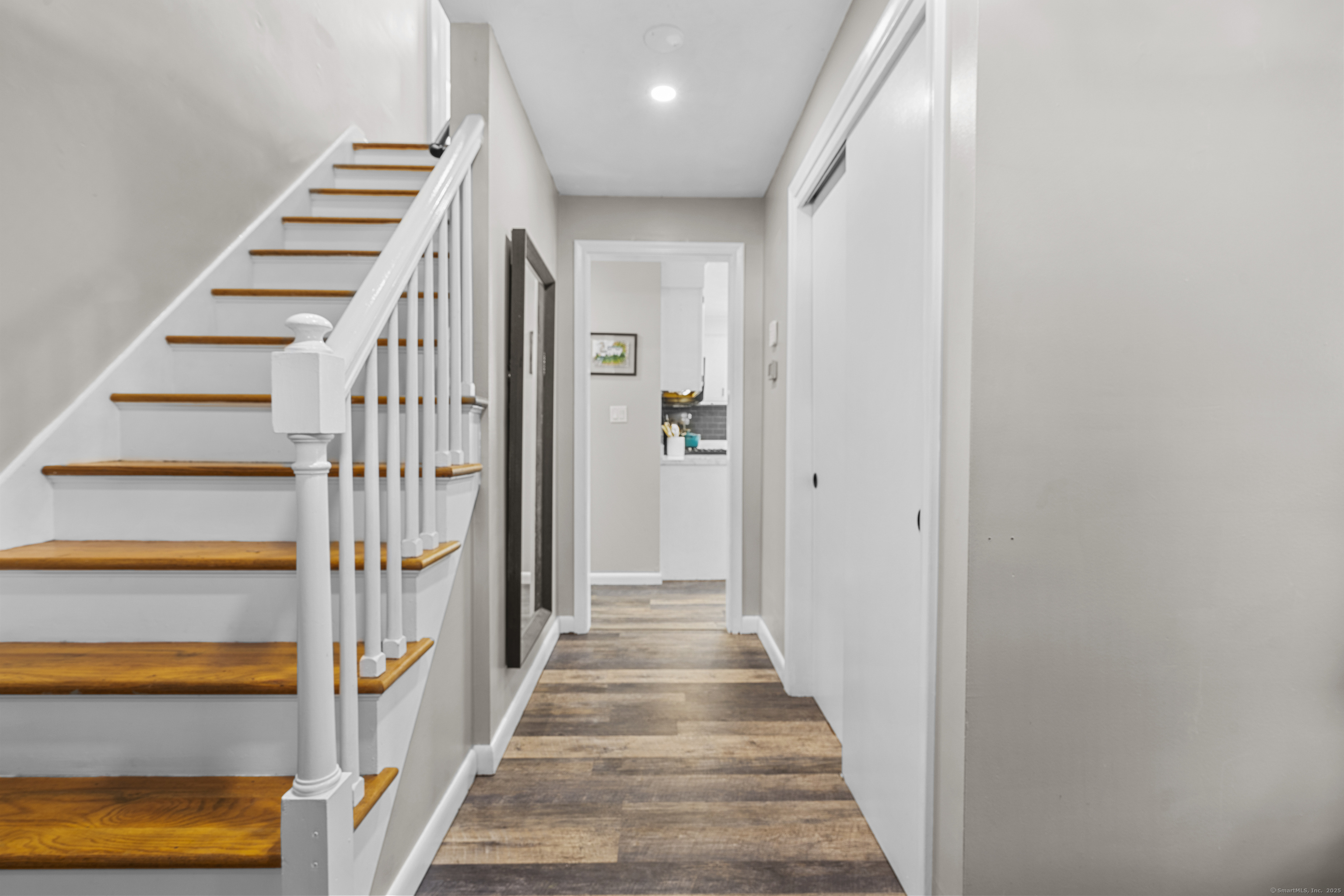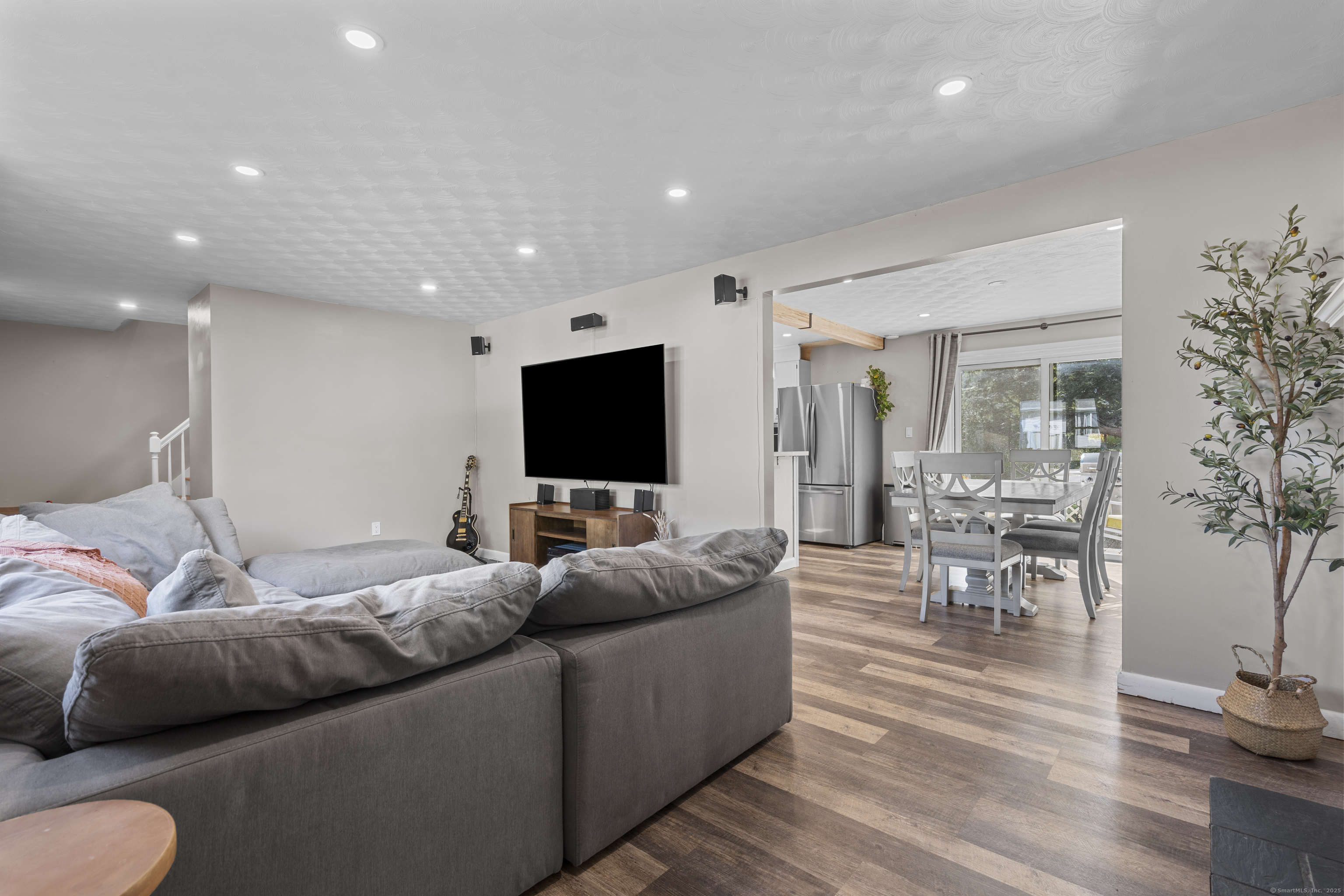 Welcome to 200 Belridge Road, a beautifully remodeled colonial in New Britain offering comfort, style, and modern upgrades throughout. This 3-bedroom, 1.5-bath home has been completely renovated on both the first and second floors, showcasing a blend of tasteful design and functional improvements. Step inside to find gleaming floors on both levels, with the first floor enhanced by wood-vinyl covering for a sleek, modern touch. The open living and dining areas flow seamlessly into a remodeled kitchen, where professionally installed recessed lighting with smart controls creates a warm, inviting atmosphere - a feature extended across the living room, dining room, kitchen, garage, and bedrooms. The living room is entertainment-ready, boasting a Samsung 77" OLED 4K UHD TV paired with a Dolby home theater sound system - included with the property. The master suite is highlighted by a sliding barn door that opens to a spacious walk-in closet, while both bathrooms have been fully updated with modern finishes. The clean, spacious basement with sump pump offers excellent storage and flexibility. Outside, the home continues to impress with an extended driveway that accommodates multiple vehicles and a fully fenced backyard, perfect for pets or private gatherings. Located in a desirable section of New Britain with easy access to schools, parks, and shopping, this home is move-in ready and packed with thoughtful upgrades that add real value.