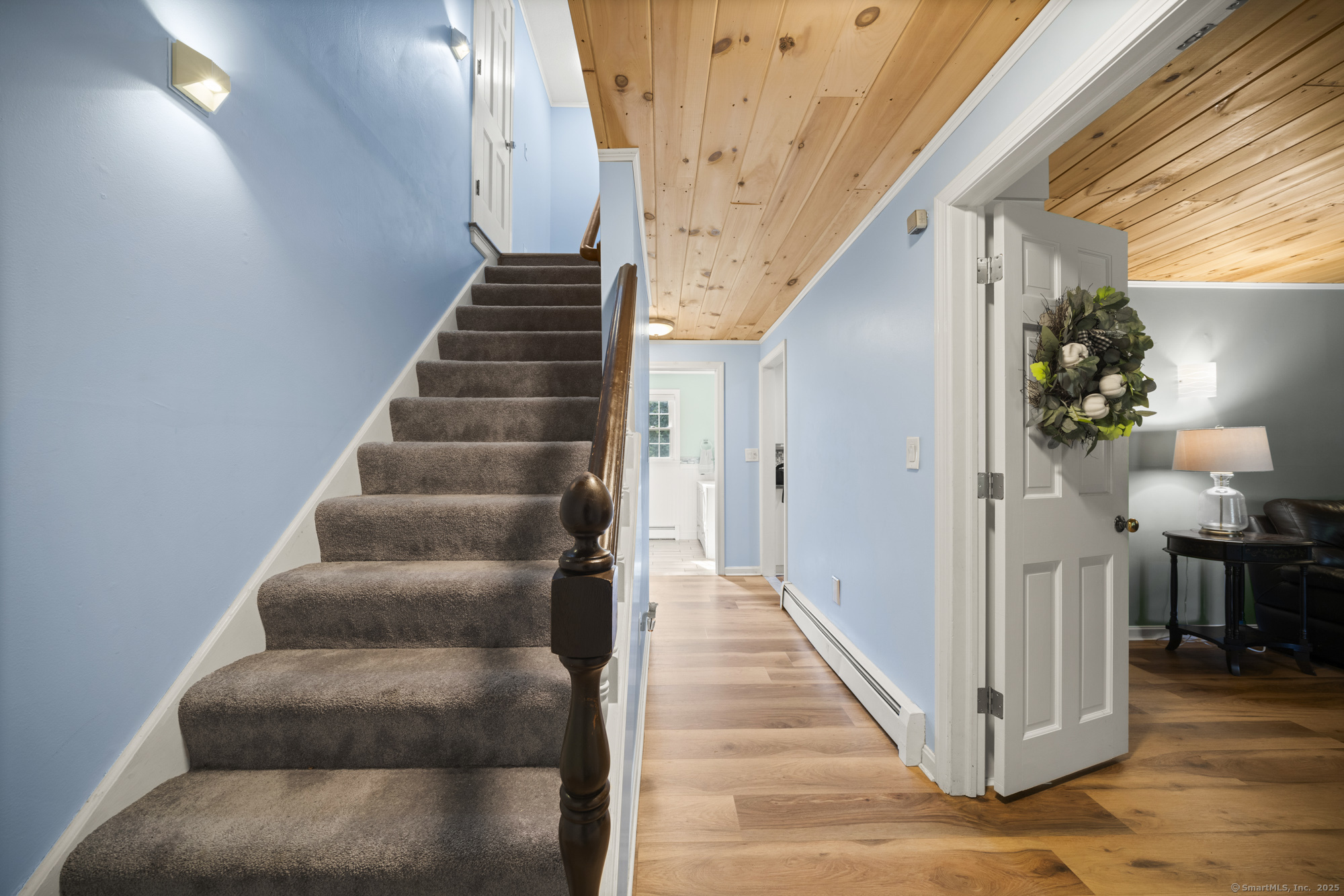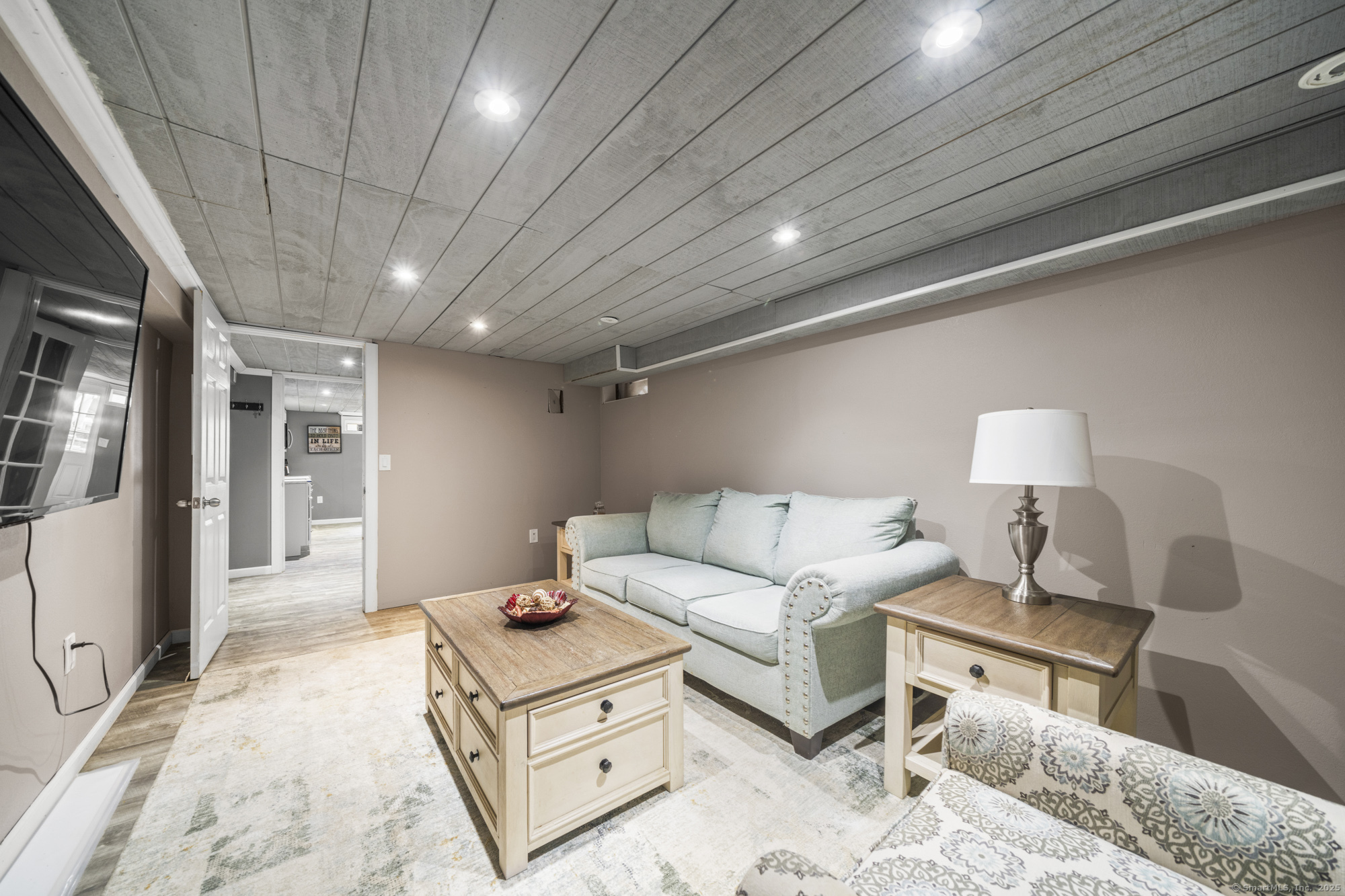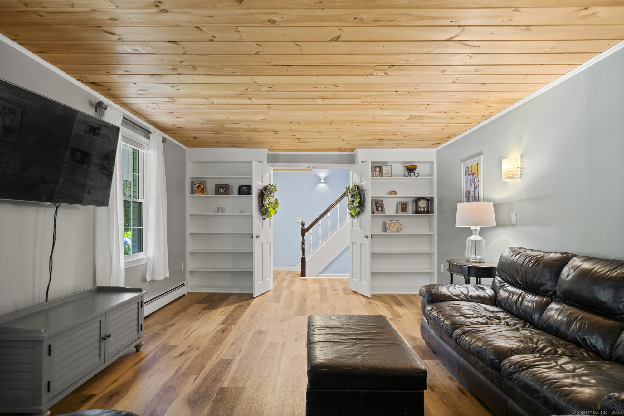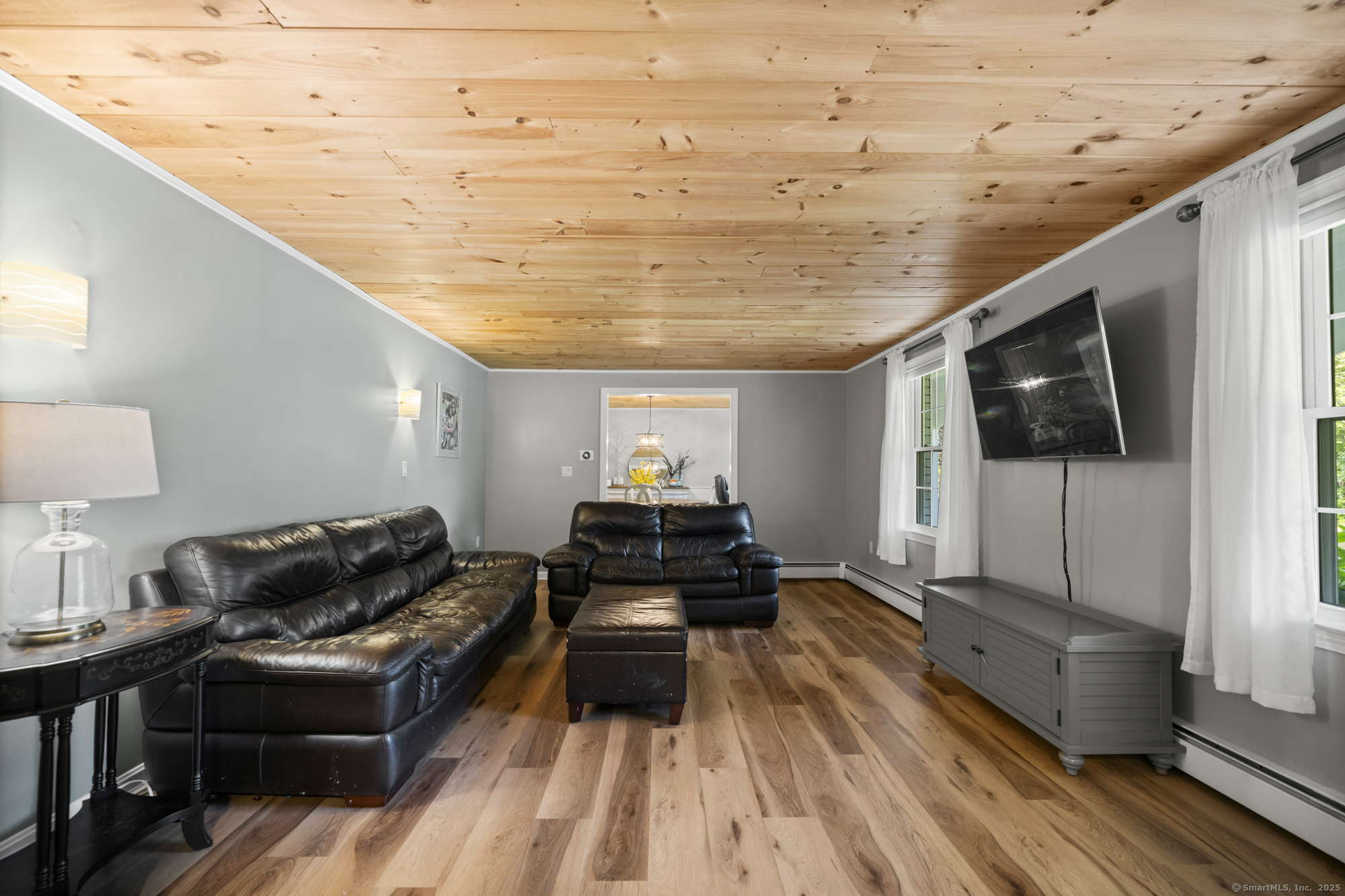 New England charm with THREE levels of living! The circular driveway leads to a welcoming front porch that invites you inside. LVP runs throughout the first floor, with pine tongue & groove ceilings. Fully remodeled kitchen with custom cabinetry, quartz countertops, stainless steel appliances, and a spacious dining area with a white bricked propane fireplace. Sliders from the kitchen lead to a 16x21 covered screened porch which provides the perfect spot to relax or entertain while overlooking the private backyard. The first floor also has a fully updated bath and a private primary suite with a walk-in closet, and renovated bath. Upstairs are three generously sized bedrooms with double closets and ceiling fans, along with a remodeled full bath featuring a double vanity, tub, and shower. The finished lower level has two offices, den, half bath, and wet bar. The finished basement is ideal for working from home or potential in-law use. Recent updates include a new mini-split system (2023), patio roof and skylights (2022), and an above-ground pool with pool deck (2022). A gorgeous flat back yard with firepit, spring-fed pond, oversized two-car garage, Buderus boiler, and sprinkler system. Enjoy all that Somers has to offer with top rated school systems, local shops with charm, and multiple areas to enjoy the outdoors!