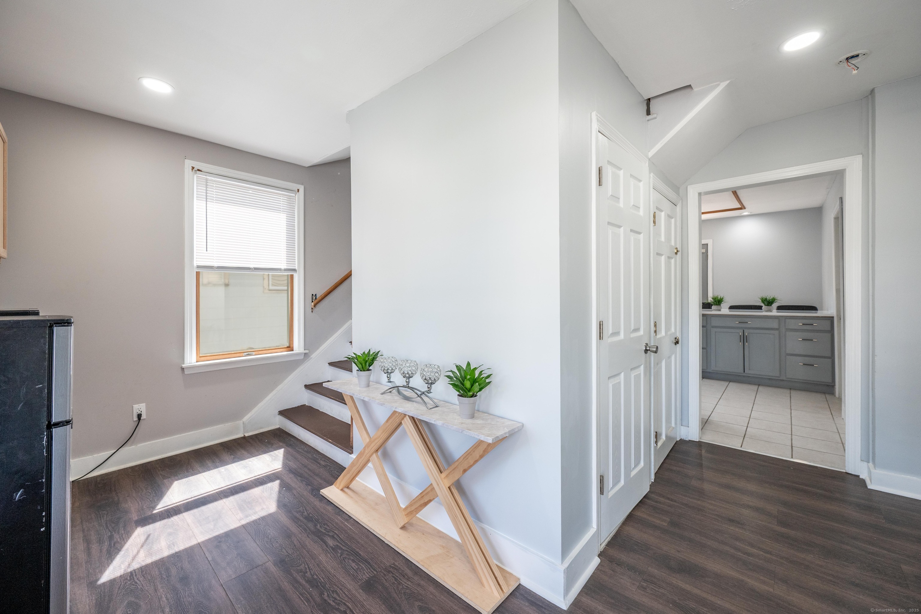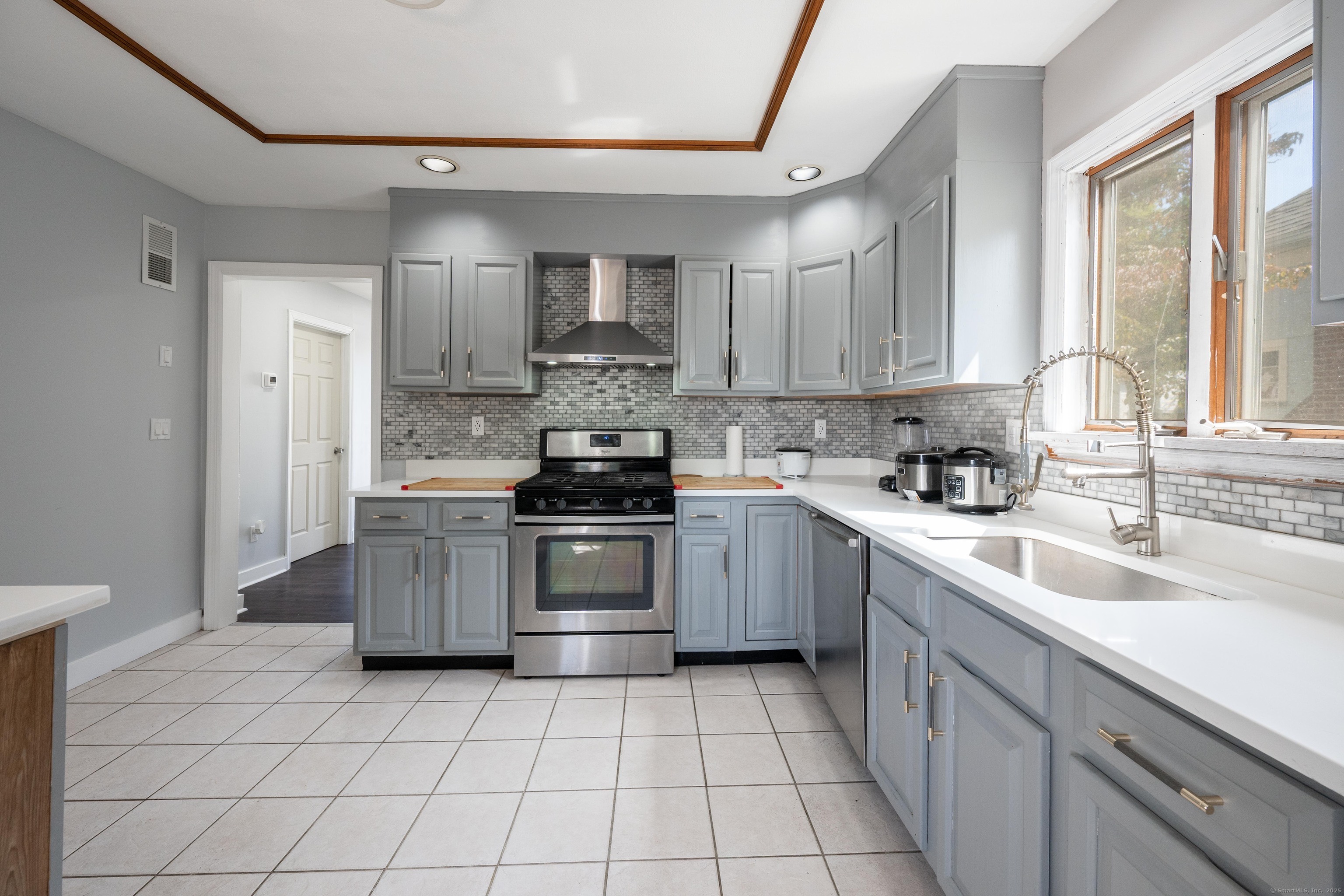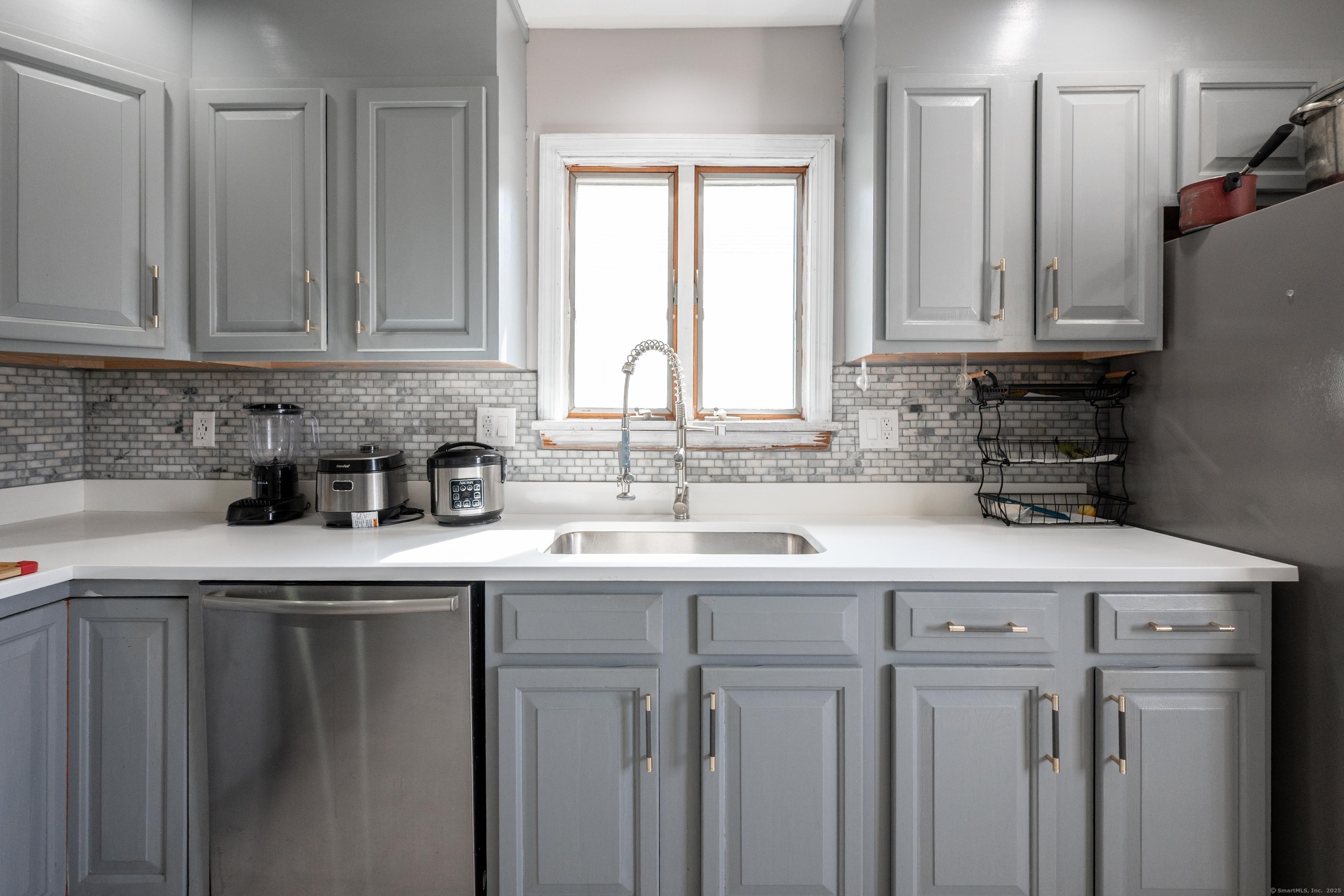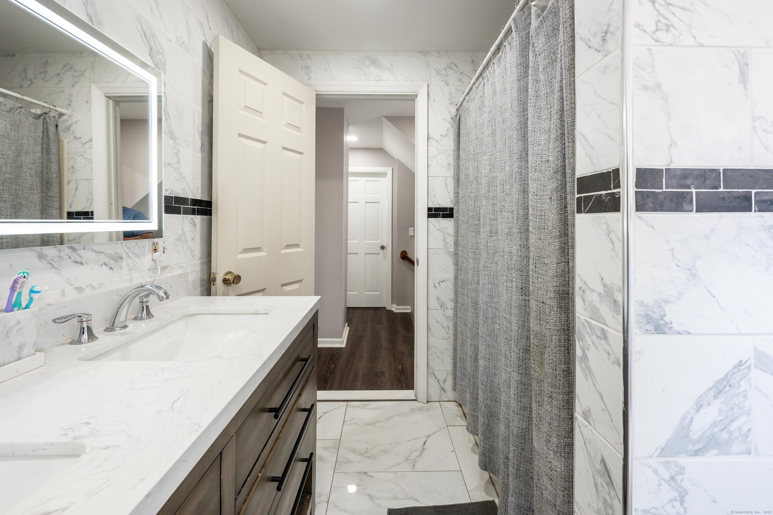 Beautifully updated and spacious 3-4 bedroom Colonial in downtown Danbury. Updated inside and out with a gorgeous new kitchen, bathrooms, flooring, paint and mechanicals. The main level has a large new eat-in kitchen with island that walks out to the deck, plus half bathroom and extra large living/dining room. The living and dining rooms have been modified to the owner's needs with some temporary walls, which can easily be removed if the new buyer chooses. Upstairs offers three spacious bedrooms and two fully updated bathrooms, one with a convenient laundry area. The walk-out lower level features a potential in-law suite with full bath and two bonus rooms with extra closet space. There is also a full walk-up attic for storage or future expansion. The back deck has lovely western views and overlooks the level yard with shed and above ground pool. There is also ample parking in the driveway. Located on a lovely sidewalked street, just minutes to many shops, restaurants and Danbury Hospital.