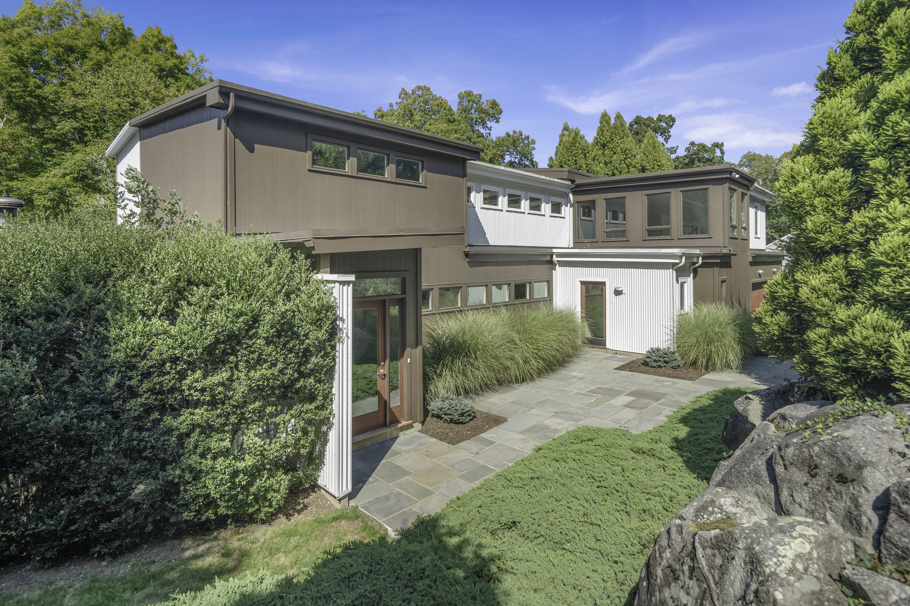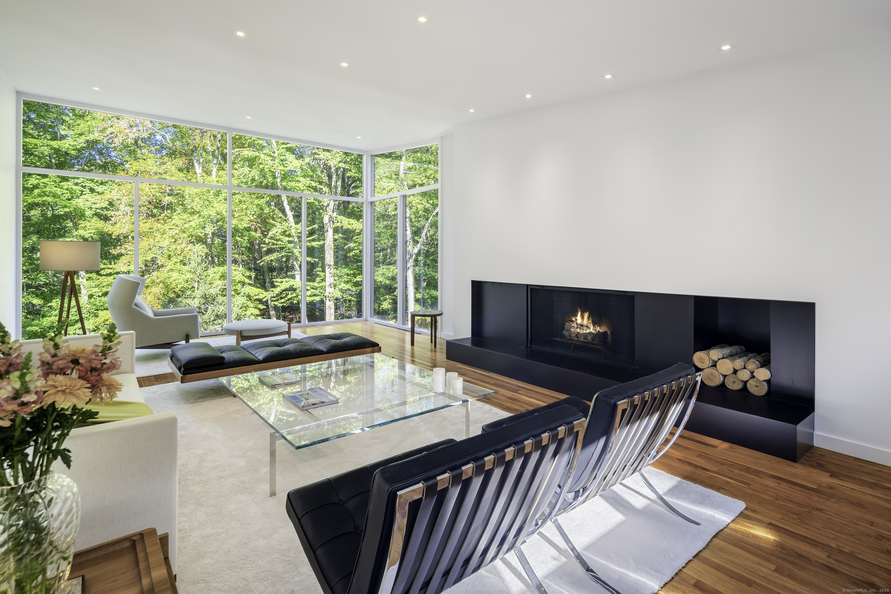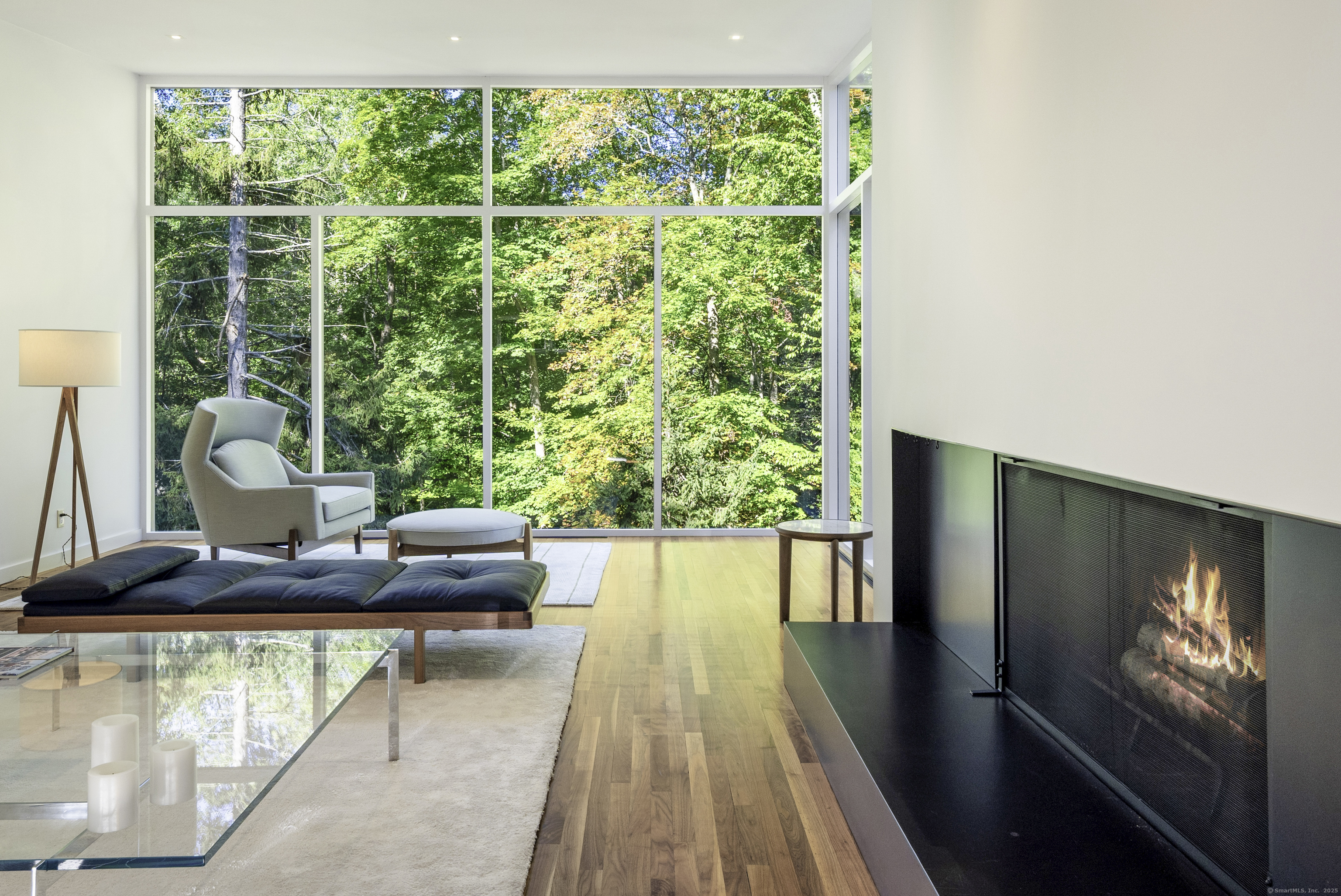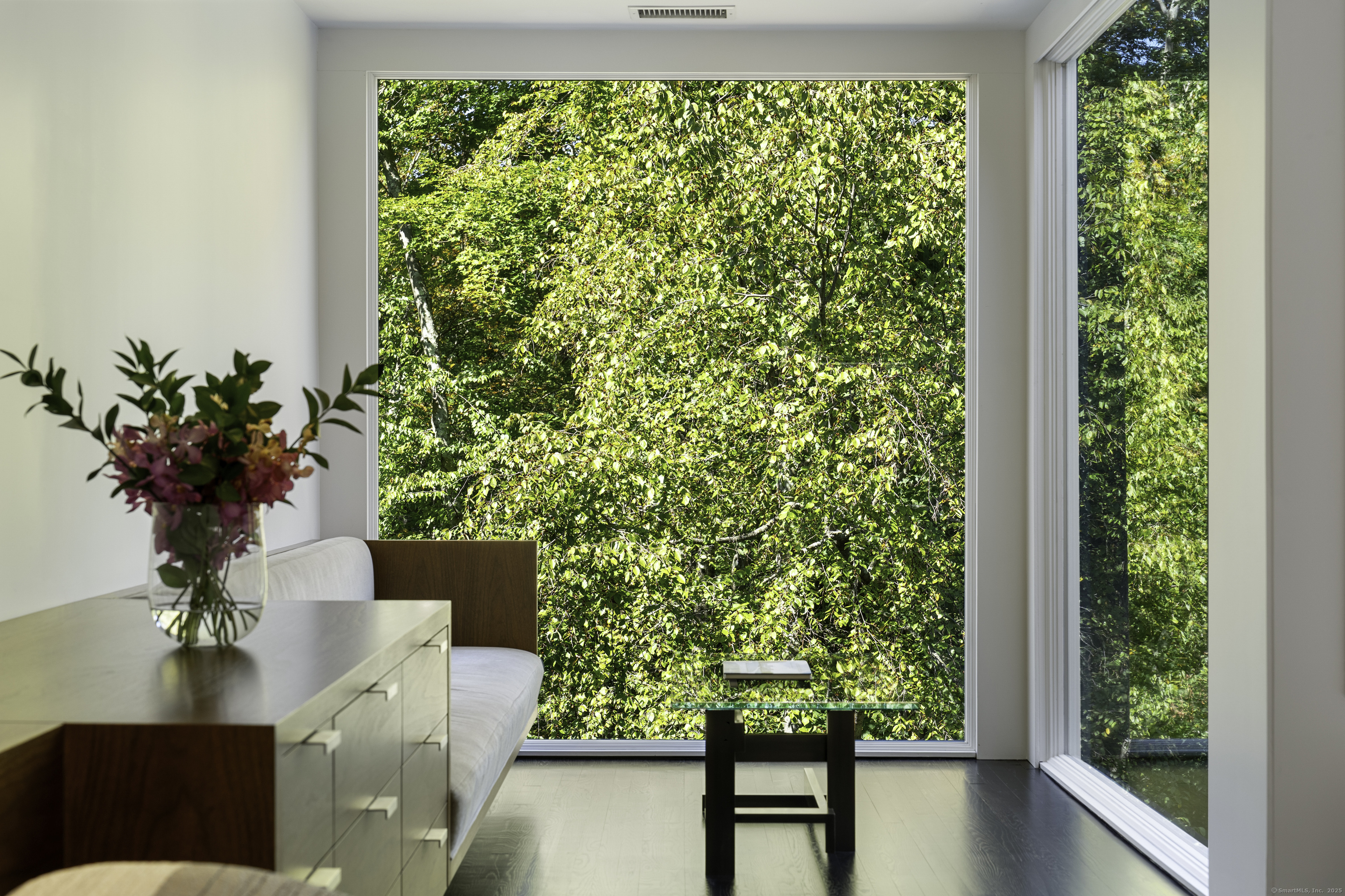 Perched high above the Goodwives River, this stunning Mid-Century Modern home offers sophisticated living in an extraordinary natural setting. Walls of floor-to-ceiling glass invite the outdoors in, seamlessly blending interior spaces with the serene beauty of the 1.8-acre private landscape. Reimagined by renowned architectural firm Joeb Moore + Partners, highlights include a dramatic cantilevered IPE deck that spans the back of the home-evoking the feeling of a treehouse floating in space. Superior finishes throughout this carefully curated home include warm walnut floors, a striking steel-wrapped fireplace, and vaulted ceilings that amplify the natural light. An entertainer's dream, this home is perfect for hosting family and friends-or simply curling up in one of the many cozy window nooks to watch the changing seasons and abundant wildlife. Ideally located just steps from the vibrant Corbin District-Darien's transformative downtown destination featuring NYC-caliber dining and boutique shopping yet only moments from the waterfront sanctuary of Great Island. A rare and inspired opportunity for design-forward, nature-infused convenient living within the award-winning Darien school district.