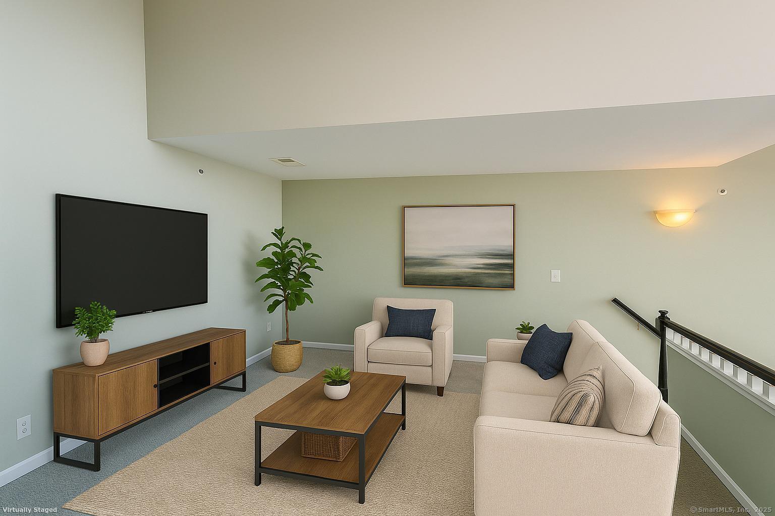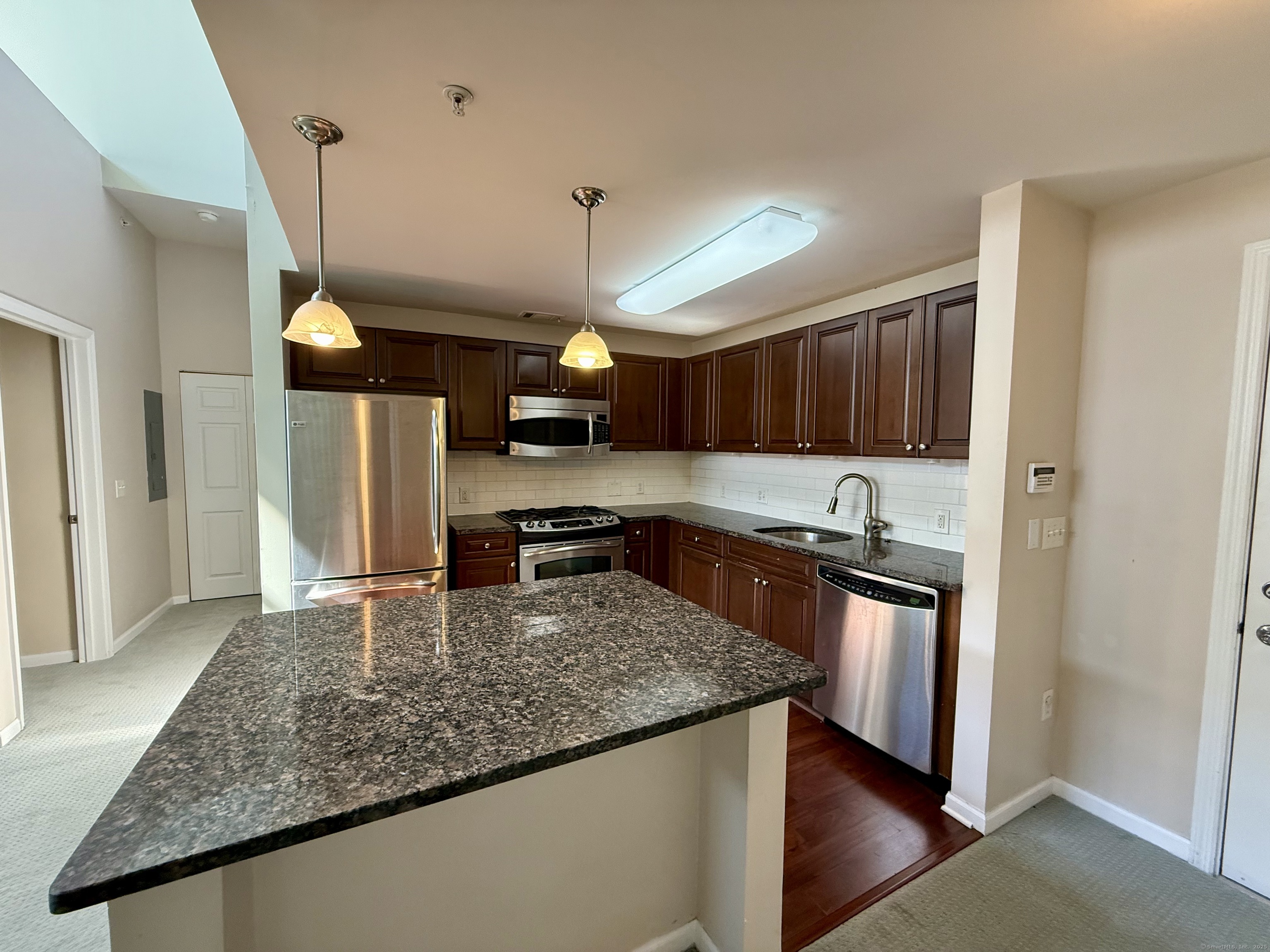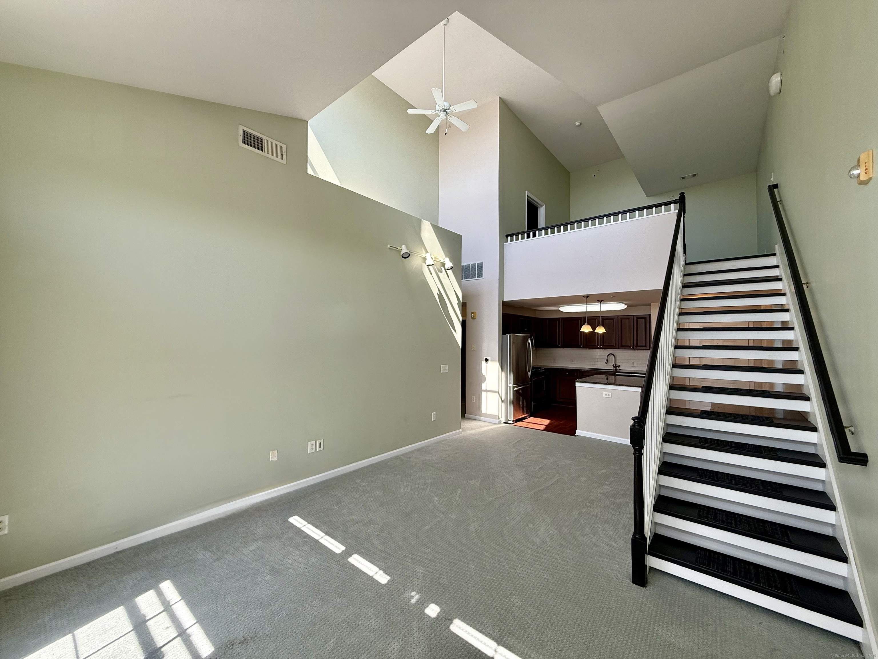 Modern Top-Floor Penthouse with Loft in Eastside Commons where style meets convenience in the heart of Stamford! This pet-friendly penthouse offers an impressive layout featuring 2 spacious bedrooms, 2 full bathrooms, and a versatile finished loft-perfect for a home office, gym, or additional living space. The home also includes in-unit laundry and a dedicated storage room for added convenience. Step inside to find soaring 9-foot ceilings, dramatic vaulted living room ceilings, and oversized picture windows that flood the home with natural light. Enjoy your morning coffee or unwind on your private balcony, ideal for relaxing or entertaining. The open-concept kitchen is a chef's dream, showcasing granite countertops, refinished cabinetry, stainless steel appliances, and an expansive island breakfast bar-perfect for hosting friends and family. Both bedrooms offer excellent storage space, with the primary suite featuring a walk-in closet, private balcony access, and an en suite bathroom. Recent updates include new carpeting, freshly painted, a refinished staircase, and a high-efficiency gas furnace for year-round comfort. You'll enjoy resort-style amenities such as a fitness center, meeting room, beautifully landscaped courtyard with grilling areas. The unit includes one reserved covered garage space plus plenty of guest parking. Located just minutes from downtown Stamford, Metro-North/Amtrak, and I-95. Please schedule your private view. $100 off if signing a 2-year lease.