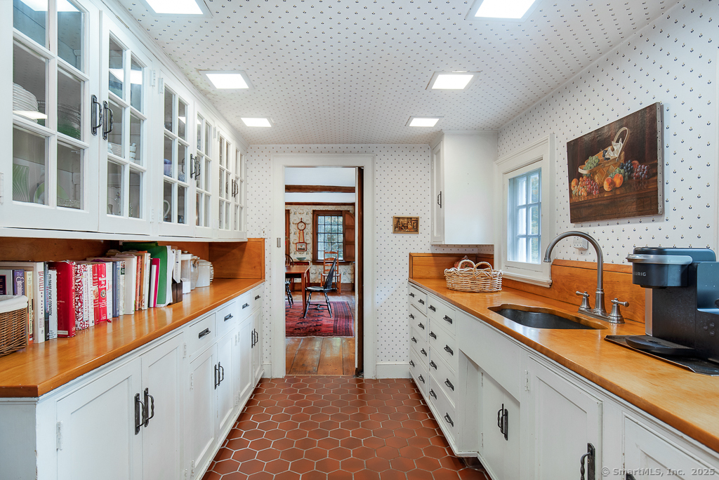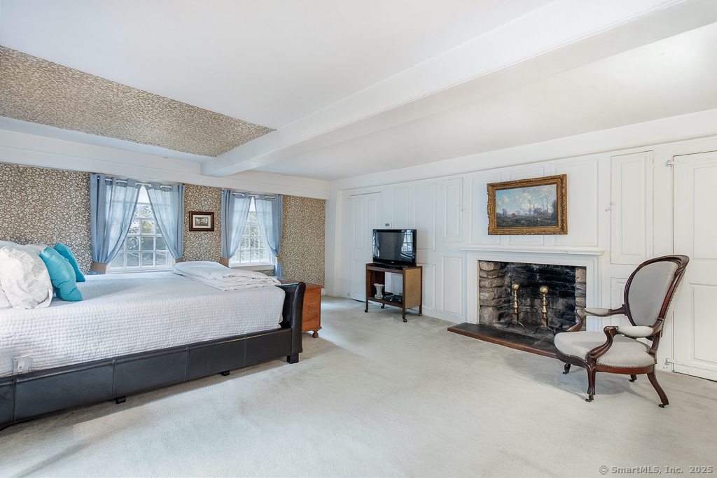 The Nathaniel Parks House circa 1706. Originally built in Guilford, CT, and painstakingly relocated to Woodbridge in 1934. This 5 Br, 3.5 bath, retains all of its original character, including wide plank floors, hand-hewn beams, and a striking double-leaf entry framed by fluted pillars and a pedimented gable. Thoughtful rear additions, including a gambrel wing with garage, were added during the move. Barn-style garage doors and a welcoming covered breezeway connect the main home to an additional wing. Inside, a fieldstone fireplace serves as the stunning focal point of the living area, complemented by exposed wooden beams that enhance the home's historic charm. The eat-in kitchen opens to a sunlit family room with soaring ceilings, four oversized skylights, and panoramic views overlooking the serene backyard. The primary suite features a full bath with a whirlpool jetted tub. Step outside to a brick patio overlooking 7.7 tranquil acres and a classic barn-perfect for storage. Mature trees, lush landscaping, and a private setting create a picturesque environment. Large windows and a spacious layout provide generous natural light, multiple gathering spaces, and flexible living options-ideal for entertaining or quiet enjoyment. Modern comforts such as central air, natural gas, and public water blend seamlessly with the home's antique appeal. A rare opportunity to own a historic Connecticut treasure full of character, warmth and elegance, in central Woodbridge, close to Town.